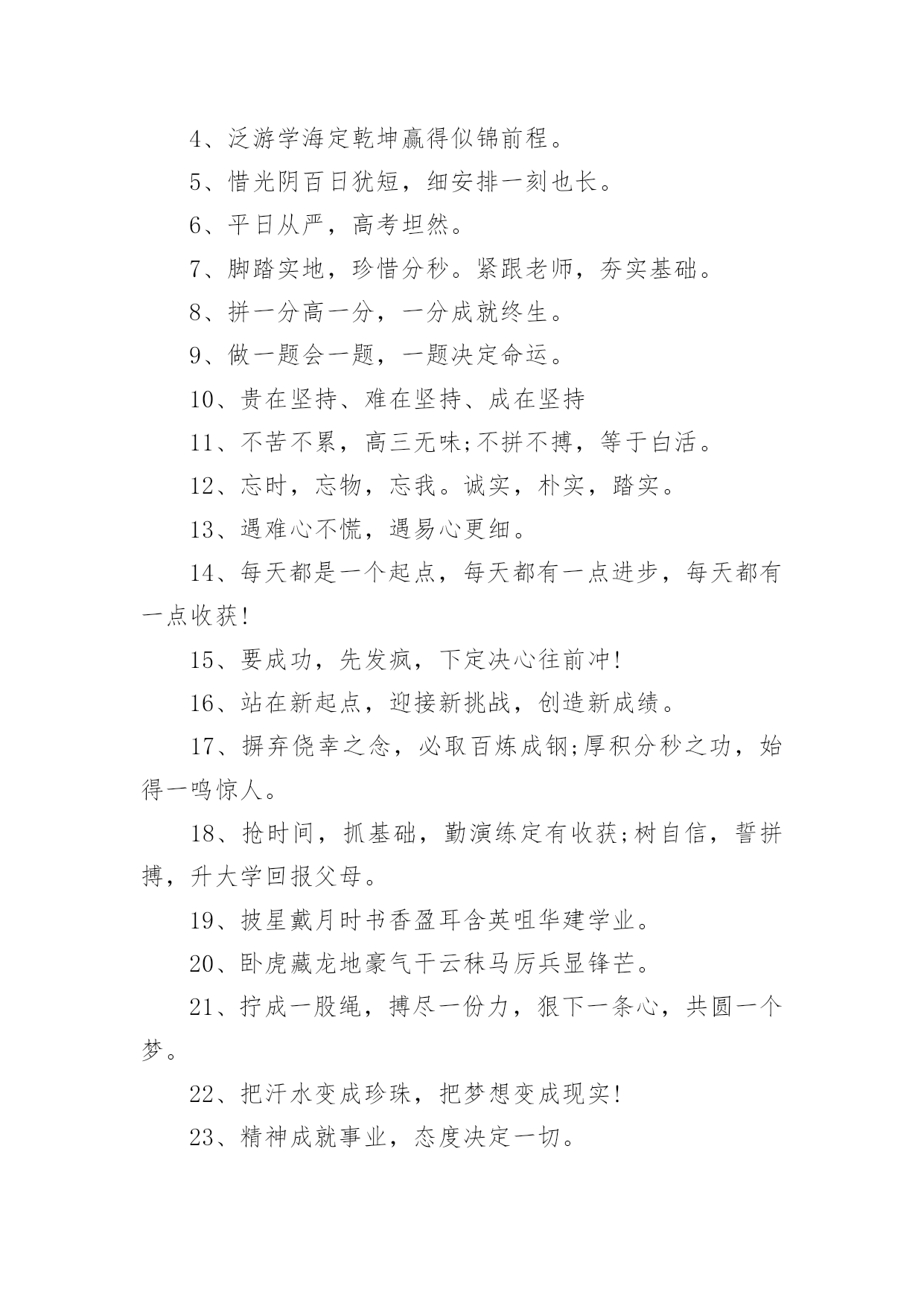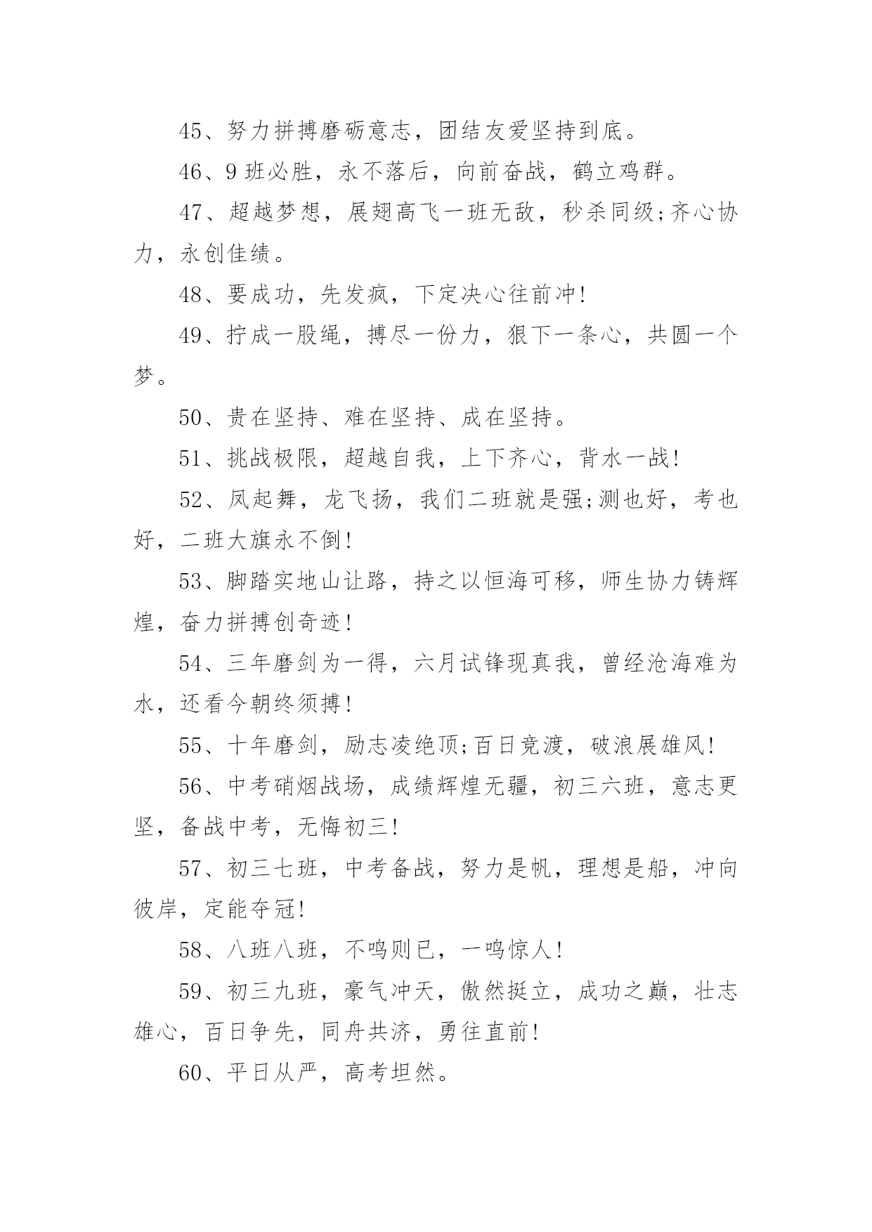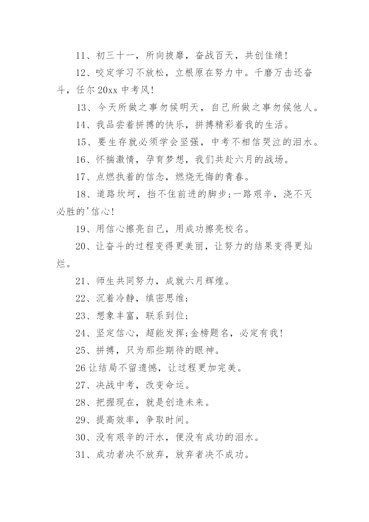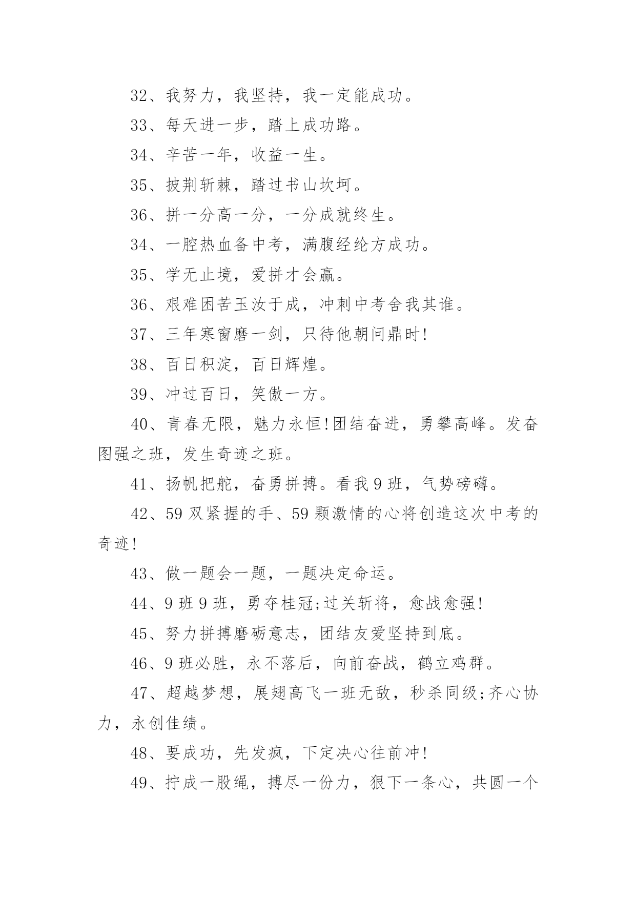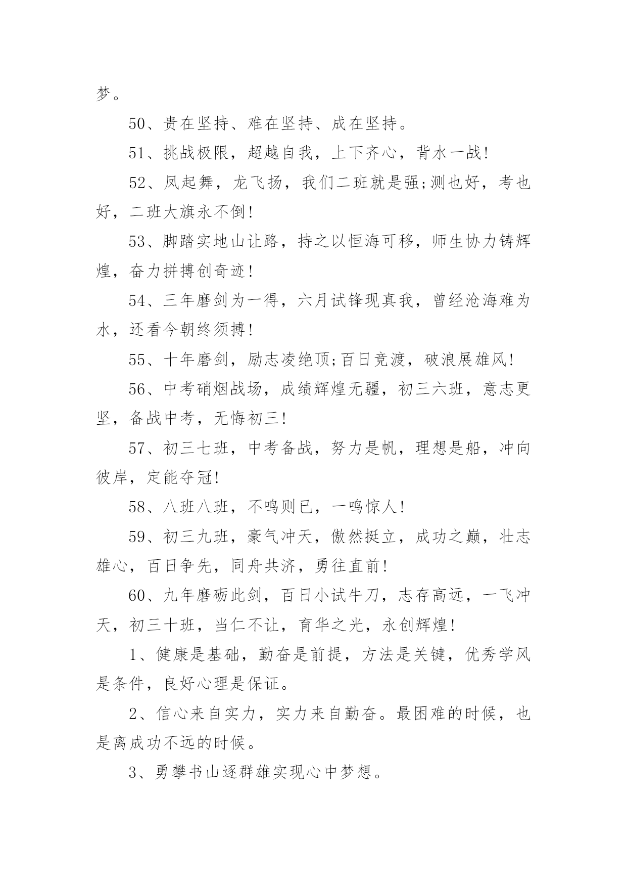 考试加油助威口号考试加油助威口号在日常学习、工作和生活中,大家都看到过口号吧,口号既有公文语体准确、简洁的特点,又有政论语体严谨性、鼓动性的特点。口号的类型多样,你所见过的口号是什么样的呢?以下是小编为大家整理的考试加油助威口号,仅供参考,希望能够帮助到大家。考试加油助威口号11、我中考我自信我成功!不做地下虫班级云中龙。2、奋战百日,三载拼搏终有回报!决胜中考,父母期待定成现实!3、拼搏进取,一切皆有可能!我们的梦想一定能实现!4、亮出你的理想,抓住升学时机;拼出你的实力,品尝成功喜悦。5、每天都是一个起点,每天都有一点进步,每天都有一点收获!6、眼泪不是我们的答案,拼搏才是我们的选择。7、静下来,铸我实力;拼上去,亮我风采。8、忘时,忘物,忘我。诚实,朴实,踏实。9、遇难心不慌,遇易心更细。10、站在新起点,迎接新挑战,创造新成绩。11、初三十一,所向披靡,奋战百天,共创佳绩!12、咬定学习不放松,立根原在努力中。千磨万击还奋斗,任尔20xx中考风!13、今天所做之事勿候明天,自己所做之事勿候他人。14、我品尝着拼搏的快乐,拼搏精彩着我的生活。15、要生存就必须学会坚强,中考不相信哭泣的泪水。16、怀揣激情,孕育梦想,我们共赴六月的战场。17、点燃执着的信念,燃烧无悔的青春。18、道路坎坷,挡不住前进的脚步;一路艰辛,浇不灭必胜的'信心!19、用信心擦亮自己,用成功擦亮校名。20、让奋斗的过程变得更美丽,让努力的结果变得更灿烂。21、师生共同努力,成就六月辉煌。22、沉着冷静,缜密思维;23、想象丰富,联系到位;24、坚定信心,超能发挥;金榜题名,必定有我!25、拼搏,只为那些期待的眼神。26让结局不留遗憾,让过程更加完美。27、决战中考,改变命运。28、把握现在,就是创造未来。29、提高效率,争取时间。30、没有艰辛的汗水,便没有成功的泪水。31、成功者决不放弃,放弃者决不成功。32、我努力,我坚持,我一定能成功。33、每天进一步,踏上成功路。34、辛苦一年,收益一生。35、披荆斩棘,踏过书山坎坷。36、拼一分高一分,一分成就终生。34、一腔热血备中考,满腹经纶方成功。35、学无止境,爱拼才会赢。36、艰难困苦玉汝于成,冲刺中考舍我其谁。37、三年寒窗磨一剑,只待他朝问鼎时!38、百日积淀,百日辉煌。39、冲过百日,笑傲一方。40、青春无限,魅力永恒!团结奋进,勇攀高峰。发奋图强之班,发生奇迹之班。41、扬帆把舵,奋勇拼搏。看我9班,气势磅礴。42、59双紧握的手、59颗激情的心将创造这次中考的奇迹!43、做一题会一题,一题决定命运。44、9班9班,勇夺桂冠;过关斩将,愈战愈强!45、努力拼搏磨砺意志,团结友爱坚持到底。46、9班必胜,永不落后,向前奋战,鹤立鸡群。47、超越梦想,展翅高飞一班无敌,秒杀同级;齐心协力,永创佳绩。48、要成功,先发疯,下定决心往前冲!49、拧成一股绳,搏尽一份力,狠下一条心,共圆一个梦。50、贵在坚持、难在坚持、成在坚持。51、挑战极限,超越自我,上下齐心,背水一战!52、凤起舞,龙飞扬,我们二班就是强;测也好,考也好,二班大旗永不倒!53、脚踏实地山让路,持之以恒海可移,师生协力铸辉煌,奋力拼搏创奇迹!54、三年磨剑为一得,六月试锋现真我,曾经沧海难为水,还看今朝终须搏!55、十年磨剑,励志凌绝顶;百日竞渡,破浪展雄风!56、中考硝烟战场,成绩辉煌无疆,初三六班,意志更坚,备战中考,无悔初三!57、初三七班,中考备战,努力是帆,理想是船,冲向彼岸,定能夺冠!58、八班八班,不鸣则已,一鸣惊人!59、初三九班,豪气冲天,傲然挺立,成功之巅,壮志雄心,百日争先,同舟共济,勇往直前!60、九年磨砺此剑,百日小试牛刀,志存高远,一飞冲天,初三十班,当仁不让,育华之光,永创辉煌!1、健康是基础,勤奋是前提,方法是关键,优秀学风是条件,良好心理是保证。2、信心来自实力,实力来自勤奋。最困难的时候,也是离成功不远的时候。3、勇攀书山逐群雄实现心中梦想。4、泛游学海定乾坤赢得似锦前程。5、惜光阴百日犹短,细安排一刻也长。6、平日从严,高考坦然。7、脚踏实地,珍惜分秒。紧跟老师,夯实基础。8、拼一分高一分,一分成就终生。9、做一题会一题,一题决定命运。10、贵在坚持、难在坚持、成在坚持11、不苦不累,高三无味;不拼不搏,等于白活。12、忘时,忘物,忘我。诚实,朴实,踏实。13、遇难心不慌,遇易心更细。14、每天都是一个起点,每天都有一点进步,每天都有一点收获!15、要成功,先发疯,下定决心往前冲!16、站在新起点,迎接新挑战,创造新成绩。17、摒弃侥幸之念,必取百炼成钢;厚积分秒之功,始得一鸣惊人。18、抢时间,抓基础,勤演练定有收获;树自信,誓拼搏,升大学回报父母。19、披星戴月时书香盈耳含英咀华建