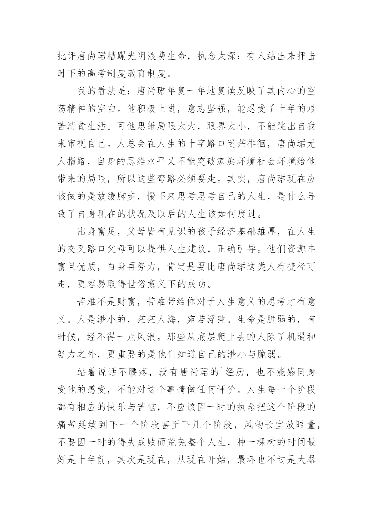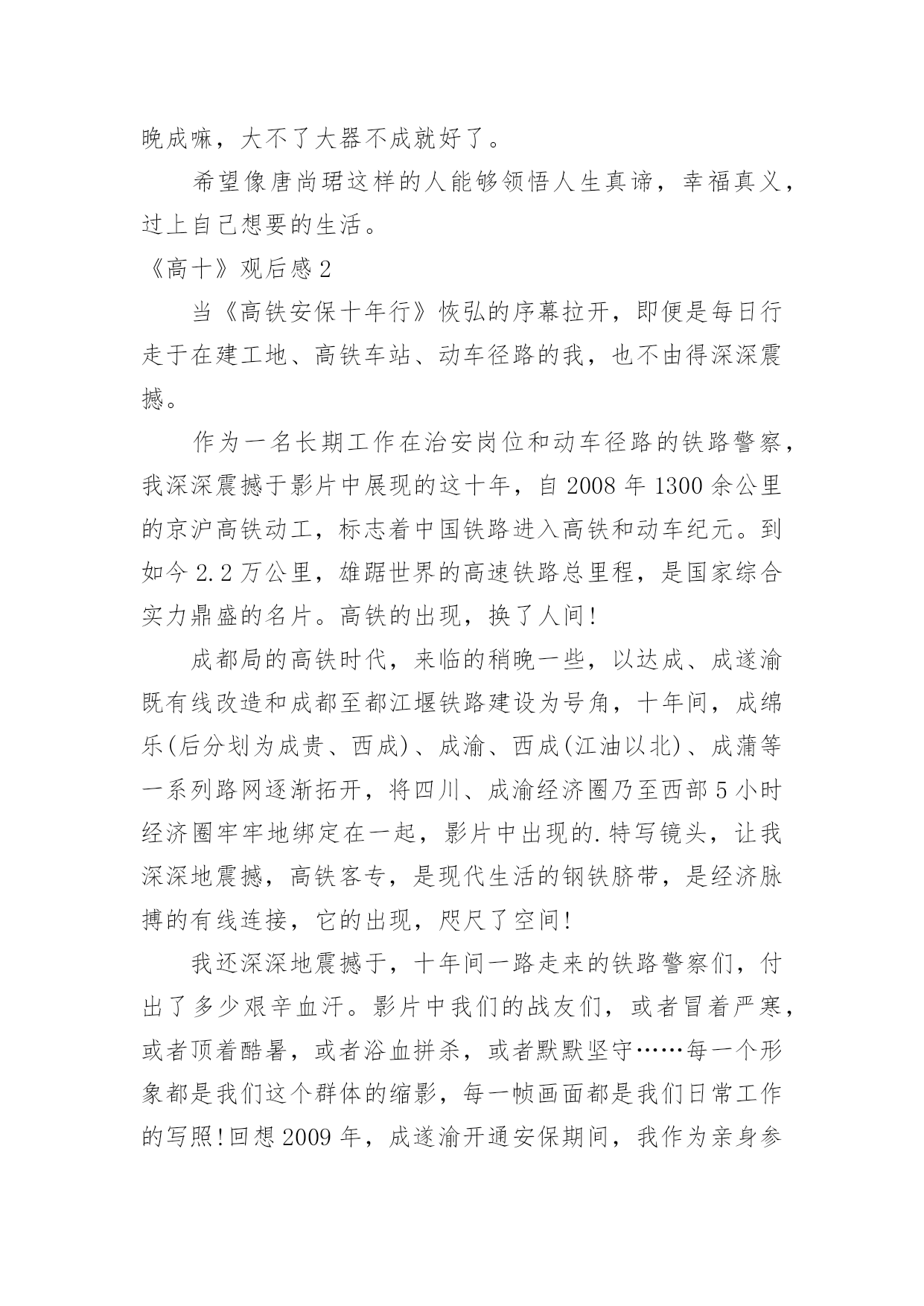 《高十》观后感《高十》观后感看完一部作品后,大家一定收获不少吧,观后感就是看了一部影片,连续剧或参观展览等后,把具体感受和得到的启示写成的文章。快来参考观后感是怎么写的吧,下面是小编为大家收集的《高十》观后感,仅供参考,欢迎大家阅读。《高十》观后感1主人公,唐尚珺出生在广西一个贫穷农村家庭,2006年读高中,2009年第一次高考没过三本线,被父亲送到南宁一所技校就读。不屈服的唐尚珺悄悄退了学,瞒着父母开始复读。2014年,唐尚珺“毕业一年”,回家过年给母亲掏了500块钱,让妈妈买菜用,按照当地习俗给自己的侄儿们发放压岁钱。2014年高考考取西南政法大学,立志要去中科大,没去报道。2015年被吉林大学录取,因为不是理想专业放弃。2016年被中国政法大学录取,此时,父亲已肺癌晚期,生命仅剩几个月,唐尚珺取得的成绩意义已不大。申请了助学贷款和助学岗位,唐尚珺在中国政法大学读了一段时间,为给父亲筹钱治病退学去某高中拿2万块的奖金。2017,2018好像还在复读。有人赞扬唐尚珺身处逆境,百折不挠,顽强拼搏;有人批评唐尚珺糟蹋光阴浪费生命,执念太深;有人站出来抨击时下的高考制度教育制度。我的看法是:唐尚珺年复一年地复读反映了其内心的空荡精神的空白。他积极上进,意志坚强,能忍受了十年的艰苦清贫生活。可他思维局限太大,眼界太小,不能跳出自我来审视自己。人总会在人生的十字路口迷茫徘徊,唐尚珺无人指路,自身的思维水平又不能突破家庭环境社会环境给他带来的局限,所以这些弯路必须要走。其实,唐尚珺现在应该做的是放缓脚步,慢下来思考思考自己的人生,是什么导致了自身现在的状况及以后的人生该如何度过。出身富足,父母皆有见识的孩子经济基础雄厚,在人生的交叉路口父母可以提供人生建议,正确引导。他们资源丰富且优质,自身再努力,肯定是要比唐尚珺这类人有捷径可走,更容易取得世俗意义下的成功。苦难不是财富,苦难带给你对于人生意义的思考才有意义。人是渺小的,茫茫人海,宛若浮萍。生命是脆弱的,有时候,经不得一点风浪。那些从底层爬上去的人除了机遇和努力之外,更重要的是他们知道自己的渺小与脆弱。站着说话不腰疼,没有唐尚珺的`经历,也不能感同身受他的感受,不能对这个事情做任何评价。人生每一个阶段都有相应的快乐与苦恼,不应该因一时的执念把这个阶段的痛苦延续到下一个阶段甚至下几个阶段,风物长宜放眼量,不要因一时的得失成败而荒芜整个人生,种一棵树的时间最好是十年前,其次是现在,从现在开始,最坏也不过是大器晚成嘛,大不了大器不成就好了。希望像唐尚珺这样的人能够领悟人生真谛,幸福真义,过上自己想要的生活。《高十》观后感2当《高铁安保十年行》恢弘的序幕拉开,即便是每日行走于在建工地、高铁车站、动车径路的我,也不由得深深震撼。作为一名长期工作在治安岗位和动车径路的铁路警察,我深深震撼于影片中展现的这十年,自2008年1300余公里的京沪高铁动工,标志着中国铁路进入高铁和动车纪元。到如今2.2万公里,雄踞世界的高速铁路总里程,是国家综合实力鼎盛的名片。高铁的出现,换了人间!成都局的高铁时代,来临的稍晚一些,以达成、成遂渝既有线改造和成都至都江堰铁路建设为号角,十年间,成绵乐(后分划为成贵、西成)、成渝、西成(江油以北)、成蒲等一系列路网逐渐拓开,将四川、成渝经济圈乃至西部5小时经济圈牢牢地绑定在一起,影片中出现的.特写镜头,让我深深地震撼,高铁客专,是现代生活的钢铁脐带,是经济脉搏的有线连接,它的出现,咫尺了空间!我还深深地震撼于,十年间一路走来的铁路警察们,付出了多少艰辛血汗。影片中我们的战友们,或者冒着严寒,或者顶着酷暑,或者浴血拼杀,或者默默坚守……每一个形象都是我们这个群体的缩影,每一帧画面都是我们日常工作的写照!回想2009年,成遂渝开通安保期间,我作为亲身参与者,我可以负责任地告诉大家,沐风栉雨真不算啥——当时的首创者们,住的真的是窝棚帐篷,外面下大雨,里面下小雨,外面刮大风,里面刮旋风,外面下起雪,里面起冰凌……当时的治安环境也相当复杂,电缆电线说被盗就被盗了,防护设施说破坏就破坏了,诚如影片中讲述那样,迫不得已,上级调集力量,采取大兵团作战,苦熬坚守,只为了高铁平安!我不禁泪湿了双眼,影片的镜头和我记忆的情境仿佛融汇为一体,昨天和今天或许只是一瞬间,十年高铁,穿越了时间!震撼之后是感谢,感谢铁路公安局决策层,将各条线路建设的安防经验集于大成,将铁警队伍中的你我他的智慧凝聚成结晶,十年磨剑,一朝剑成,三十多份高铁建设的安防标准文件、高铁防控和反恐的系列规章、隐患排查整改的督导利器……不断提升的安防建设标准,不断向硬件要警力、向科技要警力,最大限度地用有限的警力配置,将高铁安防筑的越来越牢。是铁警中的高铁参与者们和上级机关决策者将思维放出了笼子,才造就了今天把影响高铁运行的隐患问