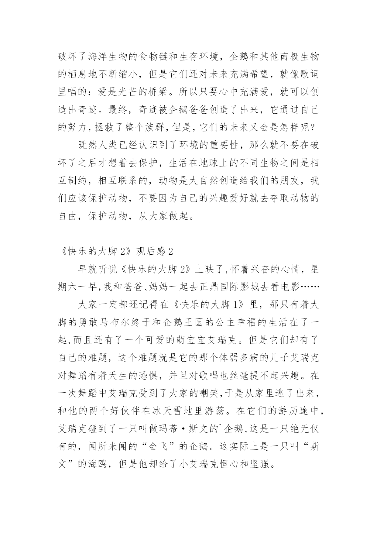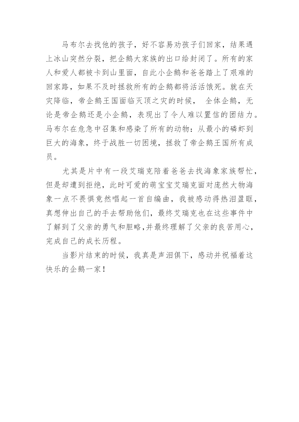 《快乐的大脚2》观后感认真品味一部作品后,相信大家的视野一定开拓了不少吧,需要好好地对所收获的东西写一篇观后感了。观后感你想好怎么写了吗?下面是小编精心整理的《快乐的大脚2》观后感,仅供参考,大家一起来看看吧。《快乐的大脚2》观后感1今天,我和妈妈看了一场电影,电影名字叫《快乐的大脚2》,这一个电影讲述的是在冰雪覆盖南极大陆上生活着一群快乐的企鹅,它们团结,友爱,勇敢,它们喜欢歌唱,舞蹈,其中有一只小企鹅不想与大家一起唱歌跳舞,它只站在一大块冰下面羡慕的望着大家在那里快乐的唱歌跳舞,那就是小艾瑞克,虽然艾瑞克不会跳舞,但是它的`爸爸妈妈却是企鹅族群中闪亮的歌舞明星,后来在爸爸的劝说下,艾瑞克终于敢跳舞了,艾瑞克跳呀,跳呀,却在众人面前出了丑,它决定不再跳舞,和两个小伙伴来到了另一个企鹅族群,当爸爸找到它们,并把他们带回家时,却意外的发现冰山挡住了出口,整个族群被困住了。冰山的频繁活动是人类不断破坏环境而造成的,随着人类生活的不断发展,大量使用汽车、空调等等,使二氧化碳大量释放在空气中,产生温室效应,臭氧层不断变薄,全球气候变暖,巨大的冰山没有了支撑,在海洋上漂浮。还有人类过度的开采海底资源,在海面上释放油污,捕杀海洋生物,破坏了海洋生物的食物链和生存环境,企鹅和其他南极生物的栖息地不断缩小,但是它们还对未来充满希望,就像歌词里唱的:爱是光芒的桥梁。所以只要心中充满爱,就可以创造出奇迹。最终,奇迹被企鹅爸爸创造了出来,它通过自己的努力,拯救了整个族群,但是,它们的未来又会是怎样呢?既然人类已经认识到了环境的重要性,那么就不要在破坏了之后才想着去保护,生活在地球上的不同生物之间是相互制约,相互联系的,动物是大自然创造给我们的朋友,我们应该保护动物,不要因为自己的兴趣爱好就去夺取动物的自由,保护动物,从大家做起。《快乐的大脚2》观后感2早就听说《快乐的大脚2》上映了,怀着兴奋的心情,星期六一早,我和爸爸、妈妈一起去正鼎国际影城去看电影……大家一定都还记得在《快乐的大脚1》里,那只有着大脚的勇敢马布尔终于和企鹅王国的公主幸福的生活在了一起,而且还有了一个可爱的萌宝宝艾瑞克。但是它们却有了自己的难题,这个难题就是它的那个体弱多病的儿子艾瑞克对舞蹈有着天生的恐惧,并且对歌唱也丝毫提不起兴趣。在一次舞蹈中艾瑞克受到了大家的嘲笑,于是从家里逃了出来,和他的两个好伙伴在冰天雪地里游荡。在它们的游历途中,艾瑞克碰到了一只叫做玛蒂·斯文的`企鹅,这是一只绝无仅有的,闻所未闻的“会飞”的企鹅。这实际上是一只叫“斯文”的海鸥,但是他却给了小艾瑞克恒心和坚强。马布尔去找他的孩子,好不容易劝孩子们回家,结果遇上冰山突然分裂,把企鹅大家族的出口给封闭了。所有的家人和爱人都被卡到山里面,自此小企鹅和爸爸踏上了艰难的回家路,如果不及时拯救所有的企鹅都将活活饿死。就在天灾降临,帝企鹅王国面临灭顶之灾的时候,全体企鹅,无论是帝企鹅还是小企鹅,表现出了令人难以置信的团结力。马布尔在危急中召集和感染了所有的动物:从最小的磷虾到巨大的海象,终于战胜一切困境,拯救了帝企鹅王国所有成员。尤其是片中有一段艾瑞克陪着爸爸去找海象家族帮忙,但是却遭到拒绝,此时可爱的萌宝宝艾瑞克面对庞然大物海象一点不畏惧竟然唱起一首自编曲,我被感动得热泪盈眶,真想伸出自己的手去帮助他们,最终艾瑞克也在这些事件中了解到了父亲的勇气和胆略,并最终理解了父亲的良苦用心,完成自己的成长历程。当影片结束的时候,我真是声泪俱下,感动并祝福着这快乐的企鹅一家!