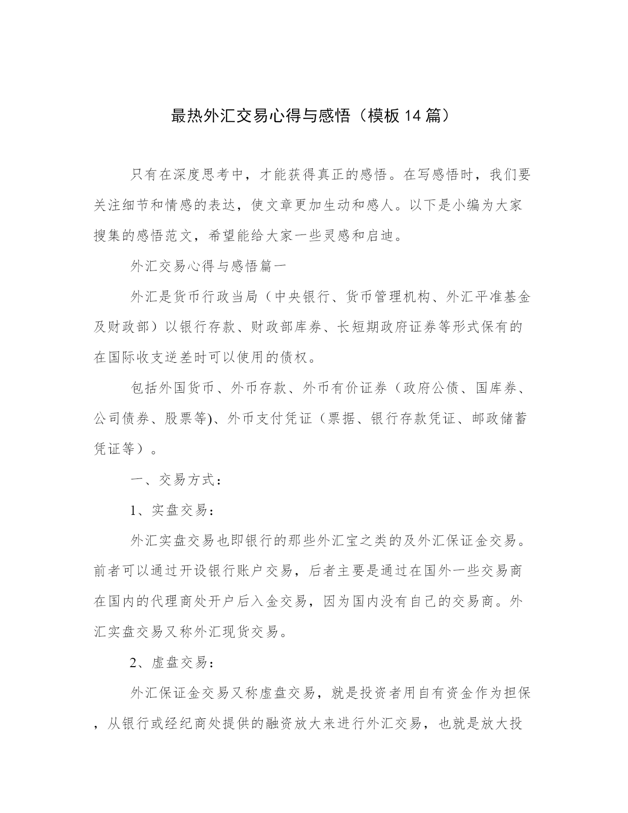 外汇心得感悟(优质15篇)当我们备受启迪时,常常可以将它们写成一篇心得感悟,如此就可以提升我们写作能力了。那么你知道心得感悟如何写吗?以下是我帮大家整理的最新心得感悟范文大全,希望能够帮助到大家,我们一起来看一看吧。外汇心得感悟篇一近年来,随着国际贸易的发展和人们对投资理财的越来越高的需求,外汇交易的市场也越来越活跃。外汇市场的分析、交易等方面都需要一定的知识和技巧,但无论是新手还是老手,买外汇都需要总结经验和教训。在此,我将分享我购买外汇的体会和经验,以供大家参考。第二段:了解外汇市场风险在买外汇之前,