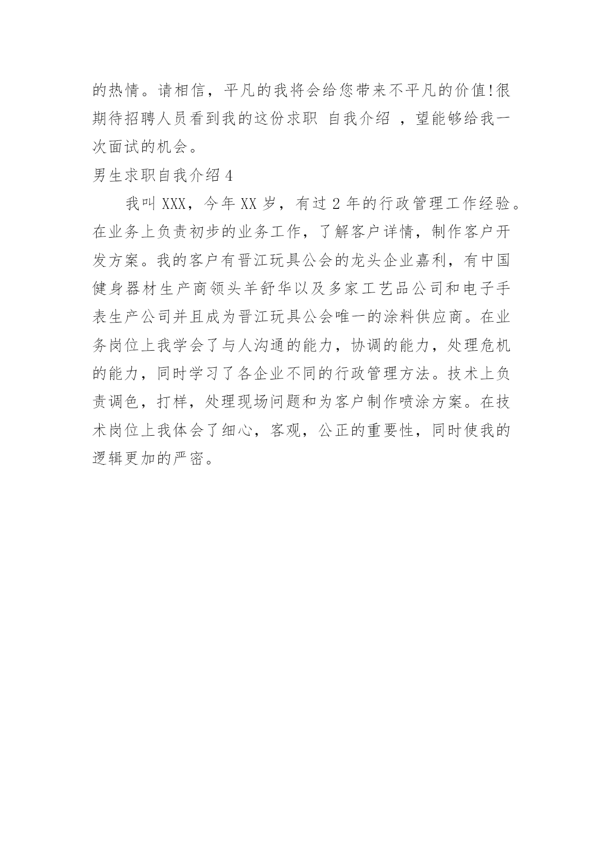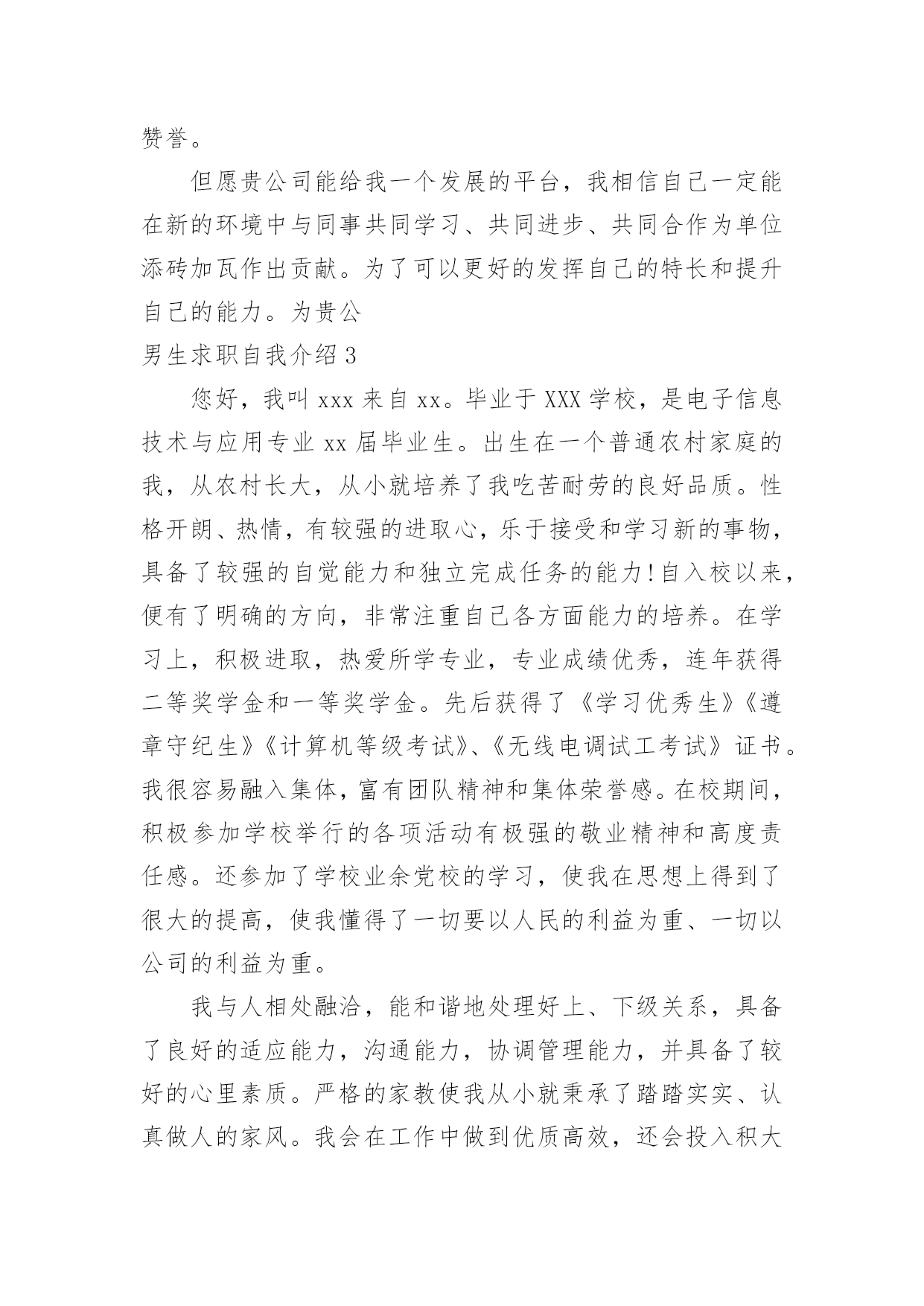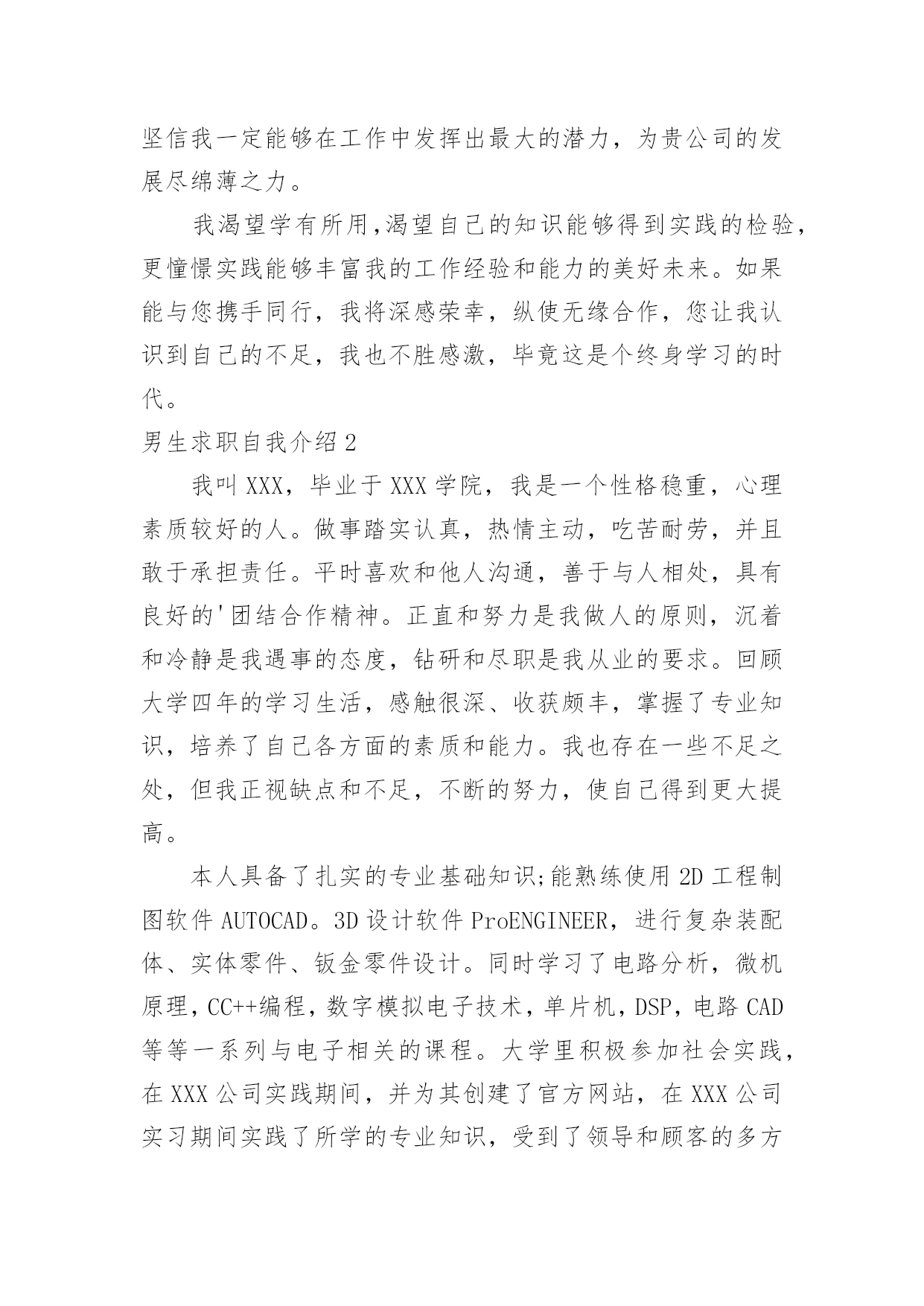 男生求职自我介绍男生求职自我介绍来到一个陌生的地方时,我们通常会被要求作自我介绍,通过自我介绍可以得到他人的认可。千万不能认为自我介绍随便应付就可以,下面是小编精心整理的男生求职自我介绍,欢迎大家借鉴与参考,希望对大家有所帮助。男生求职自我介绍1尊敬的领导:您好!我是XX科技大学(原洛阳工学院)电子信息工程专业20xx届本科毕业生。在投身社会之际,为了找到符合自己专业和兴趣的工作,更好地发挥自己的才能,我想申请贵公司招聘的职位!作为一名合格的大学毕业生,我热爱我的专业并为其投入了巨大的热情和精力。我所学习的内容包括了《电路》、《模拟电子技术》、《数字电子技术》、《C语言程序设计》、《数据结构》、《信号与系统》、《高频电子线路》、《通信原理》、《计算机操作系统》、《移动通信》、《微波技术与天线》等专业课程。在认真学习课本知识的同时,我积极参加校内外的实践活动,并获得了一些成绩。我深知自己在现今济济人才中不是一名最优秀者,但我相信,凭着我刻苦和顽强的拼搏精神,满腔的热情,不断创新的进取精神,良好的团队精神,虚心学习的品质,加上您给与我汲取知识和奉献自我的机会,我坚信我一定能够在工作中发挥出最大的潜力,为贵公司的发展尽绵薄之力。我渴望学有所用,渴望自己的知识能够得到实践的检验,更憧憬实践能够丰富我的工作经验和能力的美好未来。如果能与您携手同行,我将深感荣幸,纵使无缘合作,您让我认识到自己的不足,我也不胜感激,毕竟这是个终身学习的时代。男生求职自我介绍2我叫XXX,毕业于XXX学院,我是一个性格稳重,心理素质较好的人。做事踏实认真,热情主动,吃苦耐劳,并且敢于承担责任。平时喜欢和他人沟通,善于与人相处,具有良好的'团结合作精神。正直和努力是我做人的原则,沉着和冷静是我遇事的态度,钻研和尽职是我从业的要求。回顾大学四年的学习生活,感触很深、收获颇丰,掌握了专业知识,培养了自己各方面的素质和能力。我也存在一些不足之处,但我正视缺点和不足,不断的努力,使自己得到更大提高。本人具备了扎实的专业基础知识;能熟练使用2D工程制图软件AUTOCAD。3D设计软件ProENGINEER,进行复杂装配体、实体零件、钣金零件设计。同时学习了电路分析,微机原理,CC++编程,数字模拟电子技术,单片机,DSP,电路CAD等等一系列与电子相关的课程。大学里积极参加社会实践,在XXX公司实践期间,并为其创建了官方网站,在XXX公司实习期间实践了所学的专业知识,受到了领导和顾客的多方赞誉。但愿贵公司能给我一个发展的平台,我相信自己一定能在新的环境中与同事共同学习、共同进步、共同合作为单位添砖加瓦作出贡献。为了可以更好的发挥自己的特长和提升自己的能力。为贵公男生求职自我介绍3您好,我叫xxx来自xx。毕业于XXX学校,是电子信息技术与应用专业xx届毕业生。出生在一个普通农村家庭的我,从农村长大,从小就培养了我吃苦耐劳的良好品质。性格开朗、热情,有较强的进取心,乐于接受和学习新的事物,具备了较强的自觉能力和独立完成任务的能力!自入校以来,便有了明确的方向,非常注重自己各方面能力的培养。在学习上,积极进取,热爱所学专业,专业成绩优秀,连年获得二等奖学金和一等奖学金。先后获得了《学习优秀生》《遵章守纪生》《计算机等级考试》、《无线电调试工考试》证书。我很容易融入集体,富有团队精神和集体荣誉感。在校期间,积极参加学校举行的各项活动有极强的敬业精神和高度责任感。还参加了学校业余党校的学习,使我在思想上得到了很大的提高,使我懂得了一切要以人民的利益为重、一切以公司的利益为重。我与人相处融洽,能和谐地处理好上、下级关系,具备了良好的适应能力,沟通能力,协调管理能力,并具备了较好的心里素质。严格的家教使我从小就秉承了踏踏实实、认真做人的家风。我会在工作中做到优质高效,还会投入积大的热情。请相信,平凡的我将会给您带来不平凡的价值!很期待招聘人员看到我的这份求职自我介绍,望能够给我一次面试的机会。男生求职自我介绍4我叫XXX,今年XX岁,有过2年的行政管理工作经验。在业务上负责初步的业务工作,了解客户详情,制作客户开发方案。我的客户有晋江玩具公会的龙头企业嘉利,有中国健身器材生产商领头羊舒华以及多家工艺品公司和电子手表生产公司并且成为晋江玩具公会唯一的涂料供应商。在业务岗位上我学会了与人沟通的能力,协调的能力,处理危机的能力,同时学习了各企业不同的行政管理方法。技术上负责调色,打样,处理现场问题和为客户制作喷涂方案。在技术岗位上我体会了细心,客观,公正的重要性,同时使我的逻辑更加的严密。