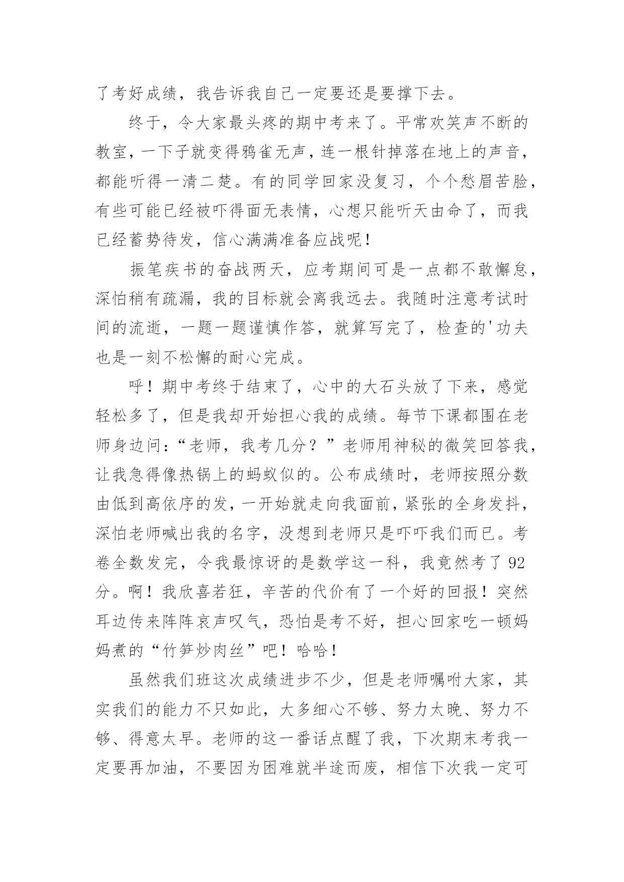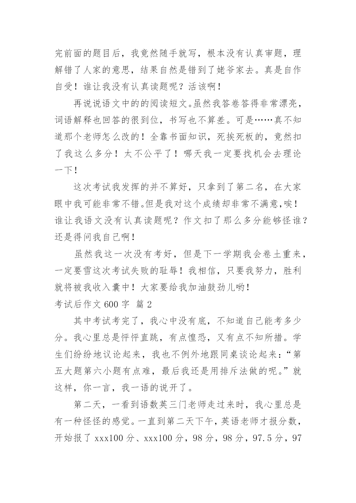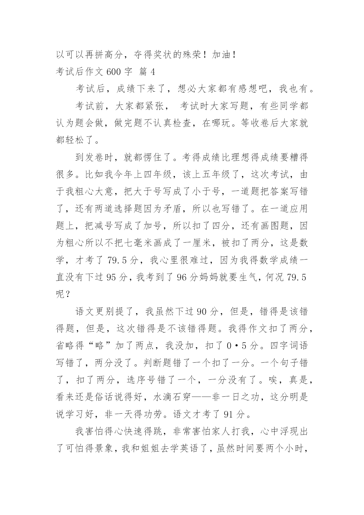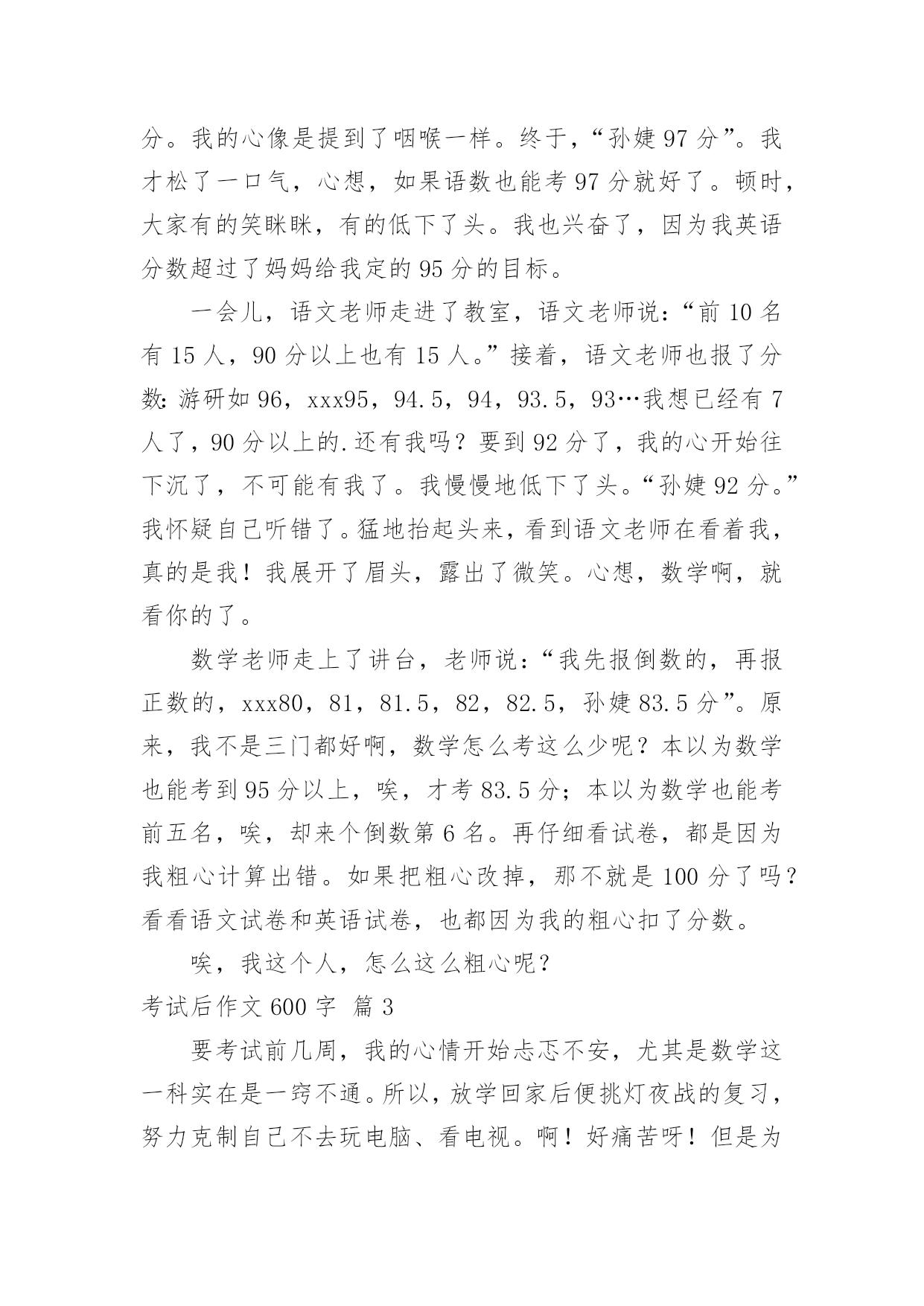 考试后作文600字【精华】考试后作文600字4篇在学习、工作或生活中,大家都尝试过写作文吧,作文一定要做到主题集中,围绕同一主题作深入阐述,切忌东拉西扯,主题涣散甚至无主题。还是对作文一筹莫展吗?以下是小编整理的考试后作文600字4篇,希望能够帮助到大家。考试后作文600字篇1今天考,试试卷发下来了,几家欢喜几家愁的时刻终于再一次到来。然而以往一直是欢喜的我,这一次却是百感交集。在试卷发下来之前,我的心是在“怦怦”的跳着。发下来之后,我的心中就一半儿充满了酸味儿,一半儿充满了甜味儿。大家一定会问:“这是为什么呢?”别急,我来慢慢解释。在对大家做出解释之前,我先把我的成绩向大家汇报一下:语文90。5,数学100,英语97。怎么样,我的成绩还算不错吧?OK,现在成绩汇报完了,我来给大家做解释。这次考试我们班普遍都考得非常糟糕,语文上90分的只有那么区区四个人,英语也考得远远不如人家一班。按理说我的成绩还算是不错的。但是这次语文……实在是让我太失望了!先来说说语文。我是上九十分的四个人中的.一个,但是仍然令我非常不满意。其中最令我不满意的就是作文。做完前面的题目后,我竟然随手就写,根本没有认真审题,理解错了人家的意思,结果自然是错到了姥爷家去。真是自作自受!谁让我没有认真读题呢?活该啊!再说说语文中的的阅读短文。虽然我答卷答得非常漂亮,词语解释也回答的很到位,书写也不算差。可是……真不知道那个老师怎么改的!全靠书面知识,死挨死板的,竟然扣了我这么多分!太不公平了!哪天我一定要找机会去理论一下!这次考试我发挥的并不算好,只拿到了第二名,在大家眼中我可能非常不错。但是我对这个成绩却非常不满意,唉!谁让我语文没有认真读题呢?作文扣了那么多分能够怪谁?还是得问我自己啊!虽然我这一次没有考好,但是下一学期我会卷土重来,一定要雪这次考试失败的耻辱!我相信,只要我努力,胜利就将被我收入囊中!大家要给我加油鼓劲儿哟!考试后作文600字篇2其中考试考完了,我心中没有底,不知道自己能考多少分。我心里总是怦怦直跳,有点惶恐,又有点不知所措。学生们纷纷地议论起来,我也不例外地跟同桌谈论起来:“第五大题第六小题有点难,最后我还是用排斥法做的呢。”就这样,你一言,我一语的说开了。第二天,一看到语数英三门老师走过来时,我心里总是有一种怪怪的感觉。一直到第二天下午,英语老师才报分数,开始报了xxx100分、xxx100分,98分,98分,97.5分,97分。我的心像是提到了咽喉一样。终于,“孙婕97分”。我才松了一口气,心想,如果语数也能考97分就好了。顿时,大家有的笑眯眯,有的低下了头。我也兴奋了,因为我英语分数超过了妈妈给我定的95分的目标。一会儿,语文老师走进了教室,语文老师说:“前10名有15人,90分以上也有15人。”接着,语文老师也报了分数:游研如96,xxx95,94.5,94,93.5,93…我想已经有7人了,90分以上的.还有我吗?要到92分了,我的心开始往下沉了,不可能有我了。我慢慢地低下了头。“孙婕92分。”我怀疑自己听错了。猛地抬起头来,看到语文老师在看着我,真的是我!我展开了眉头,露出了微笑。心想,数学啊,就看你的了。数学老师走上了讲台,老师说:“我先报倒数的,再报正数的,xxx80,81,81.5,82,82.5,孙婕83.5分”。原来,我不是三门都好啊,数学怎么考这么少呢?本以为数学也能考到95分以上,唉,才考83.5分;本以为数学也能考前五名,唉,却来个倒数第6名。再仔细看试卷,都是因为我粗心计算出错。如果把粗心改掉,那不就是100分了吗?看看语文试卷和英语试卷,也都因为我的粗心扣了分数。唉,我这个人,怎么这么粗心呢?考试后作文600字篇3要考试前几周,我的心情开始忐忑不安,尤其是数学这一科实在是一窍不通。所以,放学回家后便挑灯夜战的复习,努力克制自己不去玩电脑、看电视。啊!好痛苦呀!但是为了考好成绩,我告诉我自己一定要还是要撑下去。终于,令大家最头疼的期中考来了。平常欢笑声不断的教室,一下子就变得鸦雀无声,连一根针掉落在地上的声音,都能听得一清二楚。有的同学回家没复习,个个愁眉苦脸,有些可能已经被吓得面无表情,心想只能听天由命了,而我已经蓄势待发,信心满满准备应战呢!振笔疾书的奋战两天,应考期间可是一点都不敢懈怠,深怕稍有疏漏,我的目标就会离我远去。我随时注意考试时间的流逝,一题一题谨慎作答,就算写完了,检查的'功夫也是一刻不松懈的耐心完成。呼!期中考终于结束了,心中的大石头放了下来,感觉轻松多了,但是我却开始担心我的成绩。每节下课都围在老师身边问:“老师,我考几分?”老师用神秘的微笑回答我,让我急得像热锅上的蚂蚁似的。公布成绩时,老师按照分数由低到高依序的发,一开始就走向我面前,紧张的全身发抖,深怕老师喊出我的名字,没想到老