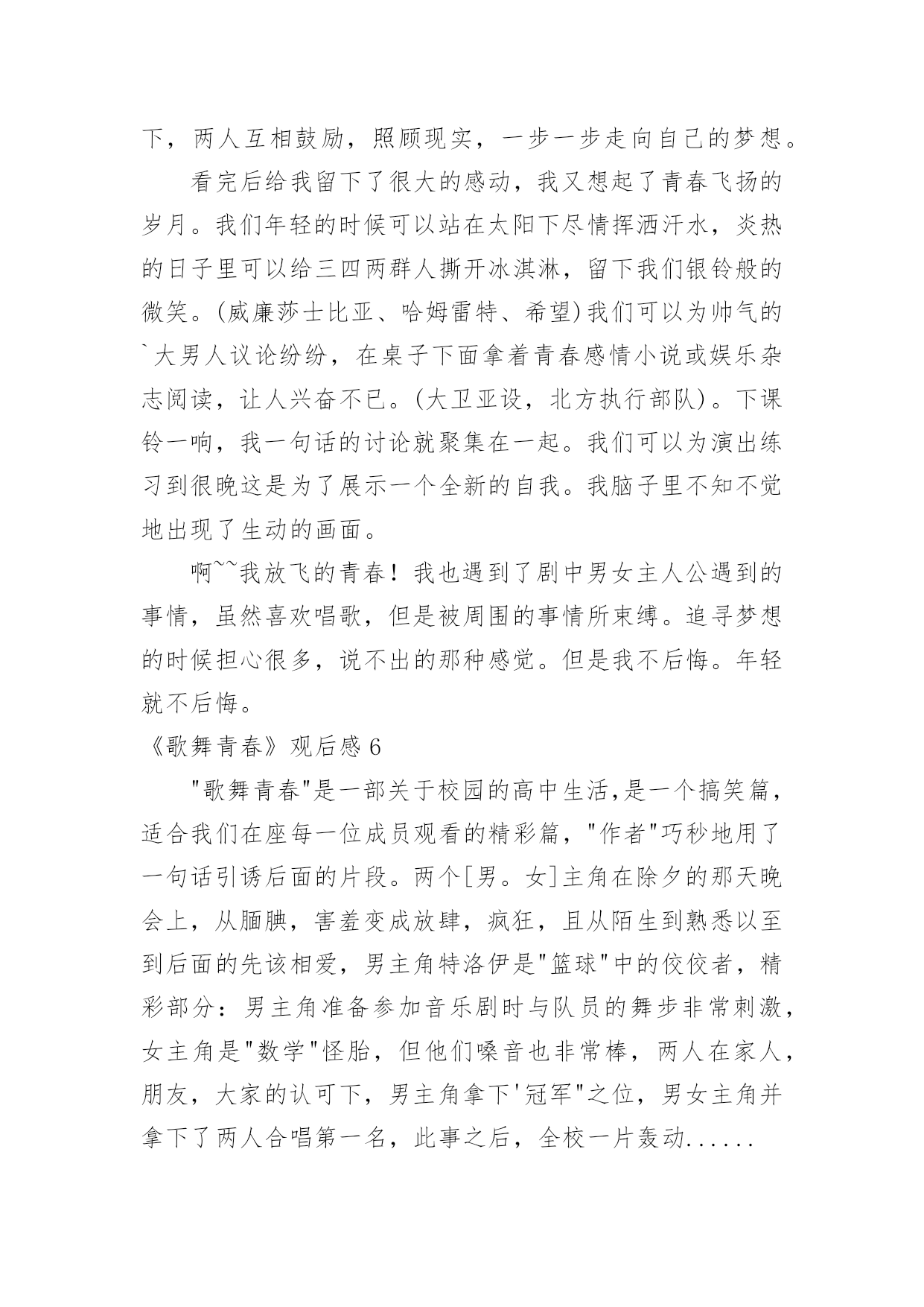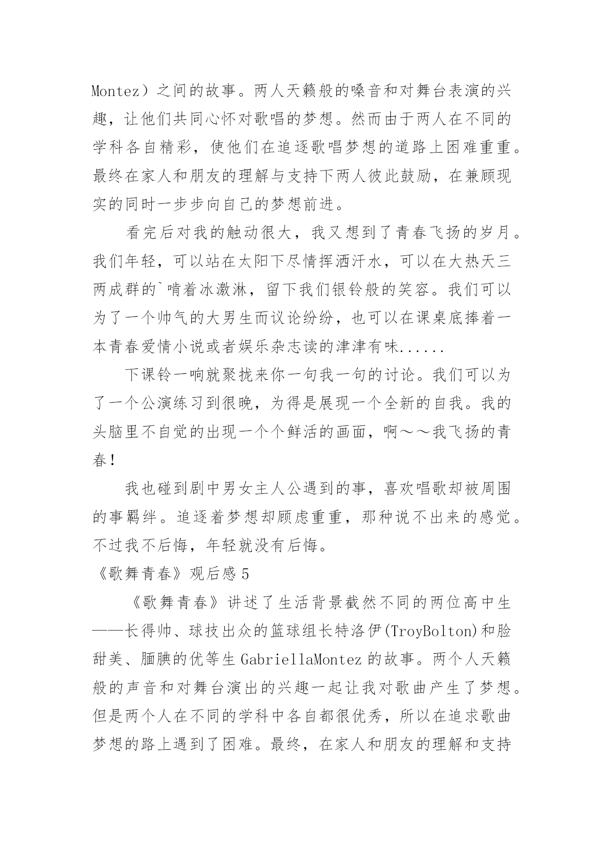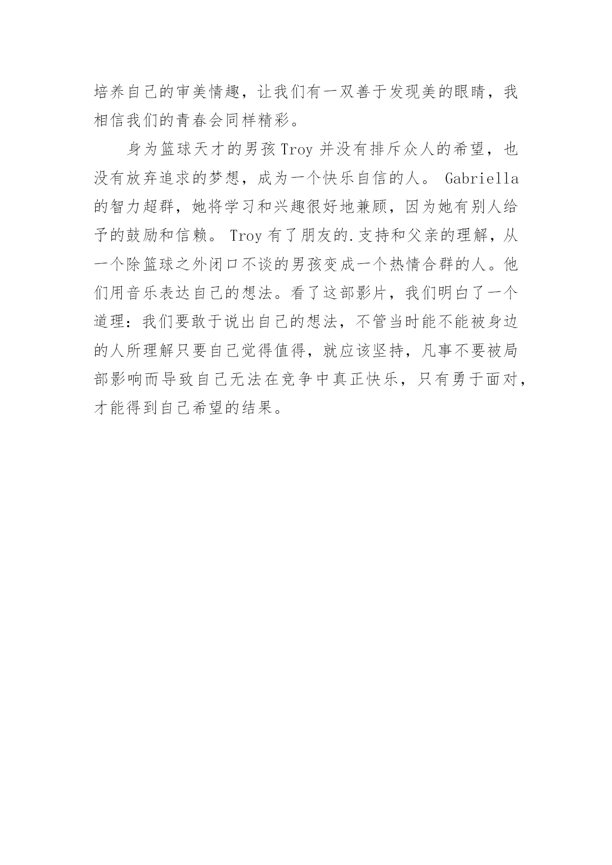 《歌舞青春》观后感《歌舞青春》观后感9篇看完某一作品后,相信你一定有很多值得分享的收获,不妨坐下来好好写写观后感吧。但是观后感有什么要求呢?以下是小编帮大家整理的《歌舞青春》观后感,供大家参考借鉴,希望可以帮助到有需要的朋友。《歌舞青春》观后感1歌舞青春》讲述了两个生活背景迥然不一样的高中生:帅气英俊、球技高超的篮球校队队长特洛伊(TroyBolton)和容貌甜美、易于害羞的优等转学生凯碧(GabriellaMontez)之间的故事。两人天籁般的嗓音和对舞台表演的兴趣,让他们共同心怀对歌唱的梦想。然而由于两人在不一样的学科各自精彩,使他们在追逐歌唱梦想的道路上困难重重。最终在家人和朋友的理解与支持下两人彼此鼓励,在兼顾现实的`同时一步步向自我的梦想前进。看完后对我的触动很大,我又想到了青春飞扬的岁月。我们年轻,能够站在太阳下尽情挥洒汗水,能够在大热天三两成群的啃着冰激淋,留下我们银铃般的笑容。我们能够为了一个帅气的大男生而议论纷纷,也能够在课桌底捧着一本青春感情小说或者娱乐杂志读的津津有味。下课铃一响就聚拢来你一句我一句的讨论。我们能够为了一个公演练习到很晚,为得是展现一个全新的自我。我的头脑里不自觉的出现一个个鲜活的画面,啊~~我飞扬的青春!我也碰到剧中男女主人公遇到的事,喜欢唱歌却被周围的事羁绊。追逐着梦想却顾虑重重,那种说不出来的感觉。可是我不后悔,年轻就没有后悔。《歌舞青春》观后感2《歌舞青春》讲述了两个生活背景迥然不同的高中生:帅气英俊、球技高超的篮球校队队长特洛伊(TroyBolton)和容貌甜美、易于害羞的优等转学生凯碧(GabriellaMontez)之间的故事。两人天籁般的嗓音和对舞台表演的兴趣,让他们共同心怀对歌唱的梦想。然而由于两人在不同的学科各自精彩,使他们在追逐歌唱梦想的道路上困难重重。最终在家人和朋友的理解与支持下两人彼此鼓励,在兼顾现实的同时一步步向自己的梦想前进。看完后对我的触动很大,我又想到了青春飞扬的岁月.我们年轻,可以站在太阳下尽情挥洒汗水,可以在大热天三两成群的啃着冰激淋,留下我们银铃般的笑容.我们可以为了一个帅气的大男生而议论纷纷,也可以在课桌底捧着一本青春爱情小说或者娱乐杂志读的.津津有味....下课铃一响就聚拢来你一句我一句的讨论.我们可以为了一个公演练习到很晚,为得是展现一个全新的自我......我的头脑里不自觉的出现一个个鲜活的画面,啊~~我飞扬的青春!我也碰到剧中男女主人公遇到的事,喜欢唱歌却被周围的事羁绊.追逐着梦想却顾虑重重,那种说不出来的感觉.....不过我不后悔,年轻就没有后悔.《歌舞青春》观后感3《歌舞青春》讲述了两个生活背景迥然不同的高中生:帅气英俊、球技高超的篮球校队队长特洛伊(TroyBolton)和容貌甜美、易于害羞的优等转学生凯碧(GabriellaMontez)之间的故事。两人天籁般的嗓音和对舞台表演的兴趣,让他们共同心怀对歌唱的梦想。然而由于两人在不同的学科各自精彩,使他们在追逐歌唱梦想的道路上困难重重。最终在家人和朋友的理解与支持下两人彼此鼓励,在兼顾现实的同时一步步向自己的梦想前进。看完后对我的.触动很大,我又想到了青春飞扬的岁月。我们年轻,可以站在太阳下尽情挥洒汗水,可以在大热天三两成群的啃着冰激淋,留下我们银铃般的笑容。我们可以为了一个帅气的大男生而议论纷纷,也可以在课桌底捧着一本青春爱情小说或者娱乐杂志读的津津有味.....下课铃一响就聚拢来你一句我一句的讨论。我们可以为了一个公演练习到很晚,为得是展现一个全新的自我.....我的头脑里不自觉的出现一个个鲜活的画面,啊~~我飞扬的青春!我也碰到剧中男女主人公遇到的事,喜欢唱歌却被周围的事羁绊。追逐着梦想却顾虑重重,那种说不出来的感觉.....不过我不后悔,年轻就没有后悔。《歌舞青春》观后感4《歌舞青春》讲述了两个生活背景迥然不同的高中生:帅气英俊、球技高超的篮球校队队长特洛伊(TroyBolton)和容貌甜美、易于害羞的优等转学生凯碧(GabriellaMontez)之间的故事。两人天籁般的嗓音和对舞台表演的兴趣,让他们共同心怀对歌唱的梦想。然而由于两人在不同的学科各自精彩,使他们在追逐歌唱梦想的道路上困难重重。最终在家人和朋友的理解与支持下两人彼此鼓励,在兼顾现实的同时一步步向自己的梦想前进。看完后对我的触动很大,我又想到了青春飞扬的岁月。我们年轻,可以站在太阳下尽情挥洒汗水,可以在大热天三两成群的`啃着冰激淋,留下我们银铃般的笑容。我们可以为了一个帅气的大男生而议论纷纷,也可以在课桌底捧着一本青春爱情小说或者娱乐杂志读的津津有味......下课铃一响就聚拢来你一句我一句的讨论。我们可以为了一个公演练习到很晚,为得是展现一个全新的自我。我的头脑里不自觉的出现一个个鲜活的画面,啊~~我飞扬