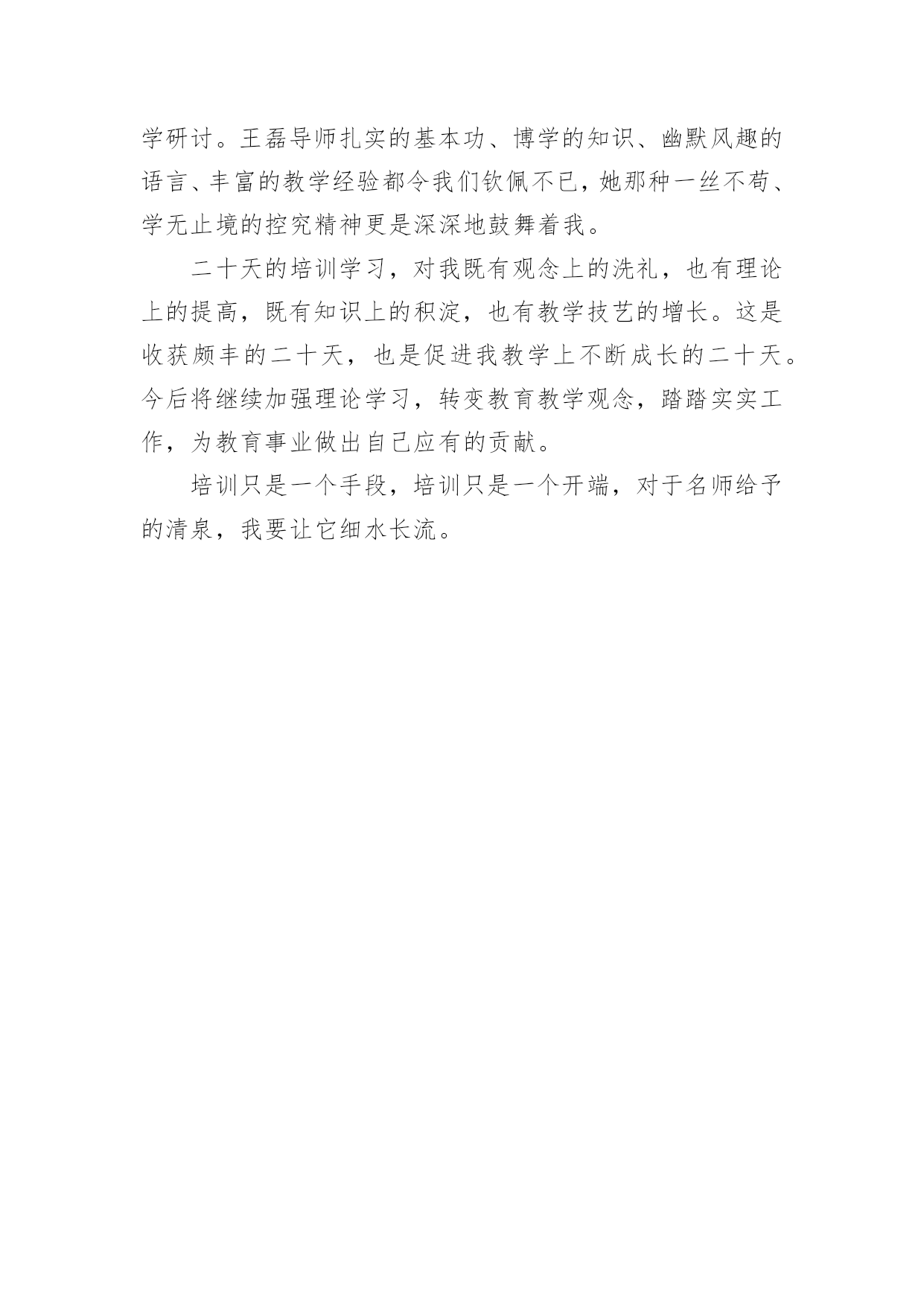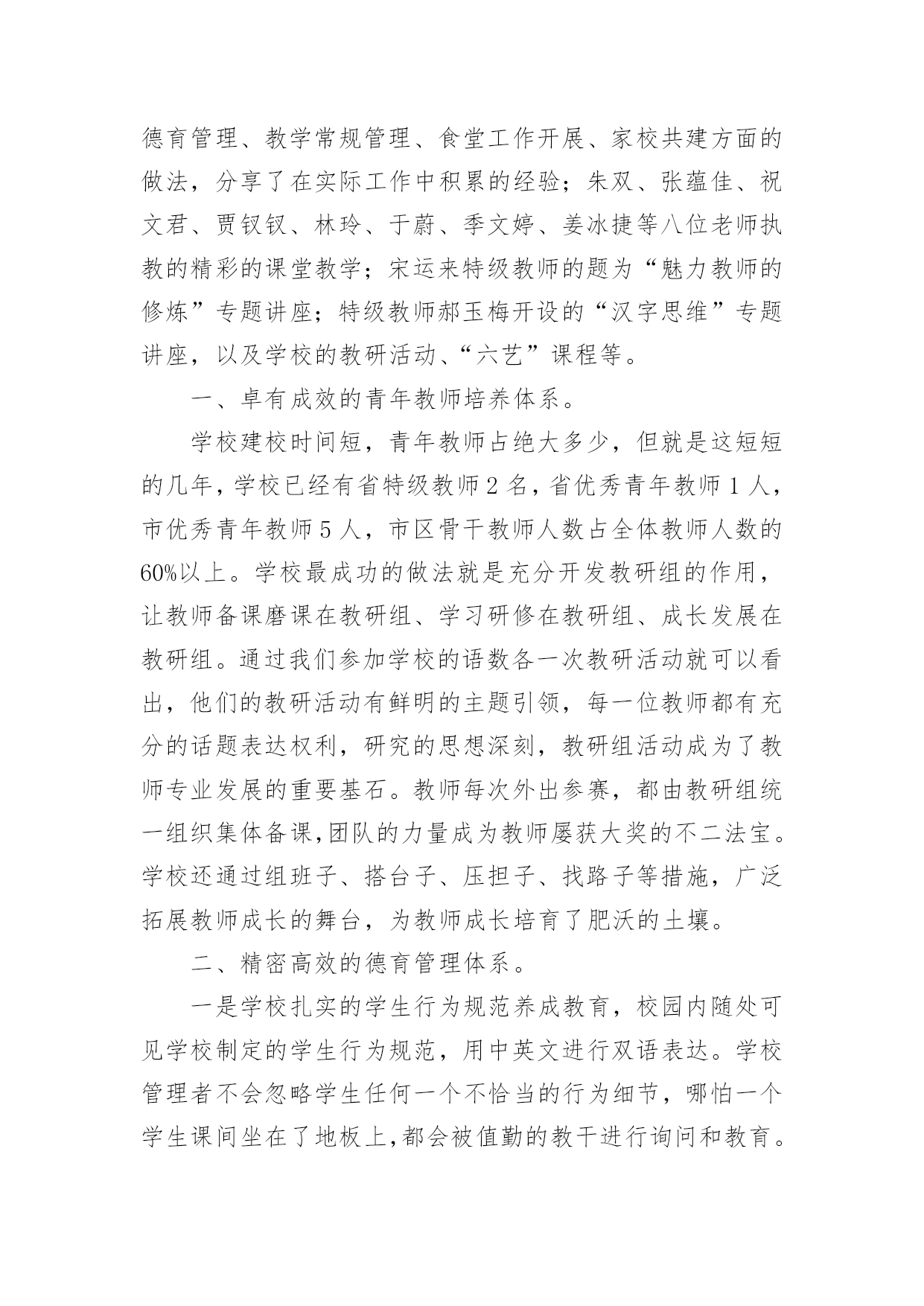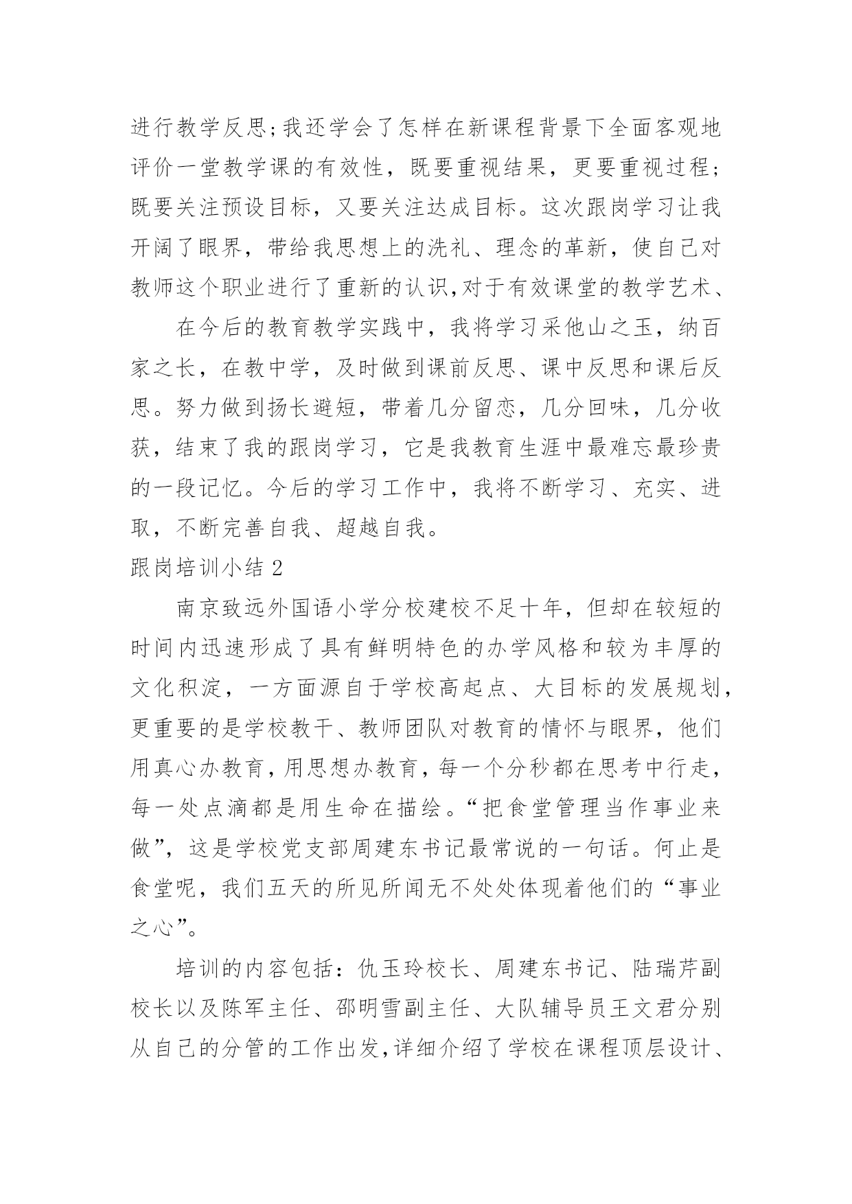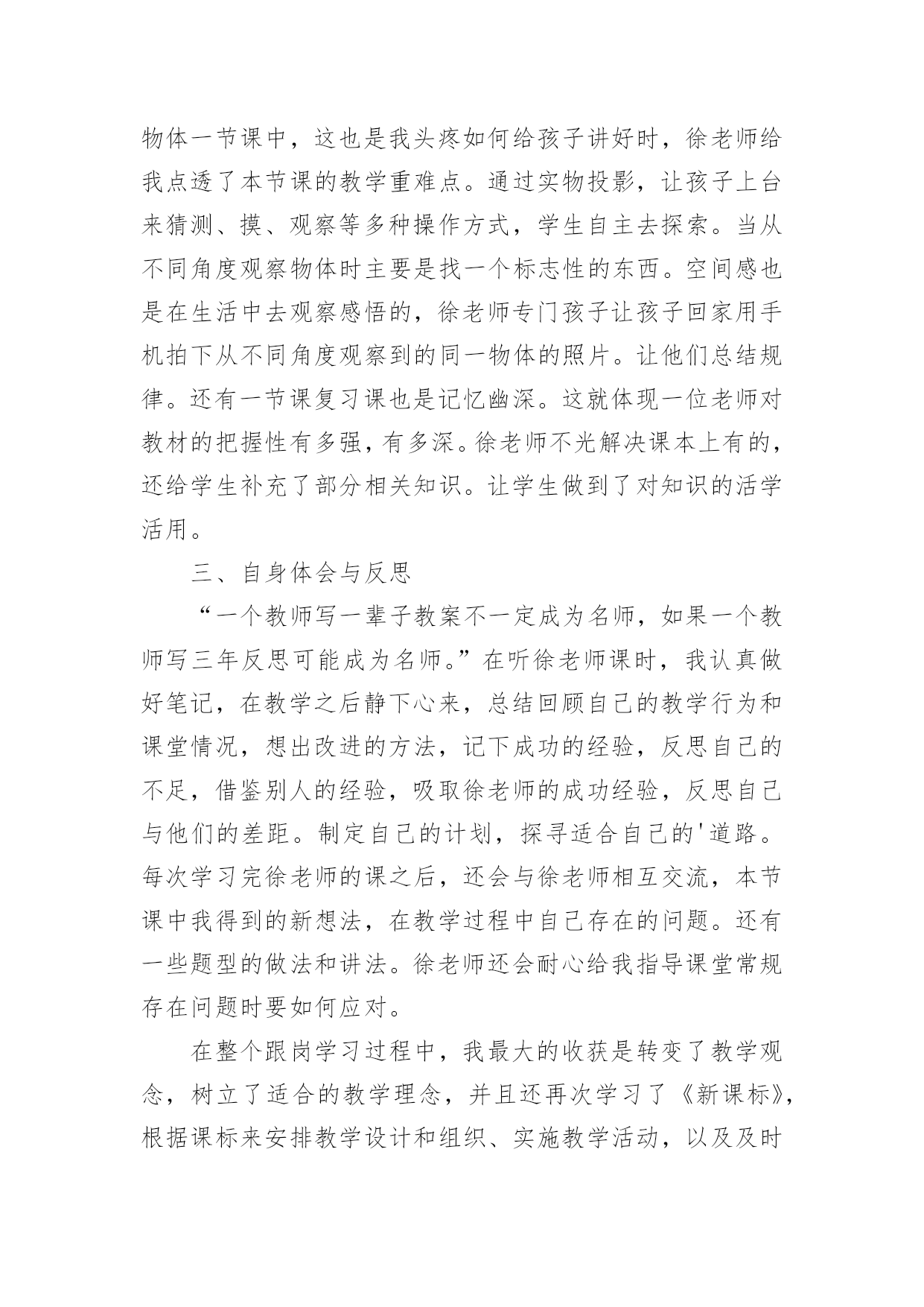 跟岗培训小结跟岗培训小结一段时间的工作在不知不觉间已经告一段落了,相信你一定有很多值得分享的经验,立即行动起来写一份小结吧。我们该怎么去写小结呢?以下是小编帮大家整理的跟岗培训小结,希望能够帮助到大家。跟岗培训小结1时间过得真快,一个月的跟岗学习已经结束了,在过去的这一个月里,我在交大附小每周跟岗学习一次,虽然只有短短的五次,但是就这短短的五次机会,已经给我教师生涯增添了亮丽的一笔,让我收货颇多。也非常感谢领导能给我这次外出学习的机会,让我能有机会提高自身业务水平。回首这些天的学习,我所经历的点点滴滴,时时刻刻,都在收获着!进步着!感动着!现把我的学习体会汇报如下:一、提高了自身素养在这五周的日子里,我亲眼目睹了徐茜老师踏实严谨的工作作风,卓有成效的工作效率;亲身感受了徐老师平易近人的处世态度和无微不至的关怀照顾。徐老师为了让我们不虚此行,精心准备每一项工作,不但认真备课,上好每一节课,上好各种类型的课,我想,“学高为师,身正为范”应该是徐老师真实的写照,也是我今后努力的方向。徐老师这种认真负责的态度,让我这个刚走上工作岗位的新手自叹不如,也让我反思到了自己的不足。比如当徐老师的课堂上有学生不认真听讲时她会通过巧妙的语言来提醒学生,而不是以为的批评。有些孩子回答问题不完整,虚劳是说“我喜欢把话说完整的孩子。”一句简单的话就使孩子回答得很好。当有学生说和上课无关的话题时,徐老师会用医生给一个同时得了感冒和受伤骨折的病人,如果学生是医生,是先治感冒还是骨折的生活实例让学生把重点放到课堂。徐老师的作业批改虽然很简单,但是字里行间都能看出徐老师很认真,每一次作业中学生出错原因都有注明,并且让学生养成良好的改错习惯。试卷出错,徐老师都回让孩子用张白纸把错题从新抄到纸上再做一遍,并做好复批工作。在讲课过程中,徐老师不会是因为自己是数学老师只关注数学知识,在板书遇到学生没有学过的字,徐老师都会在旁边注音,学生在抄笔记时也会用拼音代替。能看出徐老师的用心良苦。这也使我在教学能力的提高上很有启发。二、提高自身业务水平在这一个月的跟岗学习的日子里,我听到了的最真实的常态课,它既没有过多的修饰,也没有太多的花俏。这样的课堂让我感到朴实、自然,更让我看到了徐老师的工作态度、专业素质,对孩子们的热爱与关注。也深深体会到徐老师用心良苦对学生语言能力的培养、注重孩子发散思维的培养、注重孩子经验的分享、能力的提高。朴朴实实一节课,不许要用花哨的课件去装饰,只需动手操作,实物投影就可把一节课上的很充实。在这些课,印象最深的就是徐老师的观察物体一节课中,这也是我头疼如何给孩子讲好时,徐老师给我点透了本节课的教学重难点。通过实物投影,让孩子上台来猜测、摸、观察等多种操作方式,学生自主去探索。当从不同角度观察物体时主要是找一个标志性的东西。空间感也是在生活中去观察感悟的,徐老师专门孩子让孩子回家用手机拍下从不同角度观察到的同一物体的照片。让他们总结规律。还有一节课复习课也是记忆幽深。这就体现一位老师对教材的把握性有多强,有多深。徐老师不光解决课本上有的,还给学生补充了部分相关知识。让学生做到了对知识的活学活用。三、自身体会与反思“一个教师写一辈子教案不一定成为名师,如果一个教师写三年反思可能成为名师。”在听徐老师课时,我认真做好笔记,在教学之后静下心来,总结回顾自己的教学行为和课堂情况,想出改进的方法,记下成功的经验,反思自己的不足,借鉴别人的经验,吸取徐老师的成功经验,反思自己与他们的差距。制定自己的计划,探寻适合自己的'道路。每次学习完徐老师的课之后,还会与徐老师相互交流,本节课中我得到的新想法,在教学过程中自己存在的问题。还有一些题型的做法和讲法。徐老师还会耐心给我指导课堂常规存在问题时要如何应对。在整个跟岗学习过程中,我最大的收获是转变了教学观念,树立了适合的教学理念,并且还再次学习了《新课标》,根据课标来安排教学设计和组织、实施教学活动,以及及时进行教学反思;我还学会了怎样在新课程背景下全面客观地评价一堂教学课的有效性,既要重视结果,更要重视过程;既要关注预设目标,又要关注达成目标。这次跟岗学习让我开阔了眼界,带给我思想上的洗礼、理念的革新,使自己对教师这个职业进行了重新的认识,对于有效课堂的教学艺术、在今后的教育教学实践中,我将学习采他山之玉,纳百家之长,在教中学,及时做到课前反思、课中反思和课后反思。努力做到扬长避短,带着几分留恋,几分回味,几分收获,结束了我的跟岗学习,它是我教育生涯中最难忘最珍贵的一段记忆。今后的学习工作中,我将不断学习、充实、进取,不断完善自我、超越自我。跟岗培训小结2南京致远外国语小学分校建校不足十年,但却在较短的时间内迅速形成了具有鲜明特色的办学风格和较为丰厚的文化积淀,一方面源自于学校高起点、大目标的发展规划,更重要的是