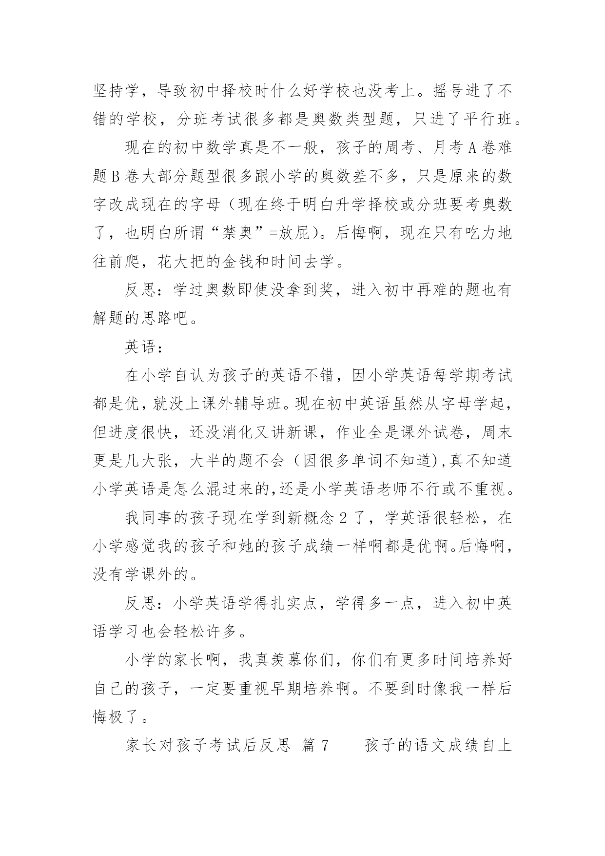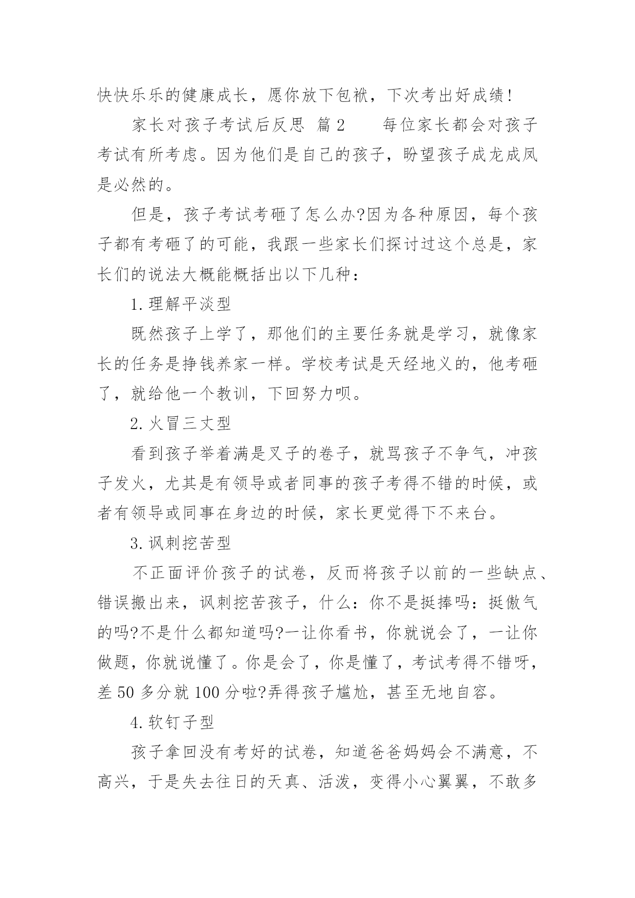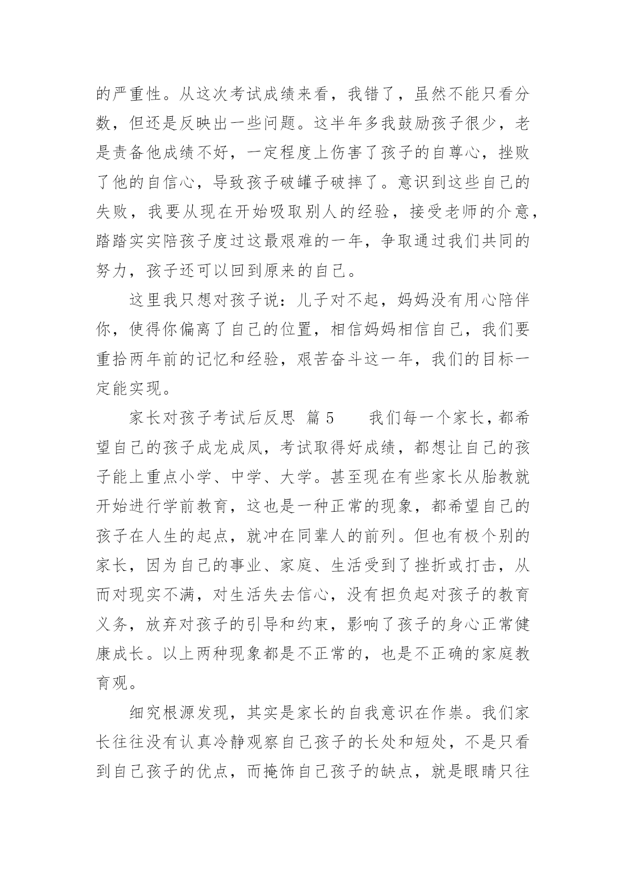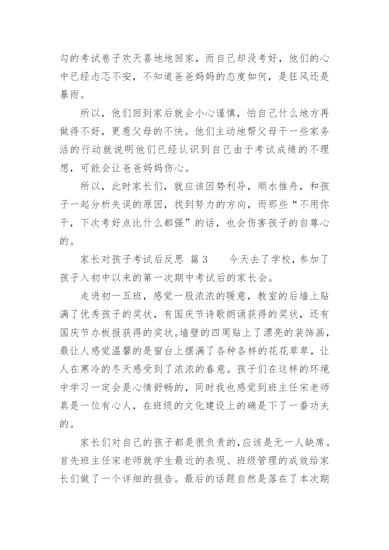 家长对孩子考试后反思家长对孩子考试后反思(精选10篇)随着社会一步步向前发展,课堂教学是我们的工作之一,反思指回头、反过来思考的意思。那么问题来了,反思应该怎么写?以下是小编帮大家整理的家长对孩子考试后反思,欢迎大家分享。家长对孩子考试后反思篇1孩子上初中,第一次开的家长会,通过齐老师的介绍,我觉得学校平时对孩子的教育都是潜移默化的培养,让我感到非常放心。父母是孩子的第一任老师,看着孩子一天天长大、一天天懂事,作为父母感到无限的欣慰。每次看到老师定时和我们家长沟通信息时,让我们深深的体会到你们为此付出的心血,感到这是一群真正热爱孩子的园丁,在这里首先我要感谢老师们!在孩子刚刚起步的时候,让他享受成长的快乐,学会与人真诚交往、关爱他人的习惯、正确的学习态度比什么都重要。我的孩子基础不太好,学习努力的不够,考试成绩也不理想,学习时间长,但没效率,可能学习办法不对?还是?有时候课文没背完,手里拿着书睡着了……看着很心痛的……第二天早上叫他起来背……但是学习成绩上不去……当父母的心里很着急……可能我们家长做的不到位吧!今天开完家长会后我回来反思了很多……我觉得平时可能对孩子的要求不太高——孩子做完作业就让他放松,没有预习和复习的过程等……孩子的学习成绩直接影响全家的“情绪”,但我很少责怪孩子,多在鼓励他,使孩子树立信心。只是埋怨自己平时关心的不够…在这里我把听到的优秀孩子家长的经验和自己今天感受到的总结起来送给孩子,希望孩子能从中悟出几分道理,有所进步。第一、你所处的是一个竞争的社会,既然没有办法改变它,那么就只有去适应它。第二、人生有起有伏,只有这样才会成长,上帝安排给人的每一次挫折,不管有多难,有多痛苦,都是能承受得了的。第三、泪水和汗水化学成分相似,但前者只能为你换来同情,后者可以为你赢得成功。第四、超越自己比超越别人更困难,实在是支撑不住的时候,说声“我好累”,但不能说“我不行”。第五、如果你以前的成绩不好,说明你做的不够好,要从现在做起。第六、失败并不可怕,可怕的是自己放弃。第七、考试是最公平的竞争,只有知识才能改变自己的命运。第八、人的一生有无数的风风雨雨在等着你,要学会承受风雨、学会坚强、学会做人、学会自己长大……第九、人生就如同一面镜子,你对它笑,它就对你笑;你对它哭,它就对你哭。在如梦短暂的生命中,只有自己展开了笑脸,才能说一切都是美好的。老师和家长都是真心期望你能少一点烦恼,多一点开心,快快乐乐的健康成长,愿你放下包袱,下次考出好成绩!家长对孩子考试后反思篇2每位家长都会对孩子考试有所考虑。因为他们是自己的孩子,盼望孩子成龙成凤是必然的。但是,孩子考试考砸了怎么办?因为各种原因,每个孩子都有考砸了的可能,我跟一些家长们探讨过这个总是,家长们的说法大概能概括出以下几种:1.理解平淡型既然孩子上学了,那他们的主要任务就是学习,就像家长的任务是挣钱养家一样。学校考试是天经地义的,他考砸了,就给他一个教训,下回努力呗。2.火冒三丈型看到孩子举着满是叉子的卷子,就骂孩子不争气,冲孩子发火,尤其是有领导或者同事的孩子考得不错的时候,或者有领导或同事在身边的时候,家长更觉得下不来台。3.讽刺挖苦型不正面评价孩子的试卷,反而将孩子以前的一些缺点、错误搬出来,讽刺挖苦孩子,什么:你不是挺捧吗:挺傲气的吗?不是什么都知道吗?一让你看书,你就说会了,一让你做题,你就说懂了。你是会了,你是懂了,考试考得不错呀,差50多分就100分啦?弄得孩子尴尬,甚至无地自容。4.软钉子型孩子拿回没有考好的试卷,知道爸爸妈妈会不满意,不高兴,于是失去往日的天真、活泼,变得小心翼翼,不敢多说话,主动地帮助妈妈洗菜做饭干一些家务活,或帮爸爸妈妈沏茶倒水献些殷勤,以表示惭愧,但有些家长还是说,行啦,算了吧,这些用不着你,下次考试多得几分,比帮我干活更让我高兴。当然,我这里介绍的只是些家长的不适宜的做法,为什么说这些做法不适宜呢?我们来简单地剖析几句。1.理解平淡型的不适宜孩子到学校上学,学习当然是他们的第一任务,为了检查学生知识的程度,学校用统一的标准对学生进行考试,当然是天经地义的,但是这个类型的家长想过这样一个问题吗,考试的目的,不仅是为了检查孩子已经学过的知识掌握的程度,更是为了通过考试,让孩子找出自己对知识掌握的薄弱环节,以利今后的进步。所以,家长不能认为考试是孩子的事情,由于孩子的年龄小,经验少,他们还不能比较全面、客观地分析自己考试失误的原因,这就需要家长和孩子坐在一起,在和孩子沟通中,找出考试失误的真正原因。(关于考试失误原因,在后述中还有谈到)2.火冒三丈型的不适宜这类家长的不适宜多在于两个方面:一个方面是没有认识到人是有差异的,就是说人和人是不一样的,人的身体条件、心理条件、环境条件、智力条件、家长条件等等,都会影响孩子的学习,甚至考试之