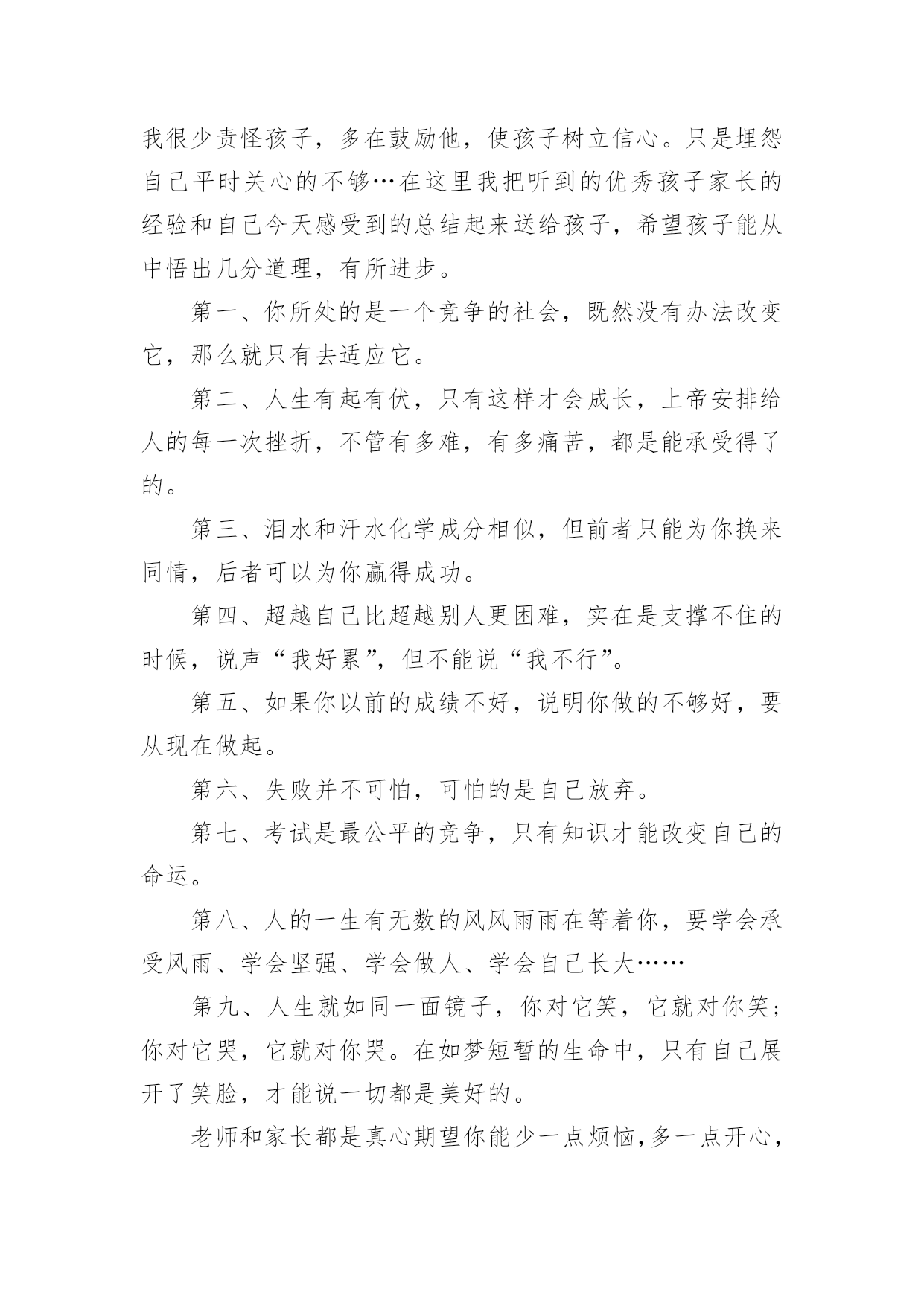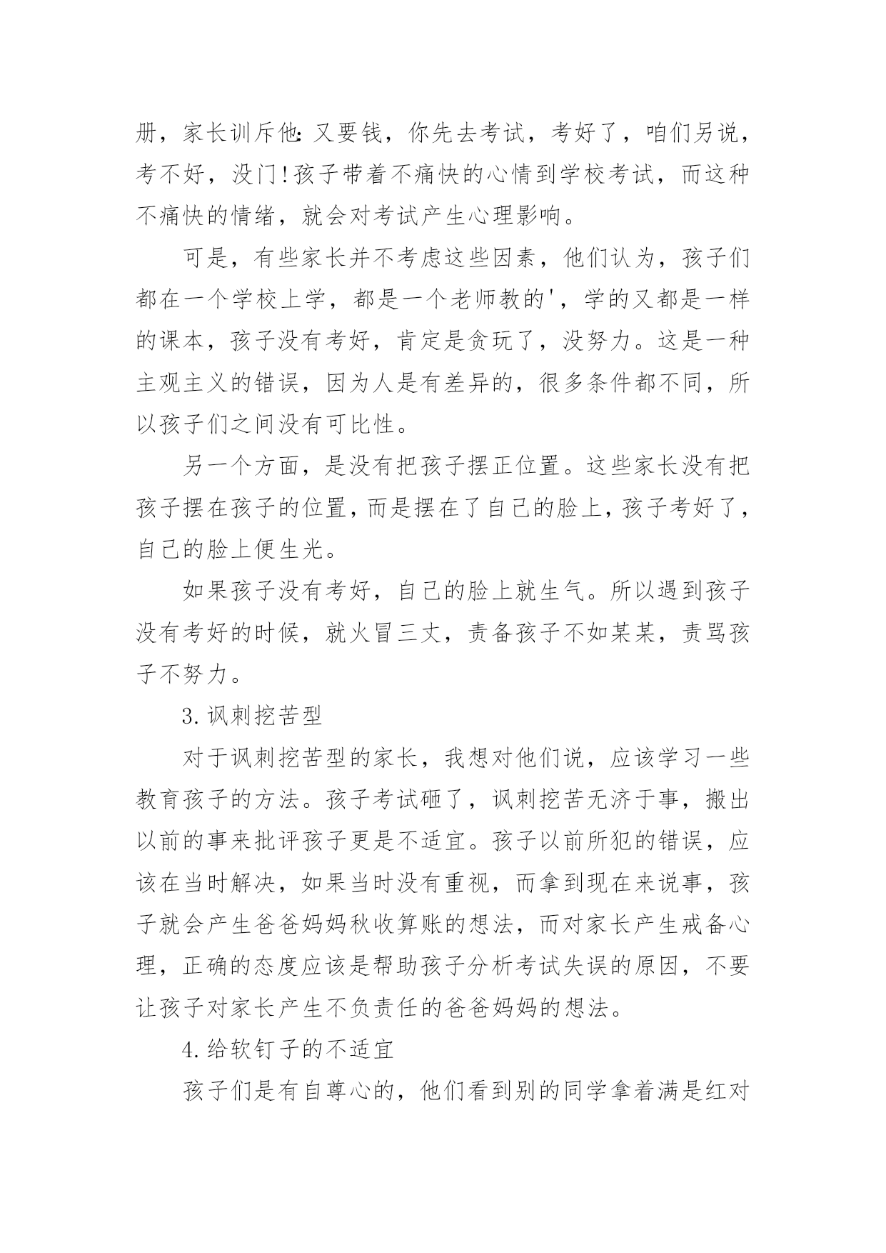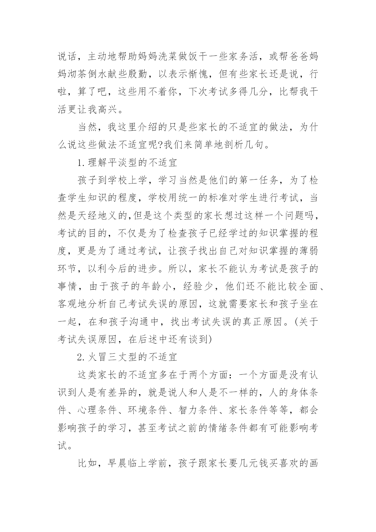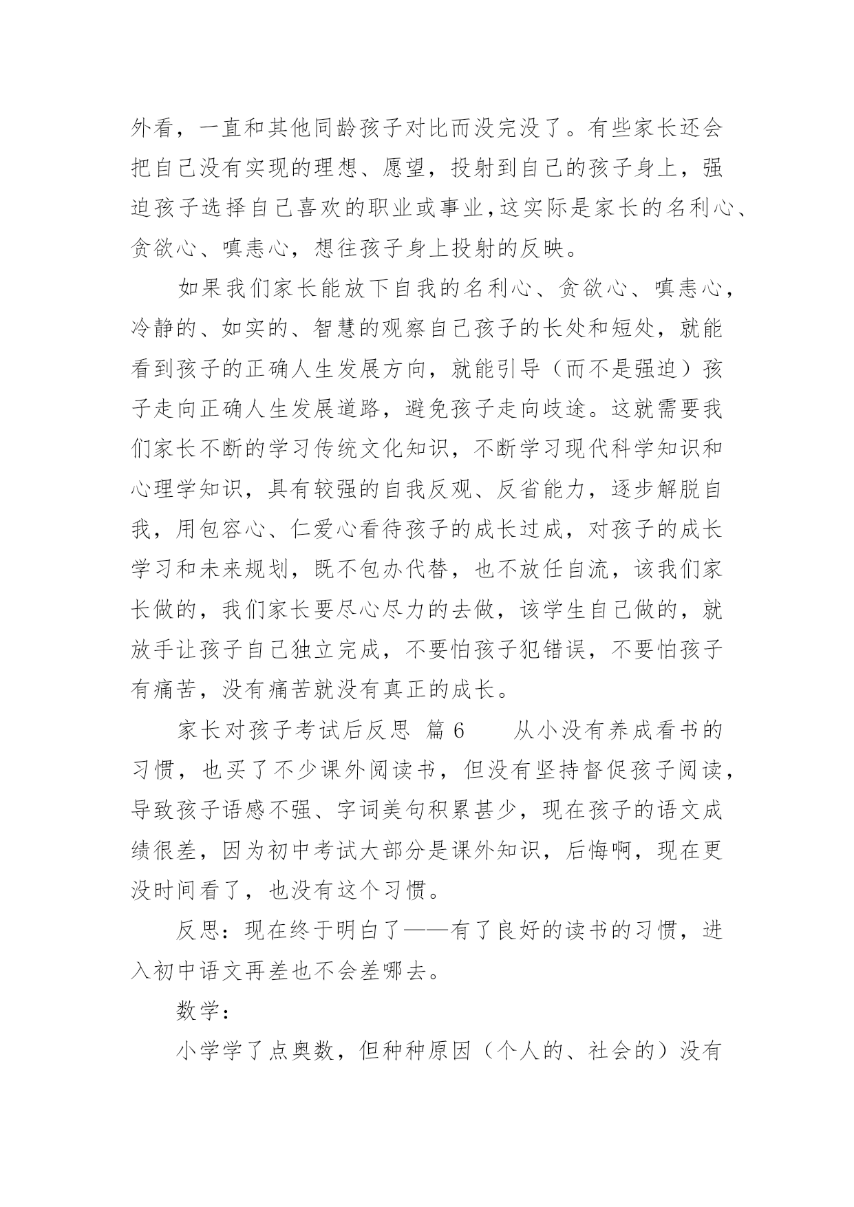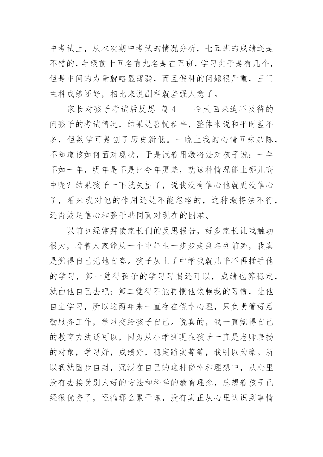 家长对孩子考试后反思家长对孩子考试后反思(精选10篇)随着社会一步步向前发展,课堂教学是我们的工作之一,反思指回头、反过来思考的意思。那么问题来了,反思应该怎么写?以下是小编帮大家整理的家长对孩子考试后反思,欢迎大家分享。家长对孩子考试后反思篇1孩子上初中,第一次开的家长会,通过齐老师的介绍,我觉得学校平时对孩子的教育都是潜移默化的培养,让我感到非常放心。父母是孩子的第一任老师,看着孩子一天天长大、一天天懂事,作为父母感到无限的欣慰。每次看到老师定时和我们家长沟通信息时,让我们深深的体会到你们为此付出的心血,感到这是一群真正热爱孩子的园丁,在这里首先我要感谢老师们!在孩子刚刚起步的时候,让他享受成长的快乐,学会与人真诚交往、关爱他人的习惯、正确的学习态度比什么都重要。我的孩子基础不太好,学习努力的不够,考试成绩也不理想,学习时间长,但没效率,可能学习办法不对?还是?有时候课文没背完,手里拿着书睡着了……看着很心痛的……第二天早上叫他起来背……但是学习成绩上不去……当父母的心里很着急……可能我们家长做的不到位吧!今天开完家长会后我回来反思了很多……我觉得平时可能对孩子的要求不太高——孩子做完作业就让他放松,没有预习和复习的过程等……孩子的学习成绩直接影响全家的“情绪”,但我很少责怪孩子,多在鼓励他,使孩子树立信心。只是埋怨自己平时关心的不够…在这里我把听到的优秀孩子家长的经验和自己今天感受到的总结起来送给孩子,希望孩子能从中悟出几分道理,有所进步。第一、你所处的是一个竞争的社会,既然没有办法改变它,那么就只有去适应它。第二、人生有起有伏,只有这样才会成长,上帝安排给人的每一次挫折,不管有多难,有多痛苦,都是能承受得了的。第三、泪水和汗水化学成分相似,但前者只能为你换来同情,后者可以为你赢得成功。第四、超越自己比超越别人更困难,实在是支撑不住的时候,说声“我好累”,但不能说“我不行”。第五、如果你以前的成绩不好,说明你做的不够好,要从现在做起。第六、失败并不可怕,可怕的是自己放弃。第七、考试是最公平的竞争,只有知识才能改变自己的命运。第八、人的一生有无数的风风雨雨在等着你,要学会承受风雨、学会坚强、学会做人、学会自己长大……第九、人生就如同一面镜子,你对它笑,它就对你笑;你对它哭,它就对你哭。在如梦短暂的生命中,只有自己展开了笑脸,才能说一切都是美好的。老师和家长都是真心期望你能少一点烦恼,多一点开心,快快乐乐的健康成长,愿你放下包袱,下次考出好成绩!家长对孩子考试后反思篇2每位家长都会对孩子考试有所考虑。因为他们是自己的孩子,盼望孩子成龙成凤是必然的。但是,孩子考试考砸了怎么办?因为各种原因,每个孩子都有考砸了的可能,我跟一些家长们探讨过这个总是,家长们的说法大概能概括出以下几种:1.理解平淡型既然孩子上学了,那他们的主要任务就是学习,就像家长的任务是挣钱养家一样。学校考试是天经地义的,他考砸了,就给他一个教训,下回努力呗。2.火冒三丈型看到孩子举着满是叉子的卷子,就骂孩子不争气,冲孩子发火,尤其是有领导或者同事的孩子考得不错的时候,或者有领导或同事在身边的时候,家长更觉得下不来台。3.讽刺挖苦型不正面评价孩子的试卷,反而将孩子以前的一些缺点、错误搬出来,讽刺挖苦孩子,什么:你不是挺捧吗:挺傲气的吗?不是什么都知道吗?一让你看书,你就说会了,一让你做题,你就说懂了。你是会了,你是懂了,考试考得不错呀,差50多分就100分啦?弄得孩子尴尬,甚至无地自容。4.软钉子型孩子拿回没有考好的试卷,知道爸爸妈妈会不满意,不高兴,于是失去往日的天真、活泼,变得小心翼翼,不敢多说话,主动地帮助妈妈洗菜做饭干一些家务活,或帮爸爸妈妈沏茶倒水献些殷勤,以表示惭愧,但有些家长还是说,行啦,算了吧,这些用不着你,下次考试多得几分,比帮我干活更让我高兴。当然,我这里介绍的只是些家长的不适宜的做法,为什么说这些做法不适宜呢?我们来简单地剖析几句。1.理解平淡型的不适宜孩子到学校上学,学习当然是他们的第一任务,为了检查学生知识的程度,学校用统一的标准对学生进行考试,当然是天经地义的,但是这个类型的家长想过这样一个问题吗,考试的目的,不仅是为了检查孩子已经学过的知识掌握的程度,更是为了通过考试,让孩子找出自己对知识掌握的薄弱环节,以利今后的进步。所以,家长不能认为考试是孩子的事情,由于孩子的年龄小,经验少,他们还不能比较全面、客观地分析自己考试失误的原因,这就需要家长和孩子坐在一起,在和孩子沟通中,找出考试失误的真正原因。(关于考试失误原因,在后述中还有谈到)2.火冒三丈型的不适宜这类家长的不适宜多在于两个方面:一个方面是没有认识到人是有差异的,就是说人和人是不一样的,人的身体条件、心理条件、环境条件、智力条件、家长条件等等,都会影响孩子的学习,甚至考试之