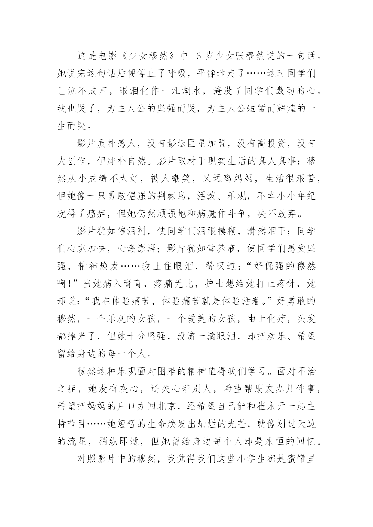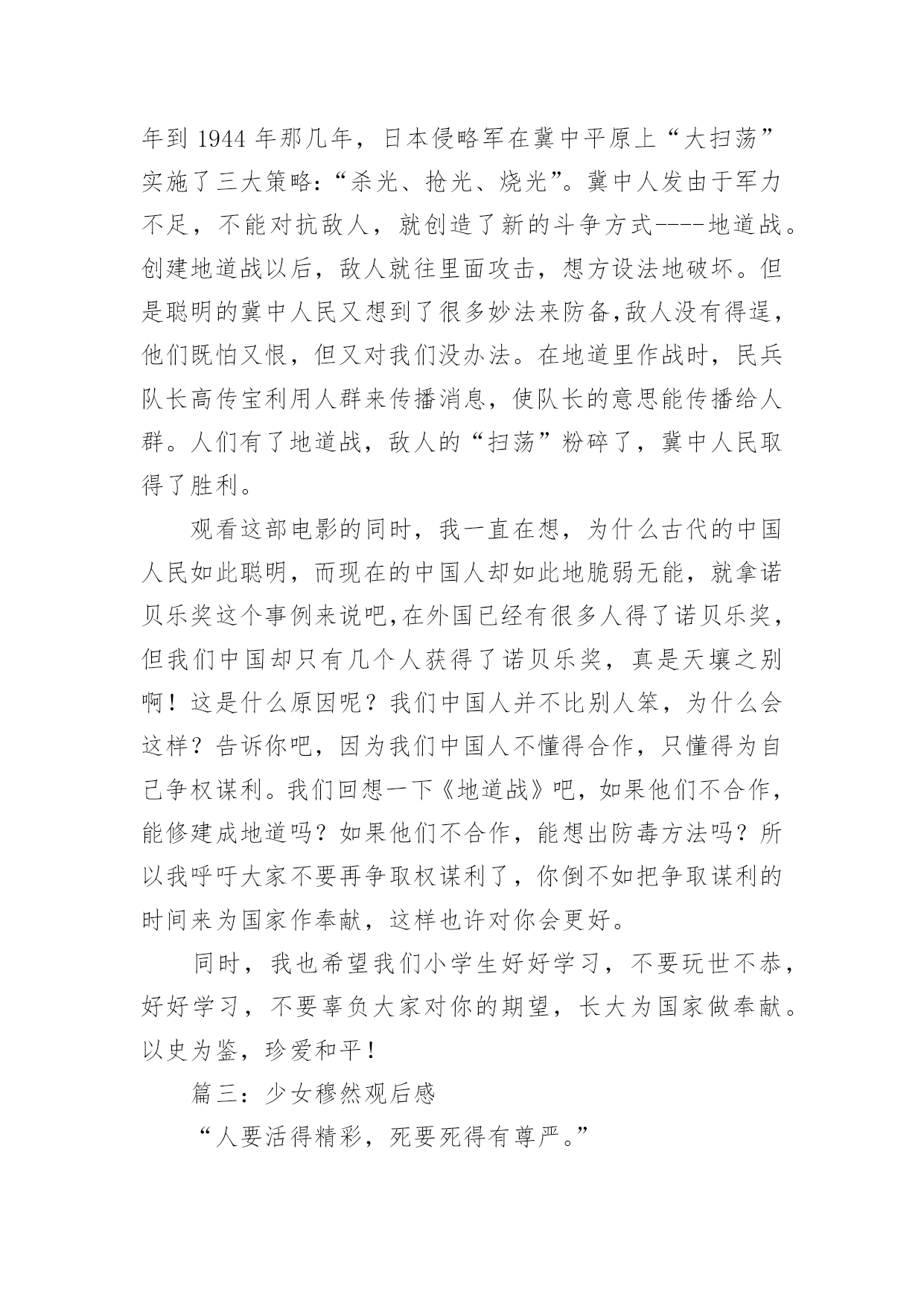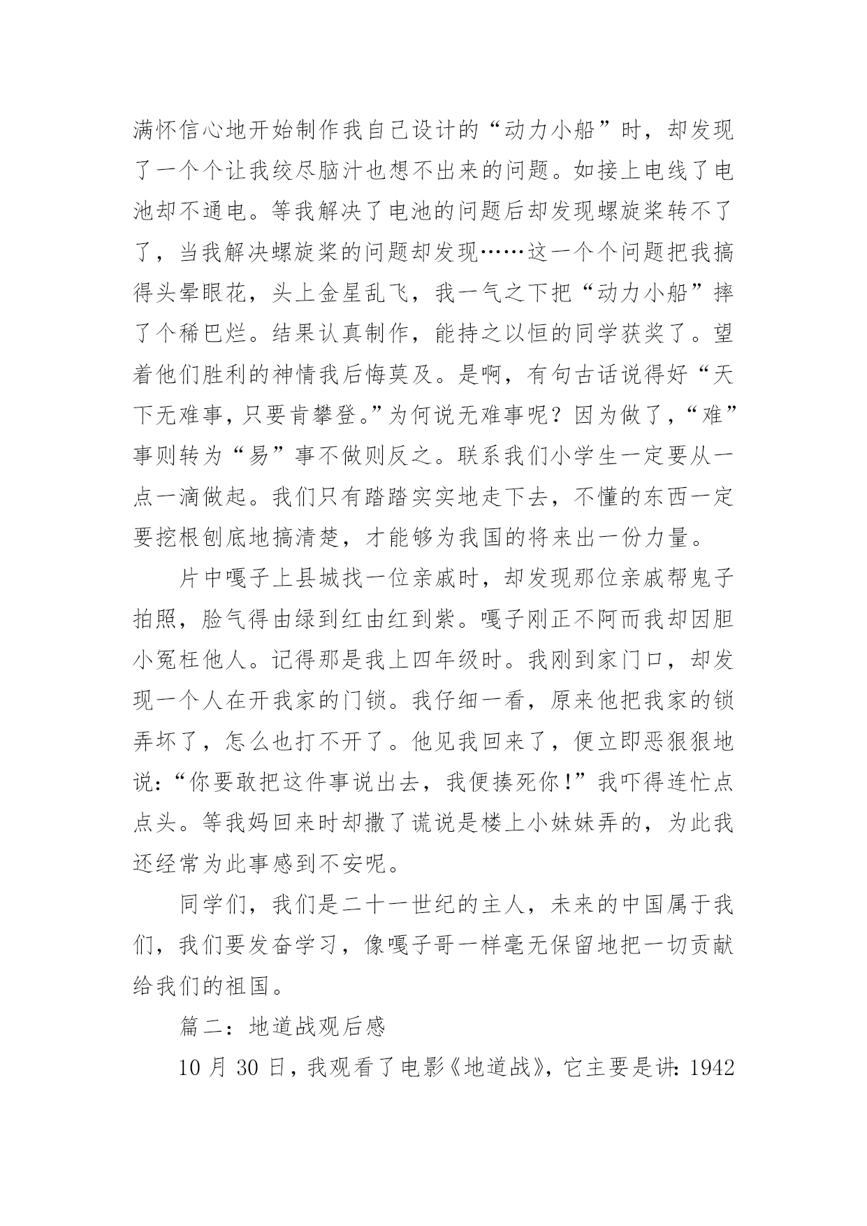 爱国影片观后感爱国影片观后感三篇导语:观后感,就是看了一部影片或连续剧后,把具体感受和得到的启示写成的文章。所谓“感”,可以是从作品中领悟出来的道理或精湛的思想,可以是受作品中的内容启发而引起的思考与联想,可以是因观看而激发的决心和理想。下面是小编整理收集的爱国影片观后感三篇,欢迎阅读!篇一:小兵张嘎观后感当我看完《小兵张嘎》这部爱国主义电影时,我被主人公嘎了哥那热爱祖国、不屈不挠的精神所感动。一提起小兵张嘎,想必大家都很熟悉吧!他不屈不挠的精神倍受人们敬仰。嘎子小时生活很苦,但是为了改变人们艰苦的生活,他少年时就参加了红军,他给红军战士带来了快乐。嘎子多次完成艰巨的任务,有一次,他屁股上中了敌人一枪,但他仍不顾伤痛毅然追击。他聪明的脑袋瓜用一只假枪就把敌人首领捉了回去,为红军立了大功。嘎子的爱国热情、幽默、滑稽、可爱、坚强不屈,不达到目的绝对不罢休的精神感动了我。看完电影,我思绪万千和嘎子对比,我显得是那么渺小。嘎子为完成艰巨的任务而奋不顾身,即使失败也会坚持不懈地去完成而我失败就放弃。记得那次学校开展一次“科技小发明”的活动,我当时就迫不及待地向老师报了名。正当我满怀信心地开始制作我自己设计的“动力小船”时,却发现了一个个让我绞尽脑汁也想不出来的问题。如接上电线了电池却不通电。等我解决了电池的问题后却发现螺旋桨转不了了,当我解决螺旋桨的问题却发现……这一个个问题把我搞得头晕眼花,头上金星乱飞,我一气之下把“动力小船”摔了个稀巴烂。结果认真制作,能持之以恒的同学获奖了。望着他们胜利的神情我后悔莫及。是啊,有句古话说得好“天下无难事,只要肯攀登。”为何说无难事呢?因为做了,“难”事则转为“易”事不做则反之。联系我们小学生一定要从一点一滴做起。我们只有踏踏实实地走下去,不懂的东西一定要挖根刨底地搞清楚,才能够为我国的将来出一份力量。片中嘎子上县城找一位亲戚时,却发现那位亲戚帮鬼子拍照,脸气得由绿到红由红到紫。嘎子刚正不阿而我却因胆小冤枉他人。记得那是我上四年级时。我刚到家门口,却发现一个人在开我家的门锁。我仔细一看,原来他把我家的锁弄坏了,怎么也打不开了。他见我回来了,便立即恶狠狠地说:“你要敢把这件事说出去,我便揍死你!”我吓得连忙点点头。等我妈回来时却撒了谎说是楼上小妹妹弄的,为此我还经常为此事感到不安呢。同学们,我们是二十一世纪的主人,未来的中国属于我们,我们要发奋学习,像嘎子哥一样毫无保留地把一切贡献给我们的祖国。篇二:地道战观后感10月30日,我观看了电影《地道战》,它主要是讲:1942年到1944年那几年,日本侵略军在冀中平原上“大扫荡”实施了三大策略:“杀光、抢光、烧光”。冀中人发由于军力不足,不能对抗敌人,就创造了新的斗争方式----地道战。创建地道战以后,敌人就往里面攻击,想方设法地破坏。但是聪明的冀中人民又想到了很多妙法来防备,敌人没有得逞,他们既怕又恨,但又对我们没办法。在地道里作战时,民兵队长高传宝利用人群来传播消息,使队长的意思能传播给人群。人们有了地道战,敌人的“扫荡”粉碎了,冀中人民取得了胜利。观看这部电影的同时,我一直在想,为什么古代的中国人民如此聪明,而现在的中国人却如此地脆弱无能,就拿诺贝乐奖这个事例来说吧,在外国已经有很多人得了诺贝乐奖,但我们中国却只有几个人获得了诺贝乐奖,真是天壤之别啊!这是什么原因呢?我们中国人并不比别人笨,为什么会这样?告诉你吧,因为我们中国人不懂得合作,只懂得为自己争权谋利。我们回想一下《地道战》吧,如果他们不合作,能修建成地道吗?如果他们不合作,能想出防毒方法吗?所以我呼吁大家不要再争取权谋利了,你倒不如把争取谋利的时间来为国家作奉献,这样也许对你会更好。同时,我也希望我们小学生好好学习,不要玩世不恭,好好学习,不要辜负大家对你的期望,长大为国家做奉献。以史为鉴,珍爱和平!篇三:少女穆然观后感“人要活得精彩,死要死得有尊严。”这是电影《少女穆然》中16岁少女张穆然说的一句话。她说完这句话后便停止了呼吸,平静地走了……这时同学们已泣不成声,眼泪化作一汪湖水,淹没了同学们激动的心。我也哭了,为主人公的坚强而哭,为主人公短暂而辉煌的一生而哭。影片质朴感人,没有影坛巨星加盟,没有高投资,没有大创作,但纯朴自然。影片取材于现实生活的真人真事:穆然从小成绩不太好,被人嘲笑,又远离妈妈,生活很艰苦,但她像一只勇敢倔强的荆棘鸟,活泼、乐观,不幸小小年纪就得了癌症,但她仍然顽强地和病魔作斗争,决不放弃。影片犹如催泪剂,使同学们泪眼模糊,潸然泪下;同学们心跳加快,心潮澎湃;影片犹如营养液,使同学们感受坚强,精神焕发……我止住眼泪,赞叹道:“好倔强的穆然啊!”当她病入膏肓,疼痛无比,护士想给她打止疼针,她却说:“我在体验痛苦,体验痛苦就是体验活着。”好勇敢的穆然,一个乐观的女孩,一