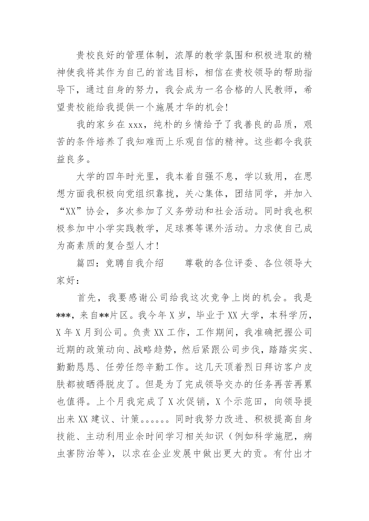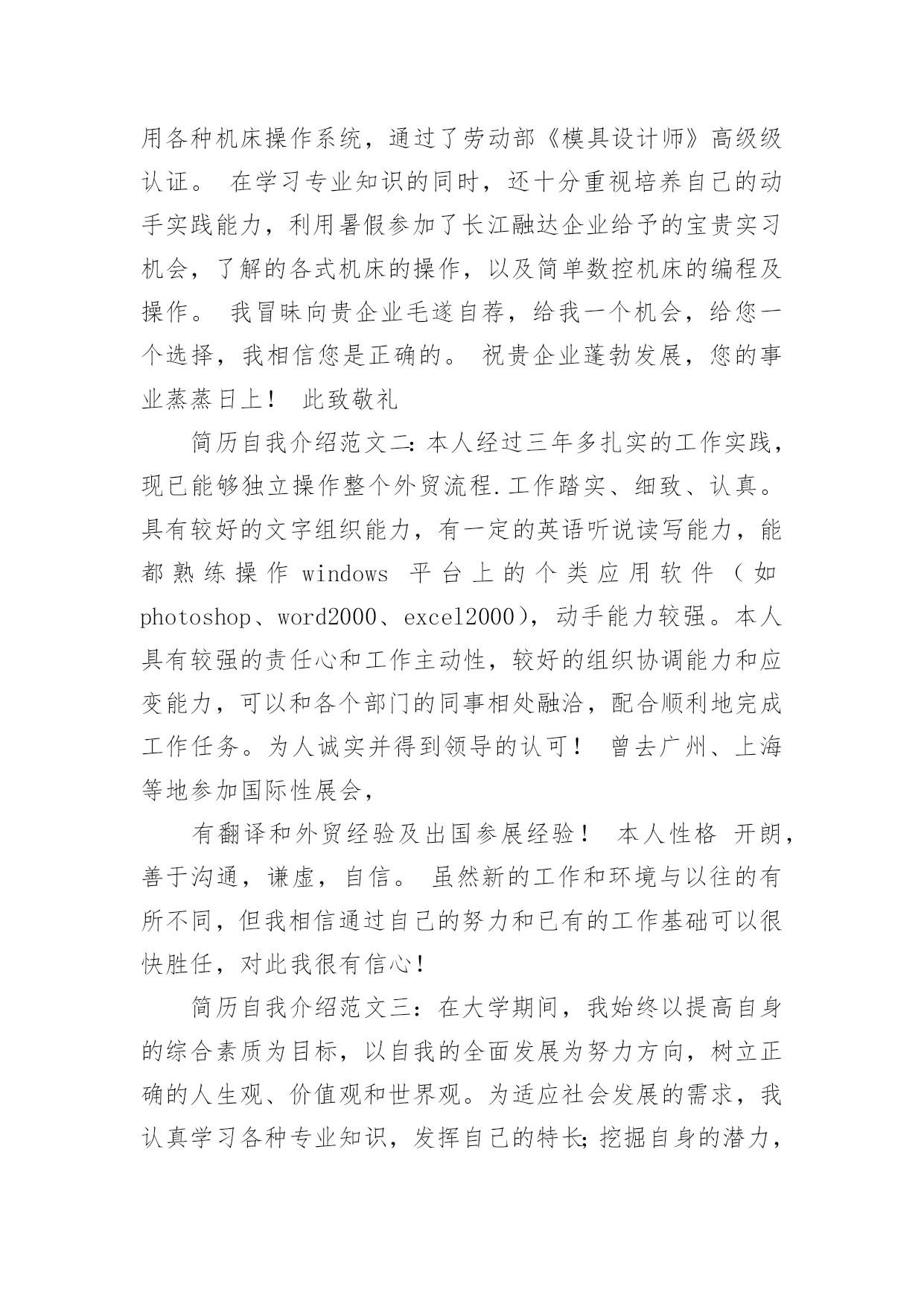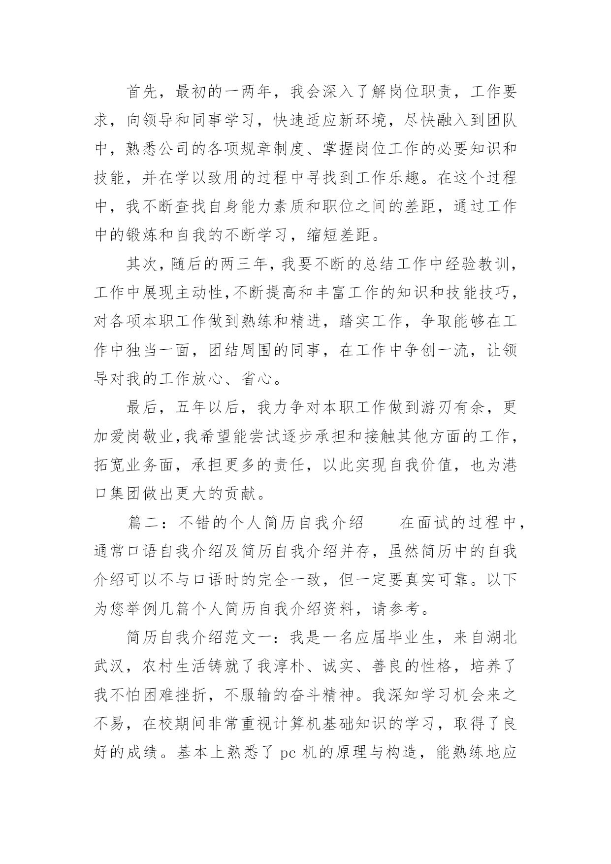 求职岗位自我介绍求职岗位自我介绍篇一:自我介绍、职业规划自我介绍:尊敬的各位考官,大家好。今天有这个机会与考官面对面地交流,我感到很荣幸与开心。我叫XX,我本科和研究生都是就读于XXX大学,本科专业是XXX,研究生的专业是艺术设计,目前通过硕士答辩。在学习上曾多次获得奖学金,并考取了大学英语四级证书,计算机二级证书,并且在2011年光荣地加入了中国共产党。本科室,我一直是我们班的班长,组织并参加了一些社会实践活动,很好地锻炼了自己的组织协调能力。在2012年我以文化课第一,专业课第一的成绩考取了公费硕士研究生。研究生期间,我刻苦钻研专业知识,获得优秀研究生奖学金。在性格上,我认真踏实,学习能力和适应能力很强,对待学习工和作一丝不苟而且具有大局意识和团队精神,善于沟通,爱交朋友。在求职时,我也客观的分析过我的条件和职位要求,认为这些特点也使我非常适合宣传干事这个岗位。港务局是一个拥有100多年历史的港口,它浓厚的底蕴吸引了我。我非常期盼有机会成为港务局的一份子,再踏踏实实的工作中,实现个人的价值,为港口集团的发展贡献自己的力量!职业规划:如果有幸进入港口集团工作,我将会这样设计我未来职业生涯。首先,最初的一两年,我会深入了解岗位职责,工作要求,向领导和同事学习,快速适应新环境,尽快融入到团队中,熟悉公司的各项规章制度、掌握岗位工作的必要知识和技能,并在学以致用的过程中寻找到工作乐趣。在这个过程中,我不断查找自身能力素质和职位之间的差距,通过工作中的锻炼和自我的不断学习,缩短差距。其次,随后的两三年,我要不断的总结工作中经验教训,工作中展现主动性,不断提高和丰富工作的知识和技能技巧,对各项本职工作做到熟练和精进,踏实工作,争取能够在工作中独当一面,团结周围的同事,在工作中争创一流,让领导对我的工作放心、省心。最后,五年以后,我力争对本职工作做到游刃有余,更加爱岗敬业,我希望能尝试逐步承担和接触其他方面的工作,拓宽业务面,承担更多的责任,以此实现自我价值,也为港口集团做出更大的贡献。篇二:不错的个人简历自我介绍在面试的过程中,通常口语自我介绍及简历自我介绍并存,虽然简历中的自我介绍可以不与口语时的完全一致,但一定要真实可靠。以下为您举例几篇个人简历自我介绍资料,请参考。简历自我介绍范文一:我是一名应届毕业生,来自湖北武汉,农村生活铸就了我淳朴、诚实、善良的性格,培养了我不怕困难挫折,不服输的奋斗精神。我深知学习机会来之不易,在校期间非常重视计算机基础知识的学习,取得了良好的成绩。基本上熟悉了pc机的原理与构造,能熟练地应用各种机床操作系统,通过了劳动部《模具设计师》高级级认证。在学习专业知识的同时,还十分重视培养自己的动手实践能力,利用暑假参加了长江融达企业给予的宝贵实习机会,了解的各式机床的操作,以及简单数控机床的编程及操作。我冒昧向贵企业毛遂自荐,给我一个机会,给您一个选择,我相信您是正确的。祝贵企业蓬勃发展,您的事业蒸蒸日上!此致敬礼简历自我介绍范文二:本人经过三年多扎实的工作实践,现已能够独立操作整个外贸流程.工作踏实、细致、认真。具有较好的文字组织能力,有一定的英语听说读写能力,能都熟练操作windows平台上的个类应用软件(如photoshop、word2000、excel2000),动手能力较强。本人具有较强的责任心和工作主动性,较好的组织协调能力和应变能力,可以和各个部门的同事相处融洽,配合顺利地完成工作任务。为人诚实并得到领导的认可!曾去广州、上海等地参加国际性展会,有翻译和外贸经验及出国参展经验!本人性格开朗,善于沟通,谦虚,自信。虽然新的工作和环境与以往的有所不同,但我相信通过自己的努力和已有的工作基础可以很快胜任,对此我很有信心!简历自我介绍范文三:在大学期间,我始终以提高自身的综合素质为目标,以自我的全面发展为努力方向,树立正确的人生观、价值观和世界观。为适应社会发展的需求,我认真学习各种专业知识,发挥自己的特长;挖掘自身的潜力,结合每年的暑期社会实践机会,从而逐步提高了自己的学习能力和分析处理问题的能力以及一定的协调组织和管理能力。“学而知不足”是我大学期间学习和工作的动力,除了必修课之外,我还坚持自学了Office、Flash、FrontPage、Photoshop等多种专业软件。学习之余,我还不忘坚持参加各种体育活动与社交活动。在思想行为方面,我作风优良、待人诚恳,能较好处理人际关际,处事冷静稳健,能合理地统筹安排生活中的事务。作为一名2008年通信工程专业的大学应届毕业生,我所拥有的是年轻和知识。年轻也许意味着欠缺经验,但是年轻也意味着热情和活力,我自信能凭自己的能力和学识在毕业以后的工作和生活中克服各种困难,不断实现自我的人生价值和追求的目标。简历自我介绍范文四:本人吃苦耐劳、具有良好的团队合