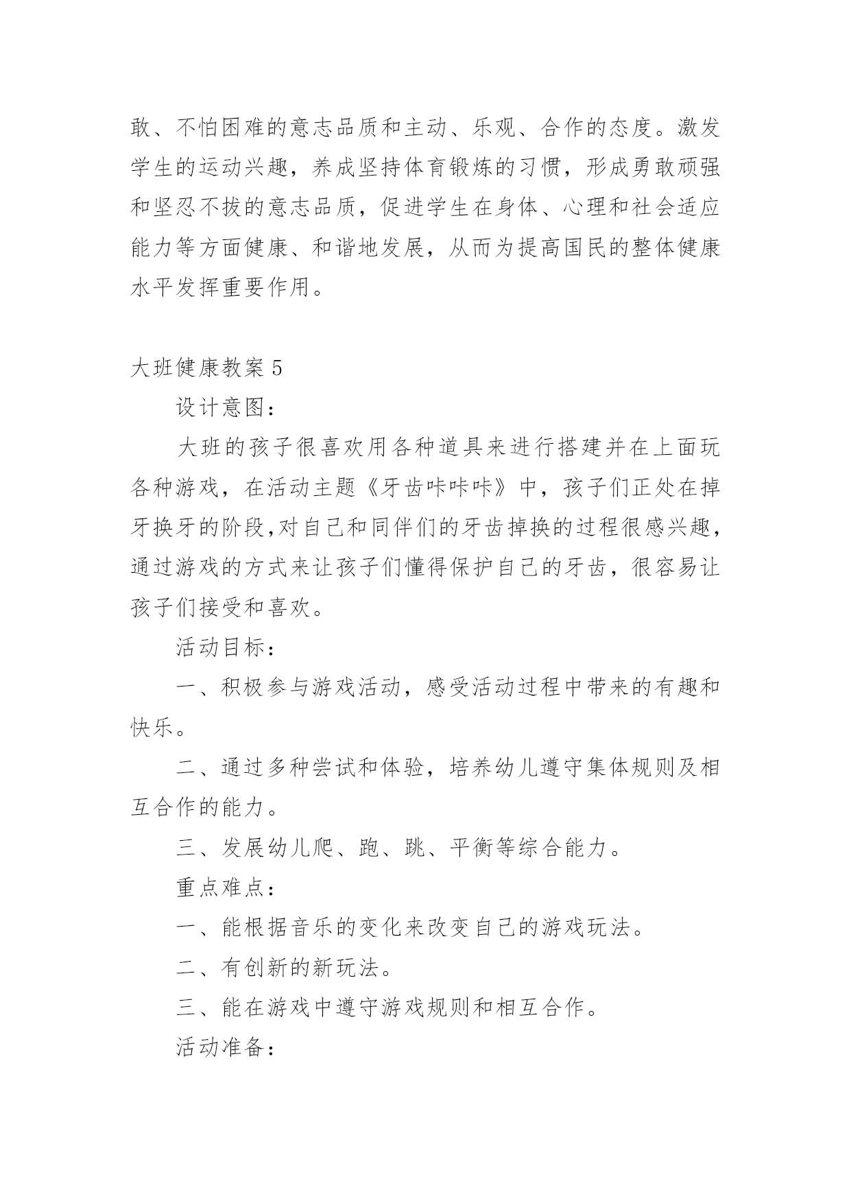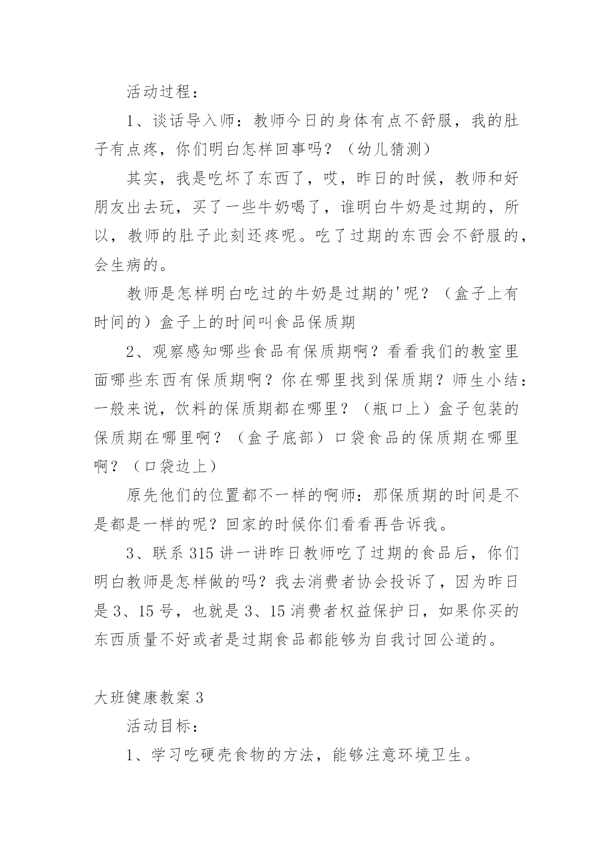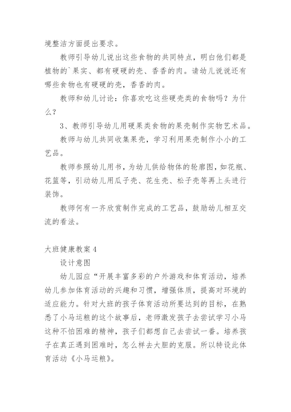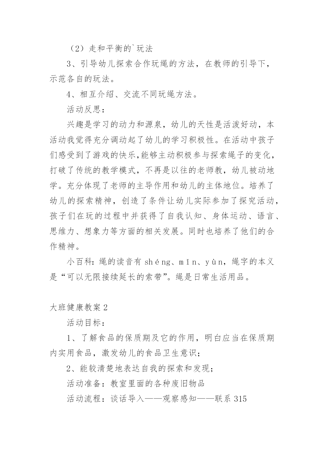 大班健康教案大班健康教案【热】作为一名为他人授业解惑的教育工作者,就有可能用到教案,编写教案有利于我们科学、合理地支配课堂时间。教案应该怎么写呢?以下是小编为大家收集的大班健康教案,欢迎大家分享。大班健康教案1活动目标:1、探索绳子的各种玩法,体验在体育活动中创造性玩绳的乐趣。2、提高动作的灵敏性和协调性,具有良好的合作意识。3、体验人多力量大,同伴间应该相互合作的情感。4、了解主要症状,懂得预防和治疗的自我保护意识。活动准备:绳子人手一根活动过程:1、幼儿听着节奏明快的音乐做律动2、引导幼儿探索绳子的多种玩法,提醒幼儿将自己玩绳的方法及时告诉同伴。教师充分肯定幼儿新颖的玩法,并进行集体演示。(1)套和跳的玩法(2)走和平衡的`玩法3、引导幼儿探索合作玩绳的方法,在教师的引导下,示范各自的玩法。4、相互介绍、交流不同玩绳方法。活动反思:兴趣是学习的动力和源泉,幼儿的天性是活泼好动,本活动我觉得充分调动起了幼儿的学习积极性。在活动中孩子们感受到了游戏的快乐,能够主动积极参与探索绳子的变化,打破了传统的教学模式,不再是以往的老师教,幼儿被动地学。充分体现了老师的主导作用和幼儿的主体地位。培养了幼儿的探索精神,创造了条件让幼儿实际参加了探究活动,孩子们在玩的过程中并获得了自我认知、身体运动、语言、思维力、想象力等方面的相关发展。同时也培养了他们的合作精神。小百科:绳的读音有shéng、mǐn、yùn,绳字的本义是“可以无限接续延长的索带”。绳是日常生活用品。大班健康教案2活动目标:1、了解食品的保质期及它的作用,明白应当在保质期内实用食品,激发幼儿的食品卫生意识;2、能较清楚地表达自我的探索和发现;活动准备:教室里面的各种废旧物品活动流程:谈话导入——观察感知——联系315活动过程:1、谈话导入师:教师今日的身体有点不舒服,我的肚子有点疼,你们明白怎样回事吗?(幼儿猜测)其实,我是吃坏了东西了,哎,昨日的时候,教师和好朋友出去玩,买了一些牛奶喝了,谁明白牛奶是过期的,所以,教师的肚子此刻还疼呢。吃了过期的东西会不舒服的,会生病的。教师是怎样明白吃过的牛奶是过期的'呢?(盒子上有时间的)盒子上的时间叫食品保质期2、观察感知哪些食品有保质期啊?看看我们的教室里面哪些东西有保质期啊?你在哪里找到保质期?师生小结:一般来说,饮料的保质期都在哪里?(瓶口上)盒子包装的保质期在哪里啊?(盒子底部)口袋食品的保质期在哪里啊?(口袋边上)原先他们的位置都不一样的啊师:那保质期的时间是不是都是一样的呢?回家的时候你们看看再告诉我。3、联系315讲一讲昨日教师吃了过期的食品后,你们明白教师是怎样做的吗?我去消费者协会投诉了,因为昨日是3、15号,也就是3、15消费者权益保护日,如果你买的东西质量不好或者是过期食品都能够为自我讨回公道的。大班健康教案3活动目标:1、学习吃硬壳食物的方法,能够注意环境卫生。2、认识几种植物的果实或者果仁,明白果仁对大脑的发育异常有益。3、进取参见用果壳制作工艺品的活动。活动准备:1、准备硬壳类的食物,如,核桃、板栗、松子、瓜子、花生、杏仁等。2、供给一些食物的轮廓图片(详见幼儿用书)3、幼儿用书:《硬硬的壳,香香的肉》重点难点:进取参见用果壳制作工艺品的活动。活动过程:1、教师和幼儿玩"猜谜"游戏,了解硬壳类食物的名称。教师和幼儿玩"猜谜"的游戏,激发幼儿参与活动的兴趣。谜面:麻屋子,红帐子,里面睡个白胖子。谜底:花生。谜面:有个黑宝宝,从来不开口,要是一开口,没准掉舌头。谜底:西瓜子。谜面:壳儿硬,壳儿脆,四个姐妹隔墙睡,从小到大背靠背,盖的一床疙瘩被。谜底:核桃。教师启发幼儿猜出谜语的谜底,并出示相应的实物。2、幼儿学习吃硬壳类食物,教师提醒幼儿注意环境卫生。教师和幼儿共同品尝食物。教师启发幼儿说说这食物的吃法,如用手剥开、用牙磕开等办法,并请进食方法正确的幼儿给大家示范,同时在环境整洁方面提出要求。教师引导幼儿说出这些食物的共同特点,明白他们都是植物的`果实、都有硬硬的壳、香香的肉。请幼儿说说还有哪些食物也有硬硬的壳,香香的肉。教师和幼儿讨论:你喜欢吃这些硬壳类的食物吗?为什么?3、教师引导幼儿用硬果类食物的果壳制作实物艺术品。教师与幼儿共同收集果壳,学习利用果壳制作小小的工艺品。教师参照幼儿用书,为幼儿供给物体的轮廓图,如花瓶、花篮等,引动幼儿用瓜子壳、花生壳、松子壳等再上头进行装饰。教师何有一齐欣赏制作完成的工艺品,鼓励幼儿相互交流的看法。大班健康教案4设计意图幼儿园应“开展丰富多彩的户外游戏和体育活动,培养幼儿参加体育活动的兴趣和习惯,增强体质,提高对环境的适应能力。针对大班的孩子体育活动所要达到的目标,在熟悉了小马运粮的这个故事后,老师激发孩子去尝试学习小马这种不怕困难的精神,孩子们都想自己去尝试一番。培