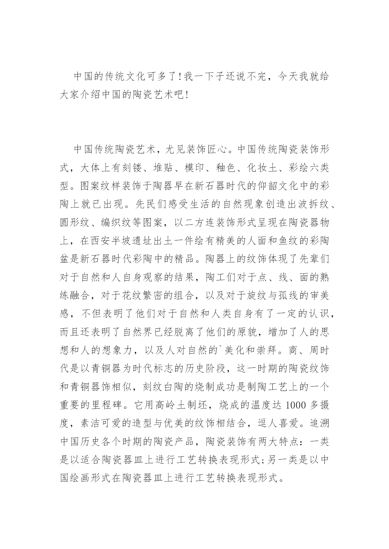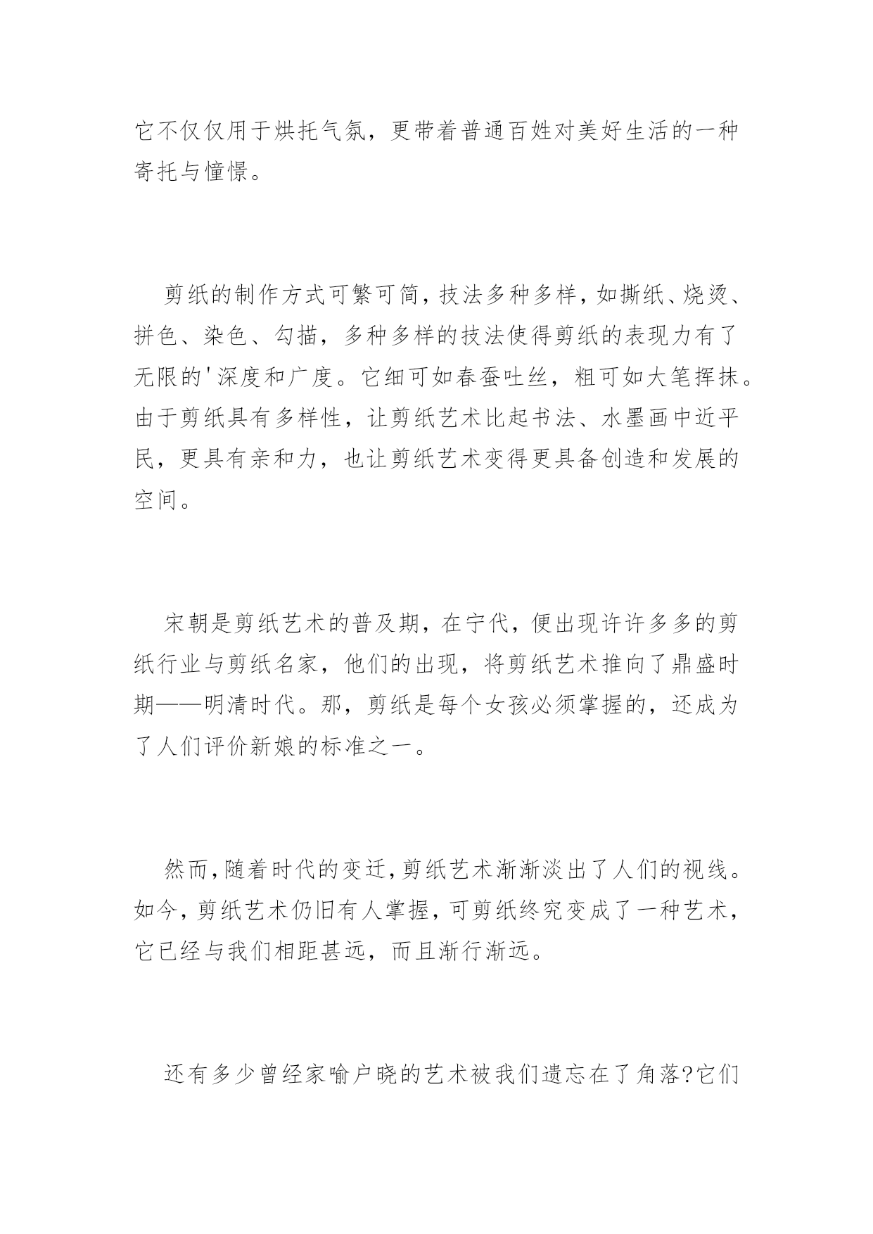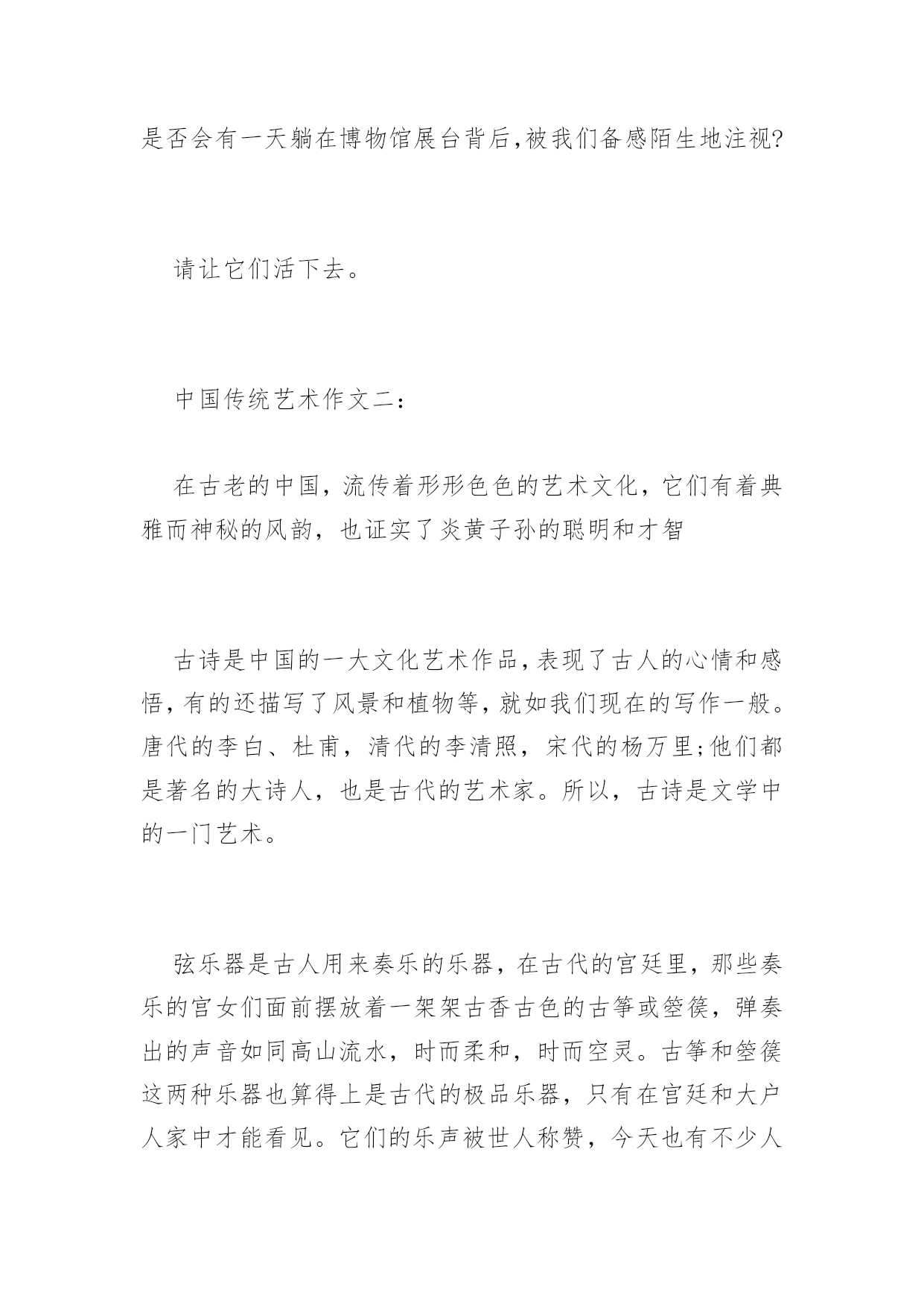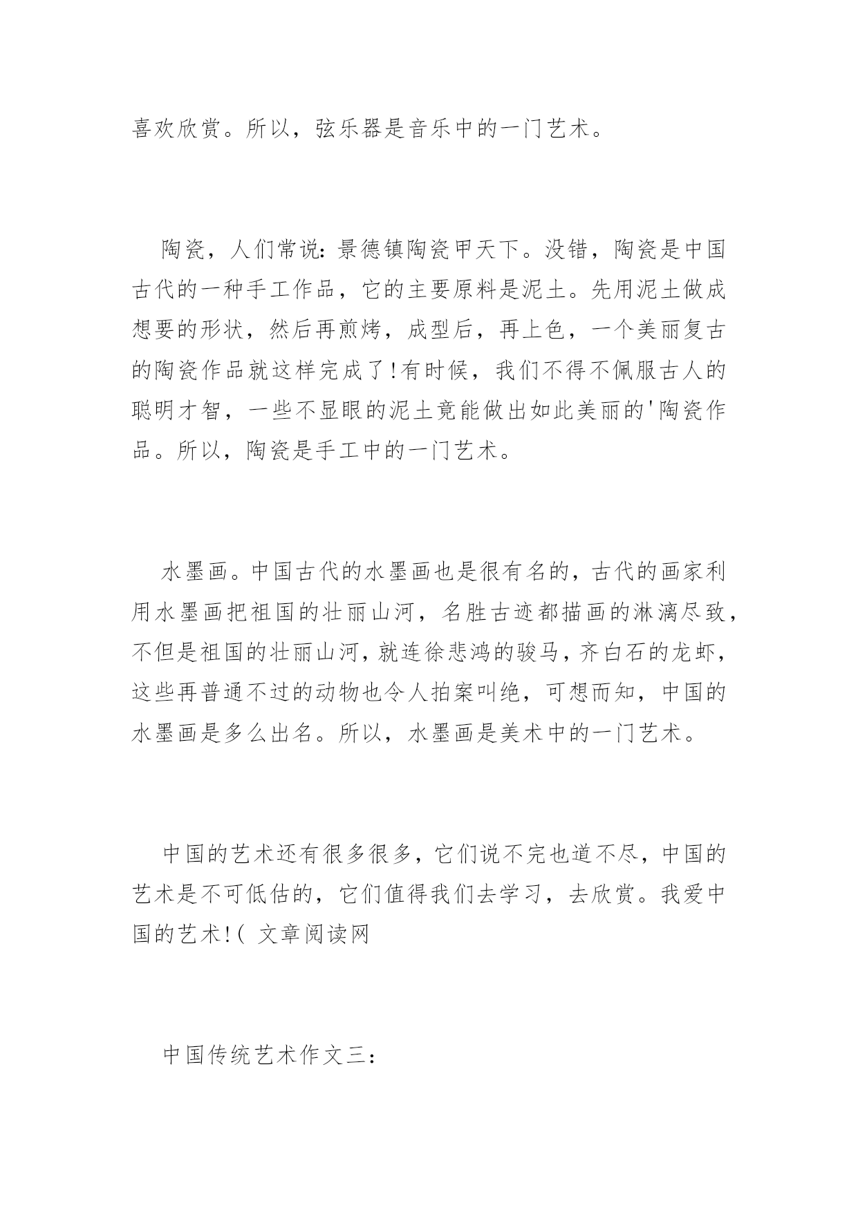 中国传统艺术作文「」中国传统艺术作文「精选」中华美德,人人皆知,“孔融让梨”等典故无不体现了中华民族五千年以来至高无上的美德,更说明了中华民族是一个文化之都。yuwenmi小编整理了相关的范文,欢迎欣赏与借鉴。中国传统艺术作文一:油画、水彩、雕塑、文学……这些艺术形式世界上名家众多,是属于全世界的。然而,剪纸这门独特的艺术形式,却是中国特有的。剪纸艺术的历史渊远流长,可以追溯到一千五百年前的北朝,许多古诗都有提及。这门艺术并不只属于名人名士,而是一种人人都须掌握的手工艺术,而且深得百姓喜爱。剪纸是一种镂空艺术,纹样大致分为人物、鸟兽、文字、器用、鳞介、花木、果菜、昆虫、山水等,其寓意也不尽相同,有祝福、怯邪、劝勉、除恶、警戒、趣味等各类表现题材。人们在过节或庆祝活动时,剪纸充当着必不可少的角色。它不仅仅用于烘托气氛,更带着普通百姓对美好生活的一种寄托与憧憬。剪纸的制作方式可繁可简,技法多种多样,如撕纸、烧烫、拼色、染色、勾描,多种多样的技法使得剪纸的表现力有了无限的'深度和广度。它细可如春蚕吐丝,粗可如大笔挥抹。由于剪纸具有多样性,让剪纸艺术比起书法、水墨画中近平民,更具有亲和力,也让剪纸艺术变得更具备创造和发展的空间。宋朝是剪纸艺术的普及期,在宁代,便出现许许多多的剪纸行业与剪纸名家,他们的出现,将剪纸艺术推向了鼎盛时期——明清时代。那,剪纸是每个女孩必须掌握的,还成为了人们评价新娘的标准之一。然而,随着时代的变迁,剪纸艺术渐渐淡出了人们的视线。如今,剪纸艺术仍旧有人掌握,可剪纸终究变成了一种艺术,它已经与我们相距甚远,而且渐行渐远。还有多少曾经家喻户晓的艺术被我们遗忘在了角落?它们是否会有一天躺在博物馆展台背后,被我们备感陌生地注视?请让它们活下去。中国传统艺术作文二:在古老的中国,流传着形形色色的艺术文化,它们有着典雅而神秘的风韵,也证实了炎黄子孙的聪明和才智古诗是中国的一大文化艺术作品,表现了古人的心情和感悟,有的还描写了风景和植物等,就如我们现在的写作一般。唐代的李白、杜甫,清代的李清照,宋代的杨万里;他们都是著名的大诗人,也是古代的艺术家。所以,古诗是文学中的一门艺术。弦乐器是古人用来奏乐的乐器,在古代的宫廷里,那些奏乐的宫女们面前摆放着一架架古香古色的古筝或箜篌,弹奏出的声音如同高山流水,时而柔和,时而空灵。古筝和箜篌这两种乐器也算得上是古代的极品乐器,只有在宫廷和大户人家中才能看见。它们的乐声被世人称赞,今天也有不少人喜欢欣赏。所以,弦乐器是音乐中的一门艺术。陶瓷,人们常说:景德镇陶瓷甲天下。没错,陶瓷是中国古代的一种手工作品,它的主要原料是泥土。先用泥土做成想要的形状,然后再煎烤,成型后,再上色,一个美丽复古的陶瓷作品就这样完成了!有时候,我们不得不佩服古人的聪明才智,一些不显眼的泥土竟能做出如此美丽的'陶瓷作品。所以,陶瓷是手工中的一门艺术。水墨画。中国古代的水墨画也是很有名的,古代的画家利用水墨画把祖国的壮丽山河,名胜古迹都描画的淋漓尽致,不但是祖国的壮丽山河,就连徐悲鸿的骏马,齐白石的龙虾,这些再普通不过的动物也令人拍案叫绝,可想而知,中国的水墨画是多么出名。所以,水墨画是美术中的一门艺术。中国的艺术还有很多很多,它们说不完也道不尽,中国的艺术是不可低估的,它们值得我们去学习,去欣赏。我爱中国的艺术!(文章阅读网中国传统艺术作文三:中国的传统文化可多了!我一下子还说不完,今天我就给大家介绍中国的陶瓷艺术吧!中国传统陶瓷艺术,尤见装饰匠心。中国传统陶瓷装饰形式,大体上有刻镂、堆贴、模印、釉色、化妆土、彩绘六类型。图案纹样装饰于陶器早在新石器时代的仰韶文化中的彩陶上就已出现。先民们感受生活的自然现象创造出波拆纹、圆形纹、编织纹等图案,以二方连装饰形式呈现在陶瓷器物上,在西安半坡遗址出土一件绘有精美的人面和鱼纹的彩陶盆是新石器时代彩陶中的精品。陶器上的纹饰体现了先辈们对于自然和人自身观察的结果,陶工们对于点、线、面的熟练融合,对于花纹繁密的组合,以及对于旋纹与孤线的审美感,不但表明了他们对于自然和人类自身有了一定的认识,而且还表明了自然界已经脱离了他们的原貌,增加了人的思想和人的想象力,以及人对自然的`美化和崇拜。商、周时代是以青铜器为时代标志的历史阶段,这一时期的陶瓷纹饰和青铜器饰相似,刻纹白陶的烧制成功是制陶工艺上的一个重要的里程碑。它用高岭土制坯,烧成的温度达1000多摄度,素洁可爱的造型与优美的纹饰相结合,逗人喜爱。追溯中国历史各个时期的陶瓷产品,陶瓷装饰有两大特点:一类是以适合陶瓷器皿上进行工艺转换表现形式;另一类是以中国绘画形式在陶瓷器皿上进行工艺转换表现形式。中国传统的艺术——陶瓷的故事是多么有趣啊!陶瓷还是我国最为大的创造呢!