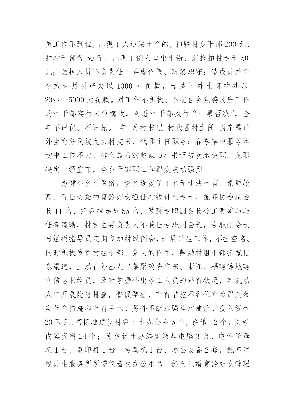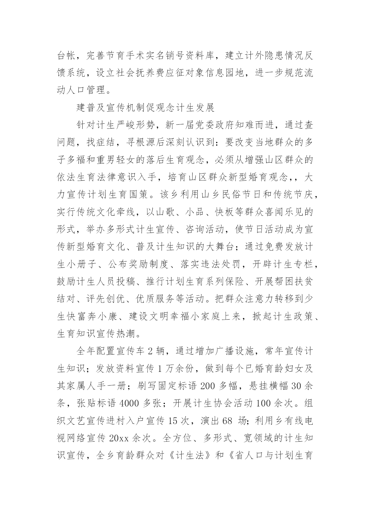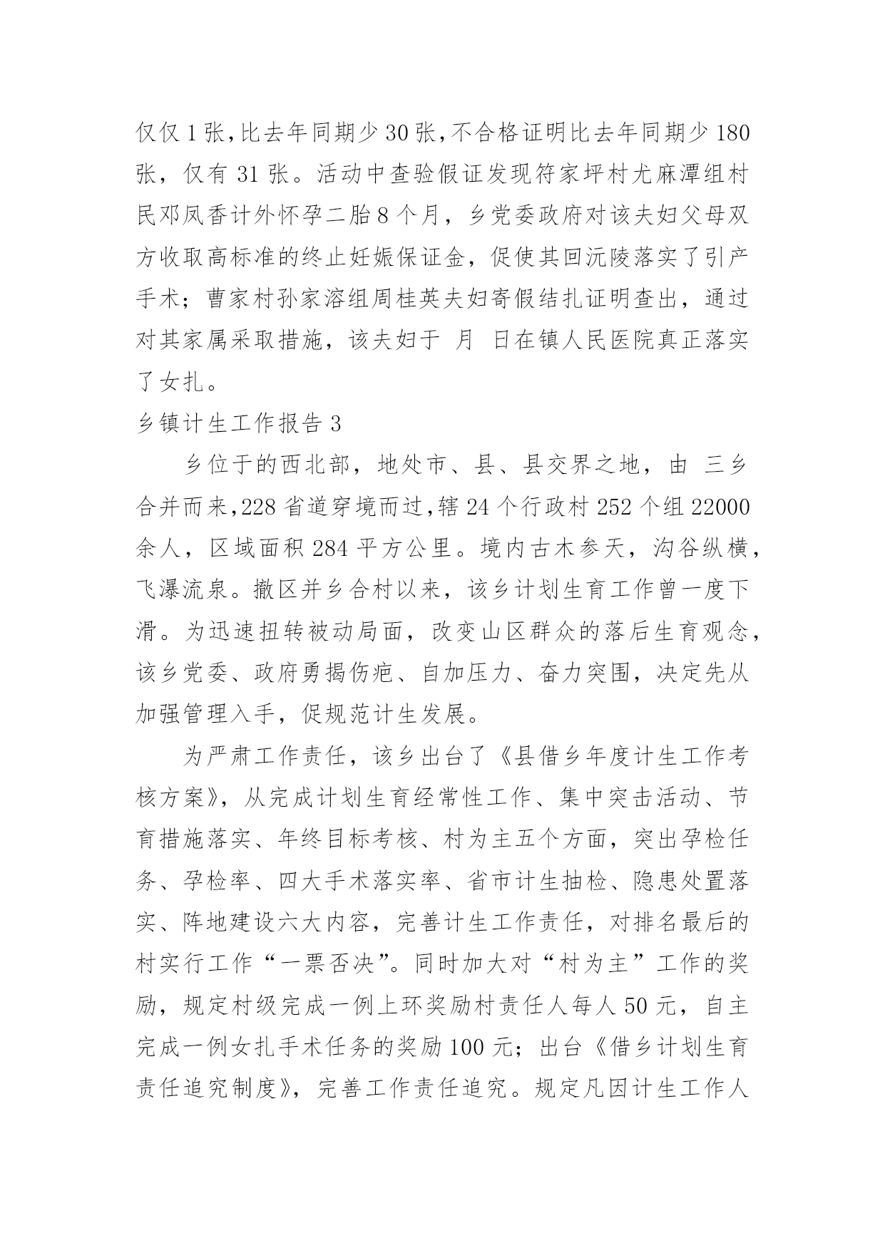 乡镇计生工作报告乡镇计生工作报告在现在社会,报告不再是罕见的东西,我们在写报告的时候要注意语言要准确、简洁。你知道怎样写报告才能写的好吗?下面是小编为大家收集的乡镇计生工作报告,仅供参考,欢迎大家阅读。乡镇计生工作报告1XX年是“xx”规划的起步年,为了认真贯彻落实中央和省委《关于全面加强人口和计划生育工作统筹解决人口问题的决定》精神,确保全镇人口和计划生育目标的实现,范文之工作报告:乡镇计生工作报告。半年来,我镇紧紧围绕县委、县政府制定的人口与计划生育目标责任的要求,针对全镇实际,强化责任,细化措施,狠抓落实。截止3月底,全镇共出生婴儿477人,其中一孩403人,二孩64人,多孩10人。计外出生二孩7人,符合政策生育率为97.9%,人口出生性别比为100:102,控制在正常值范围,无“两非”案件发生。主要工作如下:一、加强制度建设。建立党委会议计生制度,镇党委十分重视计划生育工作,安排一名副书记和一名副镇长专抓计划生育工作,并将人口计生工作列入重要议事日程,逢会必讲计划生育工作,镇党委每月听取一次计生办工作汇报,镇计生办每星期一开工作例会,及时研究部署计划生育工作,做到情况明,措施力;坚持党委委员带头,党总支书记负责的计生工作机制,镇党委政府还与各单位各村签订人口和计划生育目标管理责任书,同时建立专干包村制度,机关干部和计生服务中心人员包村,村干部包组,包户,工作和工资挂钩,严格执行一票否决。二、多措并举抓宣传。利用网络,设立咨询台,发放宣传材料等多种途径,进行计划生育政策法规和生殖健康知识的宣传教育,强化宣传氛围,利用农家书屋结合创建生育文明示范村的活动,发放入户宣传资料5000余份,刷写小标语100条,宣传挂图100套,引导人民群众树立科学、文明的生育观念。三、着力规范生育秩序。今年来,我们认真清理生育情况,确保出生人口统计准确率达到100%,对XX年10月1日以来的生育对象进行了认真清理,对照统计口径及时做好入户调查,入户审核,及时录入全员人口数据系统。同时认真清理政策外孕妇,并加大力度,采取有效办法落实补救措施。我们在此项工作中,主要领导加强督办,专班队伍不辞劳苦,牺牲个人休息时间连续作战,从XX年10月1日至XX年3月31日,全镇共补救计外三个月以上孕妇8例,有效遏制了全镇二孩符合政策生育下降的趋势。我们还配合县执法大队,坚决打击违法生育行为,在三月份的突击月活动中,严格依法行政,征收社会抚养费10多万元。通过建立健全严格监管制度,建立党政负责,部门配合,综合治理,孕情过程管理的有效机制,全镇没有发生一起非法鉴定胎儿性别和非医学需要选择性别终止妊娠事件。四、流动人口管理到位。今年以来,我们积极推行流出人口“宣传、访视、帮扶、联系”四到位服务管理模式。一是宣传服务到位,春节前后,利用大流出人口返乡之际,组织5个专班集中开展一次人口法律法规,生殖健康,避孕节育知识宣传培训,现场为流出对象更换或办理《流动人口婚育证明》,签订《村民自治合同》,建立健全流动人口档案。二是访视服务到位,对返乡流动人口上门“家访”,对流出人口集中地进行“外访”,对在外遇上困难的人员进行“探访”,对群众反映有疑点的人员进行“查访”。三是帮扶到位,对流出人口留守在家的父母、儿童予以生产、生活等方面的照顾,如帮助耕种,提供资金信息等,复合中心小学还成立了留守儿童帮扶站,解决留守儿童学习生活困难。四是电话联系到位,准确掌握流出对象的电话号码,定期与外出已婚育龄妇女联系,收集相关信息,随时掌握流出已婚妇女的基本信息。乡镇计生工作报告2针对严峻的计划生育形势和落后的工作局面,乡党委、政府高度重视,在春季集中整治活动中,及时调整整治方案,扩大整治面,突出重点,集中力量、集中时间,加大力气,下猛药,效果十分显著。截止月日全乡应孕检3739例,已检3634例,孕检率达97.19%,应女扎43例,实际落实48例,超额完成任务,上环78例,占任务78.79%,人流11例、引产10例,分别占任务总数的91.67%、58.82%,征收社会抚养费已经征收12.3万元,这些工作成绩的取得,主要是我乡下大力,强措施的效果。一、认清形势,提高认识针对问题,乡党委政府高度重视,连续两次召开全体乡村干部、乡直机关单位负责人和联乡单位工作队员参加的高标准集中整治攻坚大会,查问题,找工作中的不足,探究原因,及时调整整治方案,提高乡村干部的认识,增强危机感和紧迫感。邀请副县长张振华、人大副主任、计生局长等领导到该乡指导计生工作,给乡村干部极大的鼓舞。二、明确任务,加强领导我乡整治任务是:严格控制违法生育,分类指导整治17个后进村为重点,排查隐患,全面落实孕检、节育措施、流引产补救措施和征收社会抚养费,强化村级工作基础,完成上级下达的各项任务指标。为了将工作落到实处,切实加强领导,成立