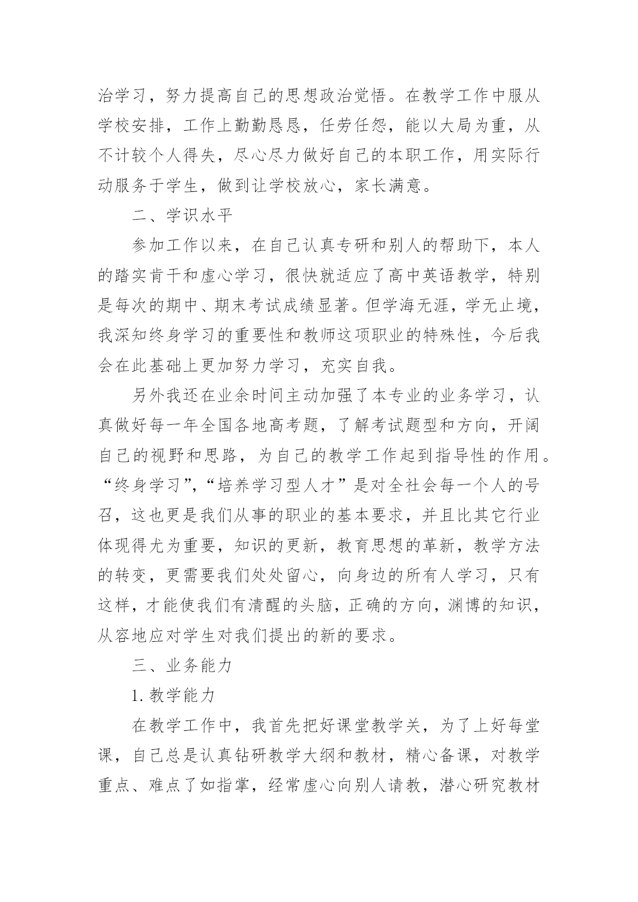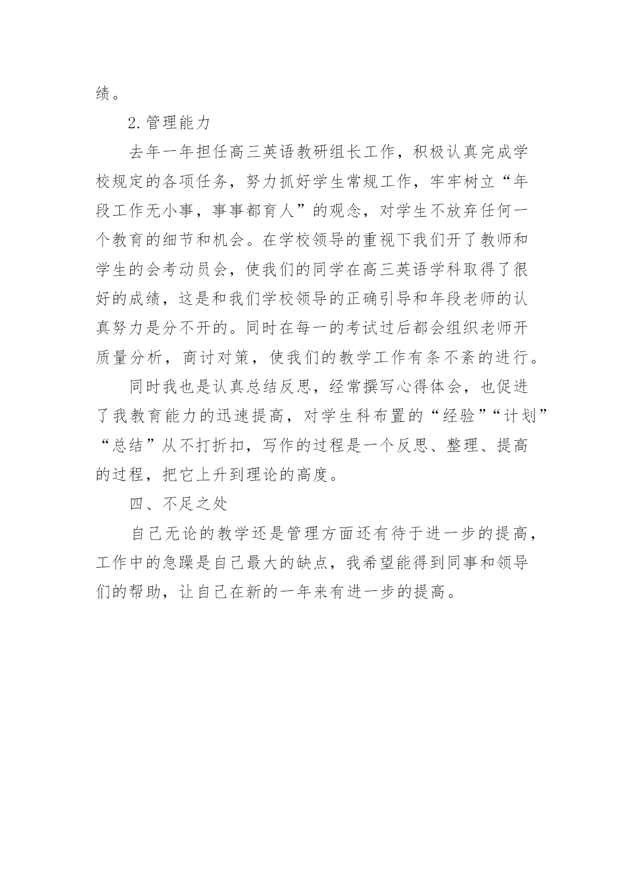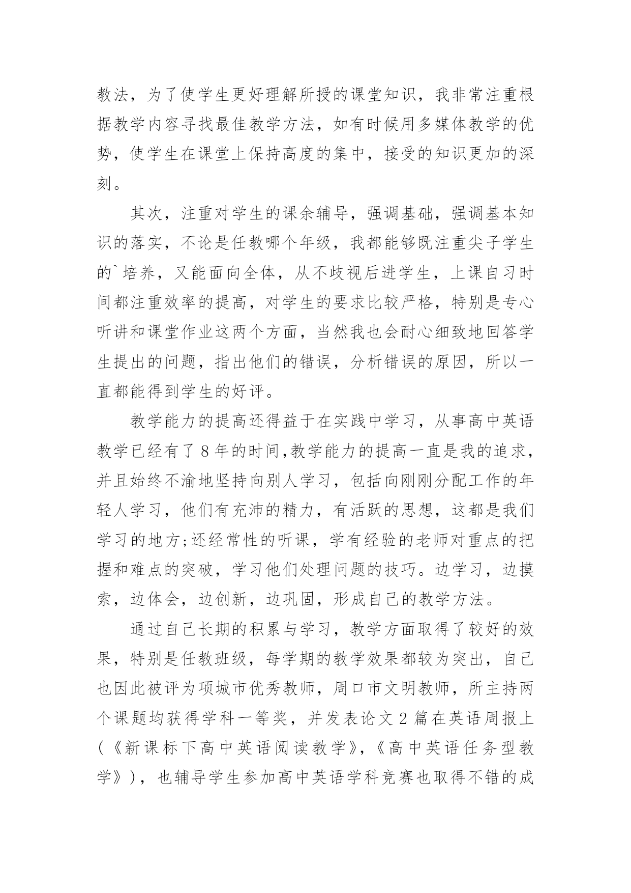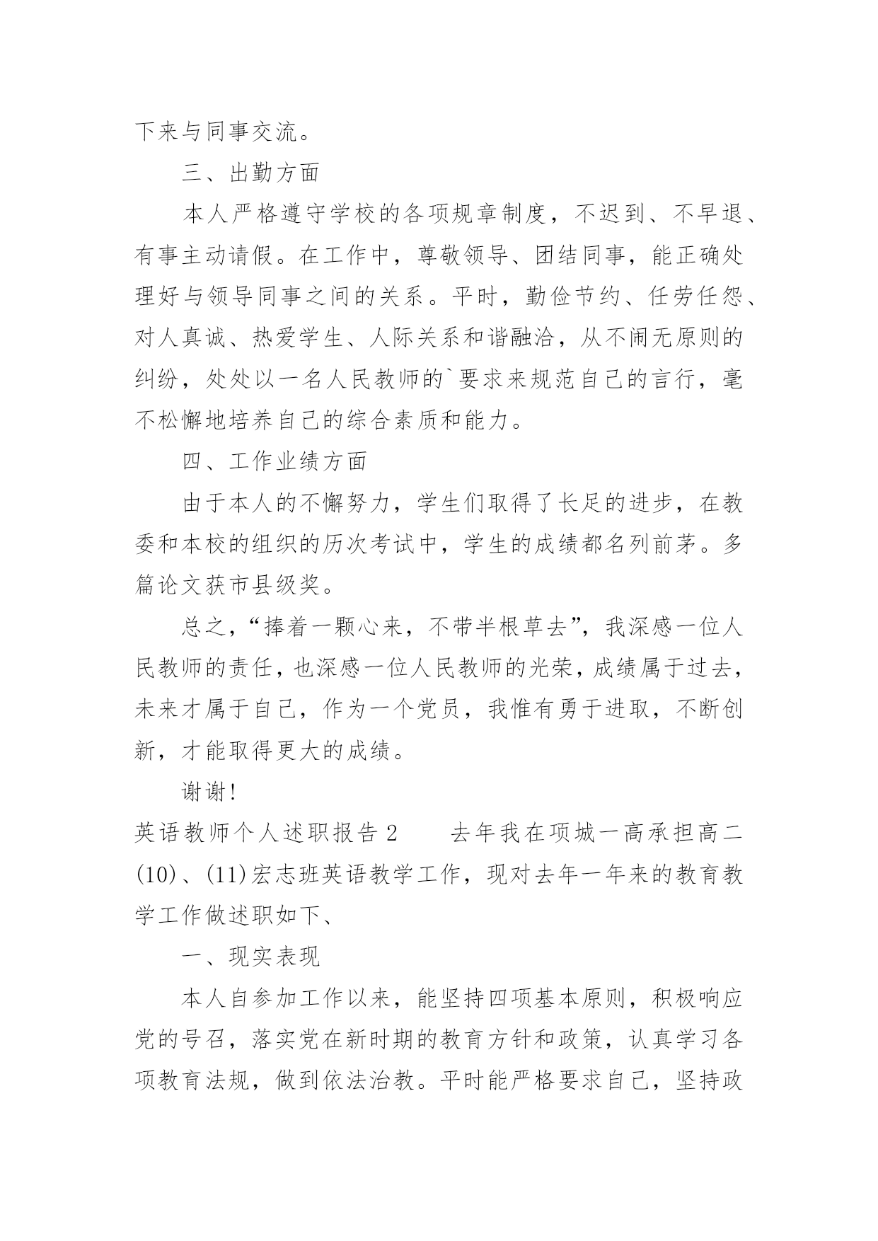 英语教师个人述职报告英语教师个人述职报告在当下这个社会中,报告与我们的生活紧密相连,不同的报告内容同样也是不同的。相信很多朋友都对写报告感到非常苦恼吧,下面是小编帮大家整理的英语教师个人述职报告,欢迎阅读,希望大家能够喜欢。英语教师个人述职报告1光阴荏苒,白驹过隙,转瞬间,一学年的教学工作已接近尾声,为了更好地做好今后的工作,总结经验、吸取教训,本人特就xx学年的工作总结如下:一、政治思想方面本人热爱党,热爱人民,坚持党的教育方针,忠诚党的教育事业。思想端正,作风正派,服从领导的工作安排,办事认真负责。本人一直在各方面严格要求自己,努力地提高自己,以便使自己更快地适应社会发展的形势。通过阅读大量的道德修养书籍,勇于解剖自己,分析自己,正视自己,提高自身素质。二、教育教学能力在教学中,认真钻研新大纲、吃透教材,积极开拓教学思路,把一些先进的教学理论、科学的教学方法及先进现代教学手段灵活运用于课堂教学中,努力培养学生的合作交流、自主探究、勇于创新的等能力。另外,本人在搞好教学工作的同时,还很注重教学经验的积累,有了心得体会就及时记下来与同事交流。三、出勤方面本人严格遵守学校的各项规章制度,不迟到、不早退、有事主动请假。在工作中,尊敬领导、团结同事,能正确处理好与领导同事之间的关系。平时,勤俭节约、任劳任怨、对人真诚、热爱学生、人际关系和谐融洽,从不闹无原则的纠纷,处处以一名人民教师的`要求来规范自己的言行,毫不松懈地培养自己的综合素质和能力。四、工作业绩方面由于本人的不懈努力,学生们取得了长足的进步,在教委和本校的组织的历次考试中,学生的成绩都名列前茅。多篇论文获市县级奖。总之,“捧着一颗心来,不带半根草去”,我深感一位人民教师的责任,也深感一位人民教师的光荣,成绩属于过去,未来才属于自己,作为一个党员,我惟有勇于进取,不断创新,才能取得更大的成绩。谢谢!英语教师个人述职报告2去年我在项城一高承担高二(10)、(11)宏志班英语教学工作,现对去年一年来的教育教学工作做述职如下、一、现实表现本人自参加工作以来,能坚持四项基本原则,积极响应党的号召,落实党在新时期的教育方针和政策,认真学习各项教育法规,做到依法治教。平时能严格要求自己,坚持政治学习,努力提高自己的思想政治觉悟。在教学工作中服从学校安排,工作上勤勤恳恳,任劳任怨,能以大局为重,从不计较个人得失,尽心尽力做好自己的本职工作,用实际行动服务于学生,做到让学校放心,家长满意。二、学识水平参加工作以来,在自己认真专研和别人的帮助下,本人的踏实肯干和虚心学习,很快就适应了高中英语教学,特别是每次的期中、期末考试成绩显著。但学海无涯,学无止境,我深知终身学习的重要性和教师这项职业的特殊性,今后我会在此基础上更加努力学习,充实自我。另外我还在业余时间主动加强了本专业的业务学习,认真做好每一年全国各地高考题,了解考试题型和方向,开阔自己的视野和思路,为自己的教学工作起到指导性的作用。“终身学习”,“培养学习型人才”是对全社会每一个人的号召,这也更是我们从事的职业的基本要求,并且比其它行业体现得尤为重要,知识的更新,教育思想的革新,教学方法的转变,更需要我们处处留心,向身边的所有人学习,只有这样,才能使我们有清醒的头脑,正确的方向,渊博的知识,从容地应对学生对我们提出的新的要求。三、业务能力1.教学能力在教学工作中,我首先把好课堂教学关,为了上好每堂课,自己总是认真钻研教学大纲和教材,精心备课,对教学重点、难点了如指掌,经常虚心向别人请教,潜心研究教材教法,为了使学生更好理解所授的课堂知识,我非常注重根据教学内容寻找最佳教学方法,如有时候用多媒体教学的优势,使学生在课堂上保持高度的集中,接受的知识更加的深刻。其次,注重对学生的课余辅导,强调基础,强调基本知识的落实,不论是任教哪个年级,我都能够既注重尖子学生的`培养,又能面向全体,从不歧视后进学生,上课自习时间都注重效率的提高,对学生的要求比较严格,特别是专心听讲和课堂作业这两个方面,当然我也会耐心细致地回答学生提出的问题,指出他们的错误,分析错误的原因,所以一直都能得到学生的好评。教学能力的提高还得益于在实践中学习,从事高中英语教学已经有了8年的时间,教学能力的提高一直是我的追求,并且始终不渝地坚持向别人学习,包括向刚刚分配工作的年轻人学习,他们有充沛的精力,有活跃的思想,这都是我们学习的地方;还经常性的听课,学有经验的老师对重点的把握和难点的突破,学习他们处理问题的技巧。边学习,边摸索,边体会,边创新,边巩固,形成自己的教学方法。通过自己长期的积累与学习,教学方面取得了较好的效果,特别是任教班级,每学期的教学效果都较为突出,自己也因此被评为项城市优秀教师,周口市文明教师,所主持两个课题均获得学科一等奖,并发表论文2篇在英语周报上(