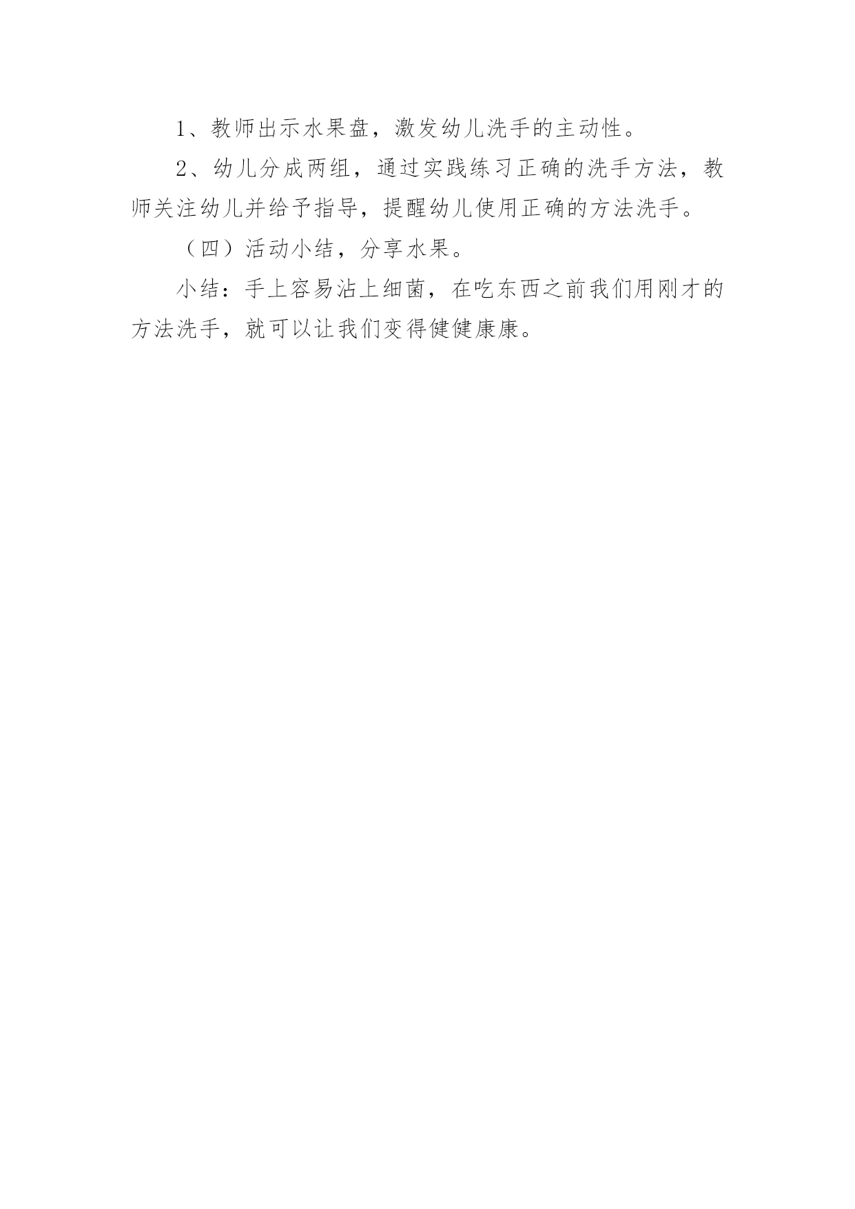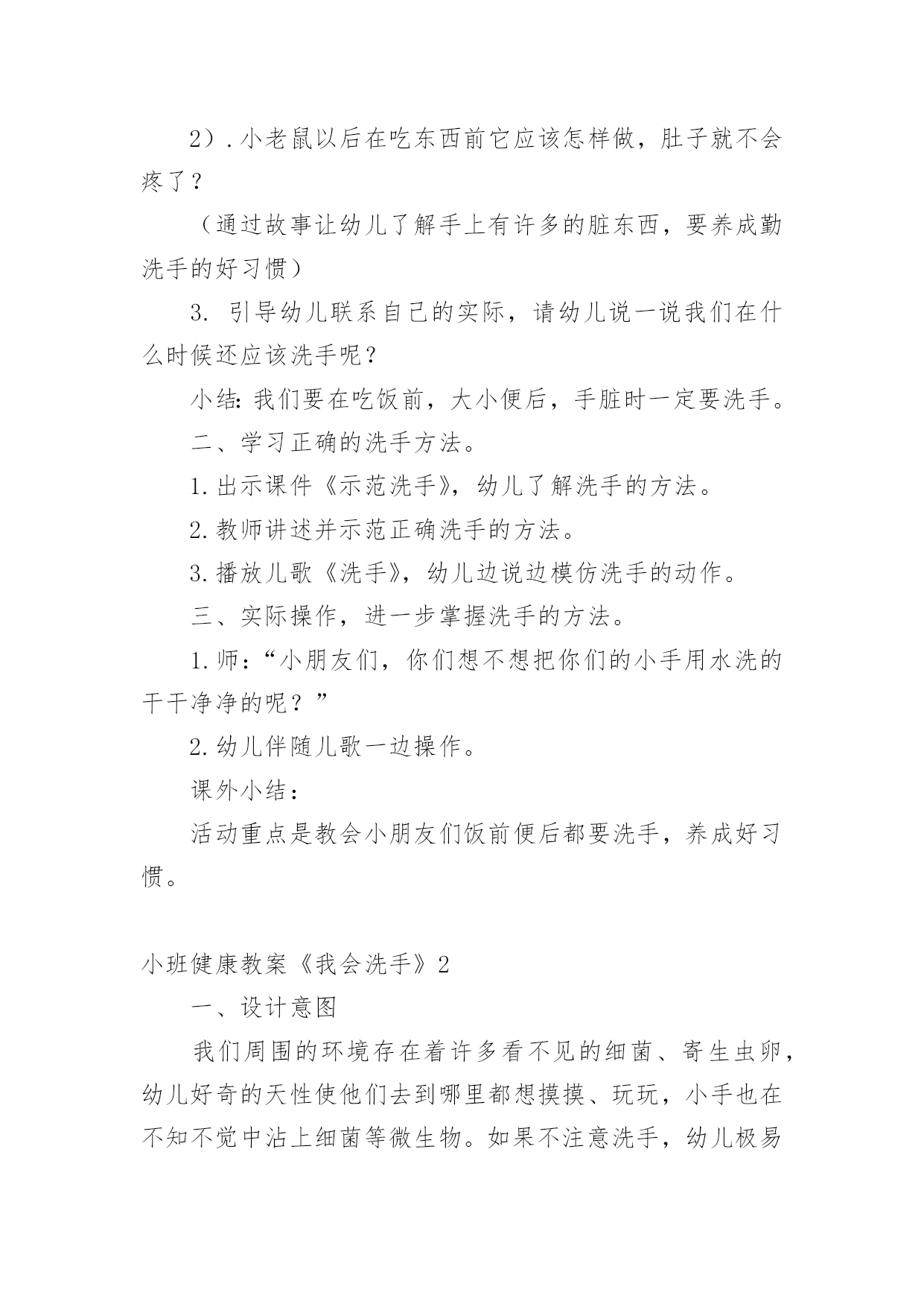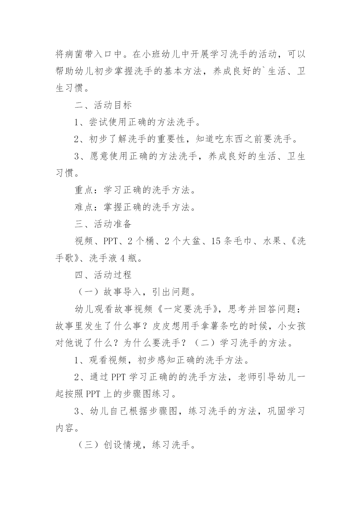 小班健康教案《我会洗手》作为一名教学工作者,通常会被要求编写教案,借助教案可以让教学工作更科学化。来参考自己需要的教案吧!以下是小编精心整理的小班健康教案《我会洗手》,仅供参考,希望能够帮助到大家。小班健康教案《我会洗手》1活动目标:1.初步会用正确的方法洗手。2.知道饭前、便后,手脏时要洗手。活动准备:1.课件《不爱干净的小老鼠》、《示范洗手》、《洗手歌》。2.一个小老鼠手偶,幼儿每人一个洗手盆、一块香皂、一个装水的瓶子活动过程:一、集中观看手偶表演,帮助幼儿了解洗手的`重要性。1.游戏导入:出示小老鼠手偶,激发幼儿观看手偶表演的兴趣。教师伴老鼠:“哎哟,哎哟,我的肚子疼死了。”提问:小老鼠怎么了?它为什么肚子疼呀?2.播放课件《不爱干净的小老鼠》,让幼儿了解洗手的重要性。提问:1).小老鼠为什么会肚子疼啊?2).小老鼠以后在吃东西前它应该怎样做,肚子就不会疼了?(通过故事让幼儿了解手上有许多的脏东西,要养成勤洗手的好习惯)3.引导幼儿联系自己的实际,请幼儿说一说我们在什么时候还应该洗手呢?小结:我们要在吃饭前,大小便后,手脏时一定要洗手。二、学习正确的洗手方法。1.出示课件《示范洗手》,幼儿了解洗手的方法。2.教师讲述并示范正确洗手的方法。3.播放儿歌《洗手》,幼儿边说边模仿洗手的动作。三、实际操作,进一步掌握洗手的方法。1.师:“小朋友们,你们想不想把你们的小手用水洗的干干净净的呢?”2.幼儿伴随儿歌一边操作。课外小结:活动重点是教会小朋友们饭前便后都要洗手,养成好习惯。小班健康教案《我会洗手》2一、设计意图我们周围的环境存在着许多看不见的细菌、寄生虫卵,幼儿好奇的天性使他们去到哪里都想摸摸、玩玩,小手也在不知不觉中沾上细菌等微生物。如果不注意洗手,幼儿极易将病菌带入口中。在小班幼儿中开展学习洗手的活动,可以帮助幼儿初步掌握洗手的基本方法,养成良好的`生活、卫生习惯。二、活动目标1、尝试使用正确的方法洗手。2、初步了解洗手的重要性,知道吃东西之前要洗手。3、愿意使用正确的方法洗手,养成良好的生活、卫生习惯。重点:学习正确的洗手方法。难点:掌握正确的洗手方法。三、活动准备视频、PPT、2个桶、2个大盆、15条毛巾、水果、《洗手歌》、洗手液4瓶。四、活动过程(一)故事导入,引出问题。幼儿观看故事视频《一定要洗手》,思考并回答问题:故事里发生了什么事?皮皮想用手拿薯条吃的时候,小女孩对他说了什么?为什么要洗手?(二)学习洗手的方法。1、观看视频,初步感知正确的洗手方法。2、通过PPT学习正确的的洗手方法,老师引导幼儿一起按照PPT上的步骤图练习。3、幼儿自己根据步骤图,练习洗手的方法,巩固学习内容。(三)创设情境,练习洗手。1、教师出示水果盘,激发幼儿洗手的主动性。2、幼儿分成两组,通过实践练习正确的洗手方法,教师关注幼儿并给予指导,提醒幼儿使用正确的方法洗手。(四)活动小结,分享水果。小结:手上容易沾上细菌,在吃东西之前我们用刚才的方法洗手,就可以让我们变得健健康康。