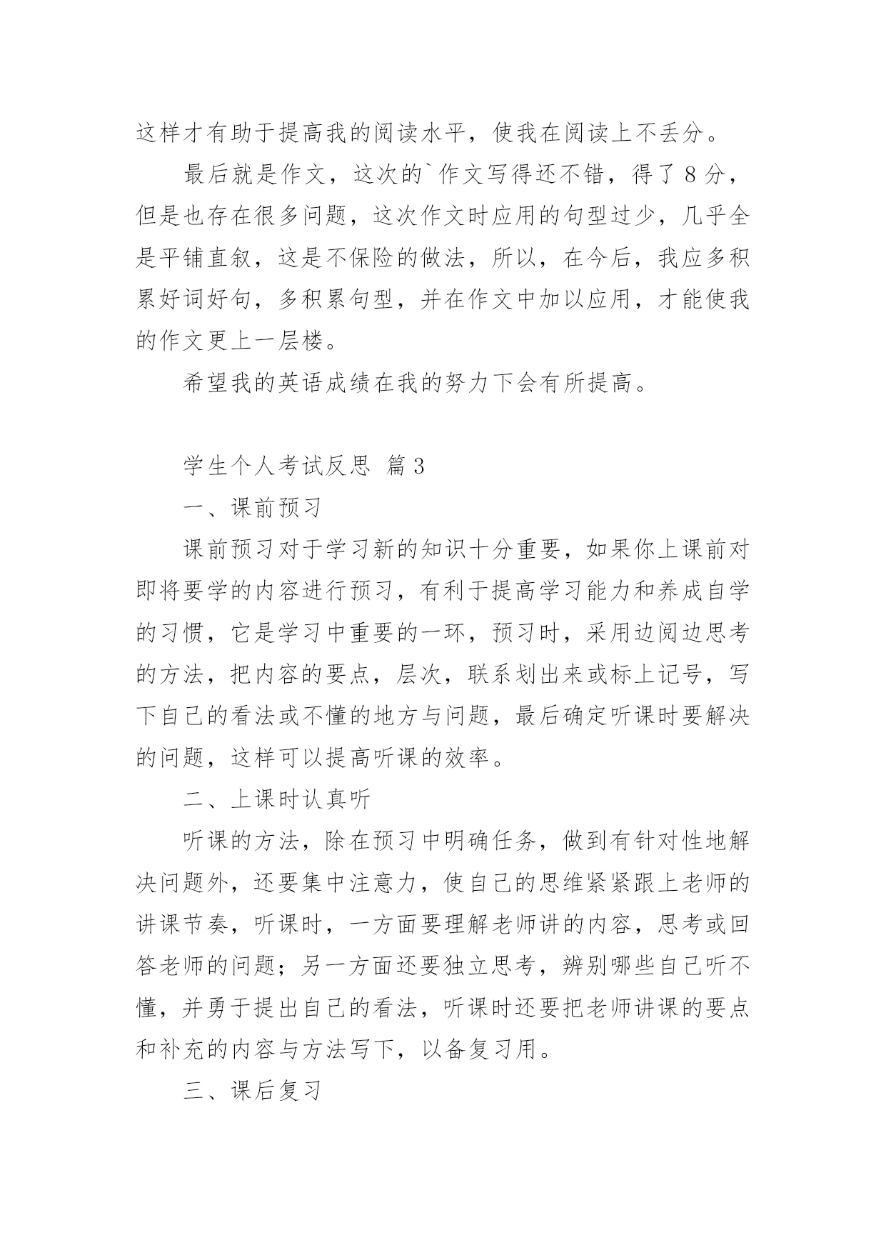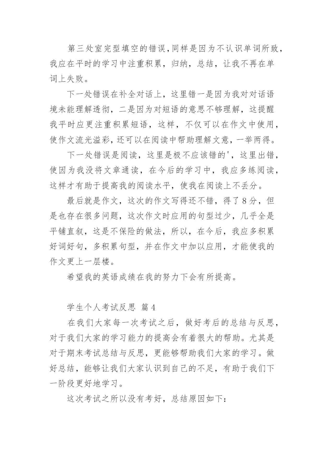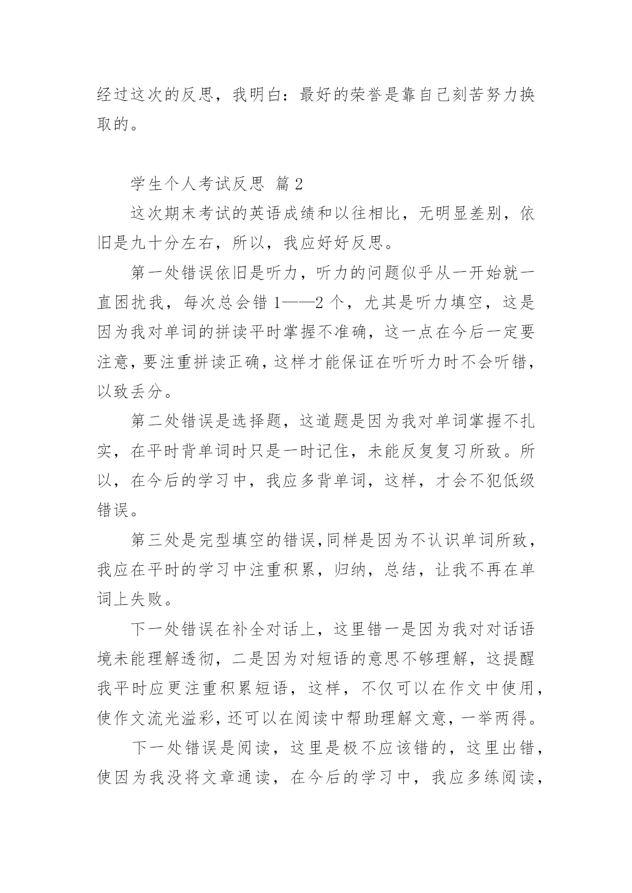 学生个人考试反思学生个人考试反思17篇在快速变化和不断变革的今天,我们的工作之一就是课堂教学,反思意为自我反省。反思要怎么写呢?以下是小编帮大家整理的学生个人考试反思,欢迎阅读与收藏。学生个人考试反思篇1成绩单在这天发了下了,我总以为会考得很好,但是,你看,数字得了83分。我惊讶得不知所措。回到家里,我连自己的成绩都不敢告诉家长,我只好在房间里反思自己。难道是我自己认为每一次考试都很出色,所以骄傲吗?难道是我在考试前没有人在吗?难道是我对学习的态度不好吗?不,不是的`。经过我的反思,我明白:在考试前,就应养精蓄锐,沉着冷静地深练习。考试中,就应稳定情绪,去审清题意,要学会避重就轻。遇到难题先不写,先写自己会写的,这样省时间。要学会巧用推理,用公式推理方法去做,就不会容易出错。考试后,绝不跟别人对答案,就应运用定位加联想的去做,你考试的最高分就可能到达98分,最低分就80多分。是阿,如果我按照上面的要求去做的话,我不就能考得好了吗?如果我在努力去学习,难道将来还会悲哀吗?不,不能这样,我一切重新开始。我不会知难而退的。经过这次的反思,我明白:最好的荣誉是靠自己刻苦努力换取的。学生个人考试反思篇2这次期末考试的英语成绩和以往相比,无明显差别,依旧是九十分左右,所以,我应好好反思。第一处错误依旧是听力,听力的问题似乎从一开始就一直困扰我,每次总会错1——2个,尤其是听力填空,这是因为我对单词的拼读平时掌握不准确,这一点在今后一定要注意,要注重拼读正确,这样才能保证在听听力时不会听错,以致丢分。第二处错误是选择题,这道题是因为我对单词掌握不扎实,在平时背单词时只是一时记住,未能反复复习所致。所以,在今后的学习中,我应多背单词,这样,才会不犯低级错误。第三处是完型填空的错误,同样是因为不认识单词所致,我应在平时的学习中注重积累,归纳,总结,让我不再在单词上失败。下一处错误在补全对话上,这里错一是因为我对对话语境未能理解透彻,二是因为对短语的意思不够理解,这提醒我平时应更注重积累短语,这样,不仅可以在作文中使用,使作文流光溢彩,还可以在阅读中帮助理解文意,一举两得。下一处错误是阅读,这里是极不应该错的,这里出错,使因为我没将文章通读,在今后的学习中,我应多练阅读,这样才有助于提高我的阅读水平,使我在阅读上不丢分。最后就是作文,这次的`作文写得还不错,得了8分,但是也存在很多问题,这次作文时应用的句型过少,几乎全是平铺直叙,这是不保险的做法,所以,在今后,我应多积累好词好句,多积累句型,并在作文中加以应用,才能使我的作文更上一层楼。希望我的英语成绩在我的努力下会有所提高。学生个人考试反思篇3一、课前预习课前预习对于学习新的知识十分重要,如果你上课前对即将要学的内容进行预习,有利于提高学习能力和养成自学的习惯,它是学习中重要的一环,预习时,采用边阅边思考的方法,把内容的要点,层次,联系划出来或标上记号,写下自己的看法或不懂的地方与问题,最后确定听课时要解决的问题,这样可以提高听课的效率。二、上课时认真听听课的方法,除在预习中明确任务,做到有针对性地解决问题外,还要集中注意力,使自己的思维紧紧跟上老师的讲课节奏,听课时,一方面要理解老师讲的内容,思考或回答老师的问题;另一方面还要独立思考,辨别哪些自己听不懂,并勇于提出自己的看法,听课时还要把老师讲课的要点和补充的内容与方法写下,以备复习用。三、课后复习复习应和听课紧密衔接,边阅读材料边回忆听课内容或查看课学时记忆,对学习的问题务必要弄懂,理解和掌握,如果有问题经过长时间思考,还得不到解决,就请教老师或同学。四、课后做练习课后做练习可以达到对知识的巩固,加深理解和学会运用,开发智力与提高能力。例如,数学,物理这两科,课后练习是十分重要的。五、劳逸结合学习还需要劳逸结合,下课时放松一下自己看看外面的风景缓解一下自己的眼睛和大脑的疲劳,以便上课时更有精神,更能集中注意力听课。学生期末考试个人反思15这次期末考试的英语成绩和以往相比,无明显差别,依旧是九十分左右,所以,我应好好反思。这次的第一处错误依旧是听力,听力的问题似乎从一开始就一直困扰我,每次总会错1——2个,尤其是听力填空,这是因为我对单词的拼读平时掌握不准确,这一点在今后一定要注意,要注重拼读正确,这样才能保证在听听力时不会听错,以致丢分。之后一处错误是选择题,这道题是因为我对单词掌握不扎实,在平时背单词时只是一时记住,未能反复复习所致。所以,在今后的学习中,我应多背单词,这样,才会不犯低级错误。第三处室完型填空的错误,同样是因为不认识单词所致,我应在平时的学习中注重积累,归纳,总结,让我不再在单词上失败。下一处错误在补全对话上,这里错一是因为我对对话语境未能理解透彻,二是因为对短语的意思不够理解,这提醒我平时应更注重积累短语,这样,不