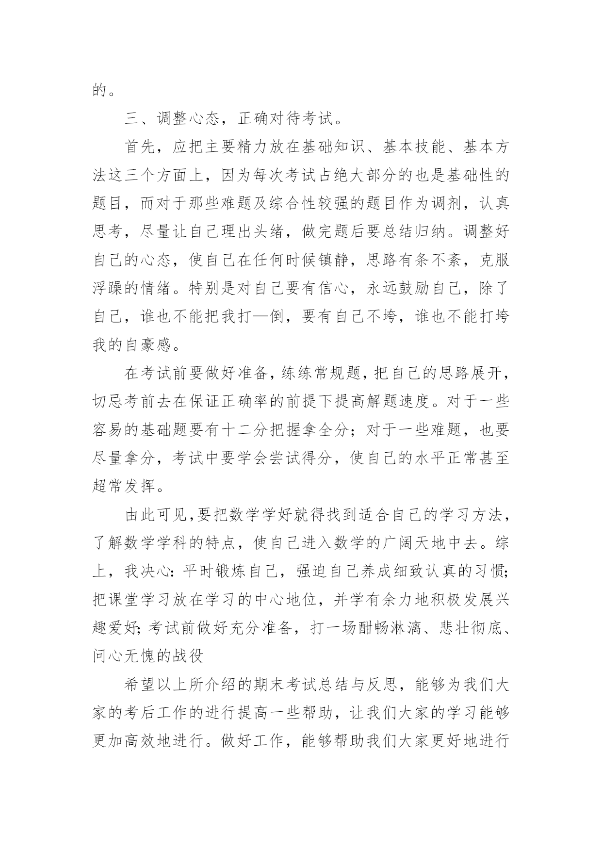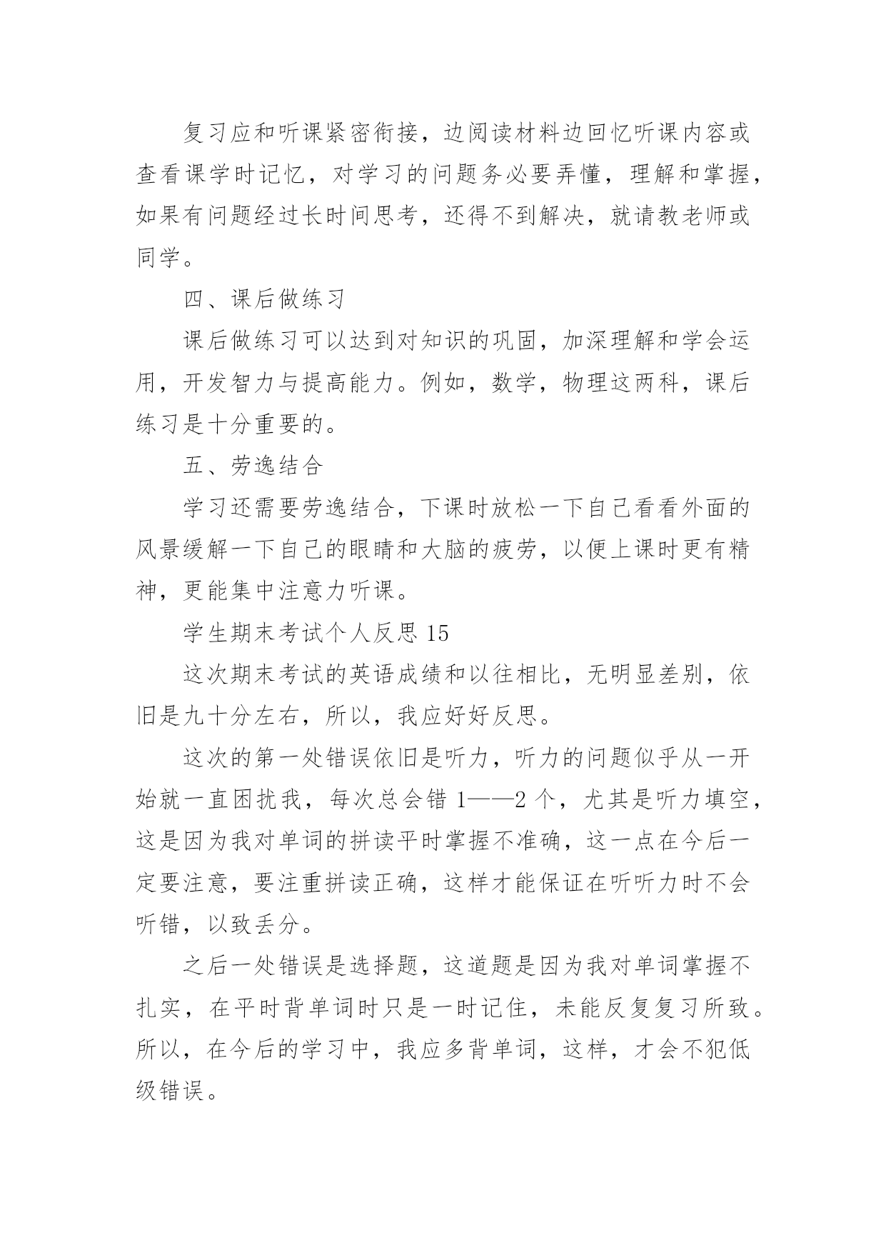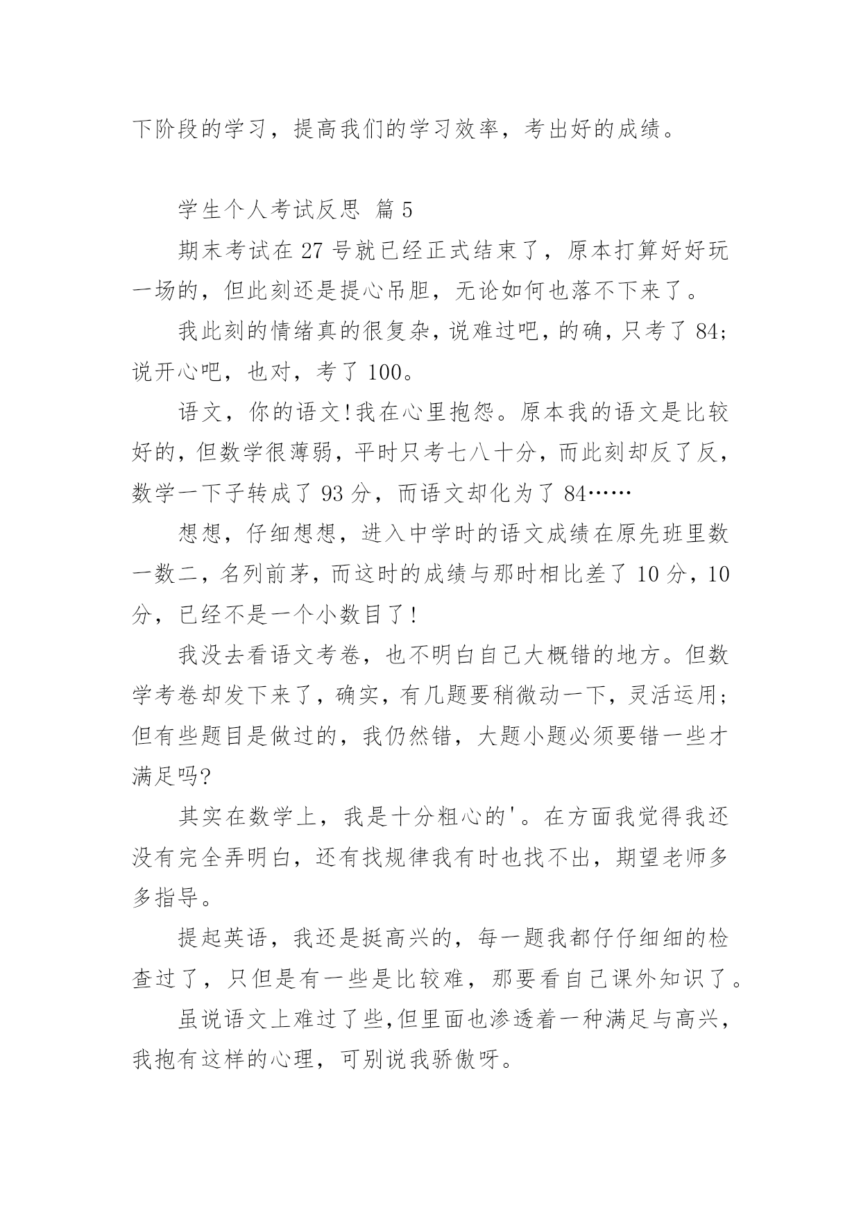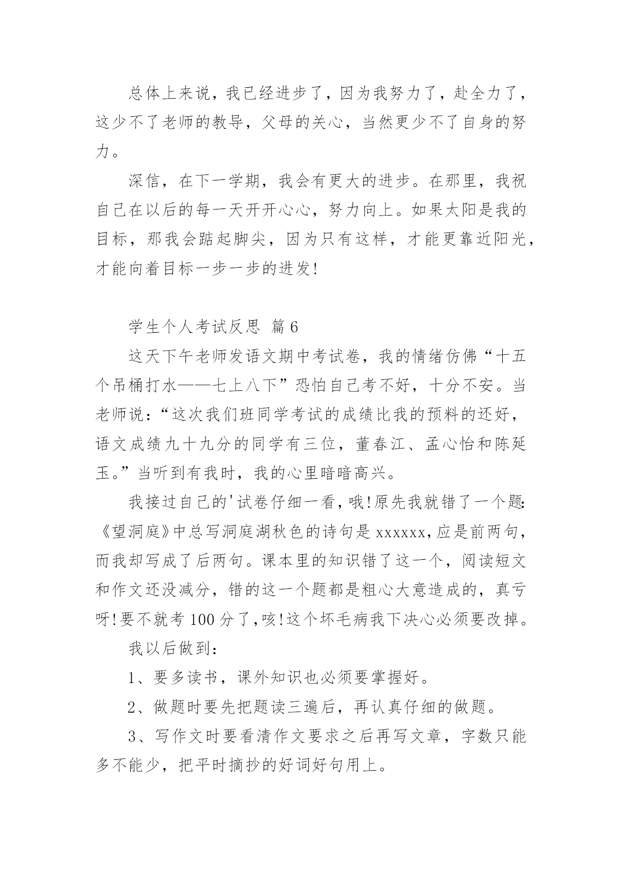 学生个人考试反思学生个人考试反思17篇在快速变化和不断变革的今天,我们的工作之一就是课堂教学,反思意为自我反省。反思要怎么写呢?以下是小编帮大家整理的学生个人考试反思,欢迎阅读与收藏。学生个人考试反思篇1成绩单在这天发了下了,我总以为会考得很好,但是,你看,数字得了83分。我惊讶得不知所措。回到家里,我连自己的成绩都不敢告诉家长,我只好在房间里反思自己。难道是我自己认为每一次考试都很出色,所以骄傲吗?难道是我在考试前没有人在吗?难道是我对学习的态度不好吗?不,不是的`。经过我的反思,我明白:在考试前,就应养精蓄锐,沉着冷静地深练习。考试中,就应稳定情绪,去审清题意,要学会避重就轻。遇到难题先不写,先写自己会写的,这样省时间。要学会巧用推理,用公式推理方法去做,就不会容易出错。考试后,绝不跟别人对答案,就应运用定位加联想的去做,你考试的最高分就可能到达98分,最低分就80多分。是阿,如果我按照上面的要求去做的话,我不就能考得好了吗?如果我在努力去学习,难道将来还会悲哀吗?不,不能这样,我一切重新开始。我不会知难而退的。经过这次的反思,我明白:最好的荣誉是靠自己刻苦努力换取的。学生个人考试反思篇2这次期末考试的英语成绩和以往相比,无明显差别,依旧是九十分左右,所以,我应好好反思。第一处错误依旧是听力,听力的问题似乎从一开始就一直困扰我,每次总会错1——2个,尤其是听力填空,这是因为我对单词的拼读平时掌握不准确,这一点在今后一定要注意,要注重拼读正确,这样才能保证在听听力时不会听错,以致丢分。第二处错误是选择题,这道题是因为我对单词掌握不扎实,在平时背单词时只是一时记住,未能反复复习所致。所以,在今后的学习中,我应多背单词,这样,才会不犯低级错误。第三处是完型填空的错误,同样是因为不认识单词所致,我应在平时的学习中注重积累,归纳,总结,让我不再在单词上失败。下一处错误在补全对话上,这里错一是因为我对对话语境未能理解透彻,二是因为对短语的意思不够理解,这提醒我平时应更注重积累短语,这样,不仅可以在作文中使用,使作文流光溢彩,还可以在阅读中帮助理解文意,一举两得。下一处错误是阅读,这里是极不应该错的,这里出错,使因为我没将文章通读,在今后的学习中,我应多练阅读,这样才有助于提高我的阅读水平,使我在阅读上不丢分。最后就是作文,这次的`作文写得还不错,得了8分,但是也存在很多问题,这次作文时应用的句型过少,几乎全是平铺直叙,这是不保险的做法,所以,在今后,我应多积累好词好句,多积累句型,并在作文中加以应用,才能使我的作文更上一层楼。希望我的英语成绩在我的努力下会有所提高。学生个人考试反思篇3一、课前预习课前预习对于学习新的知识十分重要,如果你上课前对即将要学的内容进行预习,有利于提高学习能力和养成自学的习惯,它是学习中重要的一环,预习时,采用边阅边思考的方法,把内容的要点,层次,联系划出来或标上记号,写下自己的看法或不懂的地方与问题,最后确定听课时要解决的问题,这样可以提高听课的效率。二、上课时认真听听课的方法,除在预习中明确任务,做到有针对性地解决问题外,还要集中注意力,使自己的思维紧紧跟上老师的讲课节奏,听课时,一方面要理解老师讲的内容,思考或回答老师的问题;另一方面还要独立思考,辨别哪些自己听不懂,并勇于提出自己的看法,听课时还要把老师讲课的要点和补充的内容与方法写下,以备复习用。三、课后复习复习应和听课紧密衔接,边阅读材料边回忆听课内容或查看课学时记忆,对学习的问题务必要弄懂,理解和掌握,如果有问题经过长时间思考,还得不到解决,就请教老师或同学。四、课后做练习课后做练习可以达到对知识的巩固,加深理解和学会运用,开发智力与提高能力。例如,数学,物理这两科,课后练习是十分重要的。五、劳逸结合学习还需要劳逸结合,下课时放松一下自己看看外面的风景缓解一下自己的眼睛和大脑的疲劳,以便上课时更有精神,更能集中注意力听课。学生期末考试个人反思15这次期末考试的英语成绩和以往相比,无明显差别,依旧是九十分左右,所以,我应好好反思。这次的第一处错误依旧是听力,听力的问题似乎从一开始就一直困扰我,每次总会错1——2个,尤其是听力填空,这是因为我对单词的拼读平时掌握不准确,这一点在今后一定要注意,要注重拼读正确,这样才能保证在听听力时不会听错,以致丢分。之后一处错误是选择题,这道题是因为我对单词掌握不扎实,在平时背单词时只是一时记住,未能反复复习所致。所以,在今后的学习中,我应多背单词,这样,才会不犯低级错误。第三处室完型填空的错误,同样是因为不认识单词所致,我应在平时的学习中注重积累,归纳,总结,让我不再在单词上失败。下一处错误在补全对话上,这里错一是因为我对对话语境未能理解透彻,二是因为对短语的意思不够理解,这提醒我平时应更注重积累短语,这样,不