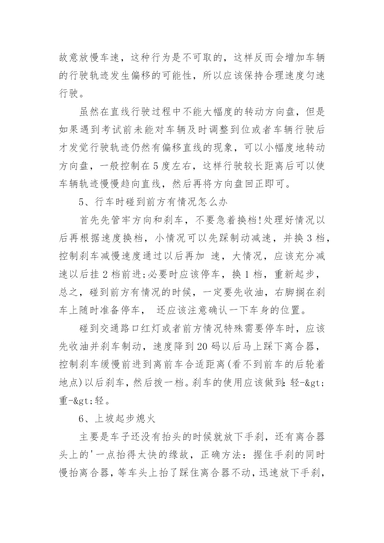 科目三考试的难点归纳科目三考试的难点归纳科目三考试是驾照考试重要科目,科目三路考会遇到许多不同情况,难度也相对较大,下面就为大家介绍一下科目三的难点有哪些,一起来看看吧。1、一次性调头忘记打第二次转向灯一次性调头,打右灯,踩刹车,靠边,速度下来踩离合减到一档,看左后视镜,发现无车跟尾,打左灯,快打方向慢速走,右脚搁在刹车上随时准备刹车,掉头后回正。2、跟车、会车和超车跟车一定要保持合适的安全距离,会车时一定要减速,保持侧向距离至少在一米以上,不要随意超车,超车时要看对面车道前方150米内没有车辆才能超车,超车要先打左转向灯,以小转角进入新车道,超过以后打右转向灯,在和后车距离20m以上开始转向返回原车道,不要猛打方向,路窄碰到前面有来车或行人,应该确认一下右轮的位置,确认可以通过以后再超过去,会车宁可擦车也要离行人远一点。3、转弯以后不要急于换道转弯以后不要急于切换行驶道,要换道也要在行走一段距离以后打转向灯再换。4、直线行驶跑偏和方向不稳在驾驶过程中许多学员因为担心行驶轨迹不是直线而故意放慢车速,这种行为是不可取的,这样反而会增加车辆的行驶轨迹发生偏移的可能性,所以应该保持合理速度匀速行驶。虽然在直线行驶过程中不能大幅度的转动方向盘,但是如果遇到考试前未能对车辆及时调整到位或者车辆行驶后才发觉行驶轨迹仍然有偏移直线的现象,可以小幅度地转动方向盘,一般控制在5度左右,这样行驶较长距离后可以使车辆轨迹慢慢趋向直线,然后再将方向盘回正即可。5、行车时碰到前方有情况怎么办首先先管牢方向和刹车,不要急着换档!处理好情况以后再根据速度换档,小情况可以先踩制动减速,并换3档,控制刹车减慢速度通过以后再加速,大情况,应该充分减速以后挂2档前进;必要时应该停车,换1档,重新起步,总之,碰到前方有情况的时候,一定要先收油,右脚搁在刹车上随时准备停车,还应该注意确认一下车身的位置。碰到交通路口红灯或者前方情况特殊需要停车时,应该先收油并刹车制动,速度降到20码以后马上踩下离合器,控制刹车缓慢前进到离前车合适距离(看不到前车的后轮着地点)以后刹车,然后拨一档。刹车的使用应该做到:轻->重->轻。6、上坡起步熄火主要是车子还没有抬头的时候就放下手刹,还有离合器头上的'一点抬得太快的缘故,正确方法:握住手刹的同时慢抬离合器,等车头上抬了踩住离合器不动,迅速放下手刹,车子往前走2-3m的一段距离,再将离合器头上的一点慢慢抬完,然后轻加油门换2档。7、开转向灯的问题在科目三项目的平时练习中,有时听见口令,这时,应该记住要第一时间打开与口令相应的转向灯,然后再进行换挡,顺序一定不要弄颠倒,科目三考试过程中,除了百米加减档与直线行驶不用打开转向灯,其他项目应该注意转向灯的使用。