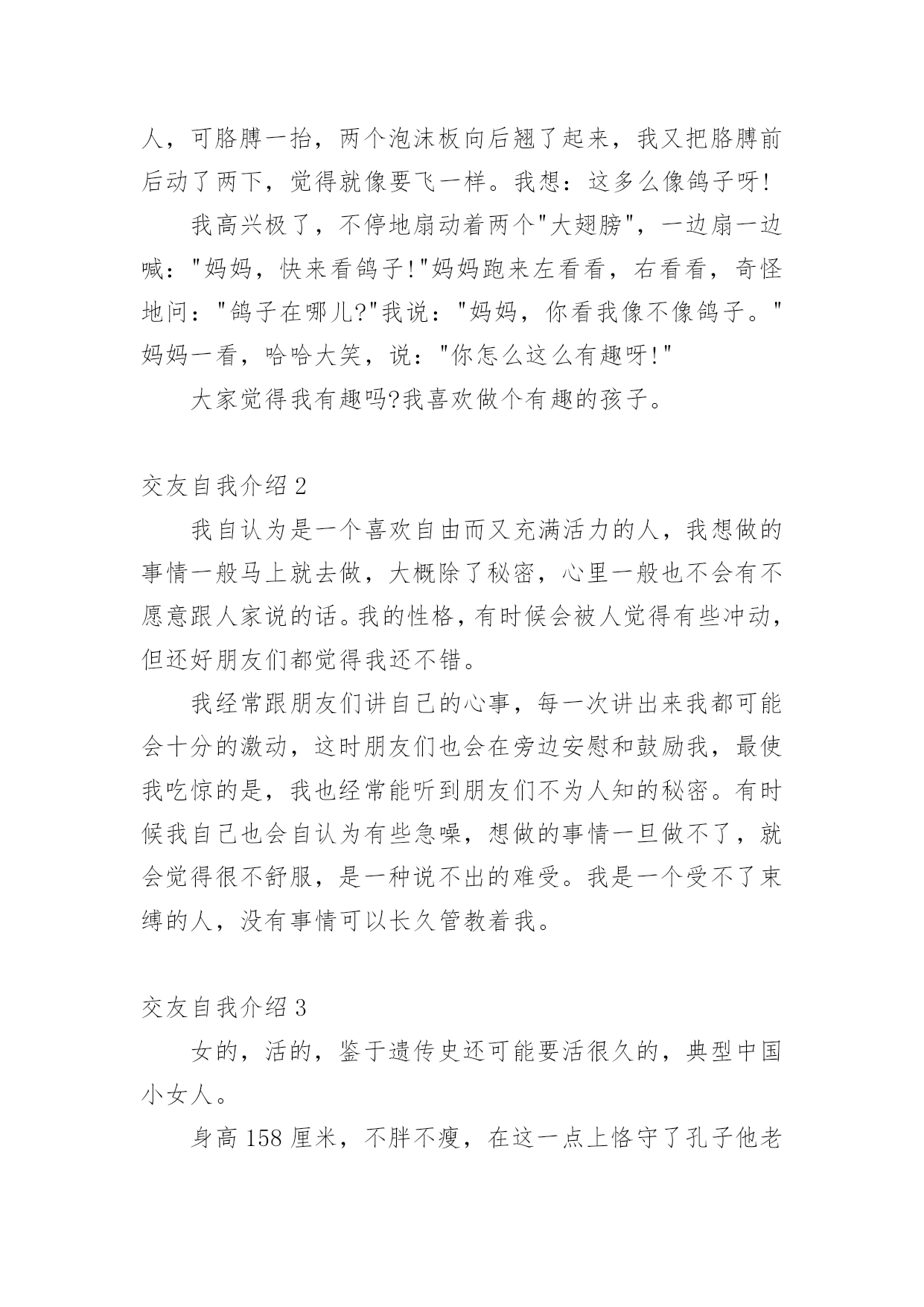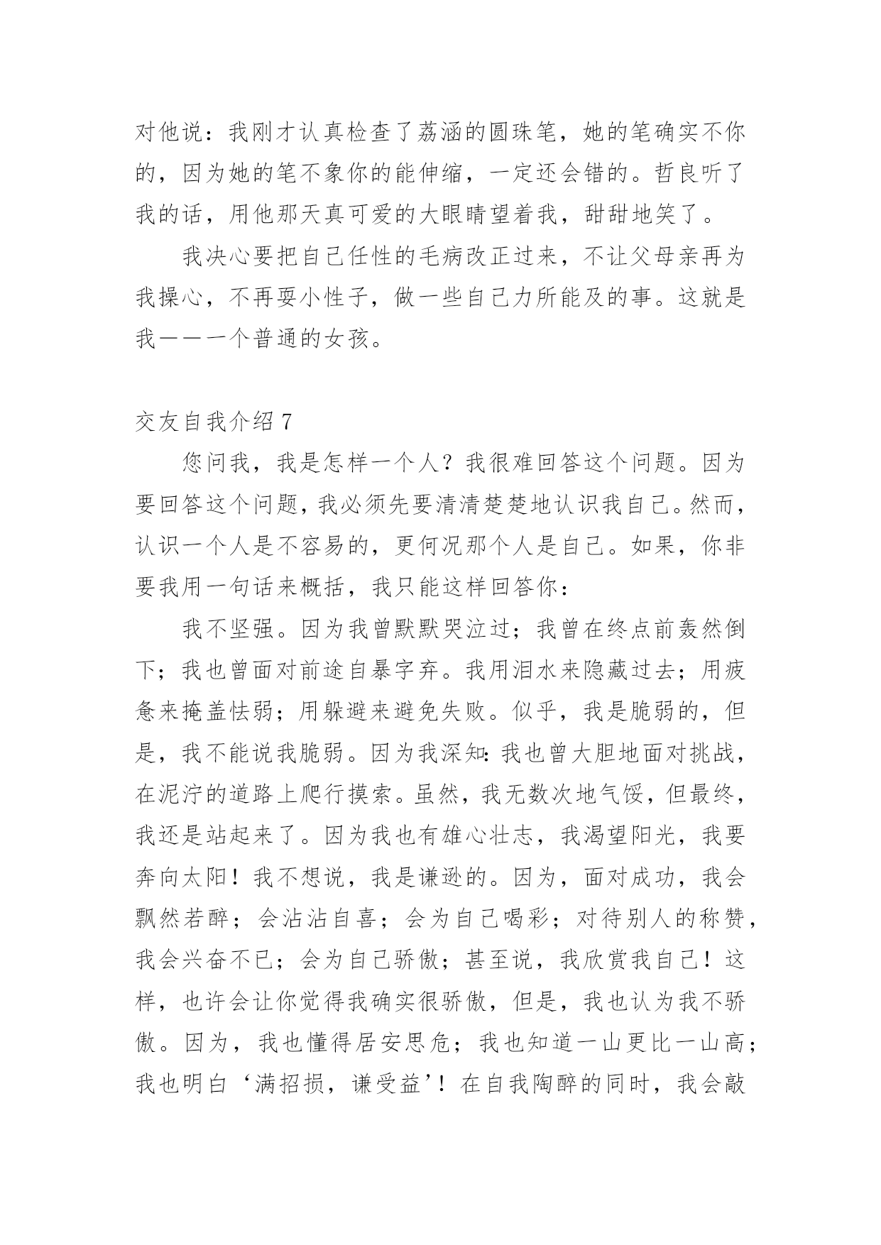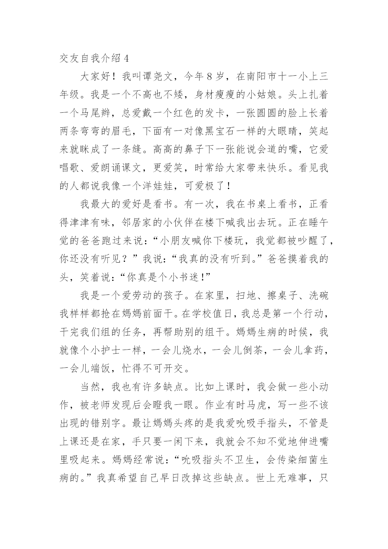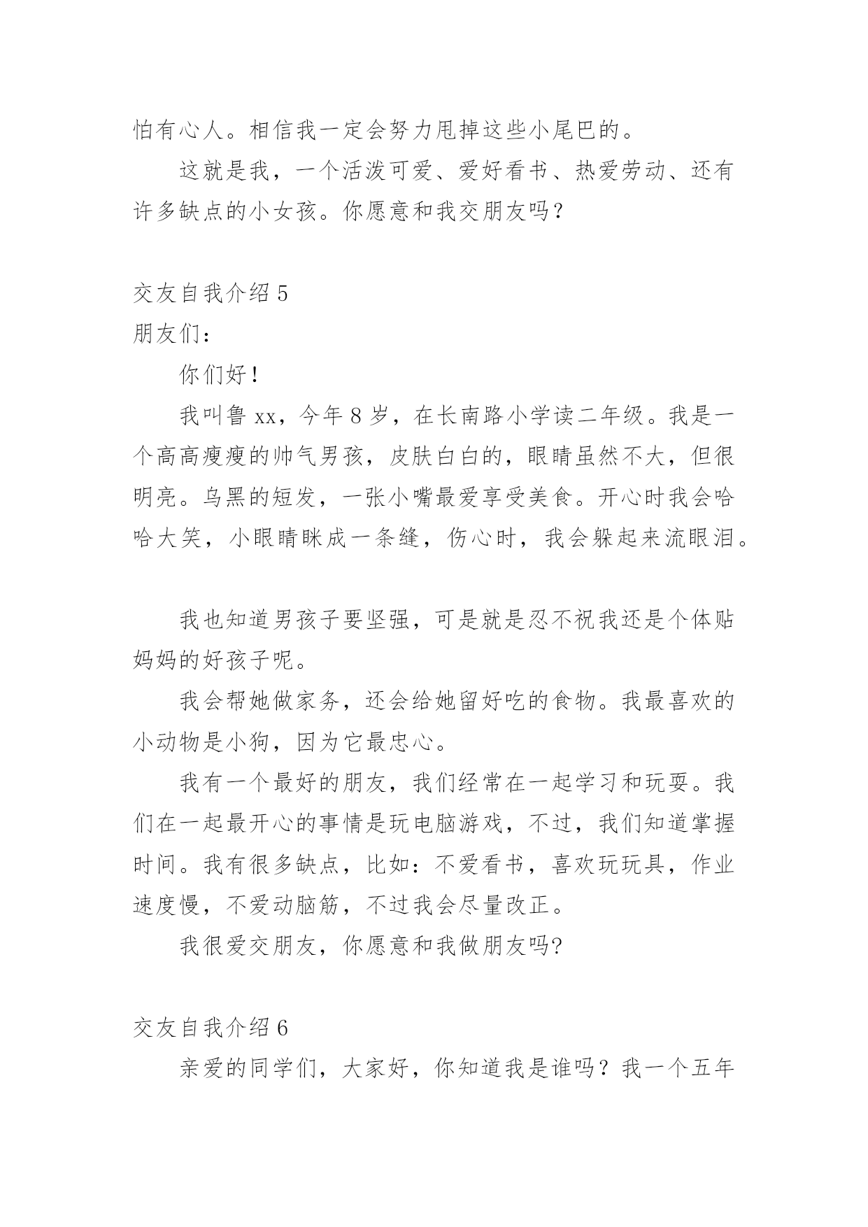 交友自我介绍交友自我介绍15篇当到达一个新的环境后,通常需要我们进行自我介绍,自我介绍是结识新朋友的重要手段。相信许多人会觉得自我介绍很难写吧,下面是小编精心整理的交友自我介绍,欢迎阅读与收藏。交友自我介绍1我叫xxx,今年8岁,已经是三年级的学生了。为了介绍清楚自己,写好这学期的第一篇作文,我特意照着镜子把我观察了又观察。我先找出家里的钢卷尺,让妈妈帮我量了身高是1.38米。再看看我的长相。呀!挺好看的嘛!瞧,圆圆的脸白白净净的,像十五的月亮。眼睛圆溜溜、亮晶晶的,像两个黑葡萄。一个小巧的鼻子长在脸的最中间。红红的嘴唇,一笑两个嘴角就向上翘,像一只小船,真好看!再看那乌黑的短发从中间分开,用两个黄色的小卡子别起来,显得多精神呀!我也有自己的爱好,喜欢画画,喜欢制作,喜欢想象。有一天下午放学回家,我在阳台上玩。我把包装了洗衣机的两个大泡沫板掏了两个洞,套在了胳膊上。我本来想做机器人,可胳膊一抬,两个泡沫板向后翘了起来,我又把胳膊前后动了两下,觉得就像要飞一样。我想:这多么像鸽子呀!我高兴极了,不停地扇动着两个"大翅膀",一边扇一边喊:"妈妈,快来看鸽子!"妈妈跑来左看看,右看看,奇怪地问:"鸽子在哪儿?"我说:"妈妈,你看我像不像鸽子。"妈妈一看,哈哈大笑,说:"你怎么这么有趣呀!"大家觉得我有趣吗?我喜欢做个有趣的孩子。交友自我介绍2我自认为是一个喜欢自由而又充满活力的人,我想做的事情一般马上就去做,大概除了秘密,心里一般也不会有不愿意跟人家说的话。我的性格,有时候会被人觉得有些冲动,但还好朋友们都觉得我还不错。我经常跟朋友们讲自己的心事,每一次讲出来我都可能会十分的激动,这时朋友们也会在旁边安慰和鼓励我,最使我吃惊的是,我也经常能听到朋友们不为人知的秘密。有时候我自己也会自认为有些急噪,想做的事情一旦做不了,就会觉得很不舒服,是一种说不出的难受。我是一个受不了束缚的人,没有事情可以长久管教着我。交友自我介绍3女的,活的,鉴于遗传史还可能要活很久的,典型中国小女人。身高158厘米,不胖不瘦,在这一点上恪守了孔子他老人家的话,中庸之道嘛。长相就是照片,来找本人要QQ。照片是静止滴,人是动态的,最终长相解释权归本人所有。性格挺好的,大方,随和,开朗,乐观。但有自己原则,不触犯我的原则的话都好说。爱说爱笑,有时候也很敏感,爱掉眼泪。面对喜欢的人拘谨笨拙。不喜欢自大的人,矫情的人,不善良的人和无趣的人。爱好听音乐,只要好听,都不反感。喜欢旅游,那种悠闲的潜入当地的旅游,喜欢关上门的一霎那,喜欢听到“您将前往”,那是一种漂移的感觉,那是一种向着目的地靠近的期待感。喜欢电影,尤其搞笑的,异想天开的。至于美食嘛,川菜粤菜江浙菜,西北面食生猛海鲜,提拉米苏可颂马芬拿铁卡布基诺龙井碧螺春铁观音茶饽饽,嘿嘿,960万平方公里,处处美食,想一下,就觉得人活着不是全无希望,加菲猫说的:除了吃和睡,生命也许还有别的意义,不过我觉得没有就挺好。加菲猫还说:我将不再贪吃,而只是爱吃而已。生活的乐趣就在各种小事物小细节中。同样的生活,有人可以精彩的目不暇接,有人却灰尘满目。所以,我希望您不是展示您的薪水房产,而是您以什么样的人格态度过着一种怎样的生活。我很温柔,也喜欢温柔的人。温柔使这个世界不那么可怕。交友自我介绍4大家好!我叫谭尧文,今年8岁,在南阳市十一小上三年级。我是一个不高也不矮,身材瘦瘦的小姑娘。头上扎着一个马尾辫,总爱戴一个红色的发卡,一张圆圆的脸上长着两条弯弯的眉毛,下面有一对像黑宝石一样的大眼睛,笑起来就眯成了一条缝。高高的鼻子下一张能说会道的嘴,它爱唱歌、爱朗诵课文,更爱笑,时常给大家带来快乐。看见我的人都说我像一个洋娃娃,可爱极了!我最大的爱好是看书。有一次,我在书桌上看书,正看得津津有味,邻居家的小伙伴在楼下喊我出去玩。正在睡午觉的爸爸跑过来说:“小朋友喊你下楼玩,我觉都被吵醒了,你还没有听见?”我说:“我真的没有听到。”爸爸摸着我的头,笑着说:“你真是个小书迷!”我是一个爱劳动的孩子。在家里,扫地、擦桌子、洗碗我样样都抢在媽媽前面干。在学校值日,我总是第一个行动,干完我们组的任务,再帮助别的组干。媽媽生病的时候,我就像个小护士一样,一会儿烧水,一会儿倒茶,一会儿拿药,一会儿端饭,忙得不可开交。当然,我也有许多缺点。比如上课时,我会做一些小动作,被老师发现后会瞪我一眼。作业有时马虎,写一些不该出现的错别字。最让媽媽头疼的是我爱吮吸手指头,不管是上课还是在家,手只要一闲下来,我就会不知不觉地伸进嘴里吸起来。媽媽经常说:“吮吸指头不卫生,会传染细菌生病的。”我真希望自己早日改掉这些缺点。世上无难事,只怕有心人。相信我一定会努力甩掉这些小尾巴的。这就是我,一个活泼可爱、爱好看书、热爱劳动、还有许多缺点的小女孩。你愿意和我交朋友吗?交友自