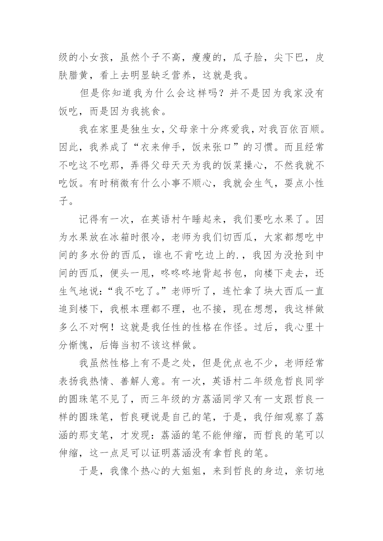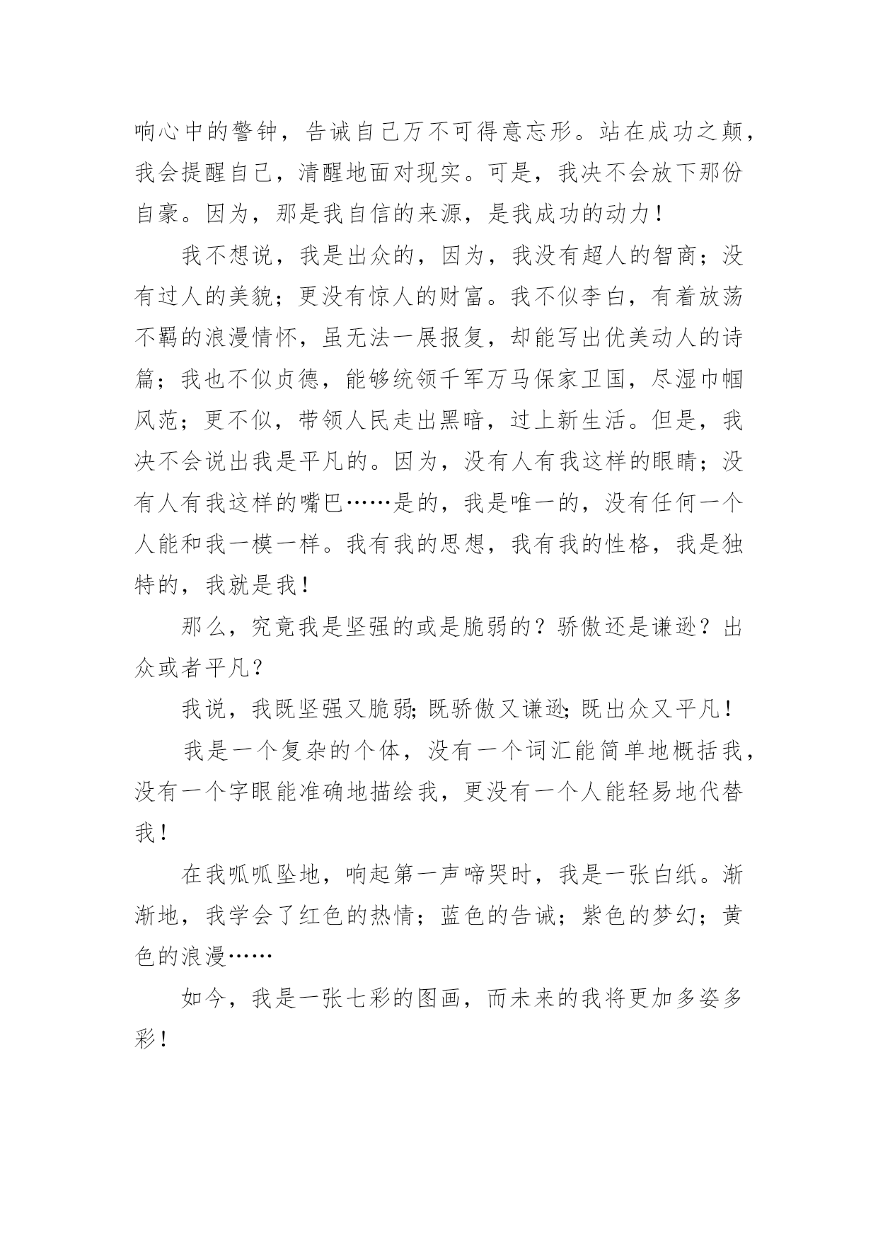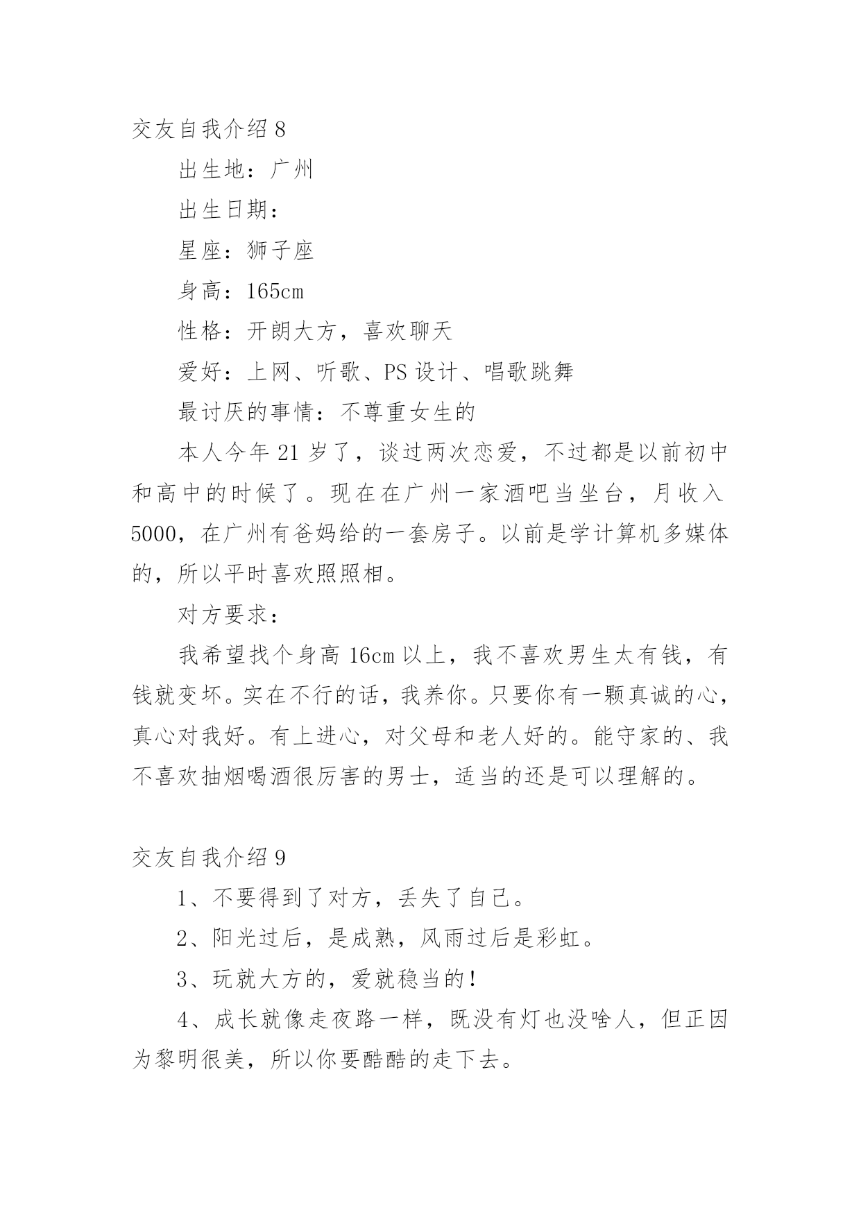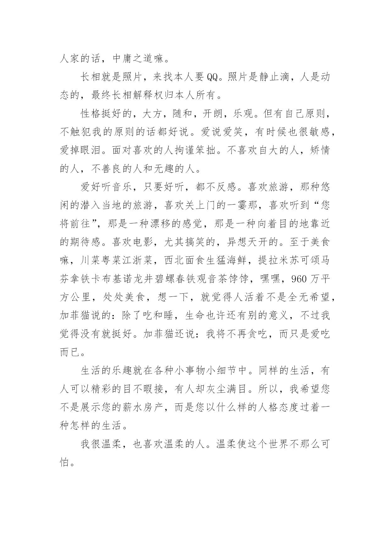 交友自我介绍交友自我介绍15篇当到达一个新的环境后,通常需要我们进行自我介绍,自我介绍是结识新朋友的重要手段。相信许多人会觉得自我介绍很难写吧,下面是小编精心整理的交友自我介绍,欢迎阅读与收藏。交友自我介绍1我叫xxx,今年8岁,已经是三年级的学生了。为了介绍清楚自己,写好这学期的第一篇作文,我特意照着镜子把我观察了又观察。我先找出家里的钢卷尺,让妈妈帮我量了身高是1.38米。再看看我的长相。呀!挺好看的嘛!瞧,圆圆的脸白白净净的,像十五的月亮。眼睛圆溜溜、亮晶晶的,像两个黑葡萄。一个小巧的鼻子长在脸的最中间。红红的嘴唇,一笑两个嘴角就向上翘,像一只小船,真好看!再看那乌黑的短发从中间分开,用两个黄色的小卡子别起来,显得多精神呀!我也有自己的爱好,喜欢画画,喜欢制作,喜欢想象。有一天下午放学回家,我在阳台上玩。我把包装了洗衣机的两个大泡沫板掏了两个洞,套在了胳膊上。我本来想做机器人,可胳膊一抬,两个泡沫板向后翘了起来,我又把胳膊前后动了两下,觉得就像要飞一样。我想:这多么像鸽子呀!我高兴极了,不停地扇动着两个"大翅膀",一边扇一边喊:"妈妈,快来看鸽子!"妈妈跑来左看看,右看看,奇怪地问:"鸽子在哪儿?"我说:"妈妈,你看我像不像鸽子。"妈妈一看,哈哈大笑,说:"你怎么这么有趣呀!"大家觉得我有趣吗?我喜欢做个有趣的孩子。交友自我介绍2我自认为是一个喜欢自由而又充满活力的人,我想做的事情一般马上就去做,大概除了秘密,心里一般也不会有不愿意跟人家说的话。我的性格,有时候会被人觉得有些冲动,但还好朋友们都觉得我还不错。我经常跟朋友们讲自己的心事,每一次讲出来我都可能会十分的激动,这时朋友们也会在旁边安慰和鼓励我,最使我吃惊的是,我也经常能听到朋友们不为人知的秘密。有时候我自己也会自认为有些急噪,想做的事情一旦做不了,就会觉得很不舒服,是一种说不出的难受。我是一个受不了束缚的人,没有事情可以长久管教着我。交友自我介绍3女的,活的,鉴于遗传史还可能要活很久的,典型中国小女人。身高158厘米,不胖不瘦,在这一点上恪守了孔子他老人家的话,中庸之道嘛。长相就是照片,来找本人要QQ。照片是静止滴,人是动态的,最终长相解释权归本人所有。性格挺好的,大方,随和,开朗,乐观。但有自己原则,不触犯我的原则的话都好说。爱说爱笑,有时候也很敏感,爱掉眼泪。面对喜欢的人拘谨笨拙。不喜欢自大的人,矫情的人,不善良的人和无趣的人。爱好听音乐,只要好听,都不反感。喜欢旅游,那种悠闲的潜入当地的旅游,喜欢关上门的一霎那,喜欢听到“您将前往”,那是一种漂移的感觉,那是一种向着目的地靠近的期待感。喜欢电影,尤其搞笑的,异想天开的。至于美食嘛,川菜粤菜江浙菜,西北面食生猛海鲜,提拉米苏可颂马芬拿铁卡布基诺龙井碧螺春铁观音茶饽饽,嘿嘿,960万平方公里,处处美食,想一下,就觉得人活着不是全无希望,加菲猫说的:除了吃和睡,生命也许还有别的意义,不过我觉得没有就挺好。加菲猫还说:我将不再贪吃,而只是爱吃而已。生活的乐趣就在各种小事物小细节中。同样的生活,有人可以精彩的目不暇接,有人却灰尘满目。所以,我希望您不是展示您的薪水房产,而是您以什么样的人格态度过着一种怎样的生活。我很温柔,也喜欢温柔的人。温柔使这个世界不那么可怕。交友自我介绍4大家好!我叫谭尧文,今年8岁,在南阳市十一小上三年级。我是一个不高也不矮,身材瘦瘦的小姑娘。头上扎着一个马尾辫,总爱戴一个红色的发卡,一张圆圆的脸上长着两条弯弯的眉毛,下面有一对像黑宝石一样的大眼睛,笑起来就眯成了一条缝。高高的鼻子下一张能说会道的嘴,它爱唱歌、爱朗诵课文,更爱笑,时常给大家带来快乐。看见我的人都说我像一个洋娃娃,可爱极了!我最大的爱好是看书。有一次,我在书桌上看书,正看得津津有味,邻居家的小伙伴在楼下喊我出去玩。正在睡午觉的爸爸跑过来说:“小朋友喊你下楼玩,我觉都被吵醒了,你还没有听见?”我说:“我真的没有听到。”爸爸摸着我的头,笑着说:“你真是个小书迷!”我是一个爱劳动的孩子。在家里,扫地、擦桌子、洗碗我样样都抢在媽媽前面干。在学校值日,我总是第一个行动,干完我们组的任务,再帮助别的组干。媽媽生病的时候,我就像个小护士一样,一会儿烧水,一会儿倒茶,一会儿拿药,一会儿端饭,忙得不可开交。当然,我也有许多缺点。比如上课时,我会做一些小动作,被老师发现后会瞪我一眼。作业有时马虎,写一些不该出现的错别字。最让媽媽头疼的是我爱吮吸手指头,不管是上课还是在家,手只要一闲下来,我就会不知不觉地伸进嘴里吸起来。媽媽经常说:“吮吸指头不卫生,会传染细菌生病的。”我真希望自己早日改掉这些缺点。世上无难事,只怕有心人。相信我一定会努力甩掉这些小尾巴的。这就是我,一个活泼可爱、爱好看书、热爱劳动、还有许多缺点的小女孩。你愿意和我交朋友吗?交友自