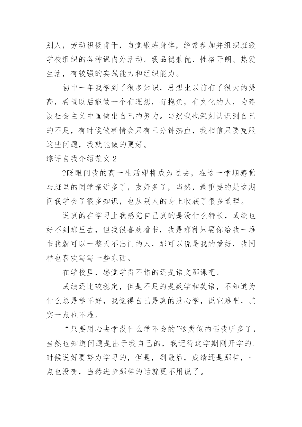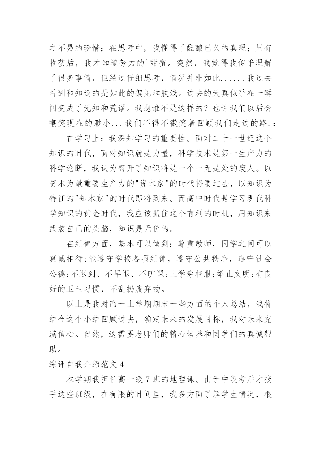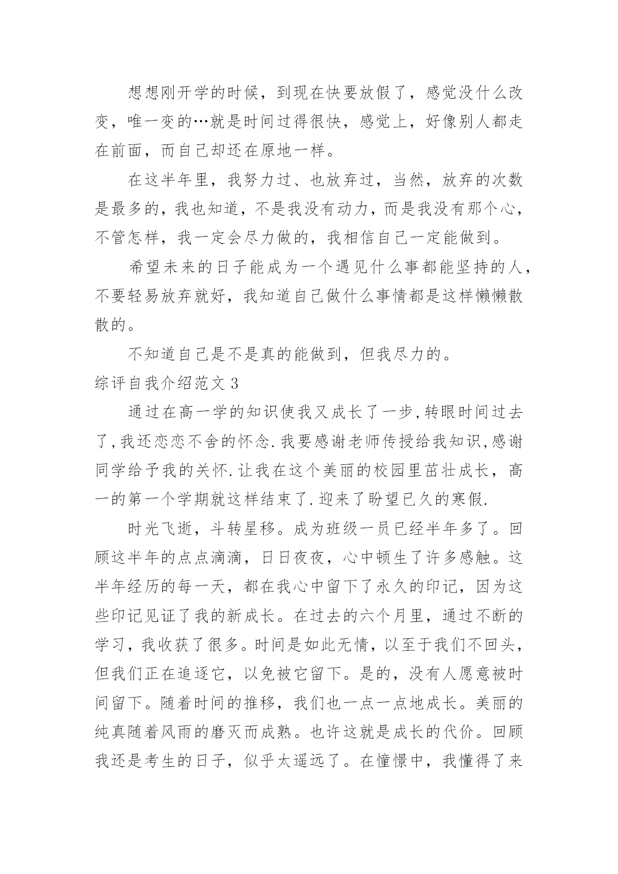 综评自我介绍综评自我介绍范文当我们在一个陌生场合中,我们有必要进行适当的自我介绍,用自我介绍往往可以让他人有一定的了解。怎么写自我介绍才能避免踩雷呢?以下是小编整理的综评自我介绍范文,仅供参考,欢迎大家阅读。综评自我介绍范文1随着时光流逝,初三生活就要结束,在过去的一年中我快乐的成长,慢慢的进步,不知不觉长大了许多,成熟了许多。我认真的学习,不放过学习上的`缺点,从学习中获得知识和乐趣,也在学习中思想得到升华,取得了较优异的成绩,得到了老师认可,能有善良,宽容,从心里包容别人。待人柔切友善,帮助同学解决生活学习中的困难,和同学关系非常融洽,在运动会中也表现出色,为班级做出贡献。我在校热爱祖国,尊敬师长,团结同学,乐于助人,是老师的好帮手,同学的好朋友。我学习勤奋,积极向上,喜欢和同学讨论并解决问题,经常参加班级学校组织的各种课内外活动。在家尊老爱幼,经常帮爸爸妈妈做家务是家长的好孩子,邻居的好榜样。我能自觉遵守中学生守则,积极参加各项活动,尊敬师长,与同学和睦相处,关心热爱集体,乐于帮助别人,劳动积极肯干,自觉锻炼身体,经常参加并组织班级学校组织的各种课内外活动。我品德兼优、性格开朗、热爱生活,有较强的实践能力和组织能力。初中一年我学到了很多知识,思想比以前有了很大的提高,希望以后能做一个有理想,有抱负,有文化的人,为建设社会主义中国做出自己的努力。当然我也深刻认识到自己的不足,有时候做事情会只有三分钟热血,我相信只要克服这些问题,我就能做的更好。综评自我介绍范文2?眨眼间我的高一生活即将成为过去,在这一学期感觉与班里的同学亲近多了,友好多了,当然,最重要的是这期间我学会了很多知识,也从别人的身上收获了很多道理。说真的在学习上我感觉自己真的是没什么特长,成绩也好不到那里去,但我很喜欢看书,我是那种只要你给我一堆书我就可以一整天不出门的人,那可以说是我的爱好,我同样也喜欢写写一些东西。在学校里,感觉学得不错的还是语文那课吧。成绩还比较稳定,但是不足的是数学和英语,不知道为什么总是学不好,我觉得自己是真的没心学,说它难吧,其实一点也不难。“只要用心去学没什么学不会的”这类似的话我听多了,当然也知道问题是出于我自己的,我记得这学期刚开学的.时候说好要努力学习的,但是,到最后,成绩还是那样,一点也没变,当然进步那样的话就更不用说了。想想刚开学的时候,到现在快要放假了,感觉没什么改变,唯一变的…就是时间过得很快,感觉上,好像别人都走在前面,而自己却还在原地一样。在这半年里,我努力过、也放弃过,当然,放弃的次数是最多的,我也知道,不是我没有动力,而是我没有那个心,不管怎样,我一定会尽力做的,我相信自己一定能做到。希望未来的日子能成为一个遇见什么事都能坚持的人,不要轻易放弃就好,我知道自己做什么事情都是这样懒懒散散的。不知道自己是不是真的能做到,但我尽力的。综评自我介绍范文3通过在高一学的知识使我又成长了一步,转眼时间过去了,我还恋恋不舍的怀念.我要感谢老师传授给我知识,感谢同学给予我的关怀.让我在这个美丽的校园里茁壮成长,高一的第一个学期就这样结束了.迎来了盼望已久的寒假.时光飞逝,斗转星移。成为班级一员已经半年多了。回顾这半年的点点滴滴,日日夜夜,心中顿生了许多感触。这半年经历的每一天,都在我心中留下了永久的印记,因为这些印记见证了我的新成长。在过去的六个月里,通过不断的学习,我收获了很多。时间是如此无情,以至于我们不回头,但我们正在追逐它,以免被它留下。是的,没有人愿意被时间留下。随着时间的推移,我们也一点一点地成长。美丽的纯真随着风雨的磨灭而成熟。也许这就是成长的代价。回顾我还是考生的日子,似乎太遥远了。在憧憬中,我懂得了来之不易的珍惜;在思考中,我懂得了酝酿已久的真理;只有收获后,我才知道努力的`甜蜜。突然,我觉得我似乎理解了很多事情,但经过仔细思考,情况并非如此......我过去看到和知道的是如此的偏见和肤浅。过去的天真似乎在一瞬间变成了无知和荒谬。我想谁不是这样的?也许我们以后会嘲笑现在的渺小...我们不得不微笑着回顾我们走过的路.:在学习上:我深知学习的重要性。面对二十一世纪这个知识的时代,面对知识就是力量,科学技术是第一生产力的科学论断,我认为离开了知识将是一个一无是处的废人。以资本为最重要生产力的"资本家"的时代将要过去,以知识为特征的"知本家"的时代即将到来。而高中时代是学习现代科学知识的黄金时代,我应该抓住这个有利的时机,用知识来武装自己的头脑,知识是无价的。在纪律方面,基本可以做到:尊重教师,同学之间可以真诚相待;能遵守学校各项纪律,遵守公共秩序,遵守社会公德;不迟到、不早退、不旷课;上学穿校服;举止文明;有良好的卫生习惯,不乱扔废弃物。以上是我对高一上学期期末一些方面的个人总结,我将结合这个小结回顾过去,确定