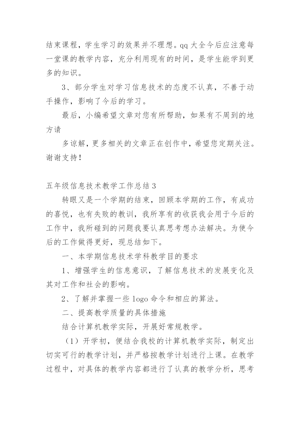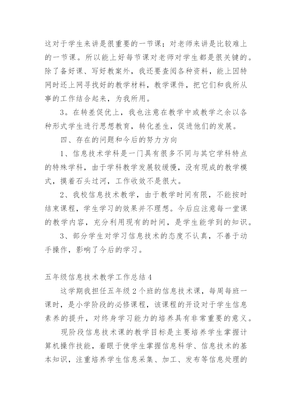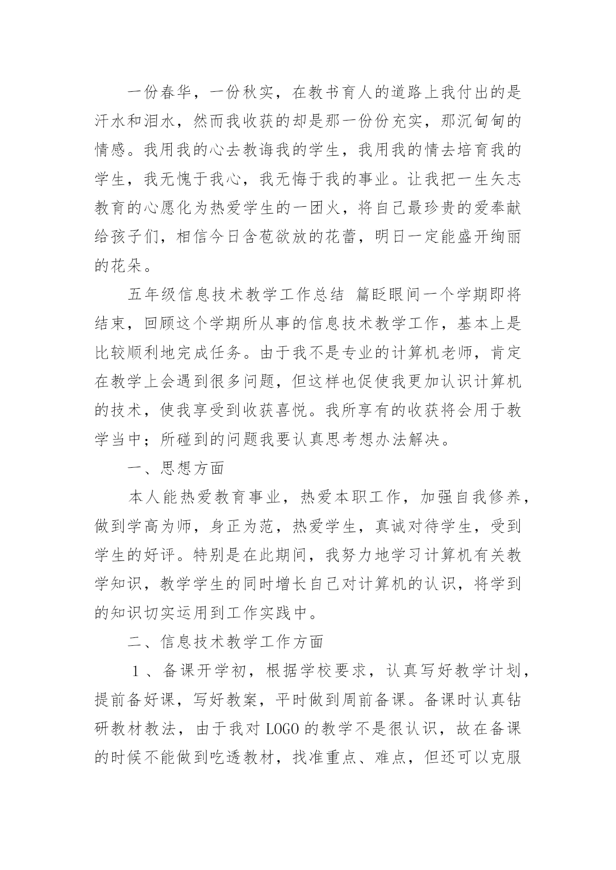 五年级信息技术教学工作总结五年级信息技术教学工作总结(实用)总结就是对一个时期的学习、工作或其完成情况进行一次全面系统的回顾和分析的书面材料,它是增长才干的一种好办法,我想我们需要写一份总结了吧。那么你真的懂得怎么写总结吗?以下是小编帮大家整理的五年级信息技术教学工作总结,希望能够帮助到大家。五年级信息技术教学工作总结1一学期即将结束,回顾这一学期,本人能够努力工作,认真学习,从多方面进行计算机教学和管理工作。有辛勤的耕耘,有收获的喜悦。我所享有的收获我会用于下个学期的工作中,我所碰到的问题我要认真思考想办法解决。一、教学方面1、备课开学初,根据学校要求,认真写好教学计划,提前备好课,写好教案。平时做到周前备课。备课时认真钻研教材,学习好《小学信息技术课程指导纲要》。力求吃透教材,找准重点、难点。为了上好每一节课,我上网查资料,集中别人的优点确定自己的教学思路。为了学生能更直观地感受所学的知识内容,我积极制作课件,准备各种直观教学软件,搜集制作各知识点优秀案例展示给学生。2、上课上好课的前提是做好课前准备,不打无准备之仗,尤其本学科主要课程都要上机完成,每节都要认真做好上机备课,检查机器状态,有无“不可用机器”。本学期五年级的主要学习任务是使学生通过本期信息技术课的学习,学会使用PowerPoint软件进行简单动画设计;激发学生对信息技术的学习兴趣,将信息技术广泛用于学习生活中,培养学生对科学的探索精神。上课时要求学生认真讲课,力求抓住重点,突破难点,精讲精练。运用多种教学方法,从学生的实际出发,注意调动学生学习的积极性和创造性思维,使学生有举一反三的能力。在学生完成上机任务时,在各台计算机前巡视,注意对学困生进行手把手的辅导,课后及时做课后记,找出不足。二、努力方向:1、加强自身基本功的训练,课堂上做到精讲精练,注重对学生能力的培养,知识上做到课课清、段段清。2、对差生多些关心,多点爱心,再多一些耐心,使他们在对计算机的认识上有更大进步。3、加强机房纪律和机器使用道德方面的教育,使学生不仅在班级集中注意力学习,在机房上机时也要按规定严格约束自己。4、利用各种方法,训练学生提高、集中注意力。5、在设计和多媒体课件制作上下功夫,努力使学校的和学校的多媒体课件的水平在原有的基础上有更大的进步。一份春华,一份秋实,在教书育人的道路上我付出的是汗水和泪水,然而我收获的却是那一份份充实,那沉甸甸的情感。我用我的心去教诲我的学生,我用我的情去培育我的学生,我无愧于我心,我无悔于我的事业。让我把一生矢志教育的心愿化为热爱学生的一团火,将自己最珍贵的爱奉献给孩子们,相信今日含苞欲放的花蕾,明日一定能盛开绚丽的花朵。五年级信息技术教学工作总结篇眨眼间一个学期即将结束,回顾这个学期所从事的信息技术教学工作,基本上是比较顺利地完成任务。由于我不是专业的计算机老师,肯定在教学上会遇到很多问题,但这样也促使我更加认识计算机的技术,使我享受到收获喜悦。我所享有的收获将会用于教学当中;所碰到的问题我要认真思考想办法解决。一、思想方面本人能热爱教育事业,热爱本职工作,加强自我修养,做到学高为师,身正为范,热爱学生,真诚对待学生,受到学生的好评。特别是在此期间,我努力地学习计算机有关教学知识,教学学生的同时增长自己对计算机的认识,将学到的知识切实运用到工作实践中。二、信息技术教学工作方面1、备课开学初,根据学校要求,认真写好教学计划,提前备好课,写好教案,平时做到周前备课。备课时认真钻研教材教法,由于我对LOGO的教学不是很认识,故在备课的时候不能做到吃透教材,找准重点、难点,但还可以克服教学中的随意性。在备课时尽量做到:①备教材:钻研教材、搜集有关资料及新科技等前沿信息,对教材系统、重点和难点内容,做到心中有数。②备学生:经常了解学生的`态度,知识基础,学习方法,增强教学的针对性。③备教法:选择适当的教学方法、手段和现代教学媒体,提倡使用现代教学手段。2、上课按照学校工作管理规定,认真备好课,写好教案,努力上好每一节课。信息技术学校安排的课时比较少(一周每班两节)这对于学生来讲的很重要的两节课;对老师来讲是比较难上的两节课。所以怎样才能上好每节课对老师对学生都是很关键的。除了备好课、写好教案外,我还要查阅各种资料,能上因特网时还上网寻找好的教学材料,教学课件,把它们和我所从事的工作结合起来,为我所用。每节课都要认真做好上机准备,检查机器状态,有无“不可用机器”,由于学校的计算机不够(有些坏掉),上机只能两个学生一起操作。在上课时,我能认真讲课,教学目的明确,符合学生实际,体现教材的科学性和思想性,努力做到信息知识、信息能力、信息情意三者统一。有时候运用多种教学方法,注重讲思路、讲规律、讲方法、学法,力求生动活泼,充分调动学生学习兴趣。正确引导学生看待和使