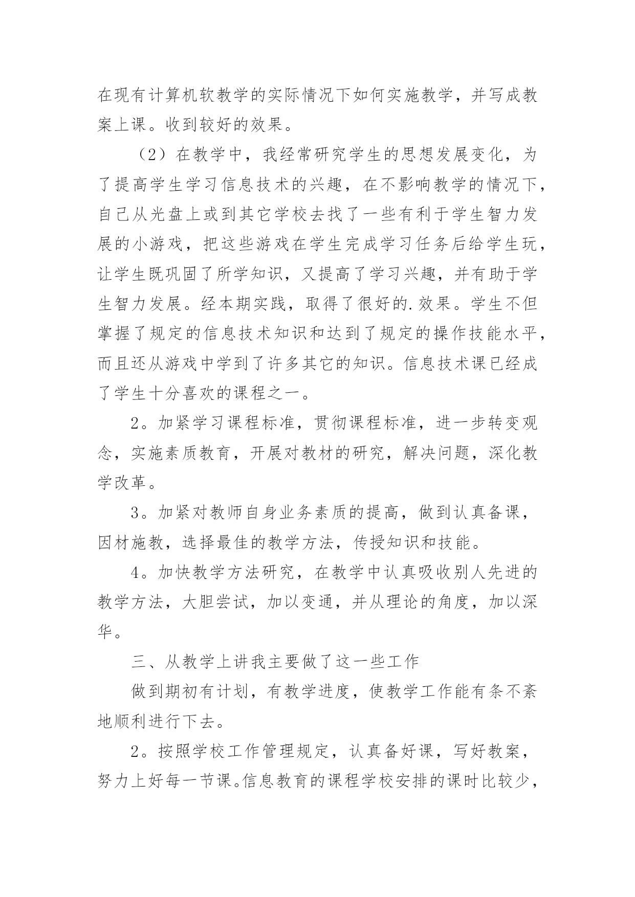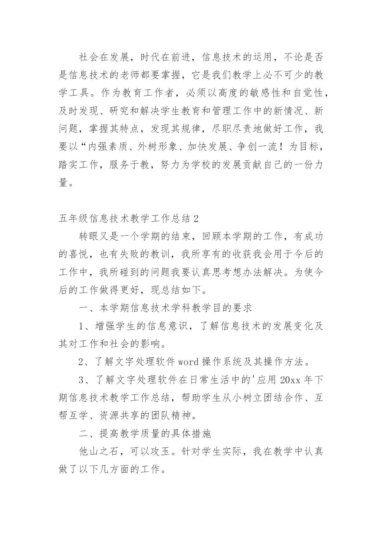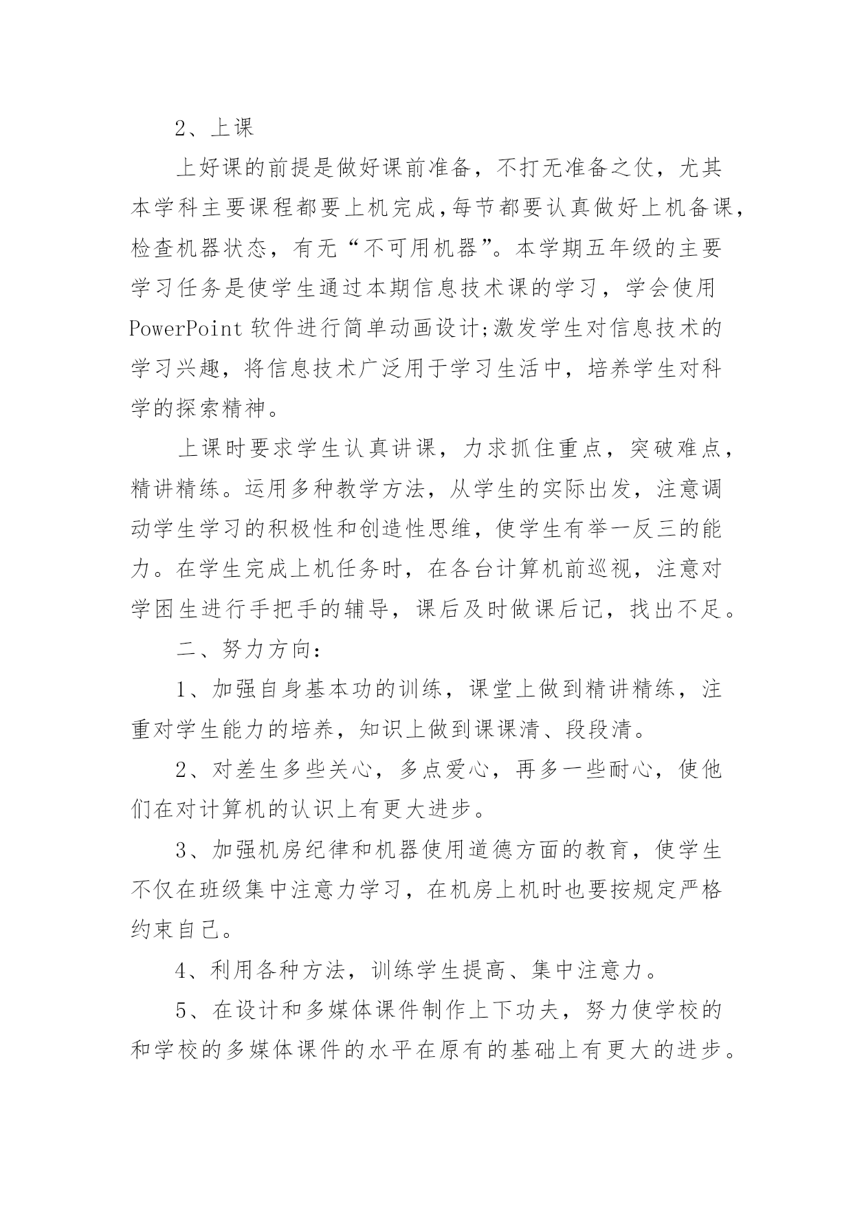 五年级信息技术教学工作总结五年级信息技术教学工作总结(实用)总结就是对一个时期的学习、工作或其完成情况进行一次全面系统的回顾和分析的书面材料,它是增长才干的一种好办法,我想我们需要写一份总结了吧。那么你真的懂得怎么写总结吗?以下是小编帮大家整理的五年级信息技术教学工作总结,希望能够帮助到大家。五年级信息技术教学工作总结1一学期即将结束,回顾这一学期,本人能够努力工作,认真学习,从多方面进行计算机教学和管理工作。有辛勤的耕耘,有收获的喜悦。我所享有的收获我会用于下个学期的工作中,我所碰到的问题我要认真思考想办法解决。一、教学方面1、备课开学初,根据学校要求,认真写好教学计划,提前备好课,写好教案。平时做到周前备课。备课时认真钻研教材,学习好《小学信息技术课程指导纲要》。力求吃透教材,找准重点、难点。为了上好每一节课,我上网查资料,集中别人的优点确定自己的教学思路。为了学生能更直观地感受所学的知识内容,我积极制作课件,准备各种直观教学软件,搜集制作各知识点优秀案例展示给学生。2、上课上好课的前提是做好课前准备,不打无准备之仗,尤其本学科主要课程都要上机完成,每节都要认真做好上机备课,检查机器状态,有无“不可用机器”。本学期五年级的主要学习任务是使学生通过本期信息技术课的学习,学会使用PowerPoint软件进行简单动画设计;激发学生对信息技术的学习兴趣,将信息技术广泛用于学习生活中,培养学生对科学的探索精神。上课时要求学生认真讲课,力求抓住重点,突破难点,精讲精练。运用多种教学方法,从学生的实际出发,注意调动学生学习的积极性和创造性思维,使学生有举一反三的能力。在学生完成上机任务时,在各台计算机前巡视,注意对学困生进行手把手的辅导,课后及时做课后记,找出不足。二、努力方向:1、加强自身基本功的训练,课堂上做到精讲精练,注重对学生能力的培养,知识上做到课课清、段段清。2、对差生多些关心,多点爱心,再多一些耐心,使他们在对计算机的认识上有更大进步。3、加强机房纪律和机器使用道德方面的教育,使学生不仅在班级集中注意力学习,在机房上机时也要按规定严格约束自己。4、利用各种方法,训练学生提高、集中注意力。5、在设计和多媒体课件制作上下功夫,努力使学校的和学校的多媒体课件的水平在原有的基础上有更大的进步。一份春华,一份秋实,在教书育人的道路上我付出的是汗水和泪水,然而我收获的却是那一份份充实,那沉甸甸的情感。我用我的心去教诲我的学生,我用我的情去培育我的学生,我无愧于我心,我无悔于我的事业。让我把一生矢志教育的心愿化为热爱学生的一团火,将自己最珍贵的爱奉献给孩子们,相信今日含苞欲放的花蕾,明日一定能盛开绚丽的花朵。五年级信息技术教学工作总结篇眨眼间一个学期即将结束,回顾这个学期所从事的信息技术教学工作,基本上是比较顺利地完成任务。由于我不是专业的计算机老师,肯定在教学上会遇到很多问题,但这样也促使我更加认识计算机的技术,使我享受到收获喜悦。我所享有的收获将会用于教学当中;所碰到的问题我要认真思考想办法解决。一、思想方面本人能热爱教育事业,热爱本职工作,加强自我修养,做到学高为师,身正为范,热爱学生,真诚对待学生,受到学生的好评。特别是在此期间,我努力地学习计算机有关教学知识,教学学生的同时增长自己对计算机的认识,将学到的知识切实运用到工作实践中。二、信息技术教学工作方面1、备课开学初,根据学校要求,认真写好教学计划,提前备好课,写好教案,平时做到周前备课。备课时认真钻研教材教法,由于我对LOGO的教学不是很认识,故在备课的时候不能做到吃透教材,找准重点、难点,但还可以克服教学中的随意性。在备课时尽量做到:①备教材:钻研教材、搜集有关资料及新科技等前沿信息,对教材系统、重点和难点内容,做到心中有数。②备学生:经常了解学生的`态度,知识基础,学习方法,增强教学的针对性。③备教法:选择适当的教学方法、手段和现代教学媒体,提倡使用现代教学手段。2、上课按照学校工作管理规定,认真备好课,写好教案,努力上好每一节课。信息技术学校安排的课时比较少(一周每班两节)这对于学生来讲的很重要的两节课;对老师来讲是比较难上的两节课。所以怎样才能上好每节课对老师对学生都是很关键的。除了备好课、写好教案外,我还要查阅各种资料,能上因特网时还上网寻找好的教学材料,教学课件,把它们和我所从事的工作结合起来,为我所用。每节课都要认真做好上机准备,检查机器状态,有无“不可用机器”,由于学校的计算机不够(有些坏掉),上机只能两个学生一起操作。在上课时,我能认真讲课,教学目的明确,符合学生实际,体现教材的科学性和思想性,努力做到信息知识、信息能力、信息情意三者统一。有时候运用多种教学方法,注重讲思路、讲规律、讲方法、学法,力求生动活泼,充分调动学生学习兴趣。正确引导学生看待和使