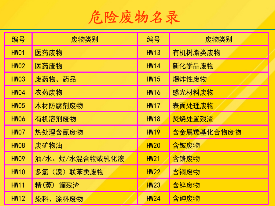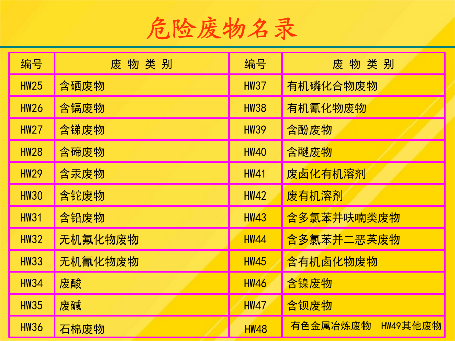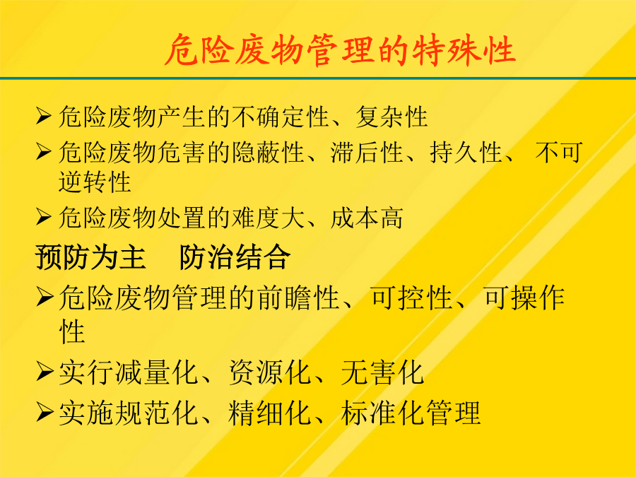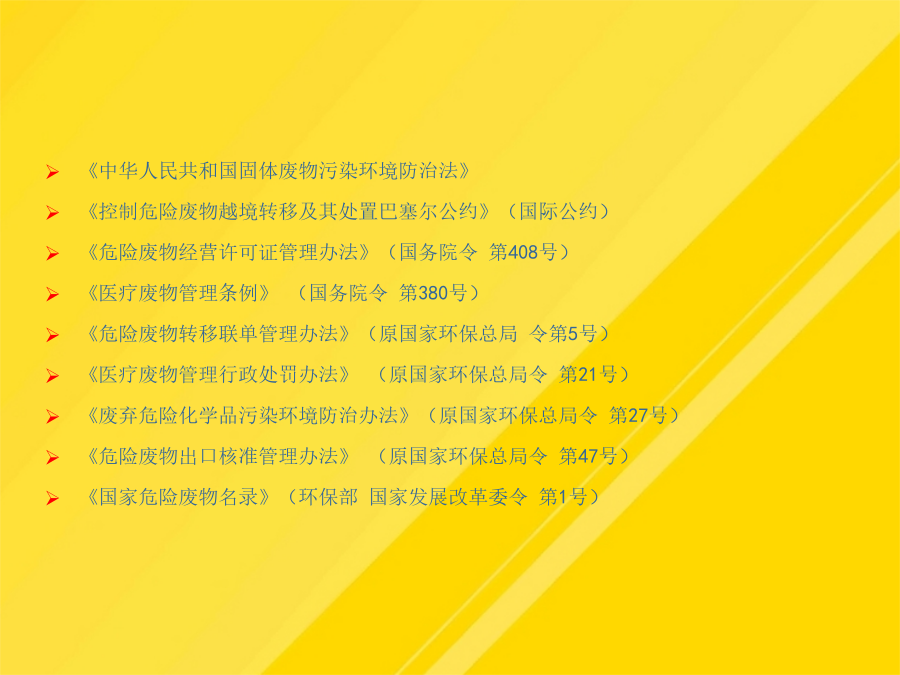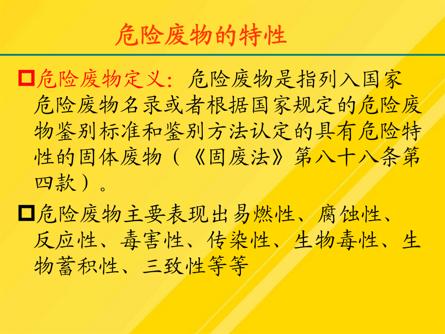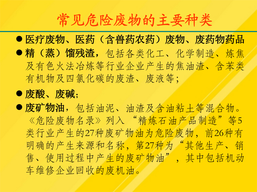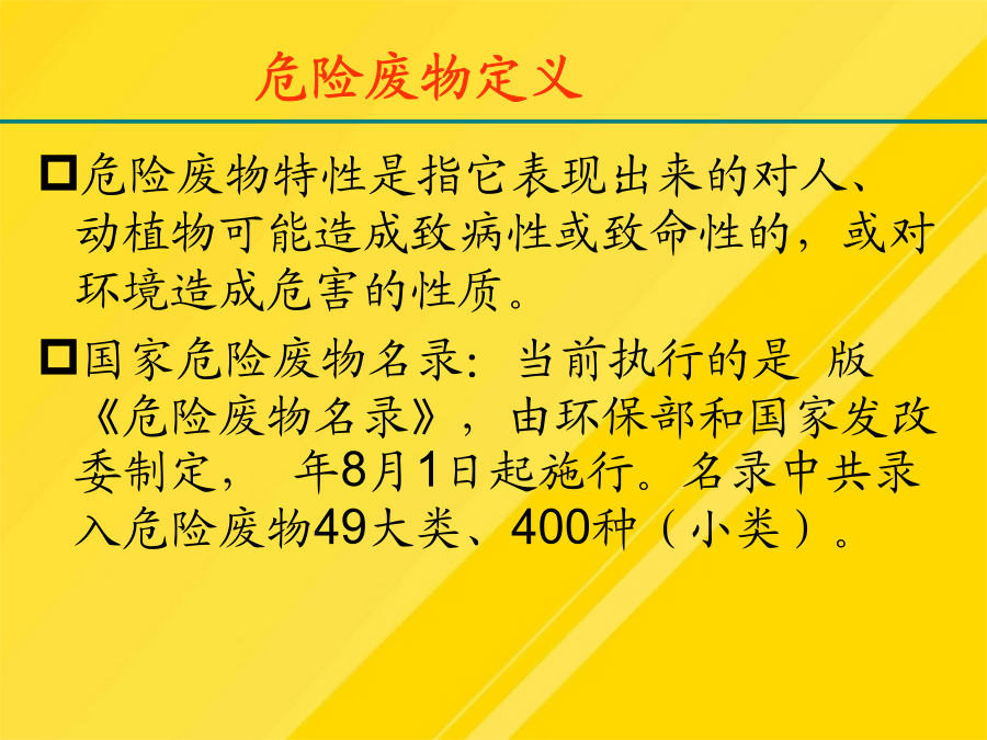 提纲《危险废物焚烧污染控制标准》(GB18484-2001)《危险废物集中焚烧处置工程建设技术规范(HJ/T176-2005)《危险废物(含医疗废物)焚烧处置设施性能测试技术规范》(HJ561-)《含多氯联苯废物焚烧处置工程技术规范》(HJ2037-)《危险废物(含医疗废物)焚烧处置设施二噁英排放监测技术规范》(HJ/T365-2007)《危险废物处置工程技术导则》(HJ2042-)《危险废物鉴别标准》()《危险废物贮存污染控制标准》(GB18597-2001)《危险废物收集、贮存、运输技术规范》(HJ2025-)《危险废物鉴别技术规范》(HJ/T298-2007)《危险废物填埋污染控制标准》(GB18598-2001)《医疗废物焚烧环境卫生标准》(GB/T18773-)《医疗废物集中焚烧处置设施运行监督管理技术规范(试行)》(HJ516-)《医疗废物高温蒸汽集中处理工程技术规范(试行)》(HJ/T276-2006)《医疗废物转运车技术要求(试行)》(GB19217-2003)《医疗废物化学消毒集中处理工程技术规范(试行)》(HJ/T228-2006)《医疗垃圾焚烧环境卫生标准》(CJ3036-1995)《医疗废物焚烧炉技术要求(试行)》(GB19218-2003)《医疗废物集中焚烧处置工程建设技术规范》(HJ/T177-2005)《危险废物焚烧尾气处理设备》(JB/T11643-)《中华人民共和国固体废物污染环境防治法》《控制危险废物越境转移及其处置巴塞尔公约》(国际公约)《危险废物经营许可证管理办法》(国务院令第408号)《医疗废物管理条例》(国务院令第380号)《危险废物转移联单管理办法》(原国家环保总局令第5号)《医疗废物管理行政处罚办法》(原国家环保总局令第21号)《废弃危险化学品污染环境防治办法》(原国家环保总局令第27号)《危险废物出口核准管理办法》(原国家环保总局令第47号)《国家危险废物名录》(环保部国家发展改革委令第1号)危险废物特性是指它表现出来的对人、动植物可能造成致病性或致命性的,或对环境造成危害的性质。国家危险废物名录:当前执行的是版《危险废物名录》,由环保部和国家发改委制定,年8月1日起施行。名录中共录入危险废物49大类、400种(小类)。危险废物定义:危险废物是指列入国家危险废物名录或者根据国家规定的危险废物鉴别标准和鉴别方法认定的具有危险特性的固体废物(《固废法》第八十八条第四款)。危险废物主要表现出易燃性、腐蚀性、反应性、毒害性、传染性、生物毒性、生物蓄积性、三致性等等危险废物产生的不确定性、复杂性危险废物危害的隐蔽性、滞后性、持久性、不可逆转性危险废物处置的难度大、成本高预防为主防治结合危险废物管理的前瞻性、可控性、可操作性实行减量化、资源化、无害化实施规范化、精细化、标准化管理含砷废物医疗废物、医药(含兽药农药)废物、废药物药品精(蒸)馏残渣,包括各类化工、化学制造、炼焦及有色火法冶炼等行业企业产生的焦油渣、含苯类有机物及四氯化碳的废渣、废液等;废酸、废碱;废矿物油,包括油泥、油渣及含油粘土等混合物。《危险废物名录》列入“精炼石油产品制造”等5类行业产生的27种废矿物油为危险废物,前26种有明确的产生来源和名称,第27种为“其他生产、销售、使用过程中产生的废矿物油”,其中包括机动车维修企业回收的废机油。含剧毒和重金属、贵金属类废物,包括金属表面处理、有色金属冶炼、基础化工、毛皮鞣制等产生的含氰、含砷、含汞、含铬、含镉、含铅、含锌、含铝、含镍、含钡、含铜、含银、含硒、含碲、含锑、含铍、含铊的废渣、粉尘、污泥等。有机物类废物,包括有机树脂类废物,有机溶剂、卤化有机溶剂、有机磷化合物类废物,以及含醚、含多氯苯、二噁英、有机氰化物的废渣、废液、废载体、污泥等。废定影、显影液等感光材料废物、废液,制造涂料、油漆、油墨、颜料等废物、废渣、污泥。金属矿及石棉矿采选产生的危险废物有6种:①硫化铜矿、氧化铜矿等铜矿物采选过程中集(除)尘装置收集的粉尘;②硫砷化合物(雌黄、雄黄及砷硫铁矿)或其他含砷化合物的金属矿石采选过程中集(除)尘装置收集的粉尘;③“全泥氰化-炭浆提金”选矿生产工艺产生的含汞粉尘、残渣;④“全泥氰化-炭浆提金”选矿生产工艺中含氰废水处理的污泥;⑤汞矿采选过程中产生的废渣和集(除)尘装置收集的粉尘;⑥石棉矿采选过程产生的石棉渣。有色金属冶炼产生的浸出渣有8种为危险废物:①有钙焙烧法生产铬盐产生的铬浸出渣;②铁铬合金生产过程中金属铬冶炼产生的铬浸出渣③铅锌冶炼过程中,锌焙烧矿常规浸出法产生的浸出渣;④铅锌冶炼过程中,锌焙烧矿热酸浸出黄钾铁钒法产生的铁钒渣;⑤铅锌冶炼过程中,