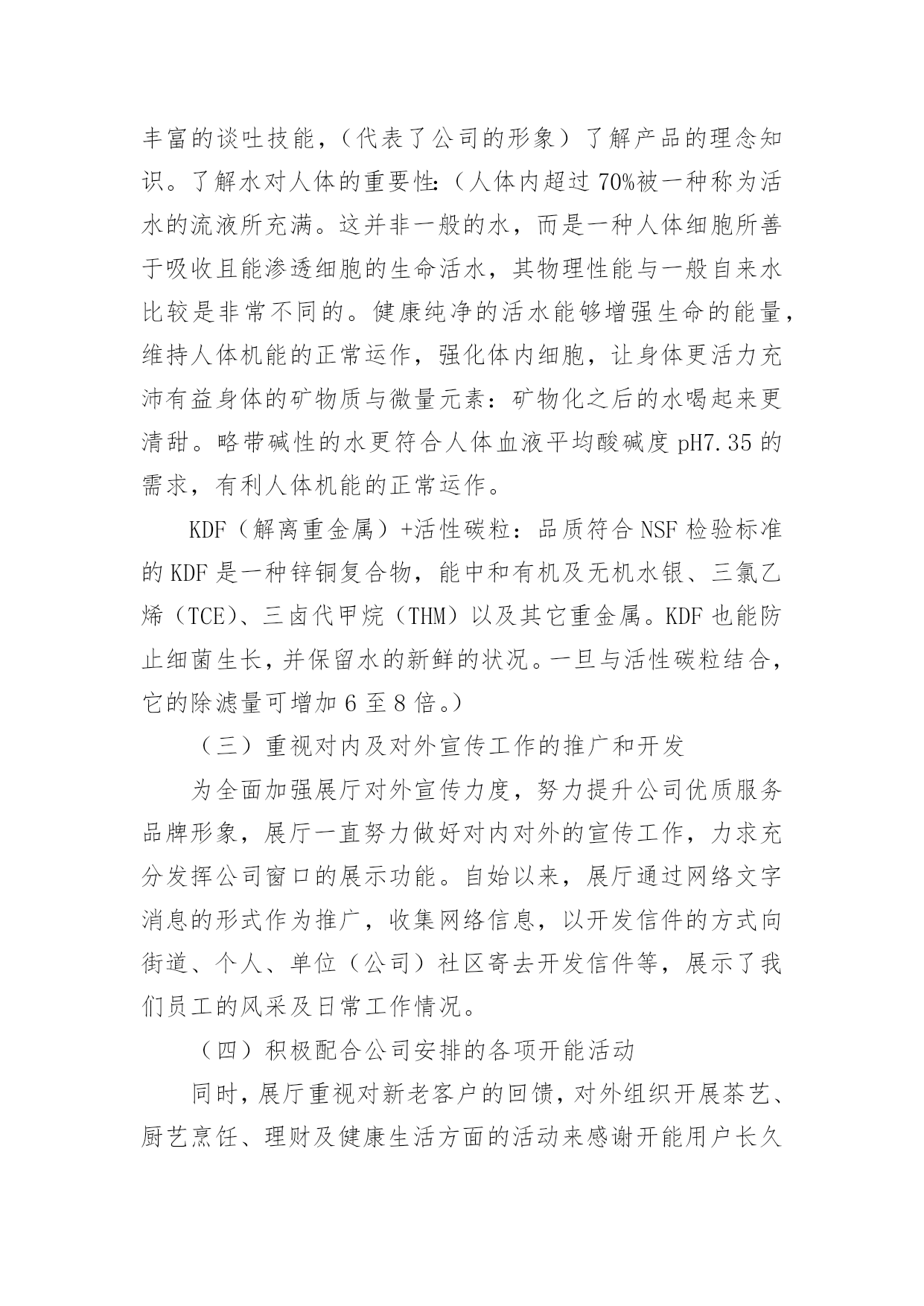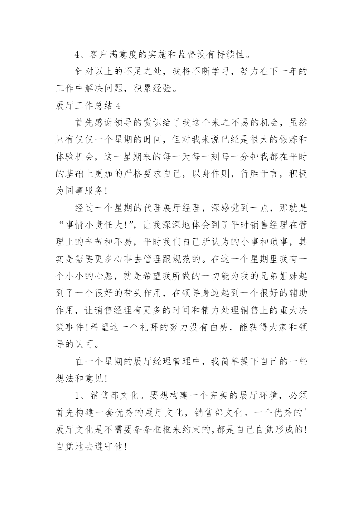 展厅工作总结展厅工作总结总结是在一段时间内对学习和工作生活等表现加以总结和概括的一种书面材料,他能够提升我们的书面表达能力,因此我们要做好归纳,写好总结。那么总结要注意有什么内容呢?以下是小编帮大家整理的展厅工作总结,仅供参考,大家一起来看看吧。展厅工作总结1转眼间,我来到4s店已经三个月了。这期间,从一个连at和mt都不知道什么意思的汽车菜鸟蜕变成熟知汽车性能的业务员。一切从零开始,一边学习专业知识,一边摸索市场,遇到销售和专业方面的难点和问题,我都及时请教有经验的同事,一起寻求解决问题的方案,在此,我非常感谢部门同事对我的帮助!也很感谢领导能给我展示自我的平台。这三个月时间,我不仅仅学会了基础的汽车知识,同时也对自己的品牌有了更深入的了解,使我深深的爱上了自己所从事的工作,自己所销售的汽车。在我心里只有热爱自己的岗位才能做好本职工作。短短的三个月时间,我明白了做汽车销售单凭自己的热爱是不够的,要学会如何进行客户谈判、分析客户情况的。这些是我一个刚入职的销售员从前所没经历过的,而我们老销售员在谈判的过程他们常常会带着我这个新人,学习谈判经验,这点我非常感谢我的同事们。所以,到现在我有难以谈的下来的客户我会吸取老销售员的谈判技巧,来进行谈判。现在汽车销售市场竞争的日益激烈,摆在所有销售人员面前的是-平稳与磨砺并存,希望与机遇并存,成功与失败并存的局面,所以拥有一个积极向上的心态是非常重要的。而我每一天应该从清晨睁开第一眼开始,每天早上我都会从自己定的欢快激进的闹铃声中醒来,然后以精神充沛、快乐的心态迎接一天的工作。如果我没有别人经验多,那么我和别人比诚信;如果我没有别人单子多,那么我和别人比服务。这些一直是我的工作态度。我相信只有这样才能把工作完成的更好。现存的缺点:对于市场的了解还是不够深入,对专业知识掌握的还是不够充分,在与客户的沟通过程中,缺乏经验。在销售工作中也有急于成交的表现,不但影响了自己销售业务的.开展,也打击了自己的自信心。我想在以后的工作中会摒弃这些不良的做法,并积极学习,请教老销售员业务知识,尽快提高自己的销售技能。20xx年工作计划公司在发展过程中,我认为要成为一名合格的销售员,首先要调整自己的理念,和公司统一思想、统一目标,明确公司的发展方向,才能充分溶入到公司的发展当中,才能更加有条不紊的开展工作。以下是我20xx年的工作计划:1.继续学习汽车的基础知识,并准确掌握市场动态各种同类竞争品牌的动态和新款车型。实时掌握汽车业的发展方向。2.与客户建立良好的合作关系,每天都建好客户信息卡,同时对于自己的意向客户务必做到实时跟进,对于自己的老客户也要定时回访。同时,在老客户的基础上能开发新的客户。让更多人知道与了解江淮车,并能亲身体验。了解客户的资料、兴趣爱好、家庭情况等,挖掘客户需求,投其所好,搞好客户关系,随时掌握信息。我在这里想说一下:我会要把c类的客户当成o类来接待,就这样我才比其他人多一个o类,多一个o类就多一个机会。对客户做到每周至少三次的回访。3.努力完成现定任务量,在公司规定的任务上,要给自己压力,要给自己设定任务。不仅仅要努力完成公司的任务,同事也完成自己给自己设定的任务。我相信有压力才有动力。4.对于日常的本职工作认真去完成,切不可偷懒,投机取巧。5.在业余时间多学习一些成功的销售经验,最后为自己所用。6.在工作中做到,胜骄败不馁,不可好大喜功,要做到一步一个脚印,踏踏实实的去做好工作,完成任务。7.意识上,无论在销售还是汽车产品知识的学习上,摒弃自私、强势、懒惰的性情,用积极向上的心态,学习他人的长处,学会谦虚,学会与上司、朋友、同事更加融洽的相处。每日工作1.卫生工作,办公室,展厅值班都要认真完成。2.每日至少回访和跟踪2到3个潜在客户,并及时跟新客户需求。3.每日做好前台值班工作,登记每位来访客户的信息。4.每日自己给自己做个工作总,回想一下每天的工作是否有没做好的,是否需要改正。5.了解实时汽车行业信息,同类竞争品牌动态。知己知彼,方能百战百胜。每周工作1.查看潜在客户,看是否有需要跟进的客户。整理每位客户的信息。2.查看自己的任务完成成了多少,还差多少量。下周给自己多少任务。月工作任务1.总当月的客户成交量,客户战败原因。2.总当月自己的过失和做的比较好的地方。3.制定下个月自己给自己的任务和工作计划。最后,感谢公司给我一个展示自我能力的平台,我会严格遵守职业操守,朝着优秀员工的方向勇往直前。碰到困难不屈不挠,取其精华,去其糟粕,和公司的其他同事团协作,让团队精神战胜一切。展厅工作总结2在这辞旧迎新之际,回顾并总结20xx年过去的一年在公司领导的带领下,在同事的支持和帮助下,努力完成了本职工作任务,对我个人这一年来的工作和学习情况做以下个人工作总结:首先进入一个新的行业,每个