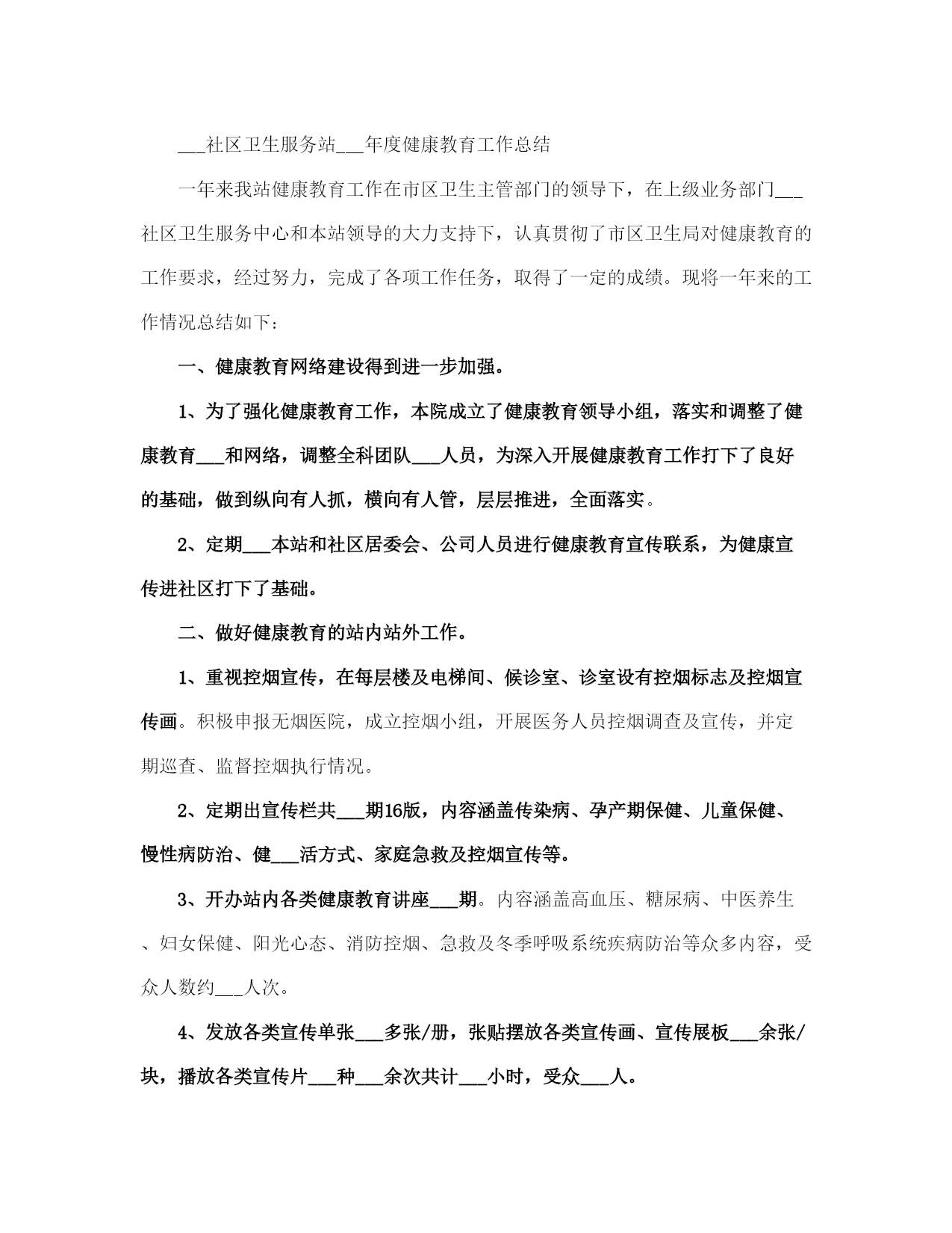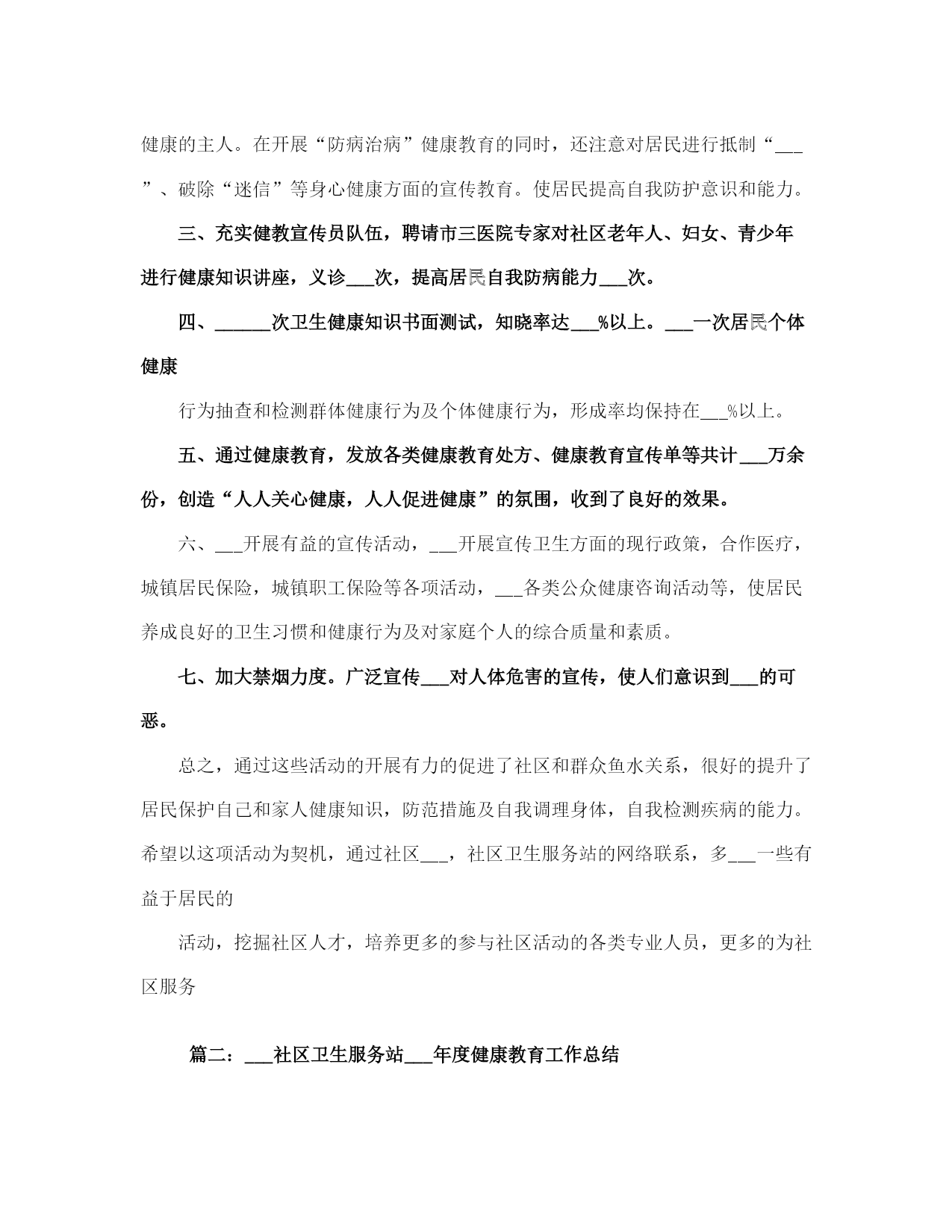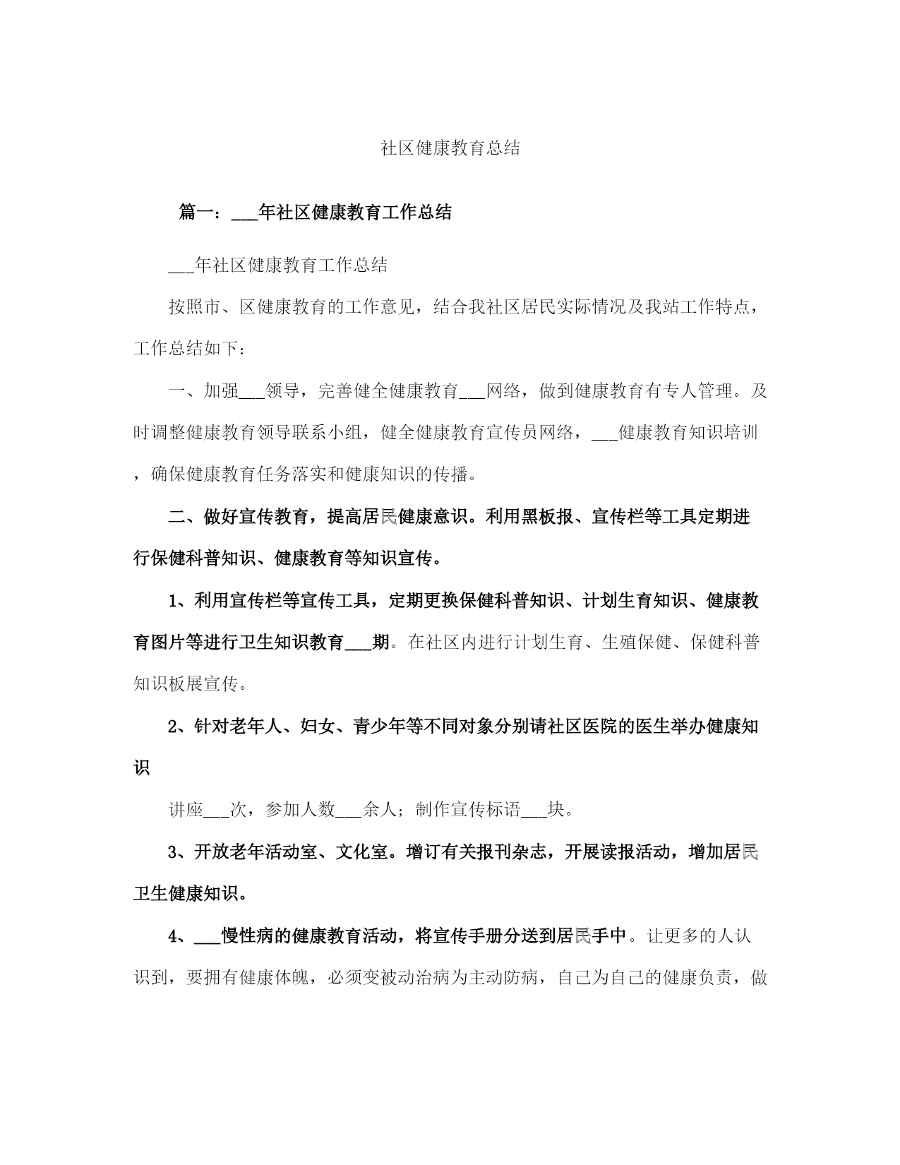 社区健康教育总结范文(完整版)文档资料可直接使用,可编辑,欢迎下载社区健康教育总结篇一:___年社区健康教育工作总结___年社区健康教育工作总结按照市、区健康教育的工作意见,结合我社区居民实际情况及我站工作特点,工作总结如下:一、加强___领导,完善健全健康教育___网络,做到健康教育有专人管理。及时调整健康教育领导联系小组,健全健康教育宣传员网络,___健康教育知识培训,确保健康教育任务落实和健康知识的传播。二、做好宣传教育,提高居民健康意识。利用黑板报、宣传栏等工具定期进行保健科普知识、健康教育等知识宣传。1、利用宣传栏等宣传工具,定期更换保健科普知识、计划生育知识、健康教育图片等进行卫生知识教育___期。在社区内进行计划生育、生殖保健、保健科普知识板展宣传。2、针对老年人、妇女、青少年等不同对象分别请社区医院的医生举办健康知识讲座___次,参加人数___余人;制作宣传标语___块。3、开放老年活动室、文化室。增订有关报刊杂志,开展读报活动,增加居民卫生健康知识。4、___慢性病的健康教育活动,将宣传手册分送到居民手中。让更多的人认识到,要拥有健康体魄,必须变被动治病为主动防病,自己为自己的健康负责,做健康的主人。在开展“防病治病”健康教育的同时,还注意对居民进行抵制“___”、破除“迷信”等身心健康方面的宣传教育。使居民提高自我防护意识和能力。三、充实健教宣传员队伍,聘请市三医院专家对社区老年人、妇女、青少年进行健康知识讲座,义诊___次,提高居民自我防病能力___次。四、______次卫生健康知识书面测试,知晓率达___%以上。___一次居民个体健康行为抽查和检测群体健康行为及个体健康行为,形成率均保持在___%以上。五、通过健康教育,发放各类健康教育处方、健康教育宣传单等共计___万余份,创造“人人关心健康,人人促进健康”的氛围,收到了良好的效果。六、___开展有益的宣传活动,___开展宣传卫生方面的现行政策,合作医疗,城镇居民保险,城镇职工保险等各项活动,___各类公众健康咨询活动等,使居民养成良好的卫生习惯和健康行为及对家庭个人的综合质量和素质。七、加大禁烟力度。广泛宣传___对人体危害的宣传,使人们意识到___的可恶。总之,通过这些活动的开展有力的促进了社区和群众鱼水关系,很好的提升了居民保护自己和家人健康知识,防范措施及自我调理身体,自我检测疾病的能力。希望以这项活动为契机,通过社区___,社区卫生服务站的网络联系,多___一些有益于居民的活动,挖掘社区人才,培养更多的参与社区活动的各类专业人员,更多的为社区服务篇二:___社区卫生服务站___年度健康教育工作总结___社区卫生服务站___年度健康教育工作总结一年来我站健康教育工作在市区卫生主管部门的领导下,在上级业务部门___社区卫生服务中心和本站领导的大力支持下,认真贯彻了市区卫生局对健康教育的工作要求,经过努力,完成了各项工作任务,取得了一定的成绩。现将一年来的工作情况总结如下:一、健康教育网络建设得到进一步加强。1、为了强化健康教育工作,本院成立了健康教育领导小组,落实和调整了健康教育___和网络,调整全科团队___人员,为深入开展健康教育工作打下了良好的基础,做到纵向有人抓,横向有人管,层层推进,全面落实。2、定期___本站和社区居委会、公司人员进行健康教育宣传联系,为健康宣传进社区打下了基础。二、做好健康教育的站内站外工作。1、重视控烟宣传,在每层楼及电梯间、候诊室、诊室设有控烟标志及控烟宣传画。积极申报无烟医院,成立控烟小组,开展医务人员控烟调查及宣传,并定期巡查、监督控烟执行情况。2、定期出宣传栏共___期16版,内容涵盖传染病、孕产期保健、儿童保健、慢性病防治、健___活方式、家庭急救及控烟宣传等。3、开办站内各类健康教育讲座___期。内容涵盖高血压、糖尿病、中医养生、妇女保健、阳光心态、消防控烟、急救及冬季呼吸系统疾病防治等众多内容,受众人数约___人次。4、发放各类宣传单张___多张/册,张贴摆放各类宣传画、宣传展板___余张/块,播放各类宣传片___种___余次共计___小时,受众___人。5、对本院及本社区卫生站工作人员定期进行健康教育培训___次共计___人次。6、利用世界防治结核病日、全国爱国卫生月、全国儿童预防接种日、世界无烟日、国际三八妇女节、糖尿病日、世界艾滋病日等各种健康主题日和重要节日,深入社区、学校、幼儿园、公司开展健康宣传、义诊咨询等共___次,受众人群___人次。7、开展个体化健康教育人次___人次。健康教育文体活动___次。8、继续发挥导医台的作用医院大厅导医台设健康教育资料取阅台,每周定期整理,将各种健康教育资料摆放其中,供居民免费自由索取