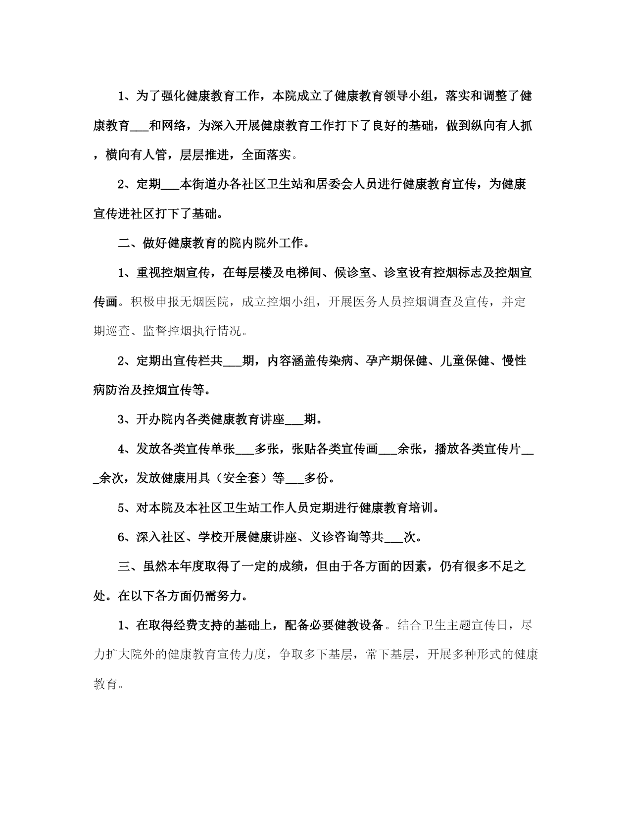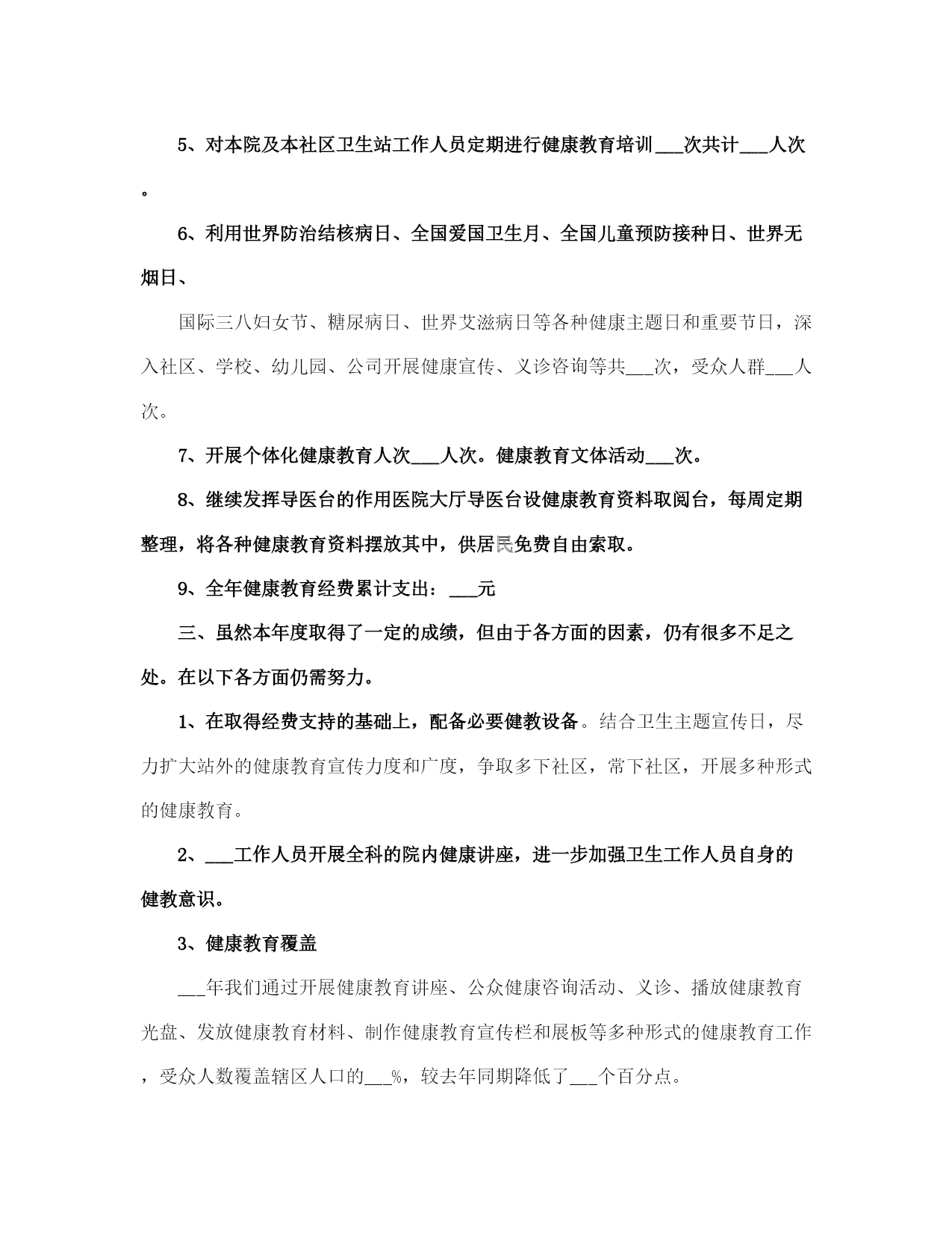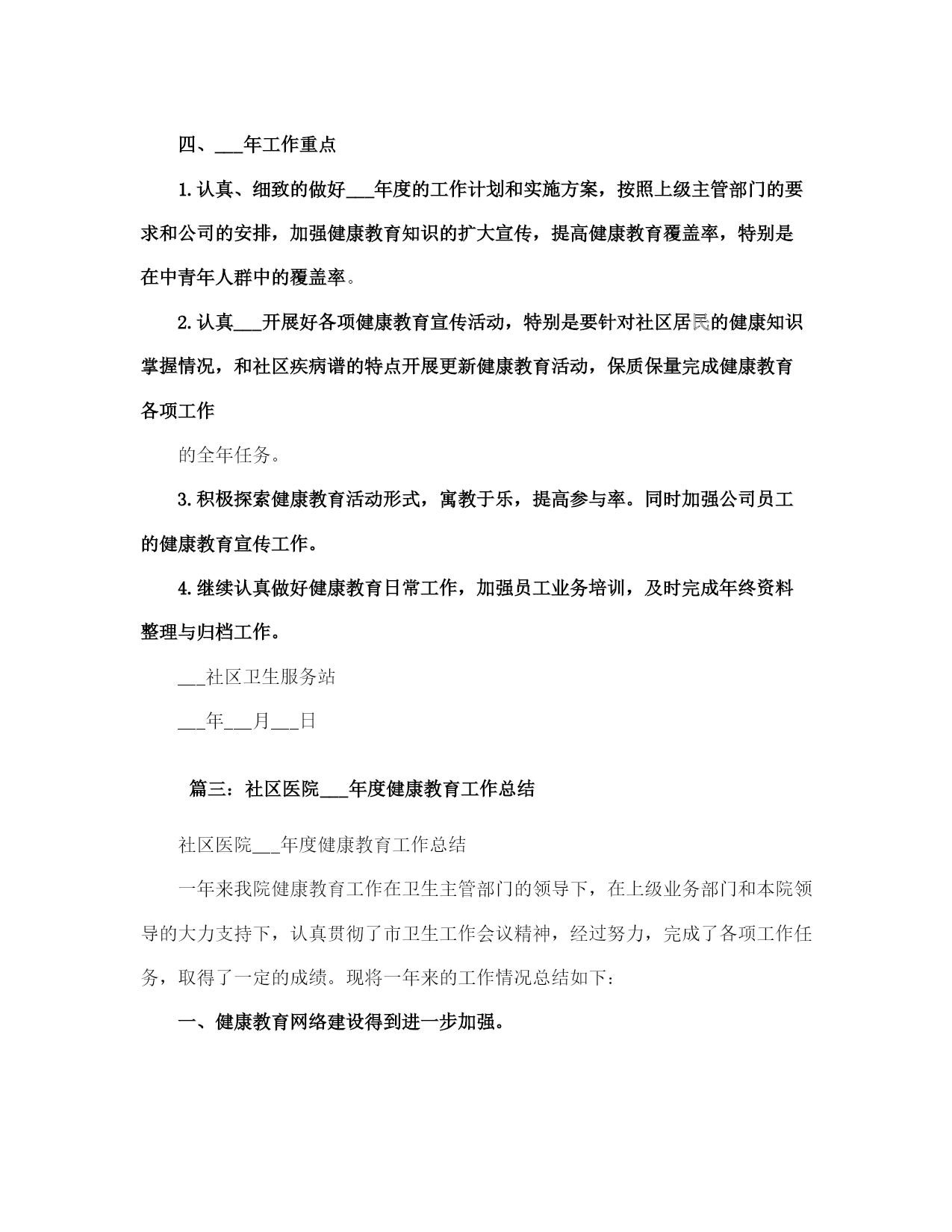 社区健康教育总结范文(完整版)文档资料可直接使用,可编辑,欢迎下载社区健康教育总结篇一:___年社区健康教育工作总结___年社区健康教育工作总结按照市、区健康教育的工作意见,结合我社区居民实际情况及我站工作特点,工作总结如下:一、加强___领导,完善健全健康教育___网络,做到健康教育有专人管理。及时调整健康教育领导联系小组,健全健康教育宣传员网络,___健康教育知识培训,确保健康教育任务落实和健康知识的传播。二、做好宣传教育,提高居民健康意识。利用黑板报、宣传栏等工具定期进行保健科普知识、健康教育等知识宣传。1、利用宣传栏等宣传工具,定期更换保健科普知识、计划生育知识、健康教育图片等进行卫生知识教育___期。在社区内进行计划生育、生殖保健、保健科普知识板展宣传。2、针对老年人、妇女、青少年等不同对象分别请社区医院的医生举办健康知识讲座___次,参加人数___余人;制作宣传标语___块。3、开放老年活动室、文化室。增订有关报刊杂志,开展读报活动,增加居民卫生健康知识。4、___慢性病的健康教育活动,将宣传手册分送到居民手中。让更多的人认识到,要拥有健康体魄,必须变被动治病为主动防病,自己为自己的健康负责,做健康的主人。在开展“防病治病”健康教育的同时,还注意对居民进行抵制“___”、破除“迷信”等身心健康方面的宣传教育。使居民提高自我防护意识和能力。三、充实健教宣传员队伍,聘请市三医院专家对社区老年人、妇女、青少年进行健康知识讲座,义诊___次,提高居民自我防病能力___次。四、______次卫生健康知识书面测试,知晓率达___%以上。___一次居民个体健康行为抽查和检测群体健康行为及个体健康行为,形成率均保持在___%以上。五、通过健康教育,发放各类健康教育处方、健康教育宣传单等共计___万余份,创造“人人关心健康,人人促进健康”的氛围,收到了良好的效果。六、___开展有益的宣传活动,___开展宣传卫生方面的现行政策,合作医疗,城镇居民保险,城镇职工保险等各项活动,___各类公众健康咨询活动等,使居民养成良好的卫生习惯和健康行为及对家庭个人的综合质量和素质。七、加大禁烟力度。广泛宣传___对人体危害的宣传,使人们意识到___的可恶。总之,通过这些活动的开展有力的促进了社区和群众鱼水关系,很好的提升了居民保护自己和家人健康知识,防范措施及自我调理身体,自我检测疾病的能力。希望以这项活动为契机,通过社区___,社区卫生服务站的网络联系,多___一些有益于居民的活动,挖掘社区人才,培养更多的参与社区活动的各类专业人员,更多的为社区服务篇二:___社区卫生服务站___年度健康教育工作总结___社区卫生服务站___年度健康教育工作总结一年来我站健康教育工作在市区卫生主管部门的领导下,在上级业务部门___社区卫生服务中心和本站领导的大力支持下,认真贯彻了市区卫生局对健康教育的工作要求,经过努力,完成了各项工作任务,取得了一定的成绩。现将一年来的工作情况总结如下:一、健康教育网络建设得到进一步加强。1、为了强化健康教育工作,本院成立了健康教育领导小组,落实和调整了健康教育___和网络,调整全科团队___人员,为深入开展健康教育工作打下了良好的基础,做到纵向有人抓,横向有人管,层层推进,全面落实。2、定期___本站和社区居委会、公司人员进行健康教育宣传联系,为健康宣传进社区打下了基础。二、做好健康教育的站内站外工作。1、重视控烟宣传,在每层楼及电梯间、候诊室、诊室设有控烟标志及控烟宣传画。积极申报无烟医院,成立控烟小组,开展医务人员控烟调查及宣传,并定期巡查、监督控烟执行情况。2、定期出宣传栏共___期16版,内容涵盖传染病、孕产期保健、儿童保健、慢性病防治、健___活方式、家庭急救及控烟宣传等。3、开办站内各类健康教育讲座___期。内容涵盖高血压、糖尿病、中医养生、妇女保健、阳光心态、消防控烟、急救及冬季呼吸系统疾病防治等众多内容,受众人数约___人次。4、发放各类宣传单张___多张/册,张贴摆放各类宣传画、宣传展板___余张/块,播放各类宣传片___种___余次共计___小时,受众___人。5、对本院及本社区卫生站工作人员定期进行健康教育培训___次共计___人次。6、利用世界防治结核病日、全国爱国卫生月、全国儿童预防接种日、世界无烟日、国际三八妇女节、糖尿病日、世界艾滋病日等各种健康主题日和重要节日,深入社区、学校、幼儿园、公司开展健康宣传、义诊咨询等共___次,受众人群___人次。7、开展个体化健康教育人次___人次。健康教育文体活动___次。8、继续发挥导医台的作用医院大厅导医台设健康教育资料取阅台,每周定期整理,将各种健康教育资料摆放其中,供居民免费自由索取