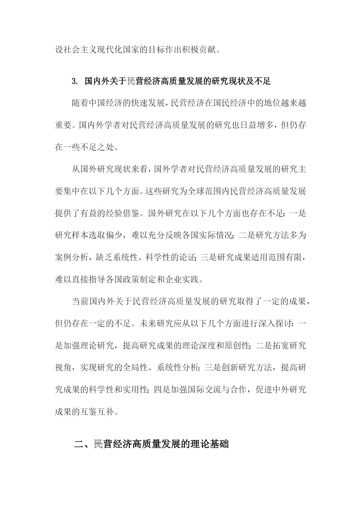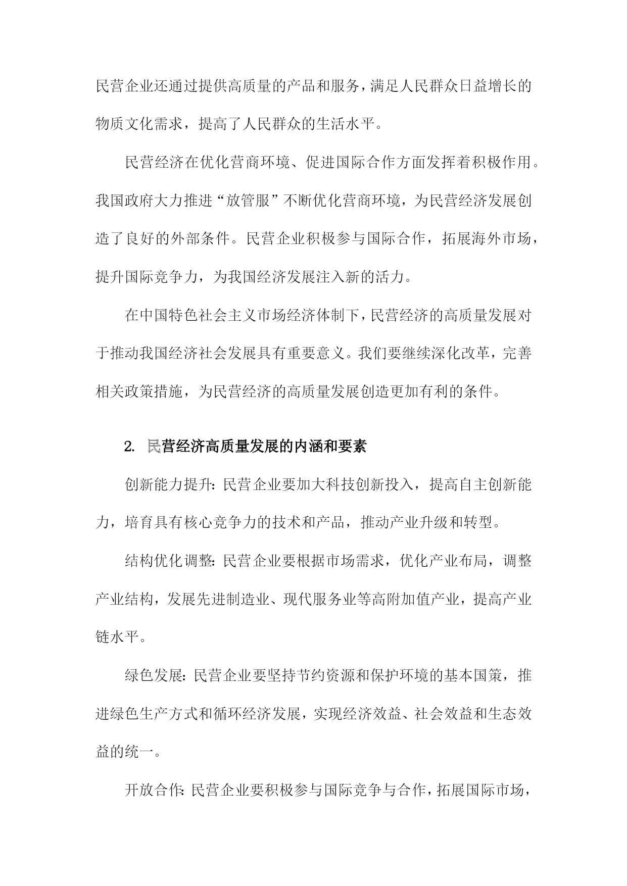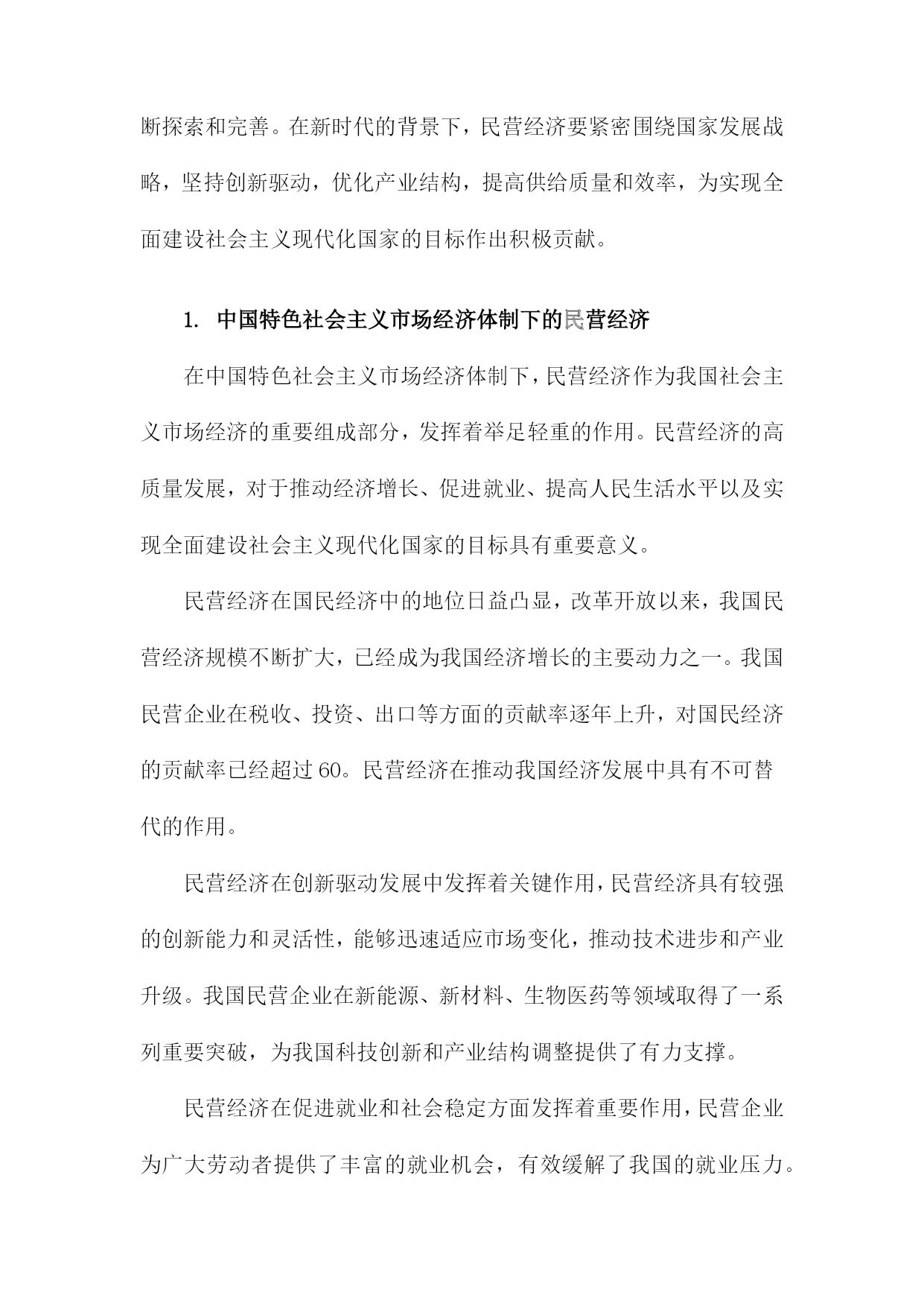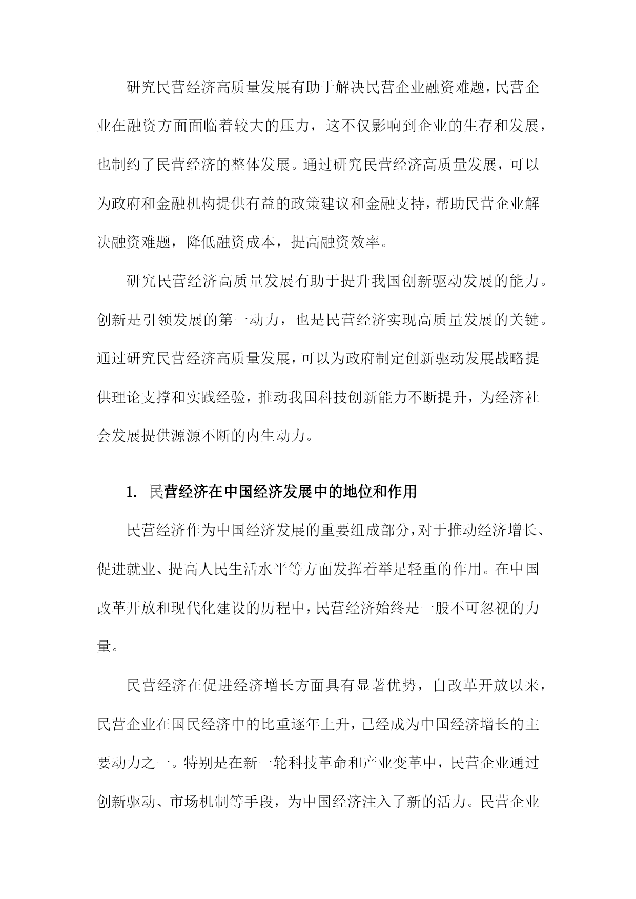 民营经济高质量发展研究一、研究背景和意义随着我国改革开放的深入推进,民营经济已经成为国民经济的重要组成部分,对于促进经济增长、增加就业、提高人民生活水平等方面发挥着举足轻重的作用。当前我国民营经济发展面临一系列挑战,如市场竞争加剧、创新能力不足、融资难题等,这些问题制约了民营经济的高质量发展。深入研究民营经济高质量发展的路径和机制,对于推动我国经济社会持续健康发展具有重要的现实意义。研究民营经济高质量发展有助于更好地发挥市场在资源配置中的决定性作用。民营经济是我国市场经济体制的重要支柱,其发展水平的高低直接影响到市场活力和社会效益。通过研究民营经济高质量发展,可以为政府制定更加科学合理的政策提供依据,进一步激发市场活力,提高资源配置效率。研究民营经济高质量发展有助于提升我国产业结构的优化升级。民营经济在我国产业链中占据重要地位,其发展水平的高低直接影响到产业结构的优化升级。通过研究民营经济高质量发展,可以为政府制定产业政策提供参考,推动产业结构向高端化、智能化、绿色化方向发展,提高我国产业国际竞争力。研究民营经济高质量发展有助于解决民营企业融资难题,民营企业在融资方面面临着较大的压力,这不仅影响到企业的生存和发展,也制约了民营经济的整体发展。通过研究民营经济高质量发展,可以为政府和金融机构提供有益的政策建议和金融支持,帮助民营企业解决融资难题,降低融资成本,提高融资效率。研究民营经济高质量发展有助于提升我国创新驱动发展的能力。创新是引领发展的第一动力,也是民营经济实现高质量发展的关键。通过研究民营经济高质量发展,可以为政府制定创新驱动发展战略提供理论支撑和实践经验,推动我国科技创新能力不断提升,为经济社会发展提供源源不断的内生动力。1.民营经济在中国经济发展中的地位和作用民营经济作为中国经济发展的重要组成部分,对于推动经济增长、促进就业、提高人民生活水平等方面发挥着举足轻重的作用。在中国改革开放和现代化建设的历程中,民营经济始终是一股不可忽视的力量。民营经济在促进经济增长方面具有显著优势,自改革开放以来,民营企业在国民经济中的比重逐年上升,已经成为中国经济增长的主要动力之一。特别是在新一轮科技革命和产业变革中,民营企业通过创新驱动、市场机制等手段,为中国经济注入了新的活力。民营企业还积极参与国际市场竞争,拓展对外贸易,为中国经济发展创造了更多机遇。民营经济在促进就业方面发挥着重要作用,中国民营企业吸纳的就业人数占全国城镇就业人口的相当大比例,为广大劳动者提供了丰富的就业机会。特别是在近年来,随着中国经济结构的调整和产业升级,民营企业在高技术产业、现代服务业等领域的发展迅速,为解决就业问题提供了有力支持。民营经济在提高人民生活水平方面发挥着关键作用,民营企业通过提供多样化的产品和服务,满足了人民群众日益增长的物质文化需求。特别是在消费品、健康养老、教育培训等领域,民营企业不断创新和发展,为提高人民生活质量作出了积极贡献。民营经济在推动社会和谐稳定方面也发挥着重要作用,民营企业作为市场主体,通过竞争机制激发企业活力,有利于优化资源配置、提高经济效益。民营企业还积极参与公益事业和社会建设,为构建和谐社会作出了积极贡献。民营经济在中国经济发展中具有重要地位和作用,在新时代背景下,我们要继续深化改革,优化营商环境,支持民营企业发展壮大,为实现全面建设社会主义现代化国家的目标作出更大贡献。2.民营经济高质量发展的重要性和必要性优化经济结构,提高经济增长质量。民营经济在国民经济中占据重要地位,其高质量发展有助于优化产业结构,提高全要素生产率,从而提高经济增长质量。通过发展高新技术产业、现代服务业等新兴产业,推动传统产业转型升级,实现经济结构的优化升级。促进就业和社会稳定。民营经济是吸纳劳动力资源的重要渠道,高质量发展有助于解决就业问题,提高人民群众的生活水平。民营经济的发展也有利于增加税收收入,为国家提供财政支持,进一步保障社会稳定。激发创新活力,提升国际竞争力。民营经济具有较强的创新能力和灵活性,高质量发展有助于激发企业创新活力,推动科技创新和产业创新。通过提升企业的核心竞争力,增强国际市场开拓能力,提高在全球产业链中的地位,为国家经济发展注入新的活力。完善社会主义市场经济体制。民营经济的发展有助于完善社会主义市场经济体制,推动资源配置更加市场化、法治化。通过深化国有企业改革、混合所有制改革等措施,实现公有制与非公有制的有机融合,促进各类市场主体共同发展。民营经济高质量发展对于推动经济社会发展具有重要意义,在新时代的背景下,我们要深入贯彻落实习近平新时代中国特色社会主义思想,坚定不移地发展民营经济,推动其高质量发展,为实现全面建设社会主义现代化国家的目标作出积极贡献。3.国内外关于民营经济高质量发展