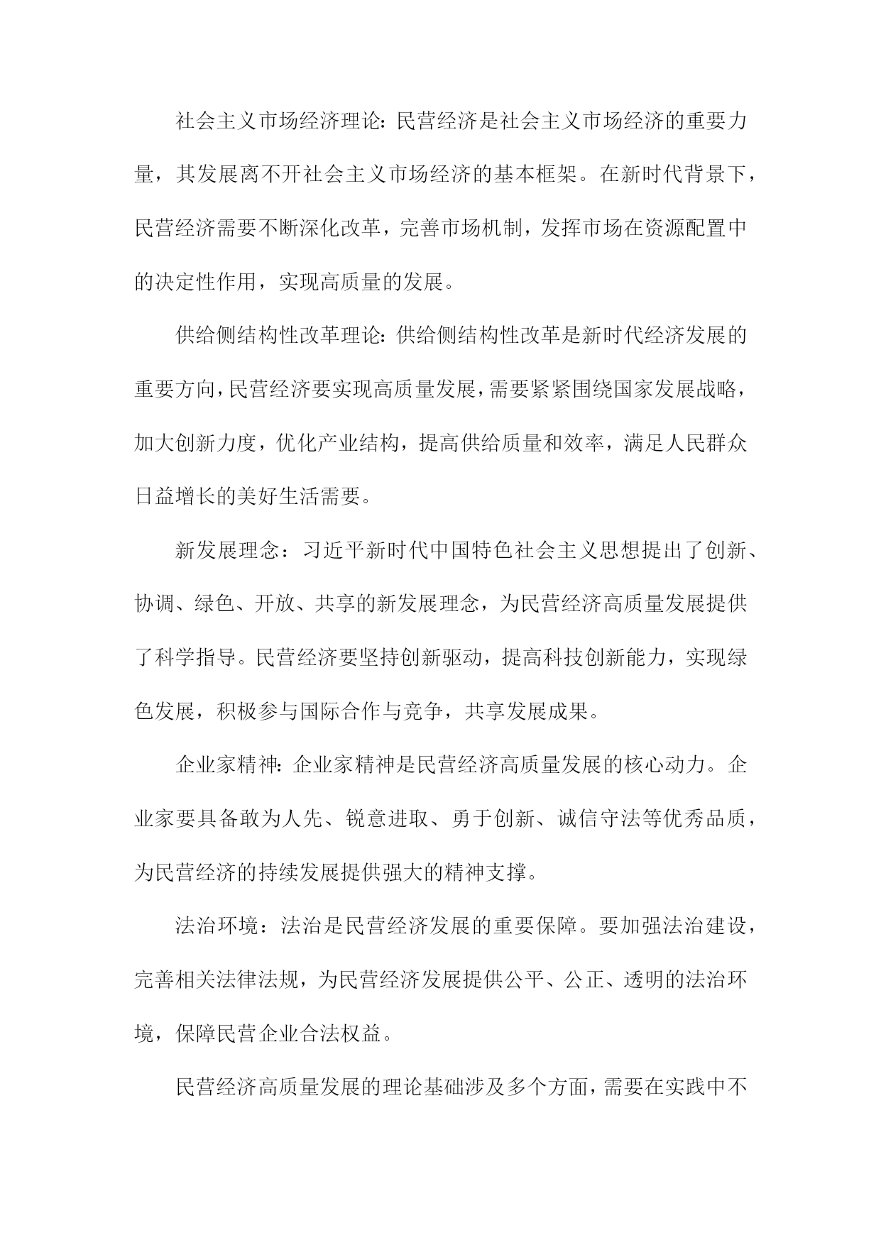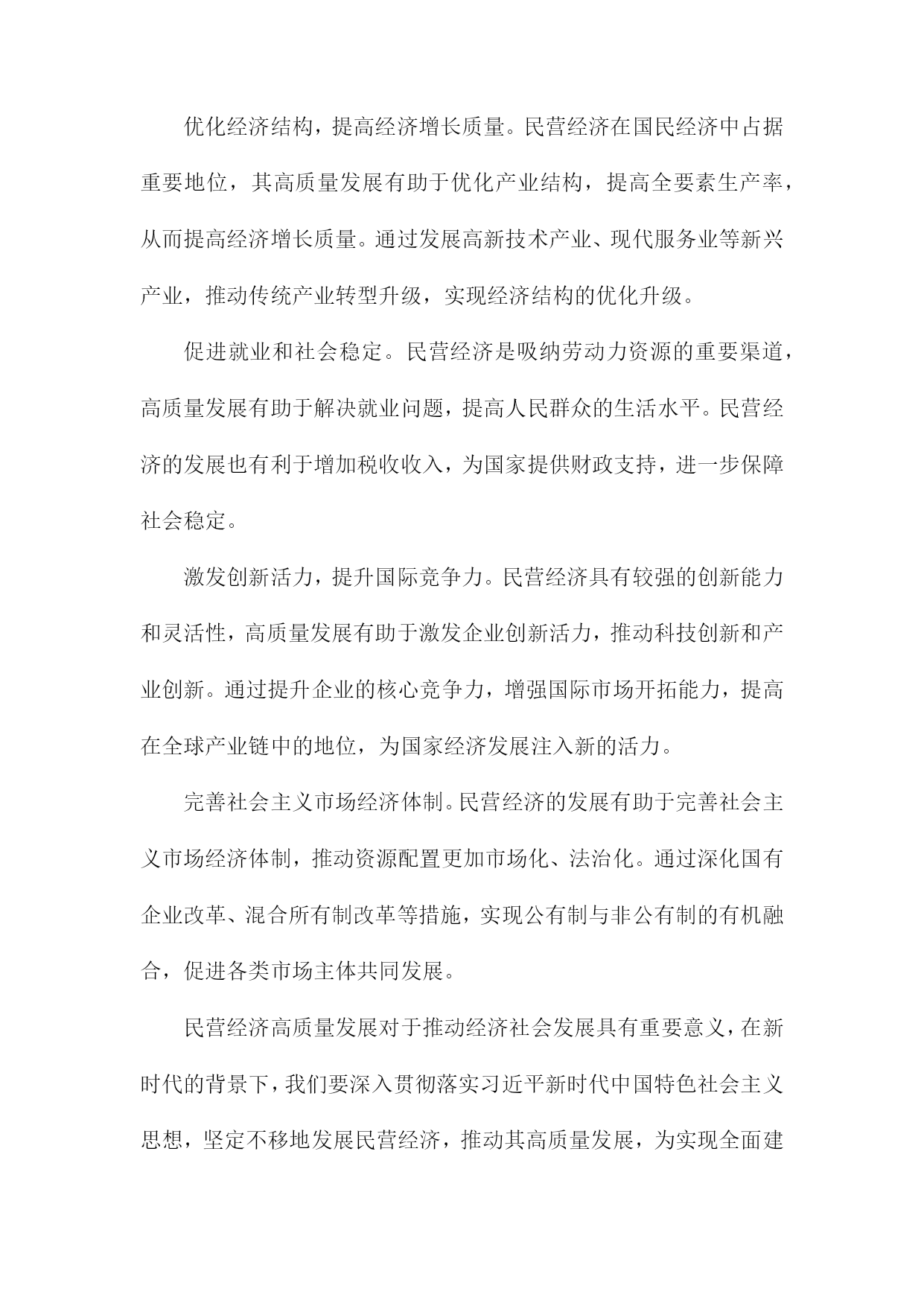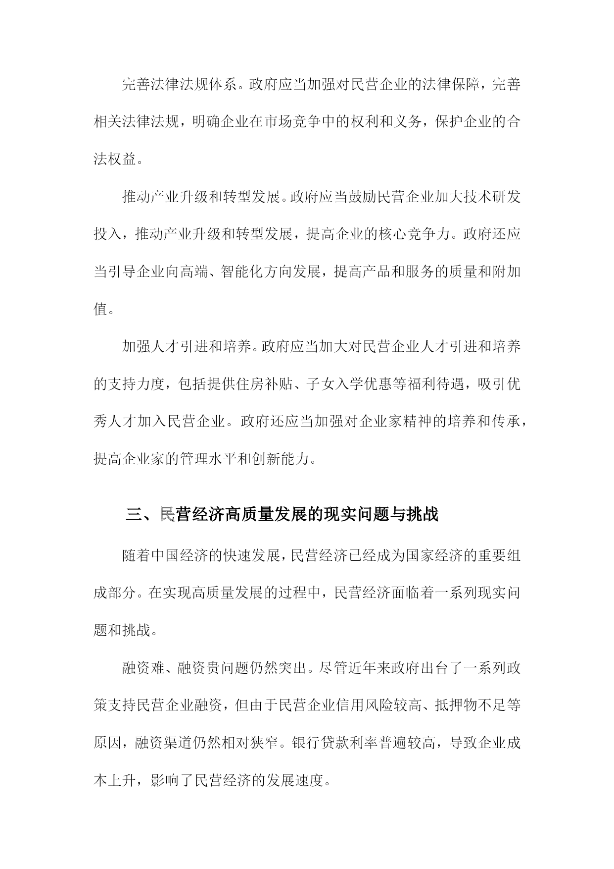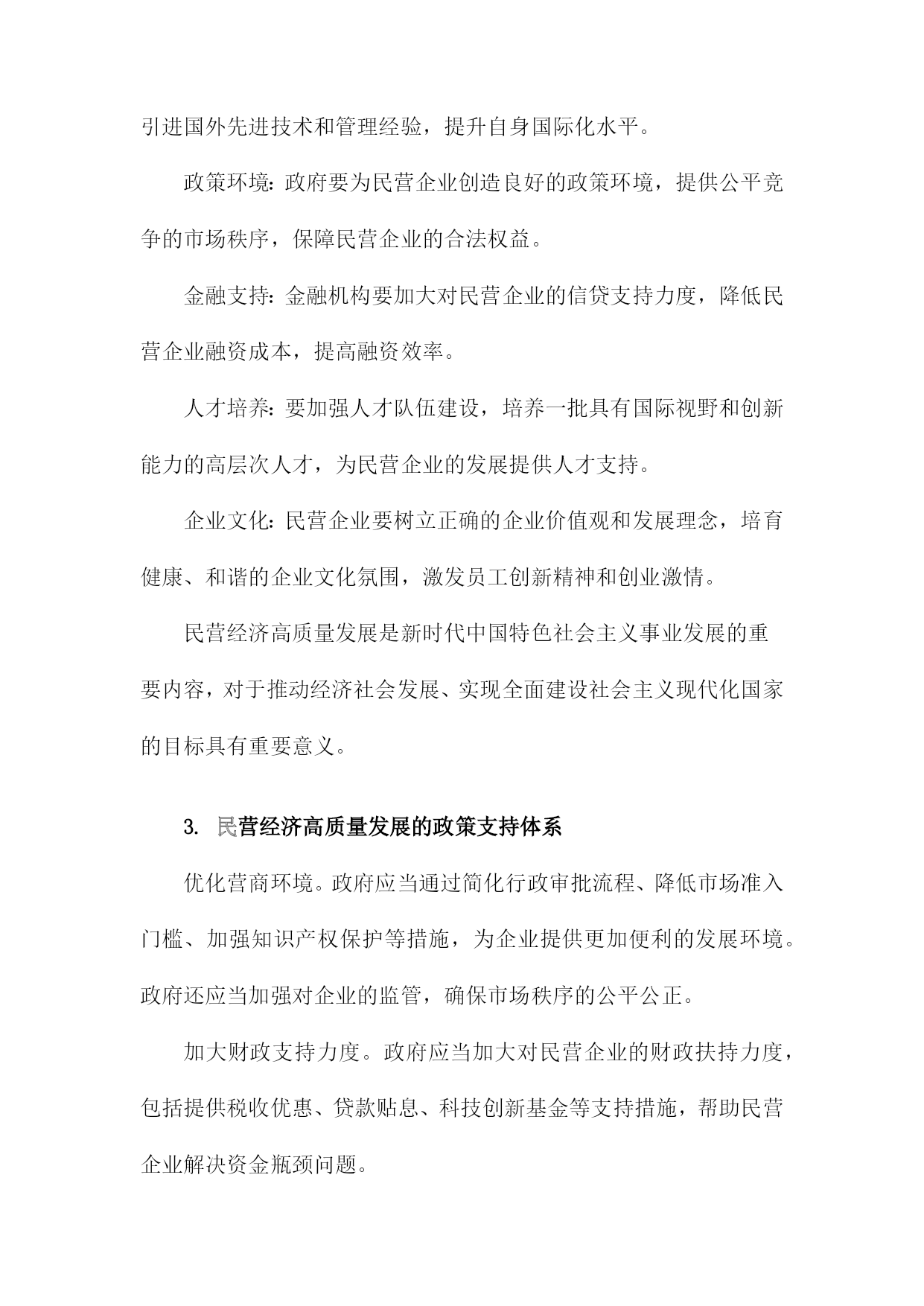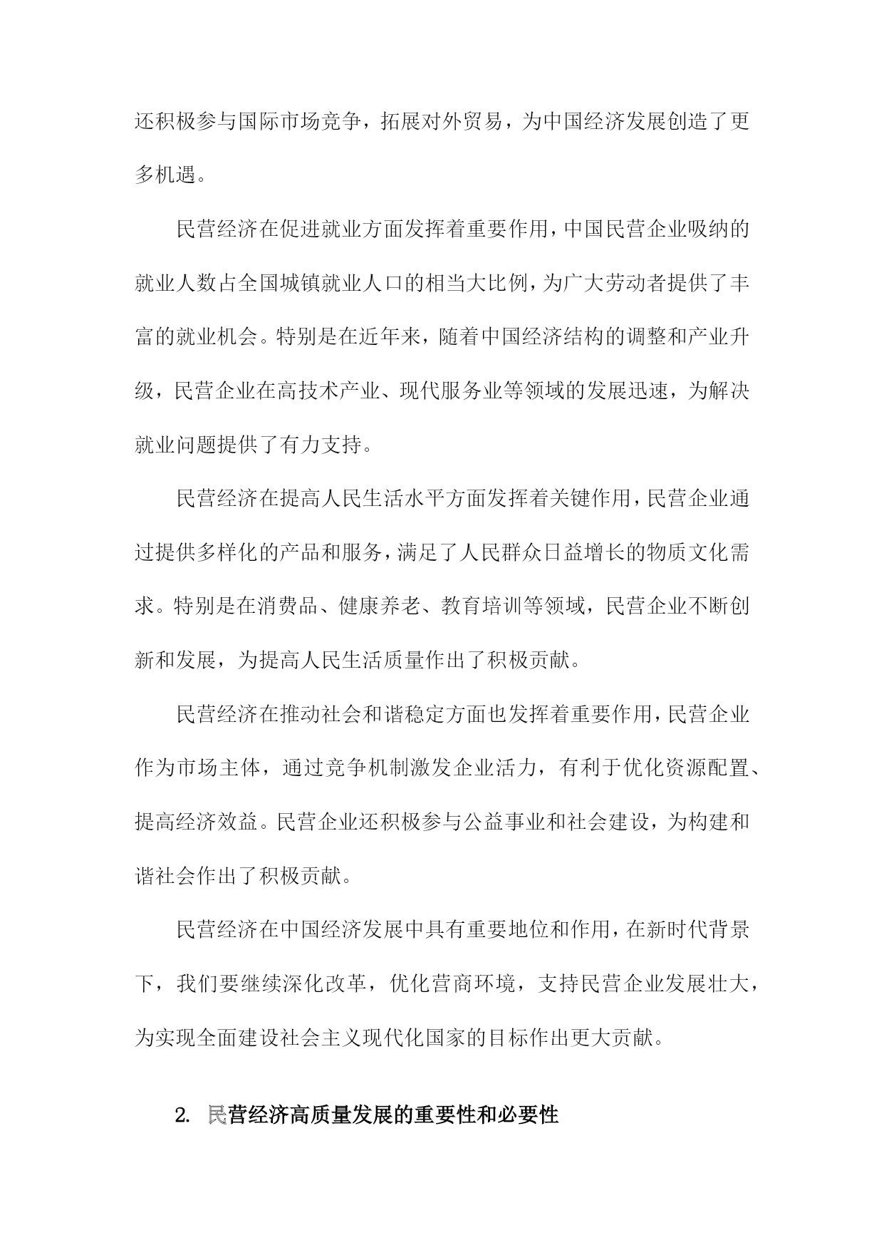 民营经济高质量发展研究一、研究背景和意义随着我国改革开放的深入推进,民营经济已经成为国民经济的重要组成部分,对于促进经济增长、增加就业、提高人民生活水平等方面发挥着举足轻重的作用。当前我国民营经济发展面临一系列挑战,如市场竞争加剧、创新能力不足、融资难题等,这些问题制约了民营经济的高质量发展。深入研究民营经济高质量发展的路径和机制,对于推动我国经济社会持续健康发展具有重要的现实意义。研究民营经济高质量发展有助于更好地发挥市场在资源配置中的决定性作用。民营经济是我国市场经济体制的重要支柱,其发展水平的高低直接影响到市场活力和社会效益。通过研究民营经济高质量发展,可以为政府制定更加科学合理的政策提供依据,进一步激发市场活力,提高资源配置效率。研究民营经济高质量发展有助于提升我国产业结构的优化升级。民营经济在我国产业链中占据重要地位,其发展水平的高低直接影响到产业结构的优化升级。通过研究民营经济高质量发展,可以为政府制定产业政策提供参考,推动产业结构向高端化、智能化、绿色化方向发展,提高我国产业国际竞争力。研究民营经济高质量发展有助于解决民营企业融资难题,民营企业在融资方面面临着较大的压力,这不仅影响到企业的生存和发展,也制约了民营经济的整体发展。通过研究民营经济高质量发展,可以为政府和金融机构提供有益的政策建议和金融支持,帮助民营企业解决融资难题,降低融资成本,提高融资效率。研究民营经济高质量发展有助于提升我国创新驱动发展的能力。创新是引领发展的第一动力,也是民营经济实现高质量发展的关键。通过研究民营经济高质量发展,可以为政府制定创新驱动发展战略提供理论支撑和实践经验,推动我国科技创新能力不断提升,为经济社会发展提供源源不断的内生动力。1.民营经济在中国经济发展中的地位和作用民营经济作为中国经济发展的重要组成部分,对于推动经济增长、促进就业、提高人民生活水平等方面发挥着举足轻重的作用。在中国改革开放和现代化建设的历程中,民营经济始终是一股不可忽视的力量。民营经济在促进经济增长方面具有显著优势,自改革开放以来,民营企业在国民经济中的比重逐年上升,已经成为中国经济增长的主要动力之一。特别是在新一轮科技革命和产业变革中,民营企业通过创新驱动、市场机制等手段,为中国经济注入了新的活力。民营企业还积极参与国际市场竞争,拓展对外贸易,为中国经济发展创造了更多机遇。民营经济在促进就业方面发挥着重要作用,中国民营企业吸纳的就业人数占全国城镇就业人口的相当大比例,为广大劳动者提供了丰富的就业机会。特别是在近年来,随着中国经济结构的调整和产业升级,民营企业在高技术产业、现代服务业等领域的发展迅速,为解决就业问题提供了有力支持。民营经济在提高人民生活水平方面发挥着关键作用,民营企业通过提供多样化的产品和服务,满足了人民群众日益增长的物质文化需求。特别是在消费品、健康养老、教育培训等领域,民营企业不断创新和发展,为提高人民生活质量作出了积极贡献。民营经济在推动社会和谐稳定方面也发挥着重要作用,民营企业作为市场主体,通过竞争机制激发企业活力,有利于优化资源配置、提高经济效益。民营企业还积极参与公益事业和社会建设,为构建和谐社会作出了积极贡献。民营经济在中国经济发展中具有重要地位和作用,在新时代背景下,我们要继续深化改革,优化营商环境,支持民营企业发展壮大,为实现全面建设社会主义现代化国家的目标作出更大贡献。2.民营经济高质量发展的重要性和必要性优化经济结构,提高经济增长质量。民营经济在国民经济中占据重要地位,其高质量发展有助于优化产业结构,提高全要素生产率,从而提高经济增长质量。通过发展高新技术产业、现代服务业等新兴产业,推动传统产业转型升级,实现经济结构的优化升级。促进就业和社会稳定。民营经济是吸纳劳动力资源的重要渠道,高质量发展有助于解决就业问题,提高人民群众的生活水平。民营经济的发展也有利于增加税收收入,为国家提供财政支持,进一步保障社会稳定。激发创新活力,提升国际竞争力。民营经济具有较强的创新能力和灵活性,高质量发展有助于激发企业创新活力,推动科技创新和产业创新。通过提升企业的核心竞争力,增强国际市场开拓能力,提高在全球产业链中的地位,为国家经济发展注入新的活力。完善社会主义市场经济体制。民营经济的发展有助于完善社会主义市场经济体制,推动资源配置更加市场化、法治化。通过深化国有企业改革、混合所有制改革等措施,实现公有制与非公有制的有机融合,促进各类市场主体共同发展。民营经济高质量发展对于推动经济社会发展具有重要意义,在新时代的背景下,我们要深入贯彻落实习近平新时代中国特色社会主义思想,坚定不移地发展民营经济,推动其高质量发展,为实现全面建设社会主义现代化国家的目标作出积极贡献。3.国内外关于民营经济高质量发展