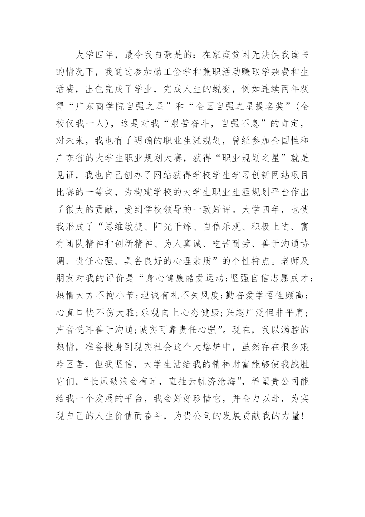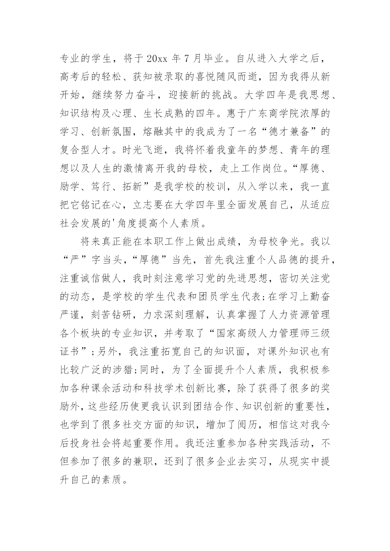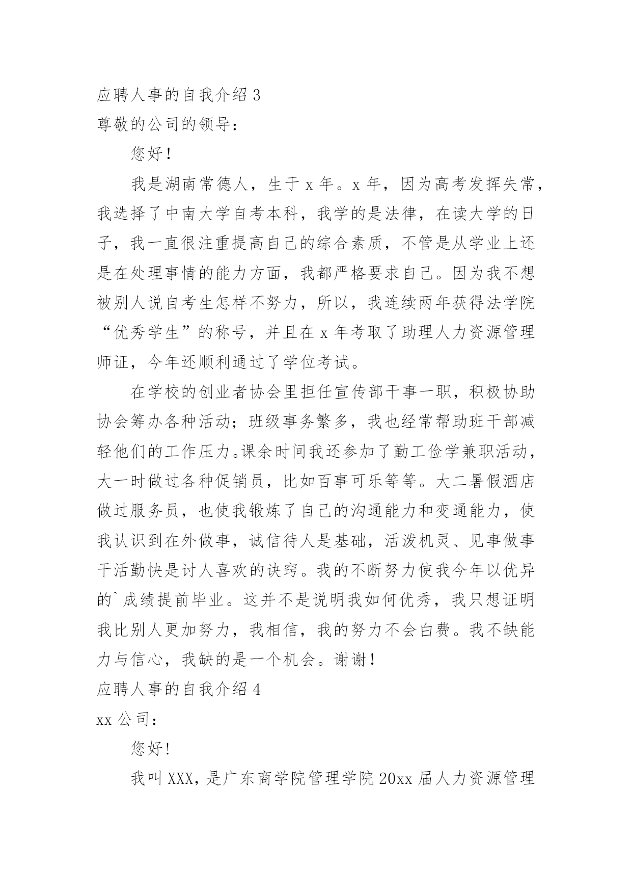 应聘人事的自我介绍应聘人事的自我介绍来到一个完全陌生的环境,需要我们进行自我介绍,自我介绍是结识新朋友的重要手段。写自我介绍时总是没有新意?以下是小编收集整理的应聘人事的自我介绍,希望能够帮助到大家。应聘人事的自我介绍1尊敬的XX领导:您好!我是2XX届应届毕业生,大学所学专业是人力资源管理,四年当中,我全面系统的学习了本专业的理论知识,体会到了每个关键知识点的精髓,除此之外,我十分注重理论与实践的结合,除了考取专业其他相关证书外,我积极参加学校各种社团组织活动,不断锻炼提升自己与人交际的能力和组织管理能力。》济宁招聘》宿迁招聘在校外,我常利用假期做各种兼职,锻炼自己在社会上生存适应社会的能力。在工作中,我态度积极,独立完成工作能力强,而且我有非常好的团队精神和敬业乐业精神;我相信没有最好只有更好,在工作中,我追求做更好的自己,把工作做得比昨天更好,比上一次更好。我的扎实的专业知识以及很强实际动手操作能力,和贵公司的要求相符,相信贵公司能够给我一个施展才华的空间,为贵公司的发展壮大贡献我的.力量。十分期待有机会与您面谈,即使贵公司认为我的工作经验还不够,我也十分感谢您能够阅读我的求职信,并继续关注贵公司的发展,祝愿贵公司能够发展的越来越好。应聘人事的自我介绍2尊敬的公司的领导:您好!我是湖南常德人,生于1988年。20xx年,因为高考发挥失常,我选择了中南大学自考本科,我学的是法律,在读大学的.日子,我一直很注重提高自己的综合素质,不管是从学业上还是在处理事情的能力方面,我都严格要求自己。因为我不想被别人说自考生怎样不努力,所以,我连续两年获得法学院“优秀学生”的称号,并且在20xx年考取了助理人力资源管理师证,今年还顺利通过了学位考试。在学校的创业者协会里担任宣传部干事一职,积极协助协会筹办各种活动;班级事务繁多,我也经常帮助班干部减轻他们的工作压力。课余时间我还参加了勤工俭学兼职活动,大一时做过各种促销员,比如百事可乐等等。大二暑假酒店做过服务员,也使我锻炼了自己的沟通能力和变通能力,使我认识到在外做事,诚信待人是基础,活泼机灵、见事做事干活勤快是讨人喜欢的诀窍。我的不断努力使我今年以优异的成绩提前毕业。这并不是说明我如何优秀,我只想证明我比别人更加努力,我相信,我的努力不会白费。我不缺能力与信心,我缺的是一个机会。谢谢!应聘人事的自我介绍3尊敬的公司的领导:您好!我是湖南常德人,生于x年。x年,因为高考发挥失常,我选择了中南大学自考本科,我学的是法律,在读大学的日子,我一直很注重提高自己的综合素质,不管是从学业上还是在处理事情的能力方面,我都严格要求自己。因为我不想被别人说自考生怎样不努力,所以,我连续两年获得法学院“优秀学生”的称号,并且在x年考取了助理人力资源管理师证,今年还顺利通过了学位考试。在学校的创业者协会里担任宣传部干事一职,积极协助协会筹办各种活动;班级事务繁多,我也经常帮助班干部减轻他们的工作压力。课余时间我还参加了勤工俭学兼职活动,大一时做过各种促销员,比如百事可乐等等。大二暑假酒店做过服务员,也使我锻炼了自己的沟通能力和变通能力,使我认识到在外做事,诚信待人是基础,活泼机灵、见事做事干活勤快是讨人喜欢的诀窍。我的不断努力使我今年以优异的`成绩提前毕业。这并不是说明我如何优秀,我只想证明我比别人更加努力,我相信,我的努力不会白费。我不缺能力与信心,我缺的是一个机会。谢谢!应聘人事的自我介绍4xx公司:您好!我叫XXX,是广东商学院管理学院20xx届人力资源管理专业的学生,将于20xx年7月毕业。自从进入大学之后,高考后的轻松、获知被录取的喜悦随风而逝,因为我得从新开始,继续努力奋斗,迎接新的挑战。大学四年是我思想、知识结构及心理、生长成熟的四年。惠于广东商学院浓厚的学习、创新氛围,熔融其中的我成为了一名“德才兼备”的复合型人才。时光飞逝,我将怀着我童年的梦想、青年的理想以及人生的激情离开我的母校,走上工作岗位。“厚德、励学、笃行、拓新”是我学校的校训,从入学以来,我一直把它铭记在心,立志要在大学四年里全面发展自己,从适应社会发展的'角度提高个人素质。将来真正能在本职工作上做出成绩,为母校争光。我以“严”字当头,“厚德”当先,首先我注重个人品德的提升,注重诚信做人,我时刻注意学习党的先进思想,密切关注党的动态,是学校的学生代表和团员学生代表;在学习上勤奋严谨,刻苦钻研,力求深刻理解,认真掌握了人力资源管理各个板块的专业知识,并考取了“国家高级人力管理师三级证书”;另外,我注重拓宽自己的知识面,对课外知识也有比较广泛的涉猎;同时,为了全面提升个人素质,我积极参加各种课余活动和科技学术创新比赛,除了获得了很多的奖励外,这些经历使更我认识到团结合作、知识创新的重要性,也学到了很多社交方面的知识,增加了阅历,