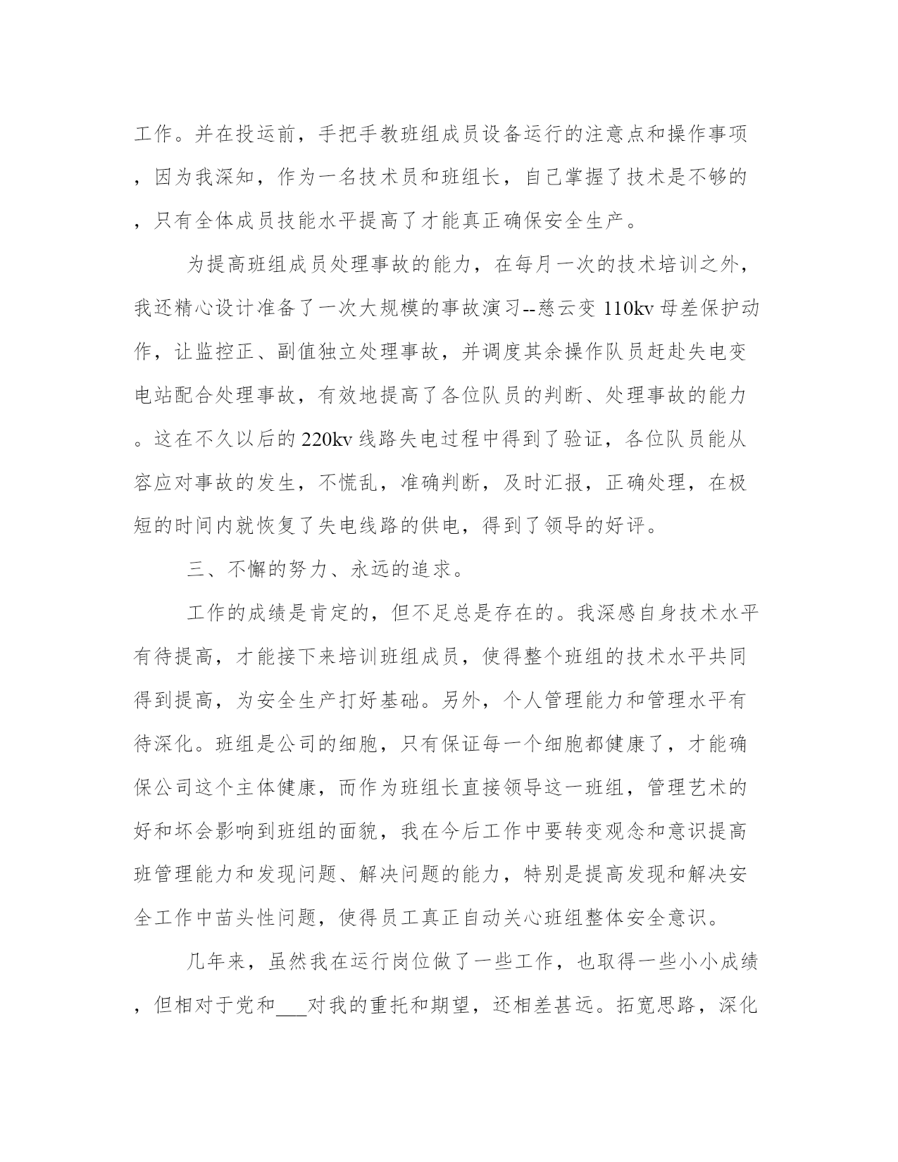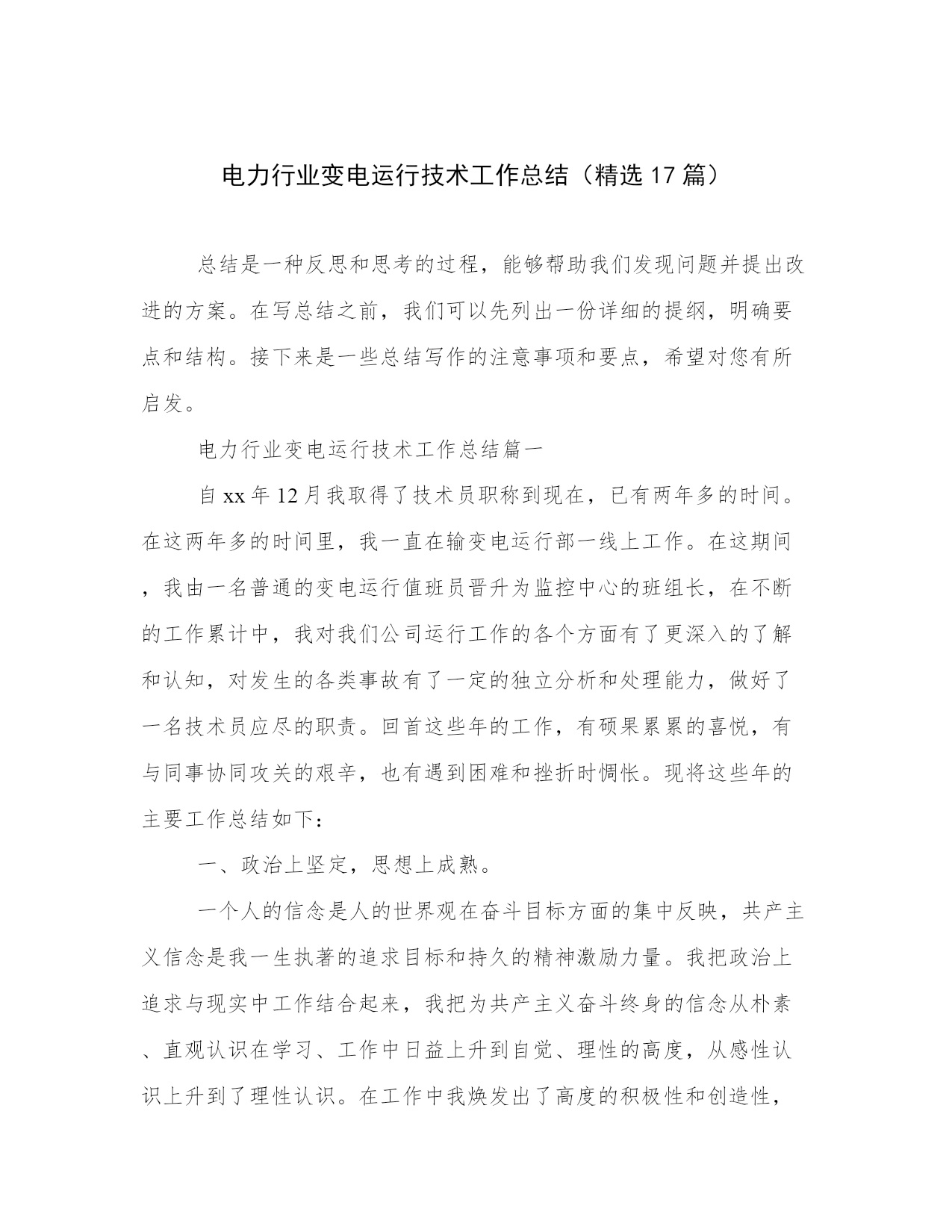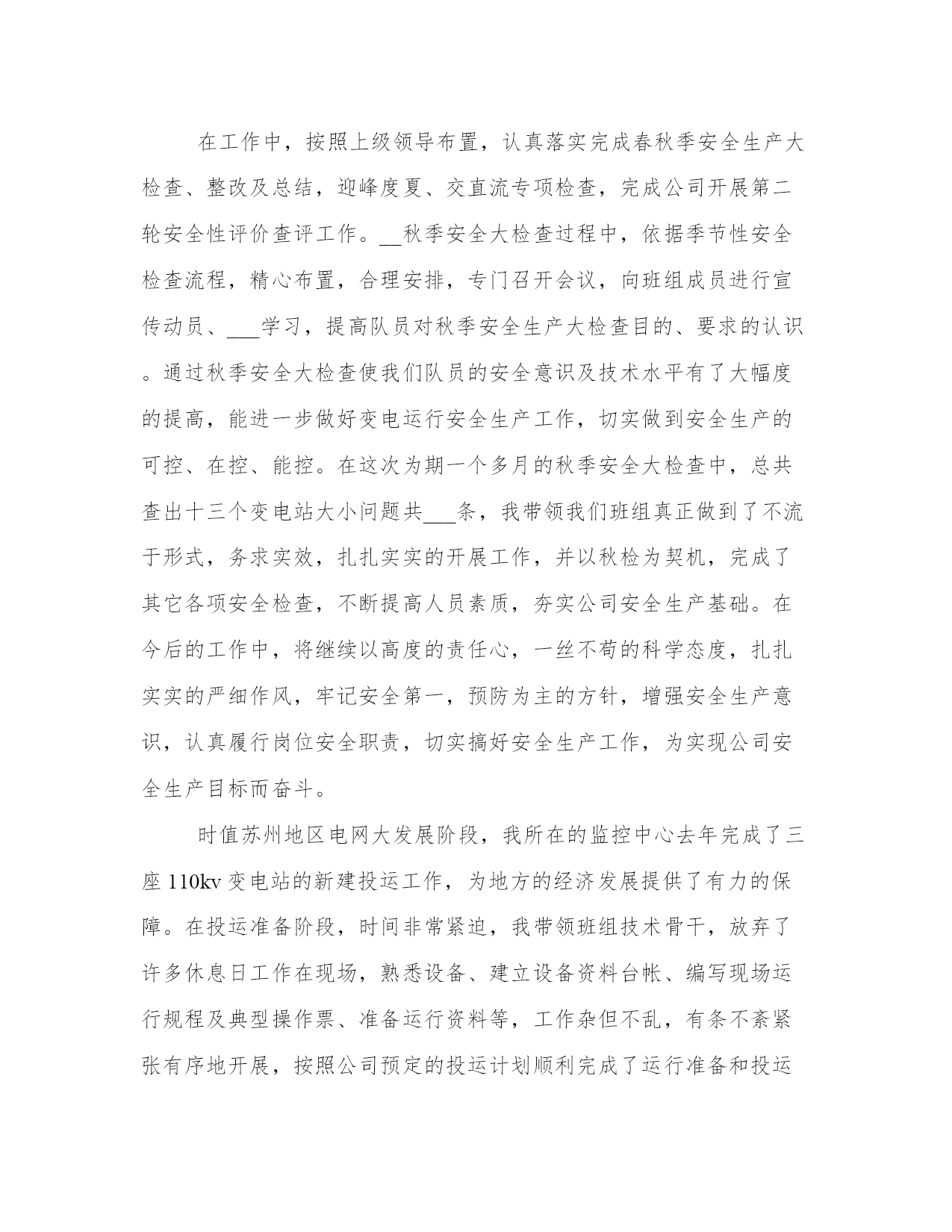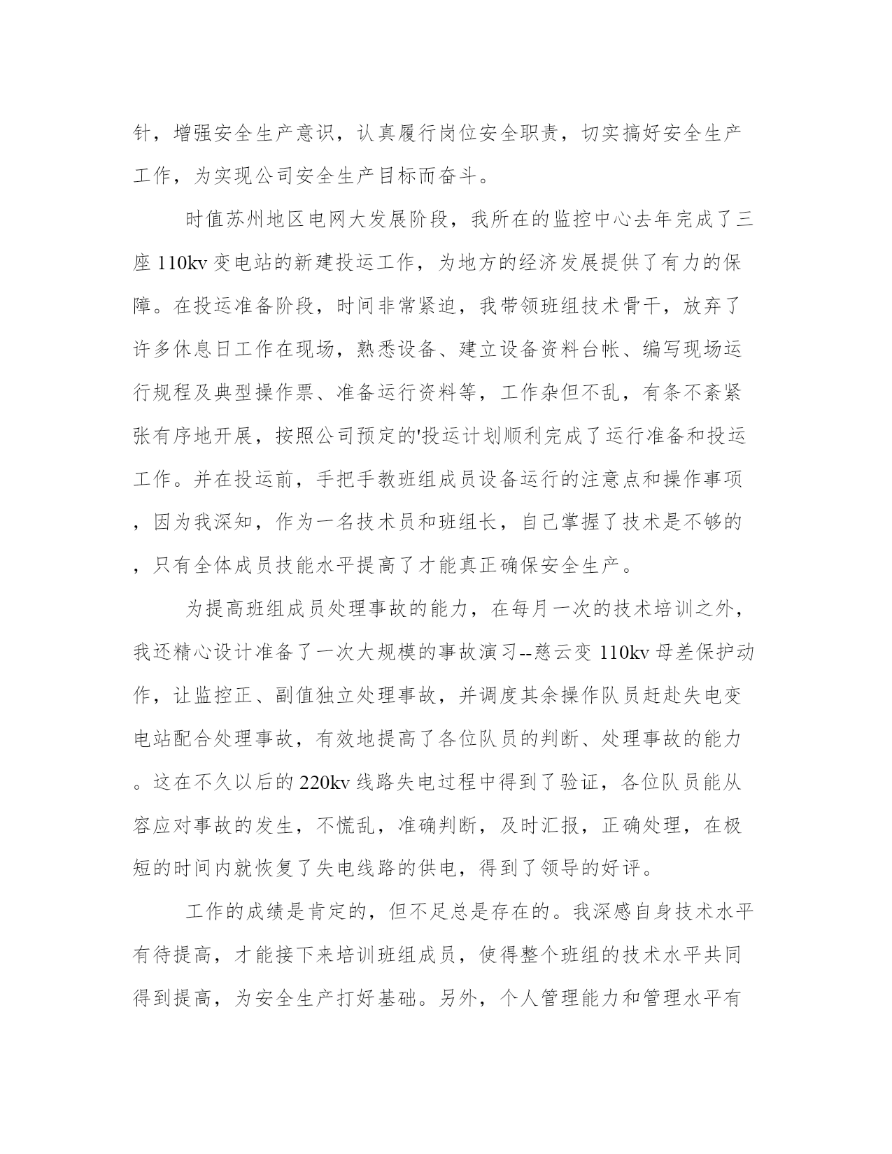 电力行业变电运行技术工作总结范文(21篇)总结能够提高我们对事物的洞察力和思考能力。写一篇完美的总结需要先明确总结的目的和重点。以下是关于总结的一些经典范文,希望能给大家在总结写作上提供一些参考。电力行业变电运行技术工作总结篇一期:___________。自__年__月我取得了技术员职称到现在,已有两年多的时间。在这两年多的时间里,我一直在输变电运行部一线上工作。在这期间,我由一名普通的变电运行值班员晋升为监控中心的班组长,在不断的工作累计中,我对我们公司运行工作的各个方面有了更深入的了解和认知,对发生的各类事故有了一定的独立分析和处理能力,做好了一名技术员应尽的职责。回首这些年的工作,有硕果累累的喜悦,有与同事协同攻关的艰辛,也有遇到困难和挫折时惆怅。现将这些年的主要工作总结如下:。一、政治上坚定,思想上成熟。一个人的信念是人的世界观在奋斗目标方面的集中反映,共产主义信念是我一生执著的追求目标和持久的精神激励力量。我把政治上追求与现实中工作结合起来,我把为共产主义奋斗终身的信念从朴素、直观认识在学习、工作中日益上升到自觉、理性的高度,从感性认识上升到了理性认识。在工作中我焕发出了高度的积极性和创造性,脚踏实地、艰苦创业,捍卫自己的信仰和共产主义事业,努力完成党交给我的各项任务。因为我有了始终不渝的政治信念、坚定不移的政治立场,所以,我才能在实际工作中保持锐意改革,勇于进取的革___气概,保持锲而不舍、顽强奋斗、拼搏到底的作风,保持我乐于奉献、___、全心全意为人民服务的精神。我从做好本职工作和日常工作入手,从我做起、从现在做起、从身边的小事做起并持之以恒。伟大寓于平凡。我在本职工作中尽心尽力、孜孜不倦地做出成绩。鼓实劲、察实情、说实话、办实事、求实效。我不断提高自己的业务本领,努力精通本职的业务知识,做本职工作的骨干和行家里手,脚踏实地的做好本职工作。把远大目标与现实努力结合起来,把为人民谋利益的决心同过硬的本领有机地统一起来、把为人民谋利益的热情同实事求是的态度有机地统一起来、把全心全意为人民服务的良好愿望同本职工作有机地统一起来。把全心全意为人民服务的良好愿望同本职工作统一起来。我在实践中为群众办实事,把着眼点放在本职岗位和现实基础上。二、工作中勤奋,业务上钻研。在工作、生活中我一直相信一份耕耘、一份收获,所以我一直在努力,不断的努力学习、不断的努力工作。___年我参加了___工程学院大专函授的学习,用四年的时间,以优异的学业取得了大专毕业证书。__年__月,我在苏州电力职工技能培训中心参加了13(2)期变电值班员高级工培训,并以优异的成绩取得了高级工证书。在工作中,按照上级领导布置,认真落实完成春秋季安全生产大检查、整改及总结,迎峰度夏、交直流专项检查,完成公司开展第二轮安全性评价查评工作。__秋季安全大检查过程中,依据季节性安全检查流程,精心布置,合理安排,专门召开会议,向班组成员进行宣传动员、___学习,提高队员对秋季安全生产大检查目的、要求的认识。通过秋季安全大检查使我们队员的安全意识及技术水平有了大幅度的提高,能进一步做好变电运行安全生产工作,切实做到安全生产的可控、在控、能控。在这次为期一个多月的秋季安全大检查中,总共查出十三个变电站大小问题共___条,我带领我们班组真正做到了不流于形式,务求实效,扎扎实实的开展工作,并以秋检为契机,完成了其它各项安全检查,不断提高人员素质,夯实公司安全生产基础。在今后的工作中,将继续以高度的责任心,一丝不苟的科学态度,扎扎实实的严细作风,牢记安全第一,预防为主的方针,增强安全生产意识,认真履行岗位安全职责,切实搞好安全生产工作,为实现公司安全生产目标而奋斗。时值苏州地区电网大发展阶段,我所在的监控中心去年完成了三座110kv变电站的新建投运工作,为地方的经济发展提供了有力的保障。在投运准备阶段,时间非常紧迫,我带领班组技术骨干,放弃了许多休息日工作在现场,熟悉设备、建立设备资料台帐、编写现场运行规程及典型操作票、准备运行资料等,工作杂但不乱,有条不紊紧张有序地开展,按照公司预定的投运计划顺利完成了运行准备和投运工作。并在投运前,手把手教班组成员设备运行的注意点和操作事项,因为我深知,作为一名技术员和班组长,自己掌握了技术是不够的,只有全体成员技能水平提高了才能真正确保安全生产。为提高班组成员处理事故的能力,在每月一次的技术培训之外,我还精心设计准备了一次大规模的事故演习--慈云变110kv母差保护动作,让监控正、副值独立处理事故,并调度其余操作队员赶赴失电变电站配合处理事故,有效地提高了各位队员的判断、处理事故的能力。这在不久以后的220kv线路失电过程中得到了验证,各位队员能从容应对事故的发生,不慌乱,准确判断,及时汇报,正确处理,在极短的时间内就