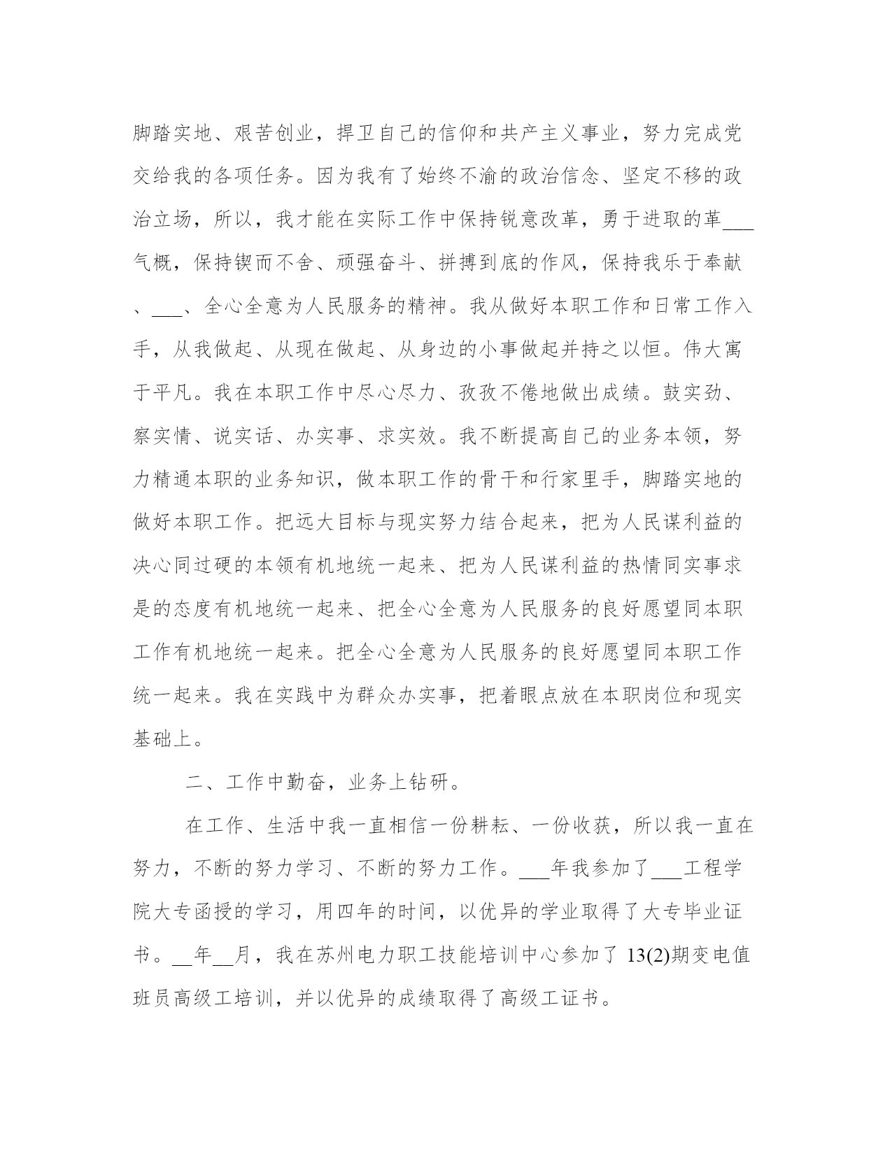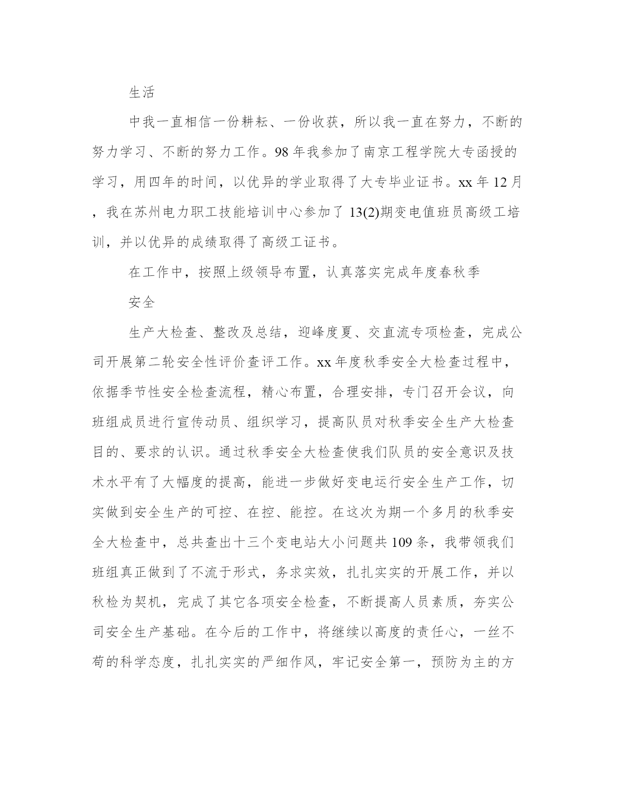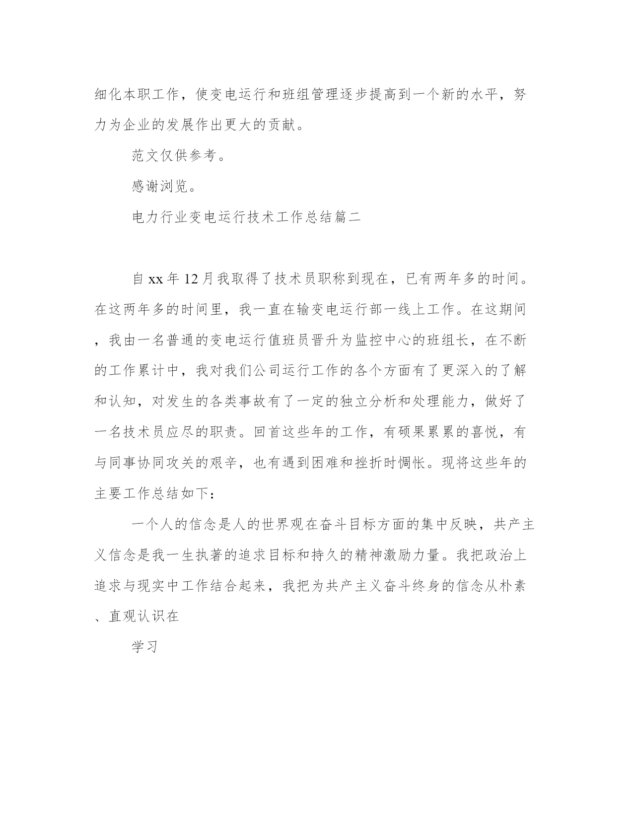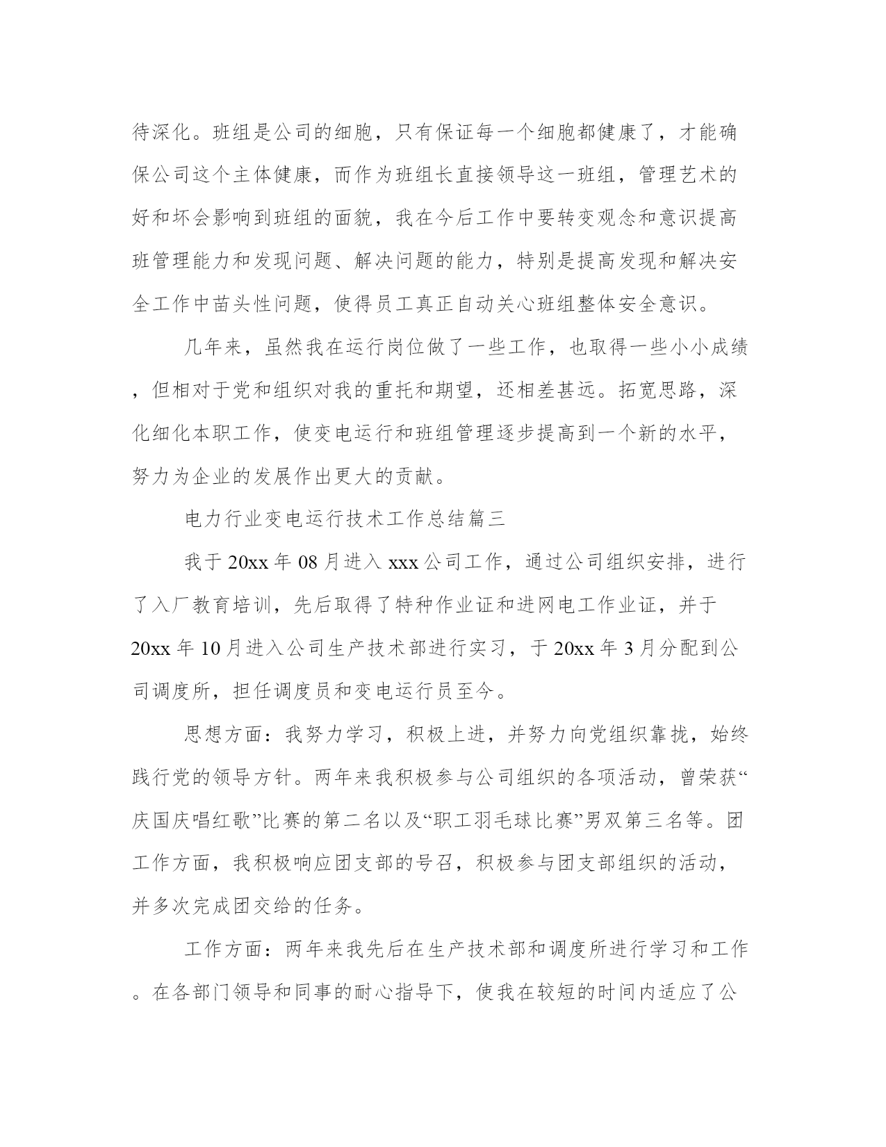 电力行业变电运行技术工作总结范文(21篇)总结能够提高我们对事物的洞察力和思考能力。写一篇完美的总结需要先明确总结的目的和重点。以下是关于总结的一些经典范文,希望能给大家在总结写作上提供一些参考。电力行业变电运行技术工作总结篇一期:___________。自__年__月我取得了技术员职称到现在,已有两年多的时间。在这两年多的时间里,我一直在输变电运行部一线上工作。在这期间,我由一名普通的变电运行值班员晋升为监控中心的班组长,在不断的工作累计中,我对我们公司运行工作的各个方面有了更深入的了解和认知,对发生的各类事故有了一定的独立分析和处理能力,做好了一名技术员应尽的职责。回首这些年的工作,有硕果累累的喜悦,有与同事协同攻关的艰辛,也有遇到困难和挫折时惆怅。现将这些年的主要工作总结如下:。一、政治上坚定,思想上成熟。一个人的信念是人的世界观在奋斗目标方面的集中反映,共产主义信念是我一生执著的追求目标和持久的精神激励力量。我把政治上追求与现实中工作结合起来,我把为共产主义奋斗终身的信念从朴素、直观认识在学习、工作中日益上升到自觉、理性的高度,从感性认识上升到了理性认识。在工作中我焕发出了高度的积极性和创造性,脚踏实地、艰苦创业,捍卫自己的信仰和共产主义事业,努力完成党交给我的各项任务。因为我有了始终不渝的政治信念、坚定不移的政治立场,所以,我才能在实际工作中保持锐意改革,勇于进取的革___气概,保持锲而不舍、顽强奋斗、拼搏到底的作风,保持我乐于奉献、___、全心全意为人民服务的精神。我从做好本职工作和日常工作入手,从我做起、从现在做起、从身边的小事做起并持之以恒。伟大寓于平凡。我在本职工作中尽心尽力、孜孜不倦地做出成绩。鼓实劲、察实情、说实话、办实事、求实效。我不断提高自己的业务本领,努力精通本职的业务知识,做本职工作的骨干和行家里手,脚踏实地的做好本职工作。把远大目标与现实努力结合起来,把为人民谋利益的决心同过硬的本领有机地统一起来、把为人民谋利益的热情同实事求是的态度有机地统一起来、把全心全意为人民服务的良好愿望同本职工作有机地统一起来。把全心全意为人民服务的良好愿望同本职工作统一起来。我在实践中为群众办实事,把着眼点放在本职岗位和现实基础上。二、工作中勤奋,业务上钻研。在工作、生活中我一直相信一份耕耘、一份收获,所以我一直在努力,不断的努力学习、不断的努力工作。___年我参加了___工程学院大专函授的学习,用四年的时间,以优异的学业取得了大专毕业证书。__年__月,我在苏州电力职工技能培训中心参加了13(2)期变电值班员高级工培训,并以优异的成绩取得了高级工证书。在工作中,按照上级领导布置,认真落实完成春秋季安全生产大检查、整改及总结,迎峰度夏、交直流专项检查,完成公司开展第二轮安全性评价查评工作。__秋季安全大检查过程中,依据季节性安全检查流程,精心布置,合理安排,专门召开会议,向班组成员进行宣传动员、___学习,提高队员对秋季安全生产大检查目的、要求的认识。通过秋季安全大检查使我们队员的安全意识及技术水平有了大幅度的提高,能进一步做好变电运行安全生产工作,切实做到安全生产的可控、在控、能控。在这次为期一个多月的秋季安全大检查中,总共查出十三个变电站大小问题共___条,我带领我们班组真正做到了不流于形式,务求实效,扎扎实实的开展工作,并以秋检为契机,完成了其它各项安全检查,不断提高人员素质,夯实公司安全生产基础。在今后的工作中,将继续以高度的责任心,一丝不苟的科学态度,扎扎实实的严细作风,牢记安全第一,预防为主的方针,增强安全生产意识,认真履行岗位安全职责,切实搞好安全生产工作,为实现公司安全生产目标而奋斗。时值苏州地区电网大发展阶段,我所在的监控中心去年完成了三座110kv变电站的新建投运工作,为地方的经济发展提供了有力的保障。在投运准备阶段,时间非常紧迫,我带领班组技术骨干,放弃了许多休息日工作在现场,熟悉设备、建立设备资料台帐、编写现场运行规程及典型操作票、准备运行资料等,工作杂但不乱,有条不紊紧张有序地开展,按照公司预定的投运计划顺利完成了运行准备和投运工作。并在投运前,手把手教班组成员设备运行的注意点和操作事项,因为我深知,作为一名技术员和班组长,自己掌握了技术是不够的,只有全体成员技能水平提高了才能真正确保安全生产。为提高班组成员处理事故的能力,在每月一次的技术培训之外,我还精心设计准备了一次大规模的事故演习--慈云变110kv母差保护动作,让监控正、副值独立处理事故,并调度其余操作队员赶赴失电变电站配合处理事故,有效地提高了各位队员的判断、处理事故的能力。这在不久以后的220kv线路失电过程中得到了验证,各位队员能从容应对事故的发生,不慌乱,准确判断,及时汇报,正确处理,在极短的时间内就