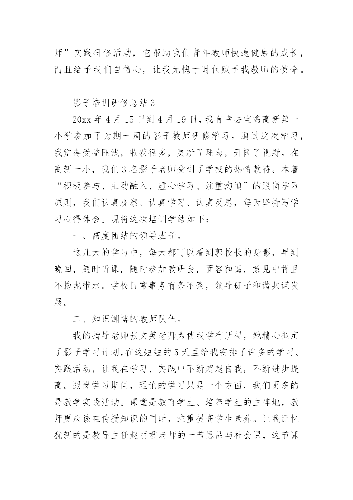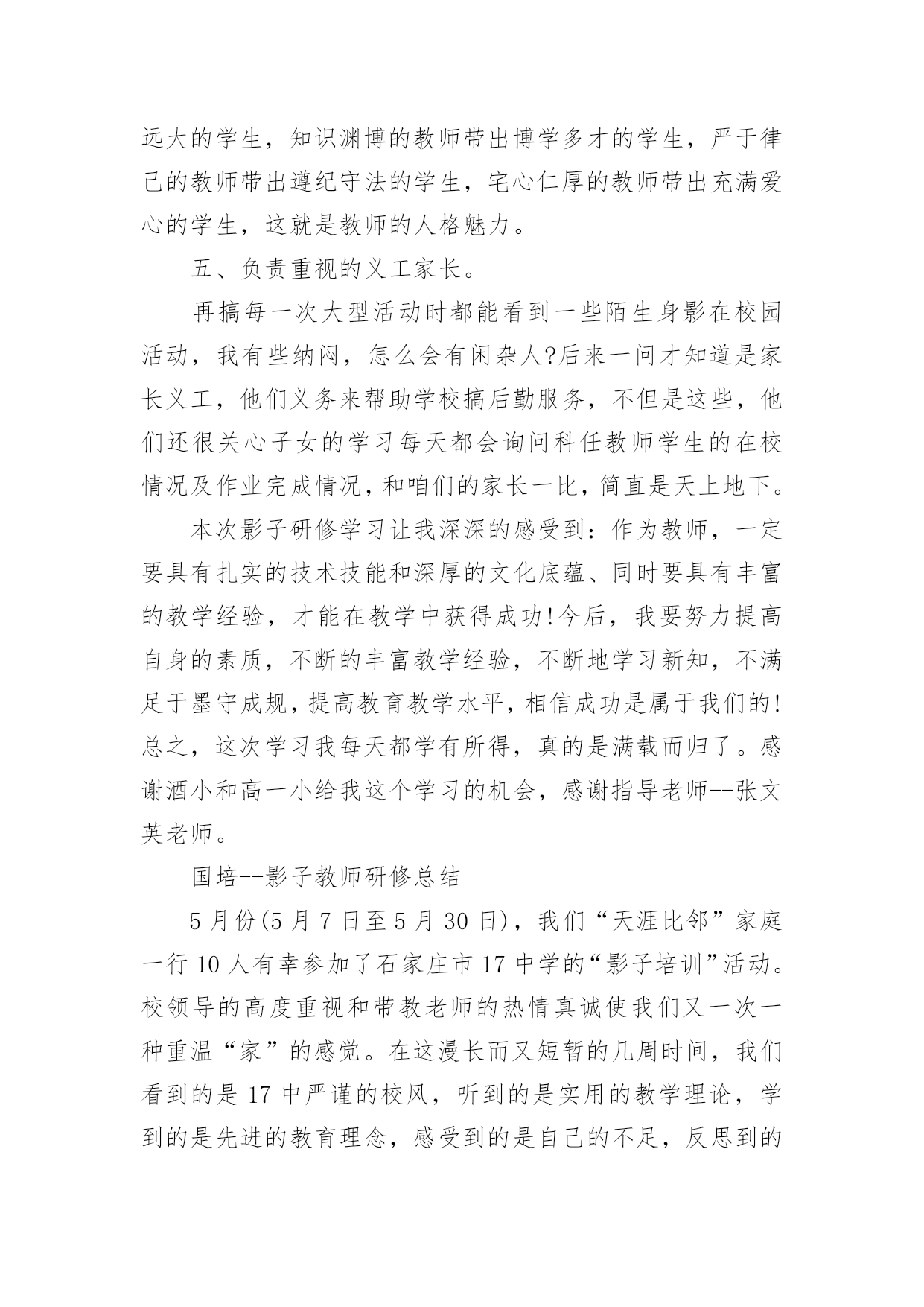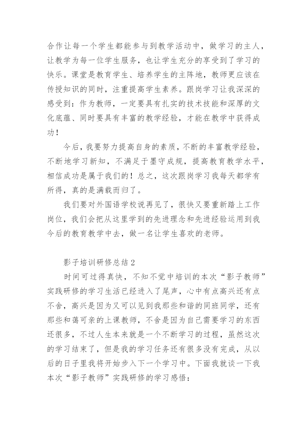 影子培训研修总结影子培训研修总结(通用6篇)总结是指对某一阶段的工作、学习或思想中的经验或情况加以总结和概括的书面材料,它能够给人努力工作的动力,因此我们需要回头归纳,写一份总结了。总结怎么写才能发挥它的作用呢?下面是小编为大家整理的影子培训研修总结(通用6篇),欢迎阅读与收藏。影子培训研修总结126天的“影子教师”跟岗学习已经结束了,在这里我深深的感受到了咸宁实验外国语学校特有文化氛围,老师们的敬业爱岗精神和孩子们奋发向上的求学精神。一、润泽心灵的校园文化虽然外国语学校的才成立两年,但一座座教学楼,在翠绿欲滴的树和娇羞欲语的花儿的装饰下,更显得生机勃勃。在这如诗如画的环境中学习、工作,是一件多么享受的事情啊!“兴趣是最好的老师”,没有豪言壮语,只有温馨提示:“不求成绩最优,但求品德最美”“试一试我能行,拼一拼我能赢”没有现场说教,只有渲染熏陶。这些朴实的句子、惬意的环境时时刻刻在提醒你、鼓励你、引领你。在外国语的校园里我看到教师和学生身上散发出的与众不同的精神面貌,是渗透在骨子里的一种品质。这是通过校长不断引领,老师们不断领会,通过外在熏陶,内在培养,最终表现在全体教职员工身上的气质,最后形成学校独有的一种精神气息。二、灵活机智的专业能力作为一名小学教师,我努力把学习的理论知识转化为实践动能,使之更加有效地指导我平时的日常教学工作。在跟岗学习过程中,我把自身对数学新课程标准的理解和平时日常教学中遇到的困惑与指导老师们交流,她们用新的教学理念指导我的教学,在不断总结的基础上重新发现自己。在指导老师李送梅老师的安排下,我听了多位老师的课,不仅有数学课、还有集体备课等,各有特色,专业理论水平很高。不仅听了讲课,还听了评课。评课这个环节很能检验一位老师专业水平、理论水平。我平时只注重课堂教学这个环节,平时很少点评其他人的课,所以在真正评课的时候才发现自己专业水平、理论水平是那么的有限。别人评课,能发现其他老师的亮点、不足在哪?而我却很少能到位的去点评,所以,每次评课我都会很认真地听、记,学习其他老师的长处。我先后听了近30节课,也听了几节说课和评课,最重要的是能听专家老师的点评,使我的专业能力有了很大的提高。同时,我学会了变换角度审视自己的日常教育教学工作,在新理念的引领下,不断反思、调整我的教育观,正是这种换位思考,让我学会了信任学生,并不断地感受到信任带来的惊喜和力量。三、匠心独运的教学手段小组合作学习是外国语学校教学的一大亮点,通过小组合作让每一个学生都能参与到教学活动中,做学习的主人,让教学为每一位学生服务,也让学生充分的享受到了学习的快乐。课堂是教育学生、培养学生的主阵地,教师更应该在传授知识的同时,注重提高学生素养。跟岗学习让我深深的感受到:作为教师,一定要具有扎实的技术技能和深厚的文化底蕴、同时要具有丰富的教学经验,才能在教学中获得成功!今后,我要努力提高自身的素质,不断的丰富教学经验,不断地学习新知,不满足于墨守成规,提高教育教学水平,相信成功是属于我们的!总之,这次跟岗学习我每天都学有所得,真的是满载而归了。我们要对外国语学校说再见了,很快又要重新踏上工作岗位,我们会把从这里学到的先进理念和先进经验运用到我今后的教育教学中去,做一名让学生喜欢的老师。影子培训研修总结2时间可过得真快,不知不觉中培训的本次“影子教师”实践研修的学习生活已经进入了尾声,心中有点高兴还有点不舍,高兴是因为又可以见到我那些和谐的同班同学,还有那些和蔼可亲的上课教师,不舍是因为自己需要学习的东西还很多,不过人生本来就是一个不断学习的过程,虽然这次的学习结束了,但是我的学习任务还有很多没有完成,从以后的日子里我将开始步入下一个学习中。下面我就谈一下我本次“影子教师”实践研修的学习感悟:1、小学美术教育不同于专业美术教育,它为发展学生整体素质服务:以学生发展为本,注重培养发展学生审美能力、感知力、想象力、表现力等方面的能力,注重培养创新精神,注重学生的个性发展和全面发展。新教育強调培养学生学习兴趣,强调学生自主探究学习,合作互动学习,強调情感体验,注重学习的过程,注重跨学科的综合学习,改变传统教法和学法。通过美术实践活动提高学生的整体素质,最终使学生学会学习,学会做人,终身受益。课程改革为教师专业化的成长提供了一个平台,特别是培养学生综合素质的有效途径,同时也让我明确了本次培训的目标、内容,力求使自己由专业型、经验型教师向研究型教师转变。2、跟岗学习中以“影子教师”实践研修考核要求严格完成,要求完成“教学案例”是此次学习中最重要任务之一。培训的优质“教学案例”将要送省上编制成册公开发表,其成果也将对学员自身的成长产生较大影响。因此,我们学员都认真对待此问题。3、教学过程是师生交往、积极互动、共同发展的过程,教师的教学要从重结论转变为更重过程,