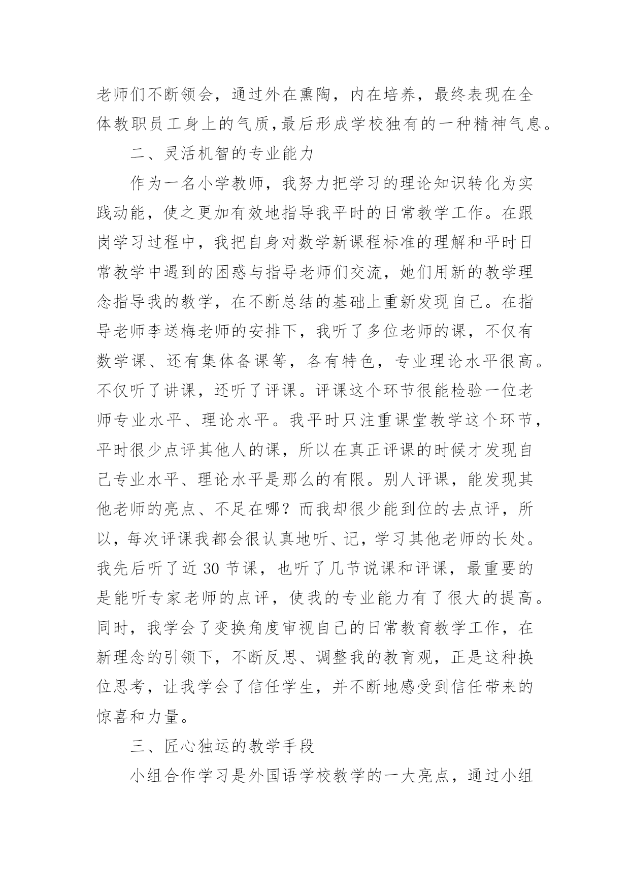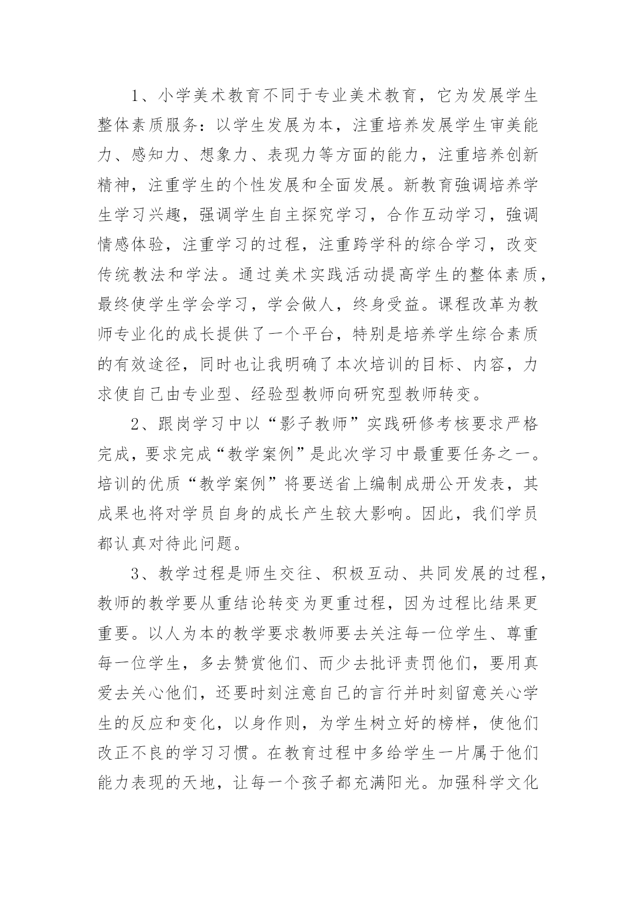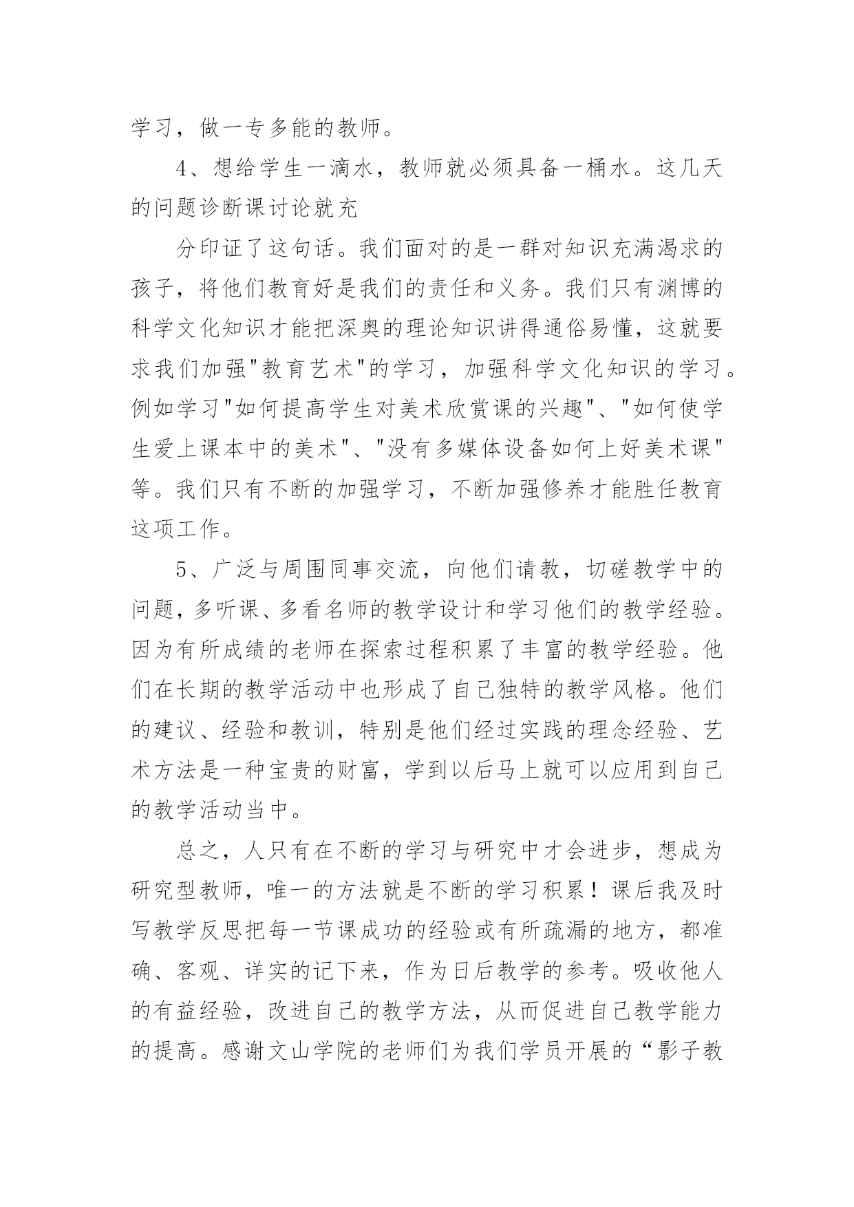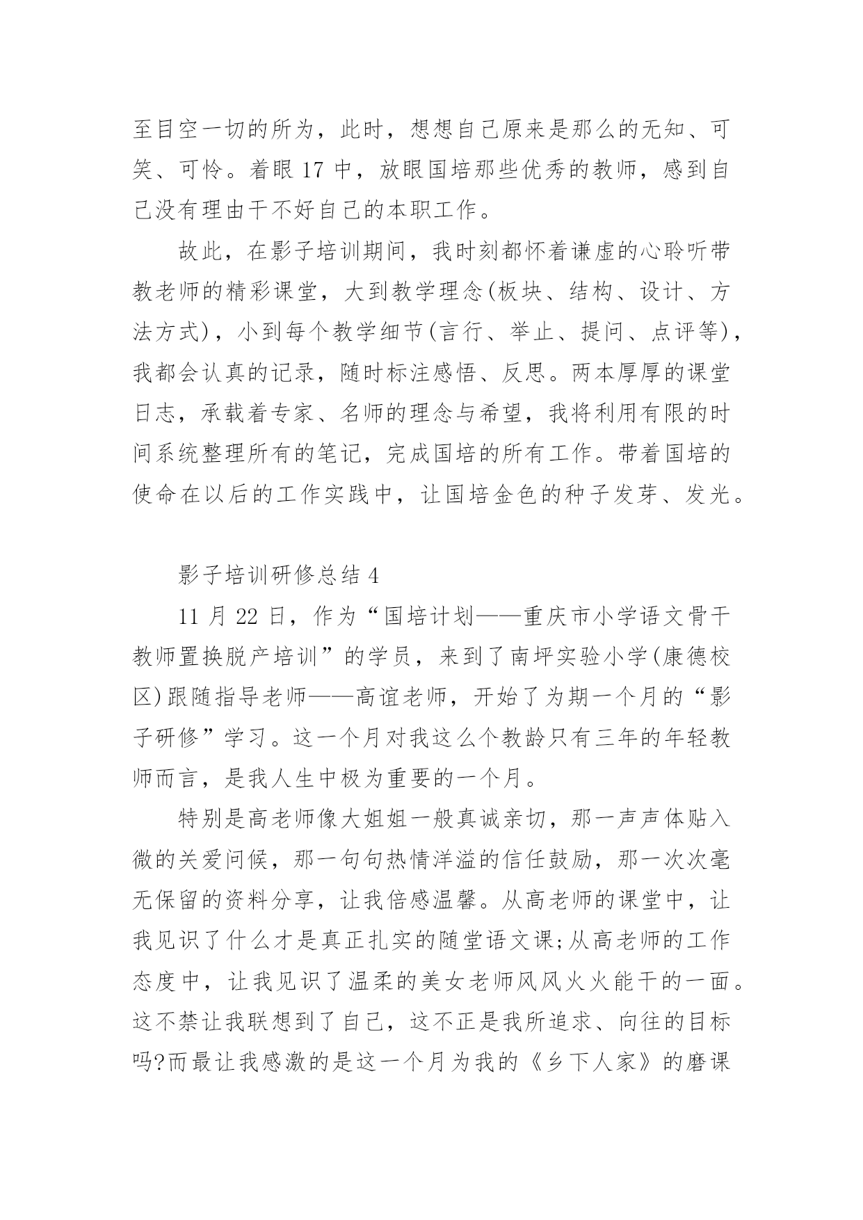 影子培训研修总结影子培训研修总结(通用6篇)总结是指对某一阶段的工作、学习或思想中的经验或情况加以总结和概括的书面材料,它能够给人努力工作的动力,因此我们需要回头归纳,写一份总结了。总结怎么写才能发挥它的作用呢?下面是小编为大家整理的影子培训研修总结(通用6篇),欢迎阅读与收藏。影子培训研修总结126天的“影子教师”跟岗学习已经结束了,在这里我深深的感受到了咸宁实验外国语学校特有文化氛围,老师们的敬业爱岗精神和孩子们奋发向上的求学精神。一、润泽心灵的校园文化虽然外国语学校的才成立两年,但一座座教学楼,在翠绿欲滴的树和娇羞欲语的花儿的装饰下,更显得生机勃勃。在这如诗如画的环境中学习、工作,是一件多么享受的事情啊!“兴趣是最好的老师”,没有豪言壮语,只有温馨提示:“不求成绩最优,但求品德最美”“试一试我能行,拼一拼我能赢”没有现场说教,只有渲染熏陶。这些朴实的句子、惬意的环境时时刻刻在提醒你、鼓励你、引领你。在外国语的校园里我看到教师和学生身上散发出的与众不同的精神面貌,是渗透在骨子里的一种品质。这是通过校长不断引领,老师们不断领会,通过外在熏陶,内在培养,最终表现在全体教职员工身上的气质,最后形成学校独有的一种精神气息。二、灵活机智的专业能力作为一名小学教师,我努力把学习的理论知识转化为实践动能,使之更加有效地指导我平时的日常教学工作。在跟岗学习过程中,我把自身对数学新课程标准的理解和平时日常教学中遇到的困惑与指导老师们交流,她们用新的教学理念指导我的教学,在不断总结的基础上重新发现自己。在指导老师李送梅老师的安排下,我听了多位老师的课,不仅有数学课、还有集体备课等,各有特色,专业理论水平很高。不仅听了讲课,还听了评课。评课这个环节很能检验一位老师专业水平、理论水平。我平时只注重课堂教学这个环节,平时很少点评其他人的课,所以在真正评课的时候才发现自己专业水平、理论水平是那么的有限。别人评课,能发现其他老师的亮点、不足在哪?而我却很少能到位的去点评,所以,每次评课我都会很认真地听、记,学习其他老师的长处。我先后听了近30节课,也听了几节说课和评课,最重要的是能听专家老师的点评,使我的专业能力有了很大的提高。同时,我学会了变换角度审视自己的日常教育教学工作,在新理念的引领下,不断反思、调整我的教育观,正是这种换位思考,让我学会了信任学生,并不断地感受到信任带来的惊喜和力量。三、匠心独运的教学手段小组合作学习是外国语学校教学的一大亮点,通过小组合作让每一个学生都能参与到教学活动中,做学习的主人,让教学为每一位学生服务,也让学生充分的享受到了学习的快乐。课堂是教育学生、培养学生的主阵地,教师更应该在传授知识的同时,注重提高学生素养。跟岗学习让我深深的感受到:作为教师,一定要具有扎实的技术技能和深厚的文化底蕴、同时要具有丰富的教学经验,才能在教学中获得成功!今后,我要努力提高自身的素质,不断的丰富教学经验,不断地学习新知,不满足于墨守成规,提高教育教学水平,相信成功是属于我们的!总之,这次跟岗学习我每天都学有所得,真的是满载而归了。我们要对外国语学校说再见了,很快又要重新踏上工作岗位,我们会把从这里学到的先进理念和先进经验运用到我今后的教育教学中去,做一名让学生喜欢的老师。影子培训研修总结2时间可过得真快,不知不觉中培训的本次“影子教师”实践研修的学习生活已经进入了尾声,心中有点高兴还有点不舍,高兴是因为又可以见到我那些和谐的同班同学,还有那些和蔼可亲的上课教师,不舍是因为自己需要学习的东西还很多,不过人生本来就是一个不断学习的过程,虽然这次的学习结束了,但是我的学习任务还有很多没有完成,从以后的日子里我将开始步入下一个学习中。下面我就谈一下我本次“影子教师”实践研修的学习感悟:1、小学美术教育不同于专业美术教育,它为发展学生整体素质服务:以学生发展为本,注重培养发展学生审美能力、感知力、想象力、表现力等方面的能力,注重培养创新精神,注重学生的个性发展和全面发展。新教育強调培养学生学习兴趣,强调学生自主探究学习,合作互动学习,強调情感体验,注重学习的过程,注重跨学科的综合学习,改变传统教法和学法。通过美术实践活动提高学生的整体素质,最终使学生学会学习,学会做人,终身受益。课程改革为教师专业化的成长提供了一个平台,特别是培养学生综合素质的有效途径,同时也让我明确了本次培训的目标、内容,力求使自己由专业型、经验型教师向研究型教师转变。2、跟岗学习中以“影子教师”实践研修考核要求严格完成,要求完成“教学案例”是此次学习中最重要任务之一。培训的优质“教学案例”将要送省上编制成册公开发表,其成果也将对学员自身的成长产生较大影响。因此,我们学员都认真对待此问题。3、教学过程是师生交往、积极互动、共同发展的过程,教师的教学要从重结论转变为更重过程,