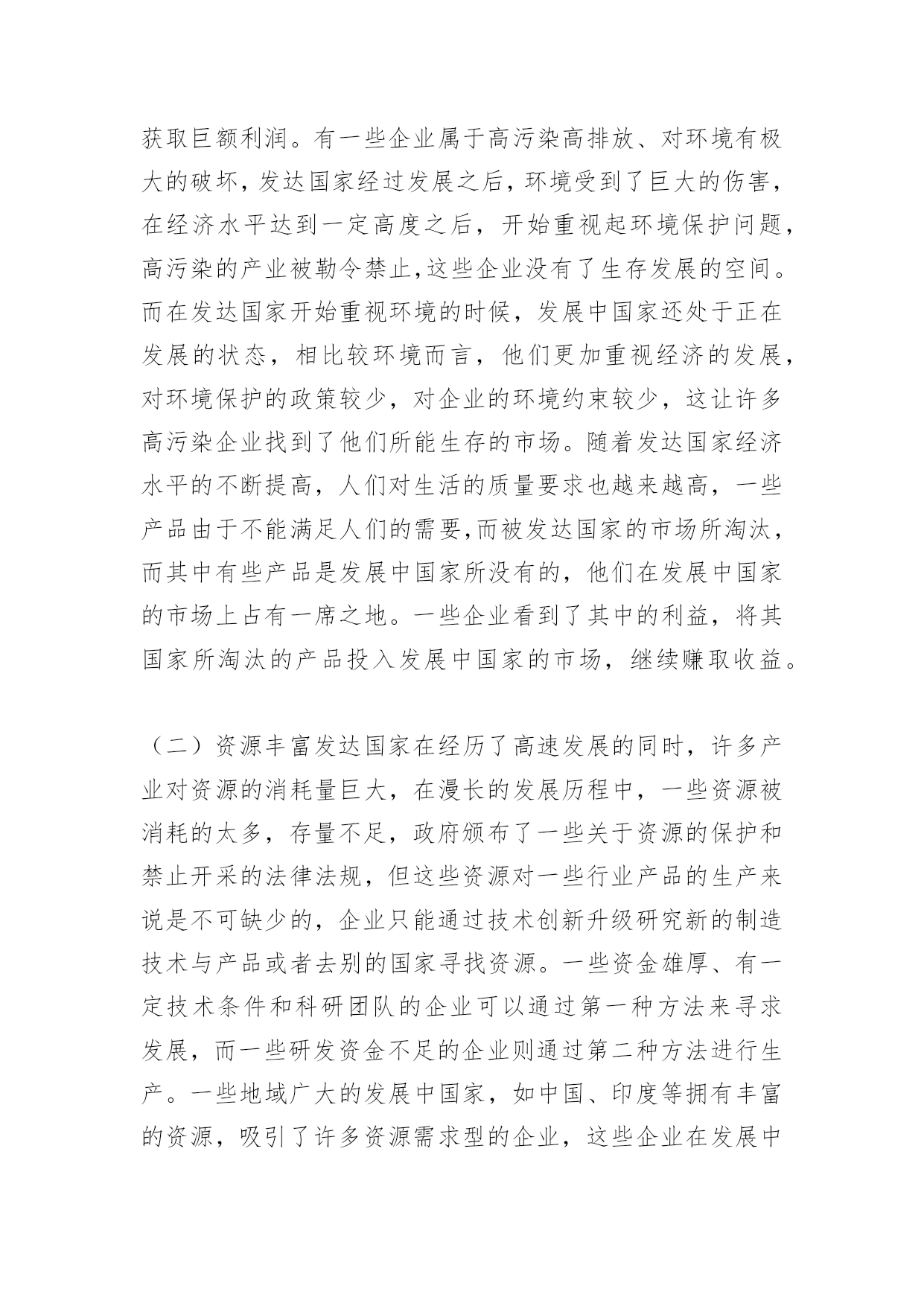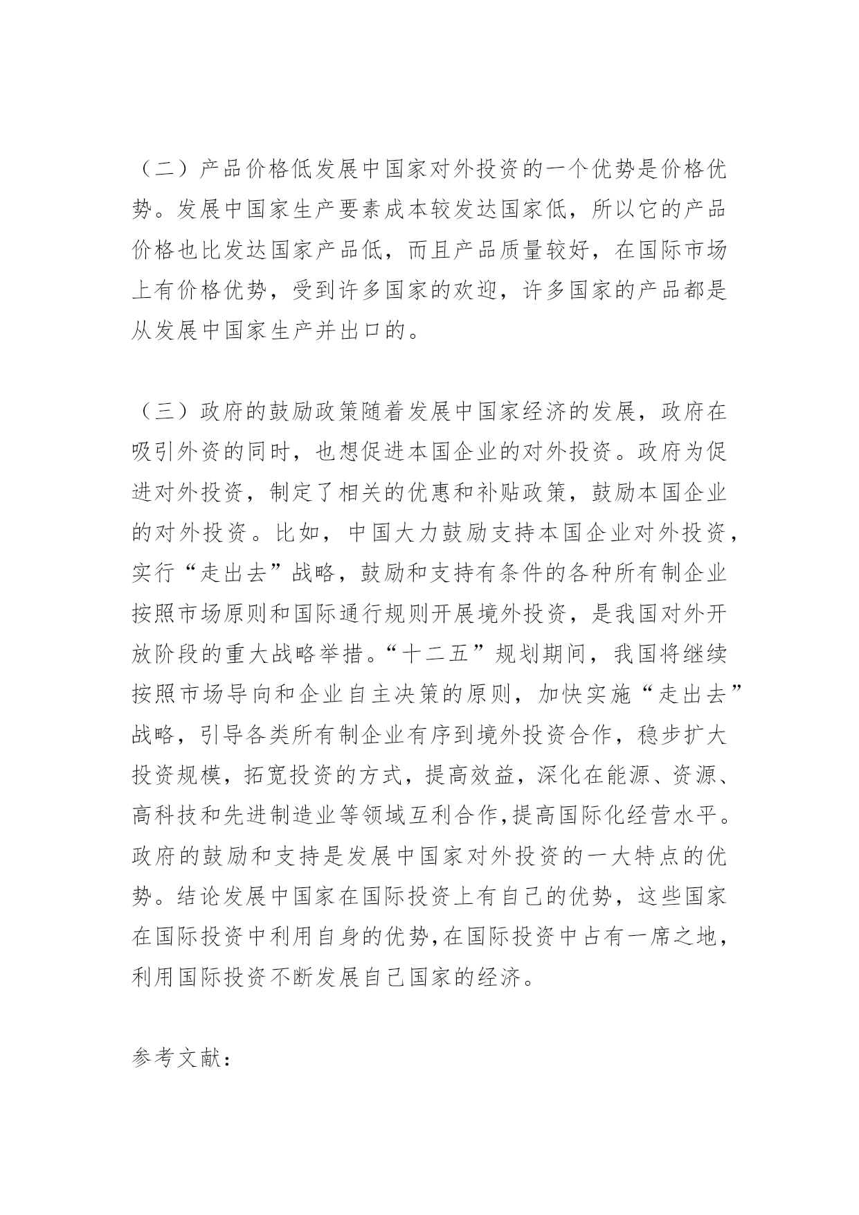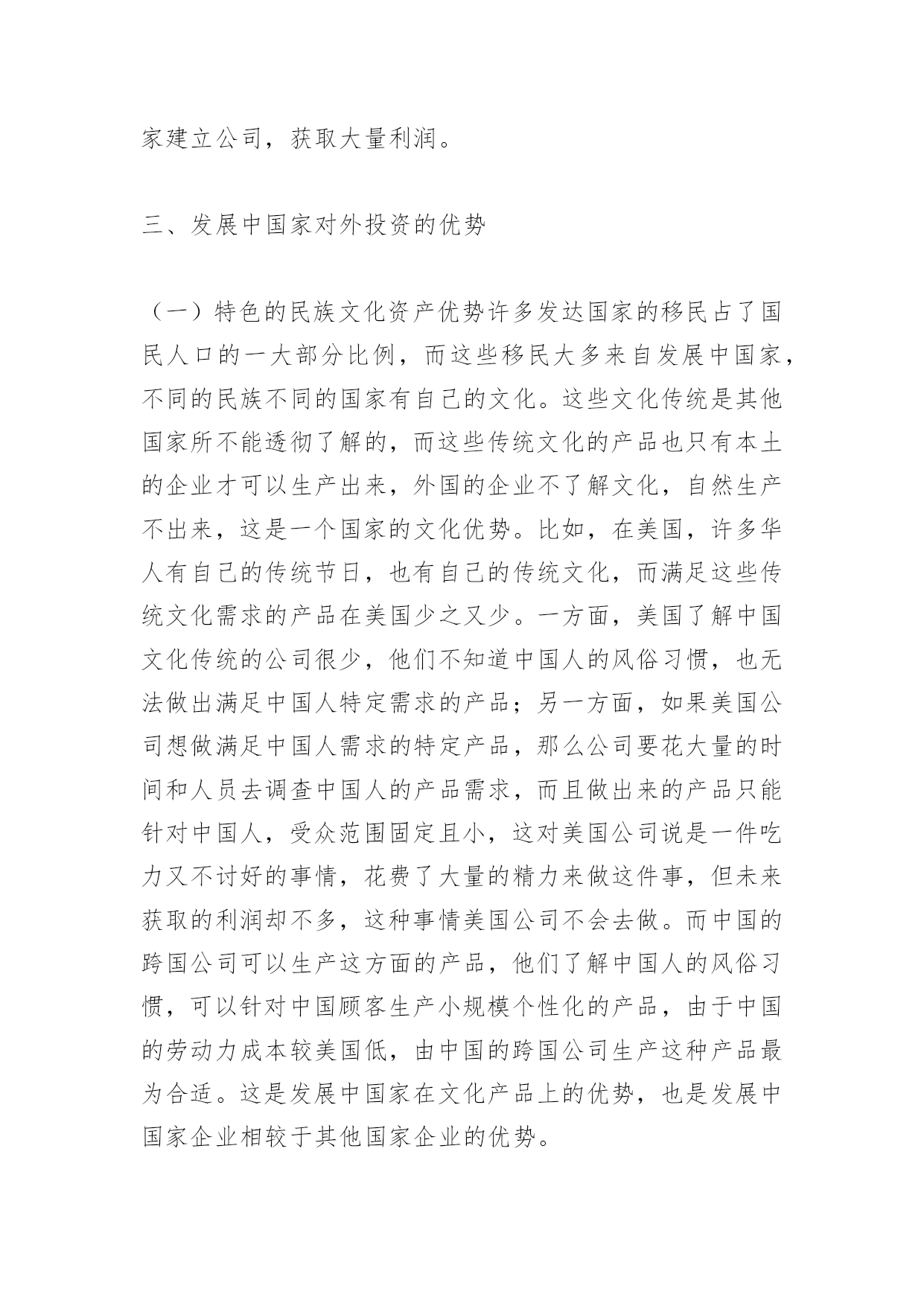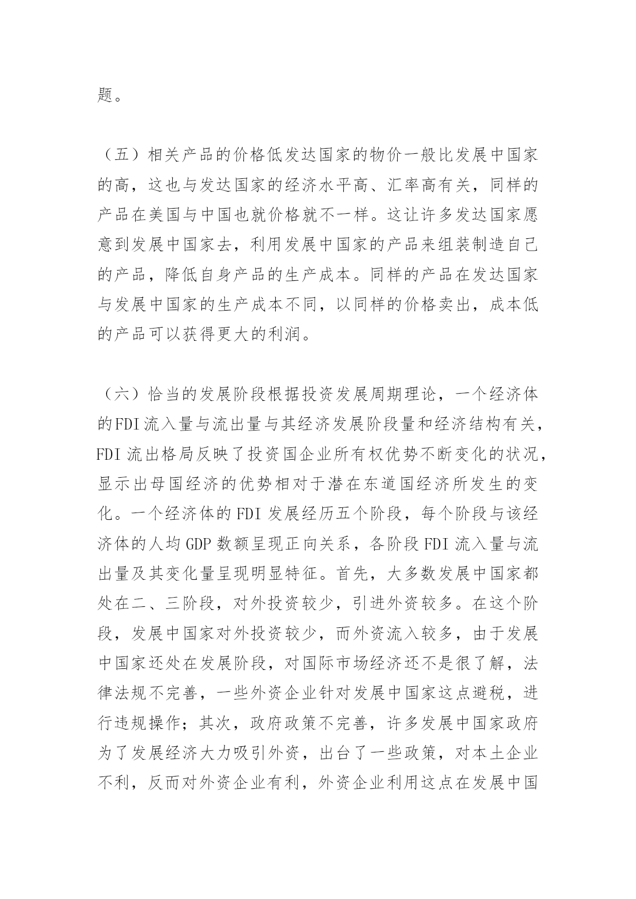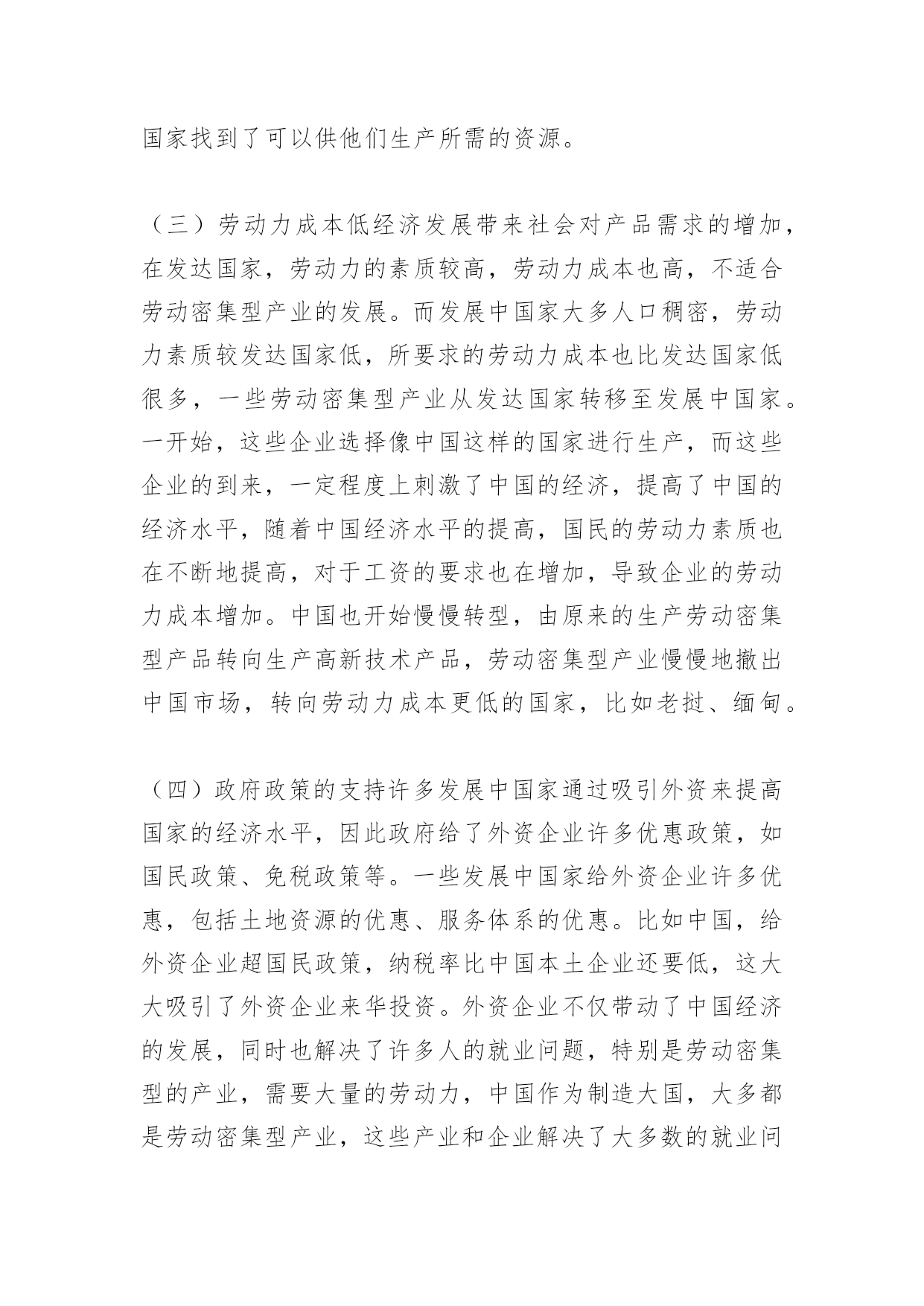越来越多的国家参与到国际投资中越来越多的国家参与到国际投资中一、背景进入新世纪,经济全球化的浪潮使得越来越多的国家融入世界经济之中,经济全球化正影响着各国的发展,国际贸易和国际直接投资成为推动世界经济增长的主要动力,是不争的事实。各国在发展国际贸易的同时,也把目光投向了国际投资,越来越多的发展中国家也开始进行国际投资。本文主要针对发展中国家现今的国际投资情况,从不同的角度简析发展中国家在国际投资中的优势。二、发展中国家吸引外资的优势(一)市场广大随着生产力的快速发展,许多发达国家生产的产品远远超出了国民所需,国内市场饱和,这就导致了发达国家出现了产品滞销的现象,市场的竞争力大,利润少,这些因素促使发达国家寻求新的市场以获得更多的利润。这时,发达国家将目光投向了广大发展中国家,大多数发展中国家都有一个特点:人口多,市场需求量大,市场空间大且竞争较小,这让许多发达国家的企业燃起了对发展中国家投资的信心,他们可以在发展中国家找到属于他们的广大市场,获取巨额利润。有一些企业属于高污染高排放、对环境有极大的破坏,发达国家经过发展之后,环境受到了巨大的伤害,在经济水平达到一定高度之后,开始重视起环境保护问题,高污染的产业被勒令禁止,这些企业没有了生存发展的空间。而在发达国家开始重视环境的时候,发展中国家还处于正在发展的状态,相比较环境而言,他们更加重视经济的发展,对环境保护的政策较少,对企业的环境约束较少,这让许多高污染企业找到了他们所能生存的市场。随着发达国家经济水平的不断提高,人们对生活的质量要求也越来越高,一些产品由于不能满足人们的需要,而被发达国家的市场所淘汰,而其中有些产品是发展中国家所没有的,他们在发展中国家的市场上占有一席之地。一些企业看到了其中的利益,将其国家所淘汰的产品投入发展中国家的市场,继续赚取收益。(二)资源丰富发达国家在经历了高速发展的同时,许多产业对资源的消耗量巨大,在漫长的发展历程中,一些资源被消耗的太多,存量不足,政府颁布了一些关于资源的保护和禁止开采的法律法规,但这些资源对一些行业产品的生产来说是不可缺少的,企业只能通过技术创新升级研究新的制造技术与产品或者去别的国家寻找资源。一些资金雄厚、有一定技术条件和科研团队的企业可以通过第一种方法来寻求发展,而一些研发资金不足的企业则通过第二种方法进行生产。一些地域广大的发展中国家,如中国、印度等拥有丰富的资源,吸引了许多资源需求型的企业,这些企业在发展中国家找到了可以供他们生产所需的资源。(三)劳动力成本低经济发展带来社会对产品需求的增加,在发达国家,劳动力的素质较高,劳动力成本也高,不适合劳动密集型产业的发展。而发展中国家大多人口稠密,劳动力素质较发达国家低,所要求的劳动力成本也比发达国家低很多,一些劳动密集型产业从发达国家转移至发展中国家。一开始,这些企业选择像中国这样的国家进行生产,而这些企业的到来,一定程度上刺激了中国的经济,提高了中国的经济水平,随着中国经济水平的提高,国民的劳动力素质也在不断地提高,对于工资的要求也在增加,导致企业的劳动力成本增加。中国也开始慢慢转型,由原来的生产劳动密集型产品转向生产高新技术产品,劳动密集型产业慢慢地撤出中国市场,转向劳动力成本更低的国家,比如老挝、缅甸。(四)政府政策的支持许多发展中国家通过吸引外资来提高国家的经济水平,因此政府给了外资企业许多优惠政策,如国民政策、免税政策等。一些发展中国家给外资企业许多优惠,包括土地资源的优惠、服务体系的优惠。比如中国,给外资企业超国民政策,纳税率比中国本土企业还要低,这大大吸引了外资企业来华投资。外资企业不仅带动了中国经济的发展,同时也解决了许多人的就业问题,特别是劳动密集型的产业,需要大量的劳动力,中国作为制造大国,大多都是劳动密集型产业,这些产业和企业解决了大多数的就业问题。(五)相关产品的价格低发达国家的物价一般比发展中国家的高,这也与发达国家的经济水平高、汇率高有关,同样的产品在美国与中国也就价格就不一样。这让许多发达国家愿意到发展中国家去,利用发展中国家的产品来组装制造自己的产品,降低自身产品的生产成本。同样的产品在发达国家与发展中国家的生产成本不同,以同样的价格卖出,成本低的产品可以获得更大的利润。(六)恰当的发展阶段根据投资发展周期理论,一个经济体的FDI流入量与流出量与其经济发展阶段量和经济结构有关,FDI流出格局反映了投资国企业所有权优势不断变化的状况,显示出母国经济的优势相对于潜在东道国经济所发生的变化。一个经济体的FDI发展经历五个阶段,每个阶段与该经济体的人均GDP数额呈现正向关系,各阶段FDI流入量与流出量及其变化量呈现明显特征。首先,大多数发展中国家都处在二、三阶段,对外投资较少,引进外资较多。在这个阶段,发展中国家对外投资较少,而外资流入较多,