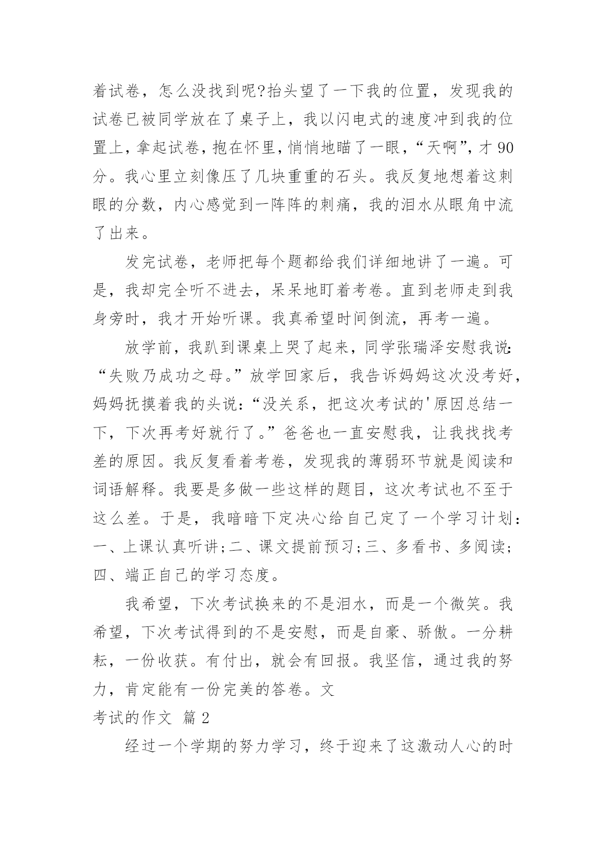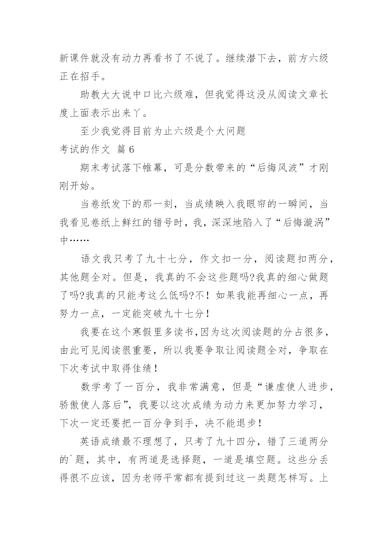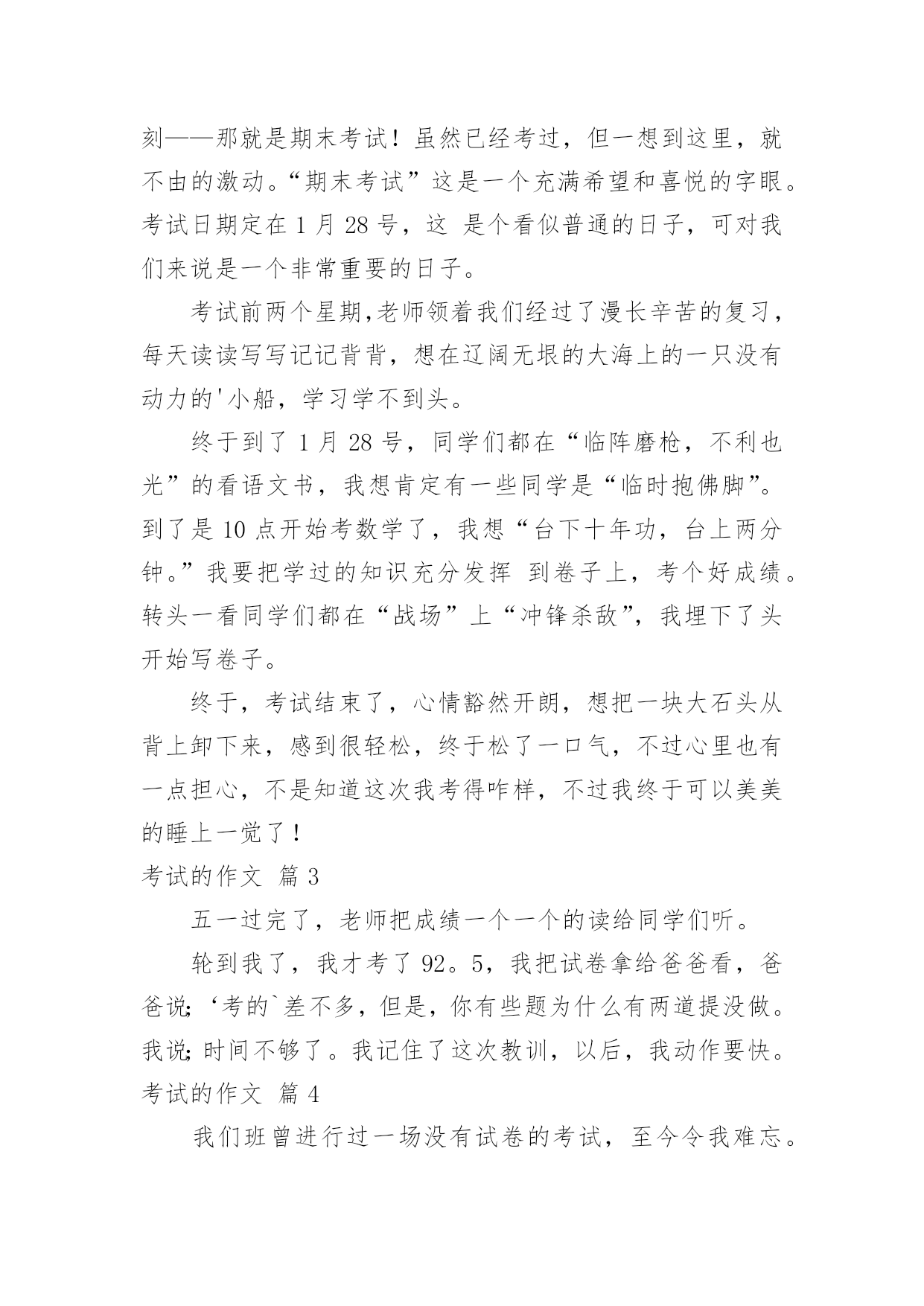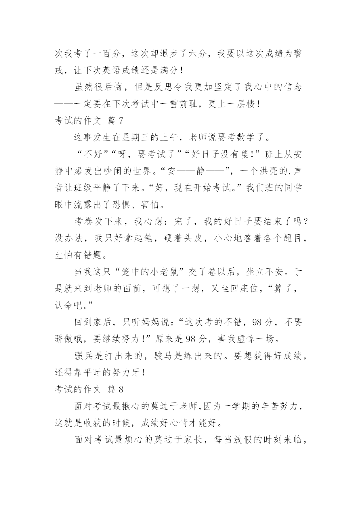 考试的作文考试的作文(合集9篇)在平日的学习、工作和生活里,大家都跟作文打过交道吧,通过作文可以把我们那些零零散散的思想,聚集在一块。你所见过的作文是什么样的呢?下面是小编帮大家整理的考试的作文10篇,欢迎大家借鉴与参考,希望对大家有所帮助。考试的作文篇1星期三,我们班要进行三、四单元的语文考试。我的心情非常激动,因为这两单元的内容对我来说太简单了。其他同学上课之前都在做考试前的准备,而我却悠闲地看着我喜爱的儿童漫画,心想:这么简单的题目,不用做题也能考98分以上。上课了,老师刚把试卷发下来,我就迅速的把题做完了,没检查一下就交给了老师,我满心期待的等着老师发试卷。第二天下午,第一节课胡老师就宣布发试卷,“他看试卷的速度真快啊!”我心想。这时班里像蜜蜂一样“嗡嗡”的,都在议论着自己的分数,我悄悄地看了看周围的同学,他们都信心百倍,脸上带着自豪的微笑看着自己的试卷。我的试卷怎么还没发给我,我焦急地左看右看。终于,我等不及了跑到讲台上找起我的试卷,“99、98-----”看着这么多的高分,我觉得我这次也准能得“98分”,这回向妈妈炫耀一下,准能带我去吃肯德基。一边想着,我一边焦急地扒拉着试卷,怎么没找到呢?抬头望了一下我的位置,发现我的试卷已被同学放在了桌子上,我以闪电式的速度冲到我的位置上,拿起试卷,抱在怀里,悄悄地瞄了一眼,“天啊”,才90分。我心里立刻像压了几块重重的石头。我反复地想着这刺眼的分数,内心感觉到一阵阵的刺痛,我的泪水从眼角中流了出来。发完试卷,老师把每个题都给我们详细地讲了一遍。可是,我却完全听不进去,呆呆地盯着考卷。直到老师走到我身旁时,我才开始听课。我真希望时间倒流,再考一遍。放学前,我趴到课桌上哭了起来,同学张瑞泽安慰我说:“失败乃成功之母。”放学回家后,我告诉妈妈这次没考好,妈妈抚摸着我的头说:“没关系,把这次考试的'原因总结一下,下次再考好就行了。”爸爸也一直安慰我,让我找找考差的原因。我反复看着考卷,发现我的薄弱环节就是阅读和词语解释。我要是多做一些这样的题目,这次考试也不至于这么差。于是,我暗暗下定决心给自己定了一个学习计划:一、上课认真听讲;二、课文提前预习;三、多看书、多阅读;四、端正自己的学习态度。我希望,下次考试换来的不是泪水,而是一个微笑。我希望,下次考试得到的不是安慰,而是自豪、骄傲。一分耕耘,一份收获。有付出,就会有回报。我坚信,通过我的努力,肯定能有一份完美的答卷。文考试的作文篇2经过一个学期的努力学习,终于迎来了这激动人心的时刻——那就是期末考试!虽然已经考过,但一想到这里,就不由的激动。“期末考试”这是一个充满希望和喜悦的字眼。考试日期定在1月28号,这是个看似普通的日子,可对我们来说是一个非常重要的日子。考试前两个星期,老师领着我们经过了漫长辛苦的复习,每天读读写写记记背背,想在辽阔无垠的大海上的一只没有动力的'小船,学习学不到头。终于到了1月28号,同学们都在“临阵磨枪,不利也光”的看语文书,我想肯定有一些同学是“临时抱佛脚”。到了是10点开始考数学了,我想“台下十年功,台上两分钟。”我要把学过的知识充分发挥到卷子上,考个好成绩。转头一看同学们都在“战场”上“冲锋杀敌”,我埋下了头开始写卷子。终于,考试结束了,心情豁然开朗,想把一块大石头从背上卸下来,感到很轻松,终于松了一口气,不过心里也有一点担心,不是知道这次我考得咋样,不过我终于可以美美的睡上一觉了!考试的作文篇3五一过完了,老师把成绩一个一个的读给同学们听。轮到我了,我才考了92。5,我把试卷拿给爸爸看,爸爸说;‘考的`差不多,但是,你有些题为什么有两道提没做。我说;时间不够了。我记住了这次教训,以后,我动作要快。考试的作文篇4我们班曾进行过一场没有试卷的考试,至今令我难忘。那是在一节课上完后,同学们端端正正地坐在各自的座位上,丁老师对我们说:“今天,我们来进行一次考试,请同学们排成一排”,我们虽然弄清怎么回事,但还是从座位上站了起来,这次测试没有试卷非常特殊,老师接着说。“啊!”同学们都惊奇地叫道,教室里顿时像炸开了锅似的。有的说,这算什么考试呀,难道丁老师在和我们开玩笑不成?有的说,不会吧,丁老师是不是现在对我们五(3)班网开一面,考试开始实行无纸化了?还有的说,那这次考试一定是非常简单喽。当我们还在交头接耳、议论纷纷的时候,丁老师开始发话了。“下面请同学们排好队,绕讲台走两圈”。老师神秘地笑着说,同学们更是丈二和尚摸不着头脑,一位同学说:“走就走呗!听老师的准没错。”瞧!同学们有的迈着八字步、满不在乎;有的轻手轻脚、小心谨慎;有的犹如好奇的.小猴子、东张西望。我前面的几个同学一边走,一边交头接耳的议论着:“你说这走来走去的,算什么考试,丁老师这次到底葫芦是里卖的是什么药啊”?同学们都好奇地走着,只见陆艳同学