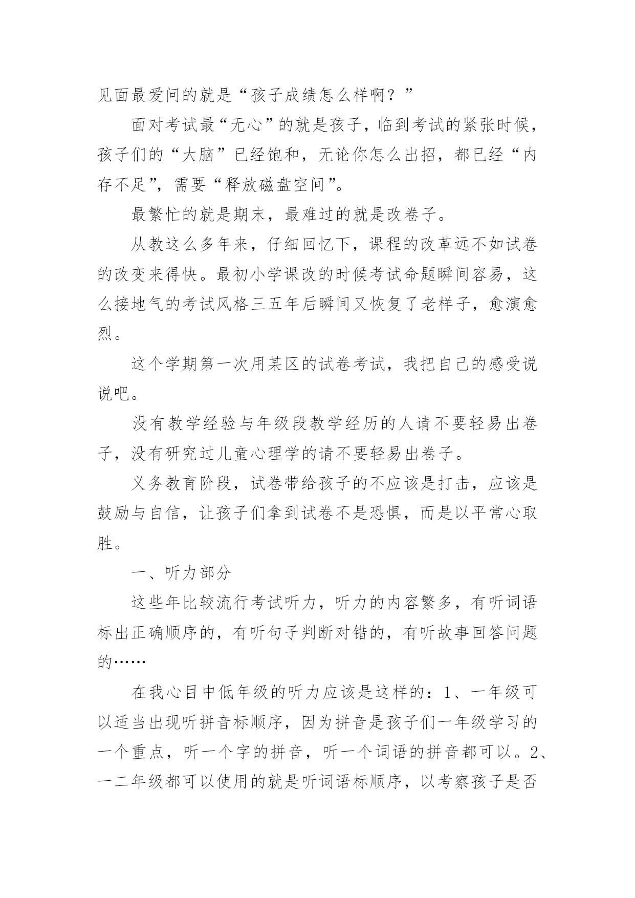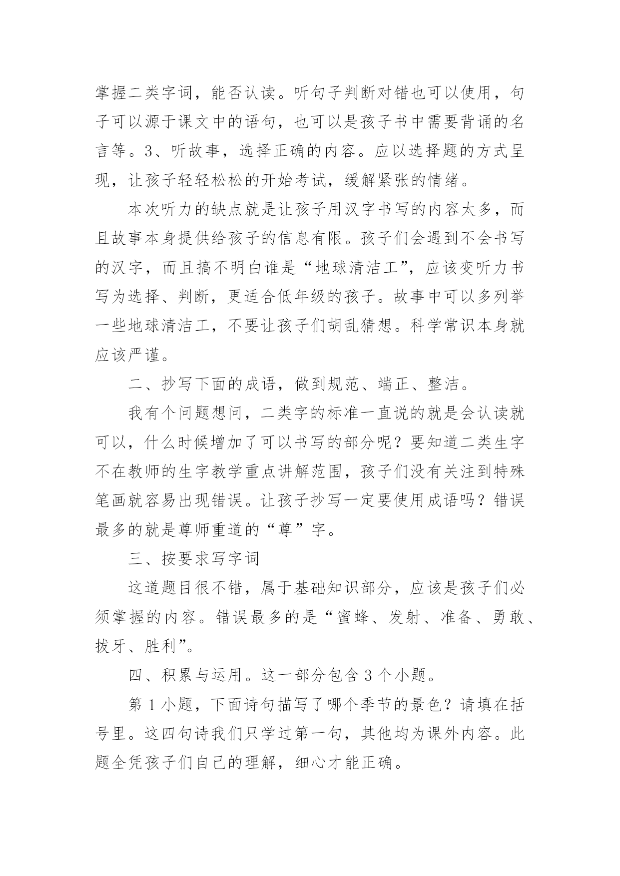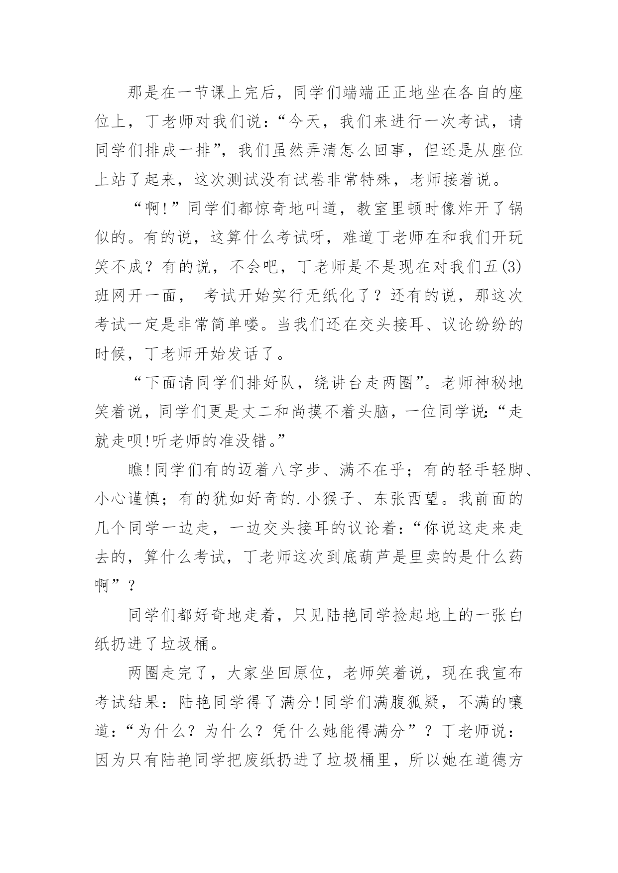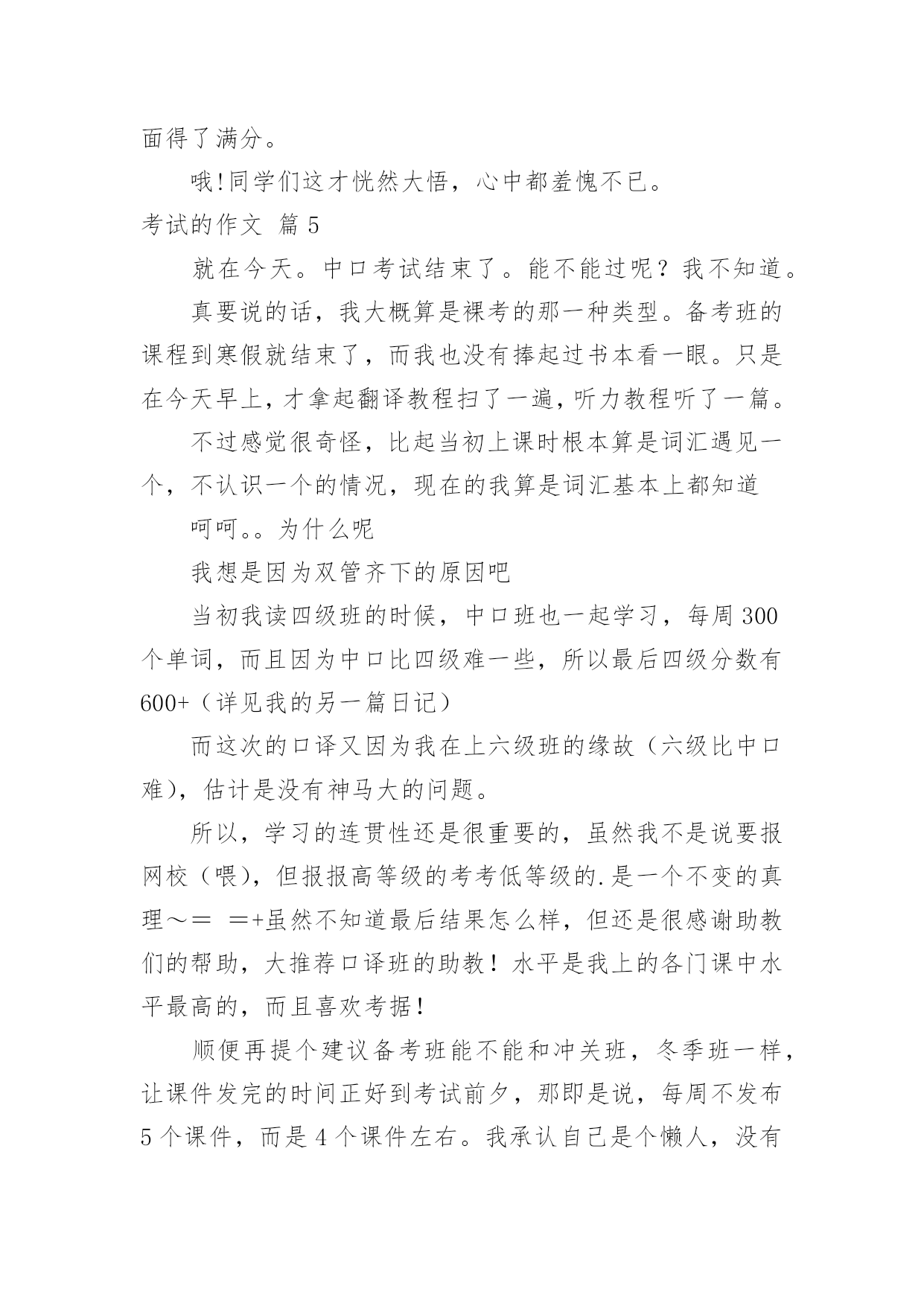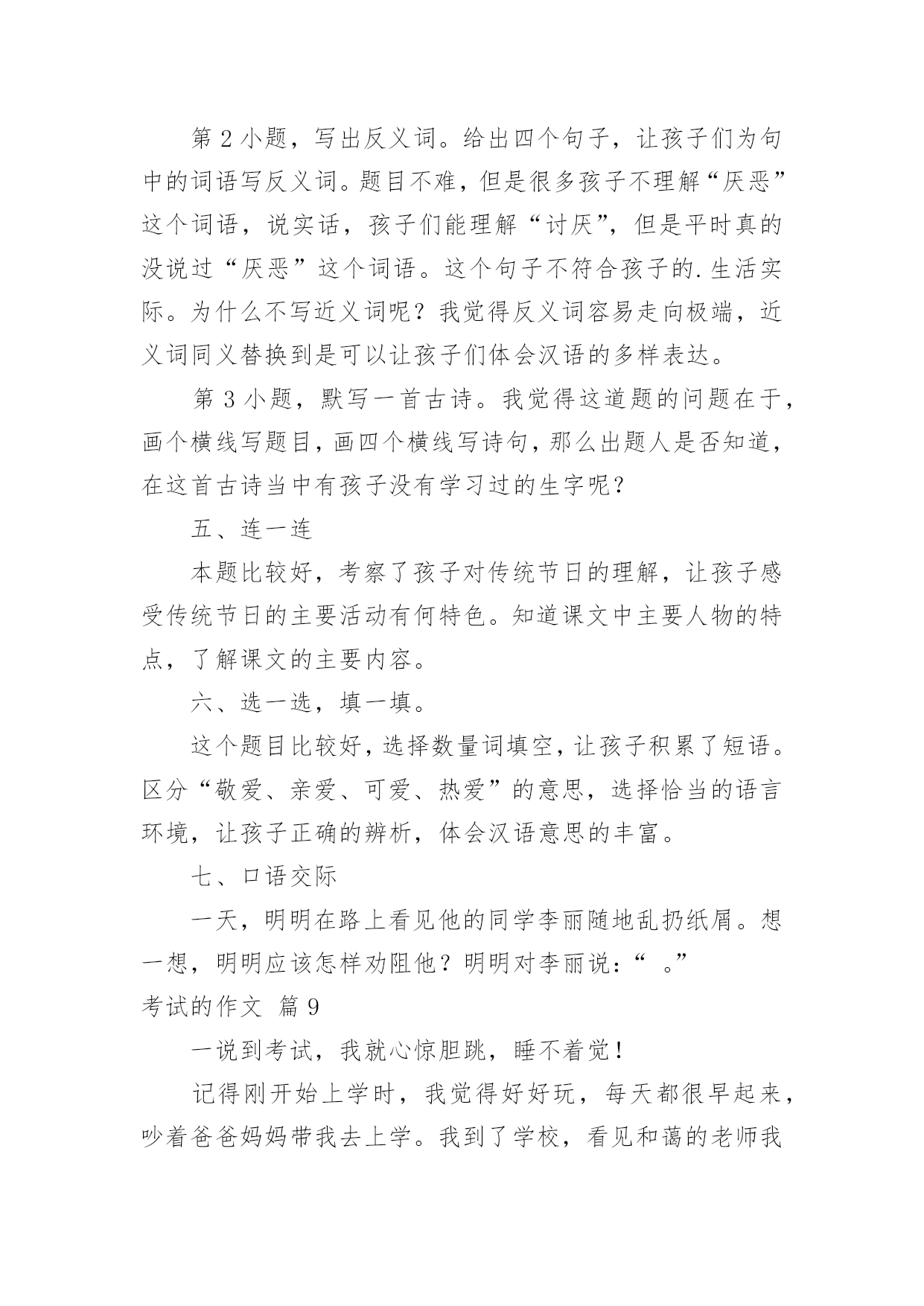 考试的作文考试的作文(合集9篇)在平日的学习、工作和生活里,大家都跟作文打过交道吧,通过作文可以把我们那些零零散散的思想,聚集在一块。你所见过的作文是什么样的呢?下面是小编帮大家整理的考试的作文10篇,欢迎大家借鉴与参考,希望对大家有所帮助。考试的作文篇1星期三,我们班要进行三、四单元的语文考试。我的心情非常激动,因为这两单元的内容对我来说太简单了。其他同学上课之前都在做考试前的准备,而我却悠闲地看着我喜爱的儿童漫画,心想:这么简单的题目,不用做题也能考98分以上。上课了,老师刚把试卷发下来,我就迅速的把题做完了,没检查一下就交给了老师,我满心期待的等着老师发试卷。第二天下午,第一节课胡老师就宣布发试卷,“他看试卷的速度真快啊!”我心想。这时班里像蜜蜂一样“嗡嗡”的,都在议论着自己的分数,我悄悄地看了看周围的同学,他们都信心百倍,脸上带着自豪的微笑看着自己的试卷。我的试卷怎么还没发给我,我焦急地左看右看。终于,我等不及了跑到讲台上找起我的试卷,“99、98-----”看着这么多的高分,我觉得我这次也准能得“98分”,这回向妈妈炫耀一下,准能带我去吃肯德基。一边想着,我一边焦急地扒拉着试卷,怎么没找到呢?抬头望了一下我的位置,发现我的试卷已被同学放在了桌子上,我以闪电式的速度冲到我的位置上,拿起试卷,抱在怀里,悄悄地瞄了一眼,“天啊”,才90分。我心里立刻像压了几块重重的石头。我反复地想着这刺眼的分数,内心感觉到一阵阵的刺痛,我的泪水从眼角中流了出来。发完试卷,老师把每个题都给我们详细地讲了一遍。可是,我却完全听不进去,呆呆地盯着考卷。直到老师走到我身旁时,我才开始听课。我真希望时间倒流,再考一遍。放学前,我趴到课桌上哭了起来,同学张瑞泽安慰我说:“失败乃成功之母。”放学回家后,我告诉妈妈这次没考好,妈妈抚摸着我的头说:“没关系,把这次考试的'原因总结一下,下次再考好就行了。”爸爸也一直安慰我,让我找找考差的原因。我反复看着考卷,发现我的薄弱环节就是阅读和词语解释。我要是多做一些这样的题目,这次考试也不至于这么差。于是,我暗暗下定决心给自己定了一个学习计划:一、上课认真听讲;二、课文提前预习;三、多看书、多阅读;四、端正自己的学习态度。我希望,下次考试换来的不是泪水,而是一个微笑。我希望,下次考试得到的不是安慰,而是自豪、骄傲。一分耕耘,一份收获。有付出,就会有回报。我坚信,通过我的努力,肯定能有一份完美的答卷。文考试的作文篇2经过一个学期的努力学习,终于迎来了这激动人心的时刻——那就是期末考试!虽然已经考过,但一想到这里,就不由的激动。“期末考试”这是一个充满希望和喜悦的字眼。考试日期定在1月28号,这是个看似普通的日子,可对我们来说是一个非常重要的日子。考试前两个星期,老师领着我们经过了漫长辛苦的复习,每天读读写写记记背背,想在辽阔无垠的大海上的一只没有动力的'小船,学习学不到头。终于到了1月28号,同学们都在“临阵磨枪,不利也光”的看语文书,我想肯定有一些同学是“临时抱佛脚”。到了是10点开始考数学了,我想“台下十年功,台上两分钟。”我要把学过的知识充分发挥到卷子上,考个好成绩。转头一看同学们都在“战场”上“冲锋杀敌”,我埋下了头开始写卷子。终于,考试结束了,心情豁然开朗,想把一块大石头从背上卸下来,感到很轻松,终于松了一口气,不过心里也有一点担心,不是知道这次我考得咋样,不过我终于可以美美的睡上一觉了!考试的作文篇3五一过完了,老师把成绩一个一个的读给同学们听。轮到我了,我才考了92。5,我把试卷拿给爸爸看,爸爸说;‘考的`差不多,但是,你有些题为什么有两道提没做。我说;时间不够了。我记住了这次教训,以后,我动作要快。考试的作文篇4我们班曾进行过一场没有试卷的考试,至今令我难忘。那是在一节课上完后,同学们端端正正地坐在各自的座位上,丁老师对我们说:“今天,我们来进行一次考试,请同学们排成一排”,我们虽然弄清怎么回事,但还是从座位上站了起来,这次测试没有试卷非常特殊,老师接着说。“啊!”同学们都惊奇地叫道,教室里顿时像炸开了锅似的。有的说,这算什么考试呀,难道丁老师在和我们开玩笑不成?有的说,不会吧,丁老师是不是现在对我们五(3)班网开一面,考试开始实行无纸化了?还有的说,那这次考试一定是非常简单喽。当我们还在交头接耳、议论纷纷的时候,丁老师开始发话了。“下面请同学们排好队,绕讲台走两圈”。老师神秘地笑着说,同学们更是丈二和尚摸不着头脑,一位同学说:“走就走呗!听老师的准没错。”瞧!同学们有的迈着八字步、满不在乎;有的轻手轻脚、小心谨慎;有的犹如好奇的.小猴子、东张西望。我前面的几个同学一边走,一边交头接耳的议论着:“你说这走来走去的,算什么考试,丁老师这次到底葫芦是里卖的是什么药啊”?同学们都好奇地走着,只见陆艳同学