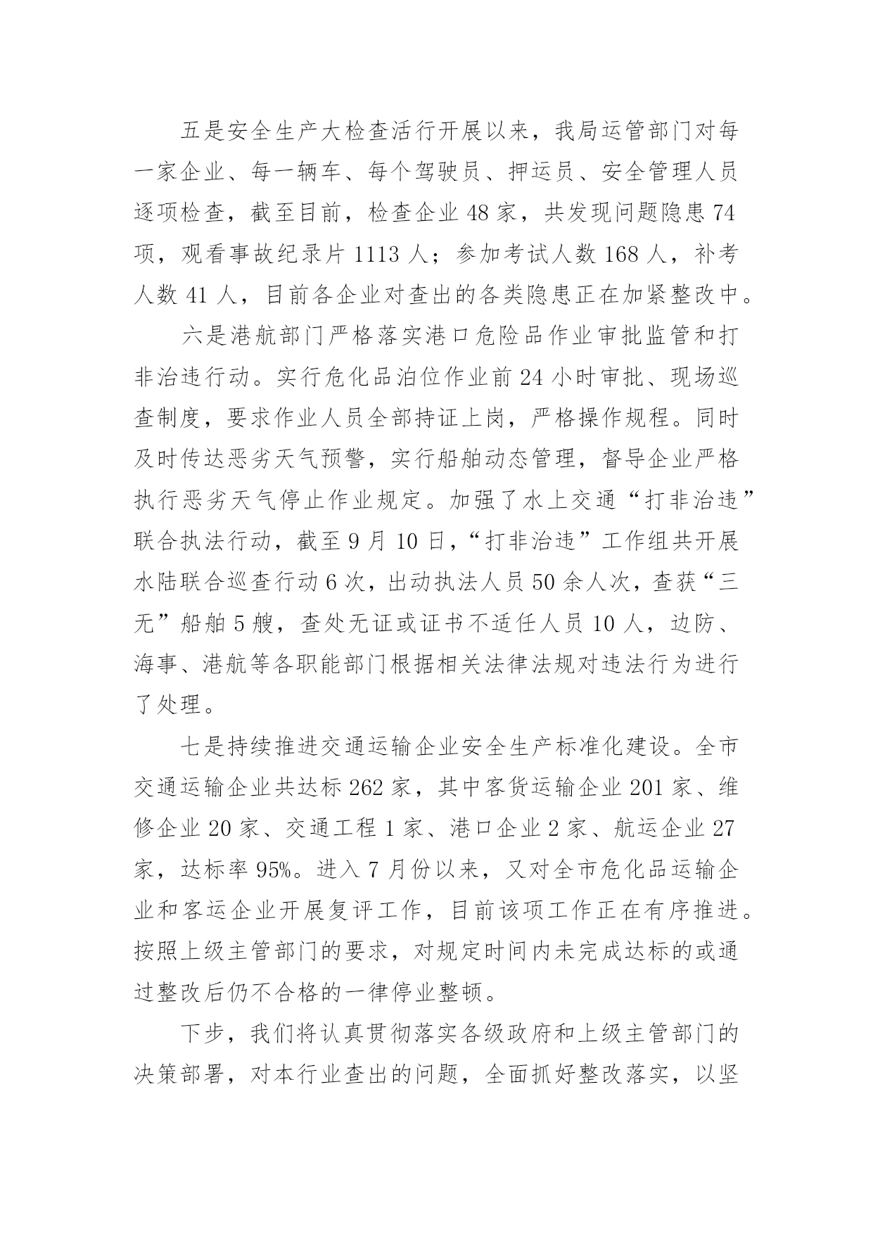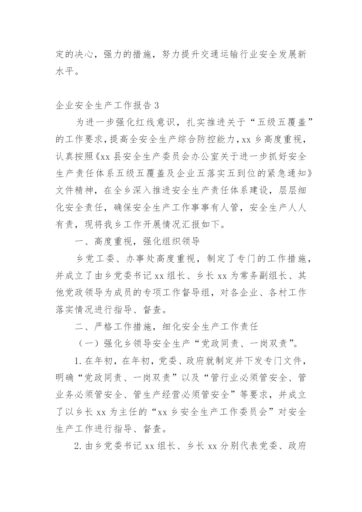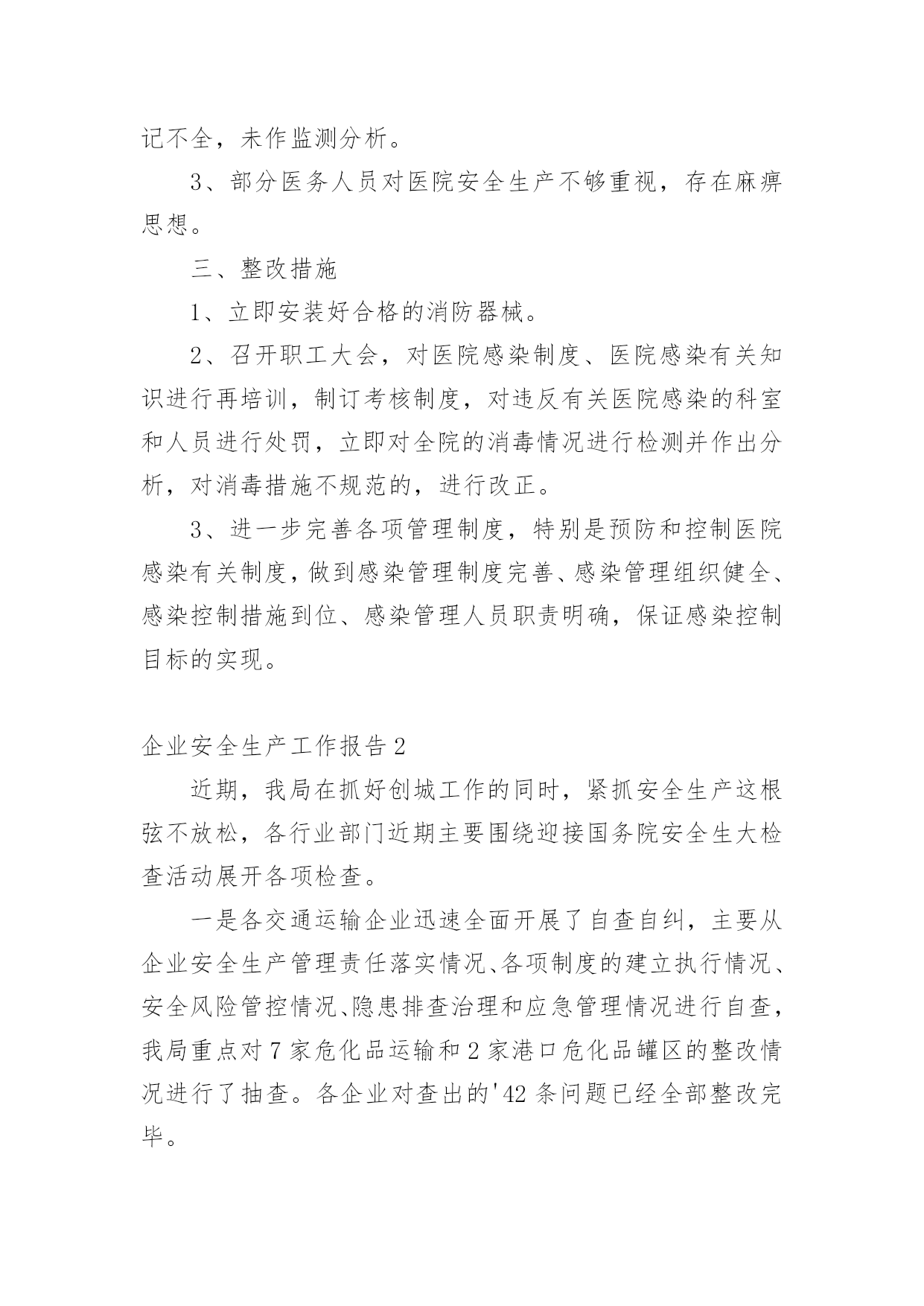 企业安全生产工作报告在经济发展迅速的今天,需要使用报告的情况越来越多,写报告的时候要注意内容的完整。一听到写报告马上头昏脑涨?以下是小编为大家收集的企业安全生产工作报告,仅供参考,希望能够帮助到大家。企业安全生产工作报告1根据市卫生局《南安市安全生产委员会关于下发全市立即开展全市安全生产大检查方案的通知》现结合我院安全生产有关内容,我院组织人员对上述各项工作进行了认真的自查和整改,现总结报告如下:一、检查内容(一)安全生产情况:院安全生产管理领导小组对全院进行了一次彻底检查,包括各项安全生产规章制度制定及落实情况。用电及消防情况,易燃、易爆、麻毒药品等危险品管理以及医疗安全管理等项目,具体情况如下:1、组织领导领导责任制落实情况良好,成立了由院长为组长的安全生产领导小组,值班人员到位,各项规章制度健全。2、预防医疗事故方面落实了医疗安全的各项核心制度,急危重症患者的.抢救措施到位。医疗安全的各项硬件设施完善,供应室、手术室等科室设施建设规范。医疗废物处理的各项规章制度健全,处理方式符合标准,做到了有专人管理并责任到人。3、突发公共卫生事件应急处置和医疗卫生保障方面针对可能发生的突发公共卫生事件和灾害事故,制定有相关应急处理预案,成立了医疗卫生应急救援队伍,保持通讯畅通,建立医疗救援、卫生防疫等应急物资储备。4、治安保卫和消防方面建立了突发事件应急预案,完善了治安保卫和消防职责、工作制度,人员值班落实到位。重点要害科室的防护责任措施落实。(二)医院内感染及消毒安全1、成立了医院感染管理委员会和医院感染管理办公室,有具体的办公人员,工作人员职责明确。2、制订了《医院感染管理制度》、《医院感染控制方案》《医院感染控制、隔离措施》《消毒隔离制度.《合理使用抗生素管理办法》《消毒灭菌效果监测制度》《治疗室消毒隔离管理制度》《供应室、手术室、产房消毒隔离制度》《产房保洁措施》《医疗废物处理管理制度》等医院感染预防、控制制度。3、制订了医院消毒隔离登记制度,对消毒效果进行了检测。4、全院医务人员均参加了有关医院感染知识的培训。二、发现的问题1、消防器械未落实到位。2、感染制度落实不到位,消毒效果监测不够及时,登记不全,未作监测分析。3、部分医务人员对医院安全生产不够重视,存在麻痹思想。三、整改措施1、立即安装好合格的消防器械。2、召开职工大会,对医院感染制度、医院感染有关知识进行再培训,制订考核制度,对违反有关医院感染的科室和人员进行处罚,立即对全院的消毒情况进行检测并作出分析,对消毒措施不规范的,进行改正。3、进一步完善各项管理制度,特别是预防和控制医院感染有关制度,做到感染管理制度完善、感染管理组织健全、感染控制措施到位、感染管理人员职责明确,保证感染控制目标的实现。企业安全生产工作报告2近期,我局在抓好创城工作的同时,紧抓安全生产这根弦不放松,各行业部门近期主要围绕迎接国务院安全生大检查活动展开各项检查。一是各交通运输企业迅速全面开展了自查自纠,主要从企业安全生产管理责任落实情况、各项制度的建立执行情况、安全风险管控情况、隐患排查治理和应急管理情况进行自查,我局重点对7家危化品运输和2家港口危化品罐区的整改情况进行了抽查。各企业对查出的'42条问题已经全部整改完毕。二是认真开展道路隐患排查,全力做好整改。对14条县乡公路共226.6公里的公路沿线进行了拉网式排查,对所有城乡公交、校车通行线路进行了安全隐患排查,制定了相应的整治方案。同时,我们建立完善农村公路安全生命防护工程工作台账,狠抓道路交通安全隐患整改,整改一处、销号一处。经过前期认真细致排查,全市共排查出县乡公路安全隐患279处,其中县级公路57处,安装警示标志、警示桩78块(根),道路标线27169平方米,清理限宽墩5处,镇村路整改安装70处,爆闪灯152盏。三是保持了对扰乱客运市场和危化品运输等违法违规行为的严管高压态势。继续加强与公安交警部门的联合执法,截止到9月10日,我局共立案586起,罚款193.14万元,查处危化品运输车169辆,罚款59.6万元;查处黑出租、网约车、违章客运车175辆,罚款90万元。四是在开展安全生产大检查的同时,我局扎实深入开展危化品行业大快严行动,自行动开展以来,通过政府购买服务的方式,委托第三方对全市危化品道路运输企业和港口危化品储存企业安全隐患进行了详细排查,对检查出来的一般性问题隐患,要立即整改,一时难以解决的,制定整改方案,限期完成。到目前,通过排查发现危化品运输企业46处隐患,查出港口危化品仓储企业问题隐患19条,下达限期整改通知书3份。为确保紧急行动取得实效,我局各行业执法单位采用突查暗访、随机抽查及“回头看”等多种方式,逐企排查隐患、督促整改,推动行动落实。五是安全生产大检查活行开展以来,我局运管部门对每一家企业、每一辆车、