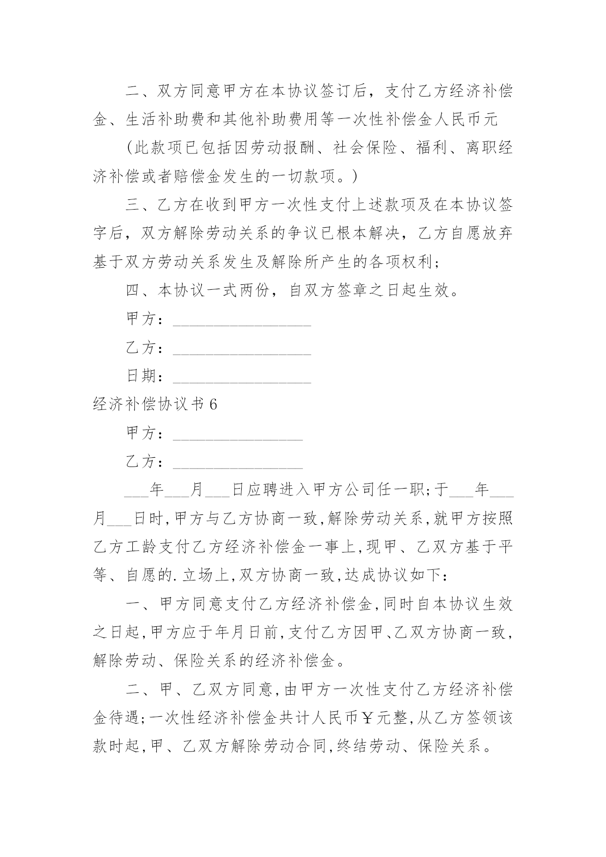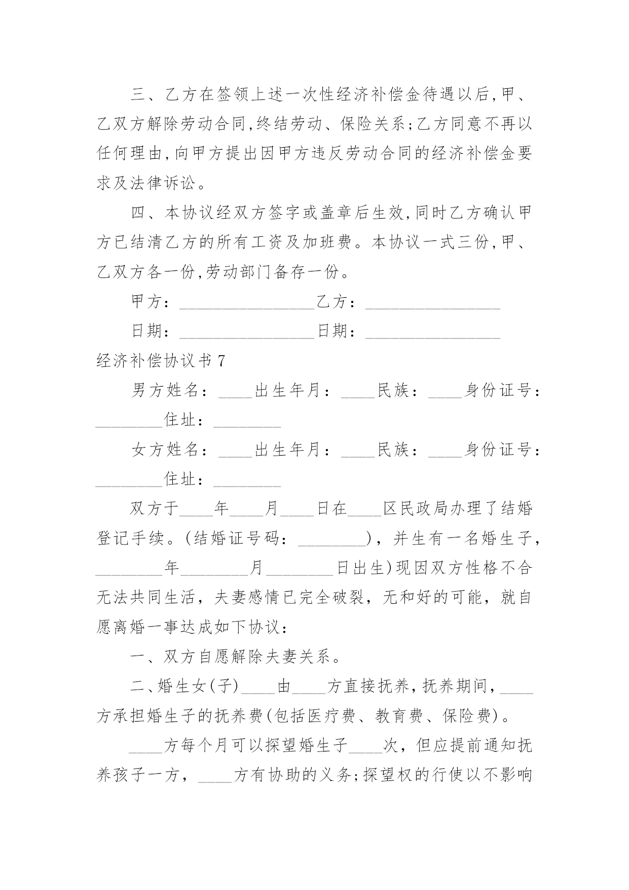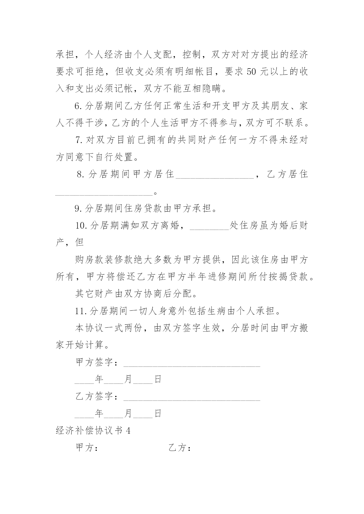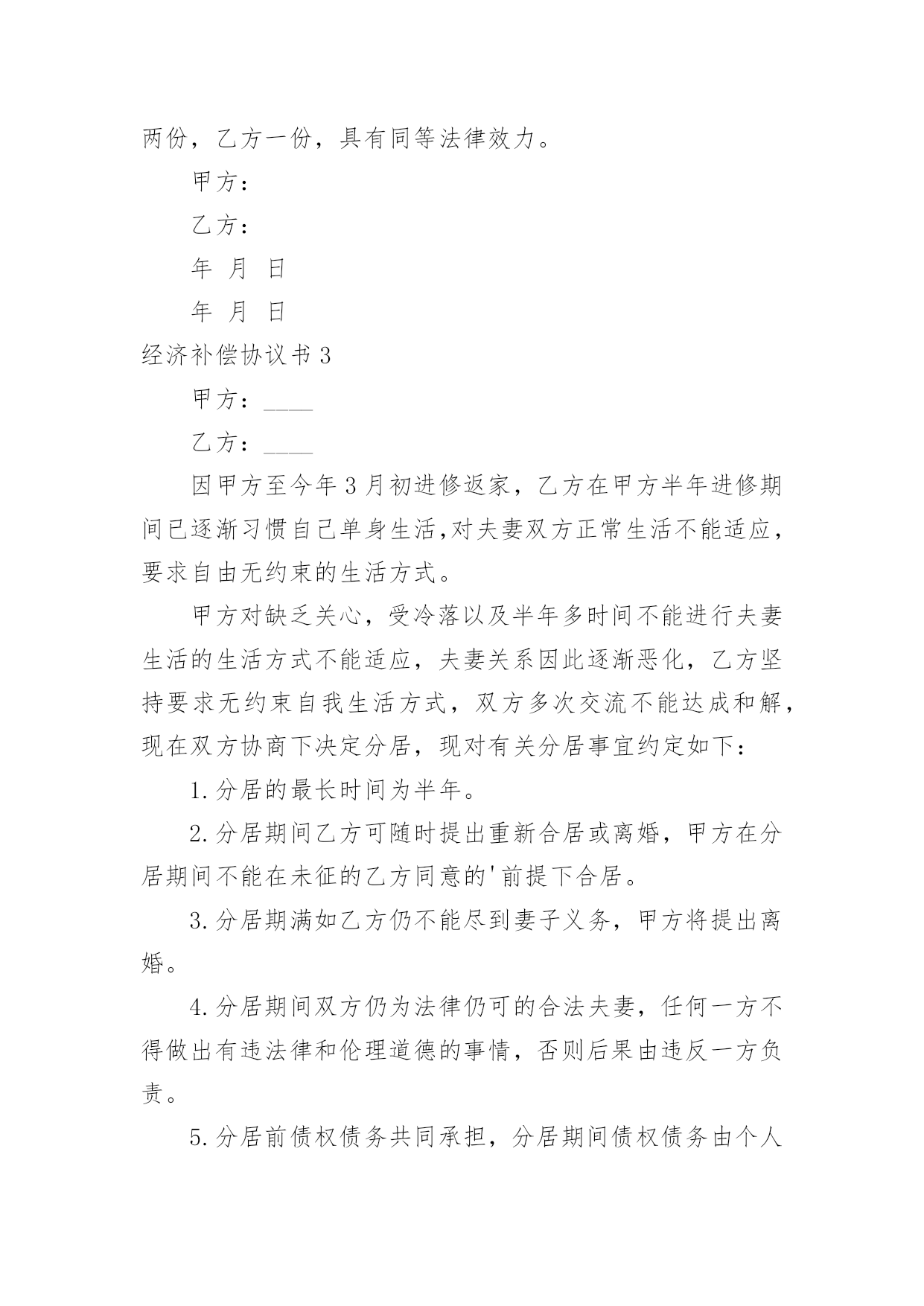 经济补偿协议书经济补偿协议书在学习、工作生活中,我们用到协议的地方越来越多,签订协议是提高经济效益的手段。我敢肯定,大部分人都对拟定协议很是头疼的,以下是小编收集整理的经济补偿协议书,仅供参考,大家一起来看看吧。经济补偿协议书1被拆迁人(以下简称甲方):拆迁人(以下简称乙方):根据《民法通则》、《合同法》和《土地管理法》的有关规定,双方本着平等自愿的原则,就拆迁补偿一事达成如下协议:一、被拆迁人情况:甲方目前家庭成员共有名,其分别为(男)、(女)二、拆迁人情况:乙方根据我国有关法律已经取得拆迁人资格证,乙方承诺将依法与甲方就拆迁补偿情况达成协议。三、房屋补偿:甲方目前所有房屋的建筑面积为平方米,其中包括套内建筑面积平方米、公摊建筑面积平方米;经过双方共同委托具备房地产评估资格的评估机构的评估,此等房屋所有权的单位价格为元/平方米,故甲方拥有房屋所有权的合计价值为元。四、土地补偿:甲方目前房屋所占土地共有平方米,其中甲方享有专有土地使用权的有平方米,甲方与其他人共有土地使用权的有平方米;经过双方共同委托具备房地产评估资格的评估机构的评估,此等土地使用权的单位价格为元/平方米,故甲方拥有土地使用权的.合计价值为元。五、其他补偿:考虑到甲方长期居住于此地,搬离家园将给甲方造成诸多不便,本着奖励补偿的原则,乙方承诺除房屋补偿金与土地补偿金以外,还应当向甲方支付以下补偿金:1、电话号码变更费用:2、有线电视安装成本:3、交通运输费用:六、补偿金支付方式:根据双方之协议,乙方共计支付甲方补偿金元,乙方承诺将在年月日前,一次性将全部补偿金支付到甲方所银行帐户:银行帐号。七、禁止行为:考虑到甲方的弱势地位,乙方承诺在双方没有达成协议以前,绝对不会采取任何停水、停电、停暖等行为来影响甲方的正常生活,否则乙方将向甲方每天支付100元赔偿金。八、争议解决:双方如有争议,将交由北京仲裁委员会解决。九、其他:本协议壹式陆份,双方各执叁份,乙方提交房屋行政管理机构壹份。被拆迁人(以下简称甲方):拆迁人(以下简称乙方):年月日年月日经济补偿协议书2甲方:乙方:身份证号:从年月日开始,乙方在甲方处工作,迄今为止,工作年限为个月,现甲乙双方协商一致后,解除双方的劳动关系,双方依据《劳动合同法》的相关规定,在平等、公平、协商一致的.原则下,签订如下协议,以资共同准守:第一、甲乙双方自本协议签订后,解除劳动关系。第二、甲方一次性支付乙方经济补偿金元。经济补偿金按乙方在甲方处工作的年限,每满一年支付一个月工资的标准向乙方支付。六个月以上不满一年的,按一年计算;不满六个月的,向乙方支付半个月工资的经济补偿金。第三、乙方签订本协议后,应返还工衣、工牌等代表甲方标志的所有物品及材料,应配合甲方办理相关离职手续,协议签订后,乙方不得再以甲方及甲方员工的名义对外进行任何交易行为。第四、乙方在签订本协议时,应对甲方进行工作交底,向甲方书面汇报其未完成的业务活动,否则,视为乙方违约。第五、本协议签订后,双方再无任何权利义务关系,乙方不得以任何方式(包括但不限于劳动仲裁、诉讼等方式)向甲方主张权利,否则,视为乙方违约,乙方应向甲方支付违约金元。第六、甲乙双方已完全清楚明白上述条款的意思,表示愿意按照协议约定履行。第七、本协议自双方签字盖章后生效,一式三份,甲方两份,乙方一份,具有同等法律效力。甲方:乙方:年月日年月日经济补偿协议书3甲方:____乙方:____因甲方至今年3月初进修返家,乙方在甲方半年进修期间已逐渐习惯自己单身生活,对夫妻双方正常生活不能适应,要求自由无约束的生活方式。甲方对缺乏关心,受冷落以及半年多时间不能进行夫妻生活的生活方式不能适应,夫妻关系因此逐渐恶化,乙方坚持要求无约束自我生活方式,双方多次交流不能达成和解,现在双方协商下决定分居,现对有关分居事宜约定如下:1.分居的最长时间为半年。2.分居期间乙方可随时提出重新合居或离婚,甲方在分居期间不能在未征的乙方同意的'前提下合居。3.分居期满如乙方仍不能尽到妻子义务,甲方将提出离婚。4.分居期间双方仍为法律仍可的合法夫妻,任何一方不得做出有违法律和伦理道德的事情,否则后果由违反一方负责。5.分居前债权债务共同承担,分居期间债权债务由个人承担,个人经济由个人支配,控制,双方对对方提出的经济要求可拒绝,但收支必须有明细帐目,要求50元以上的收入和支出必须记帐,双方不能互相隐瞒。6.分居期间乙方任何正常生活和开支甲方及其朋友、家人不得干涉,乙方的个人生活甲方不得参与,双方可不联系。7.对双方目前已拥有的共同财产任何一方不得未经对方同意下自行处置。8.分居期间甲方居住________________,乙方居住____________________。9.分居期间住房贷款由甲方承担。10.分居期满如双方离婚,_____