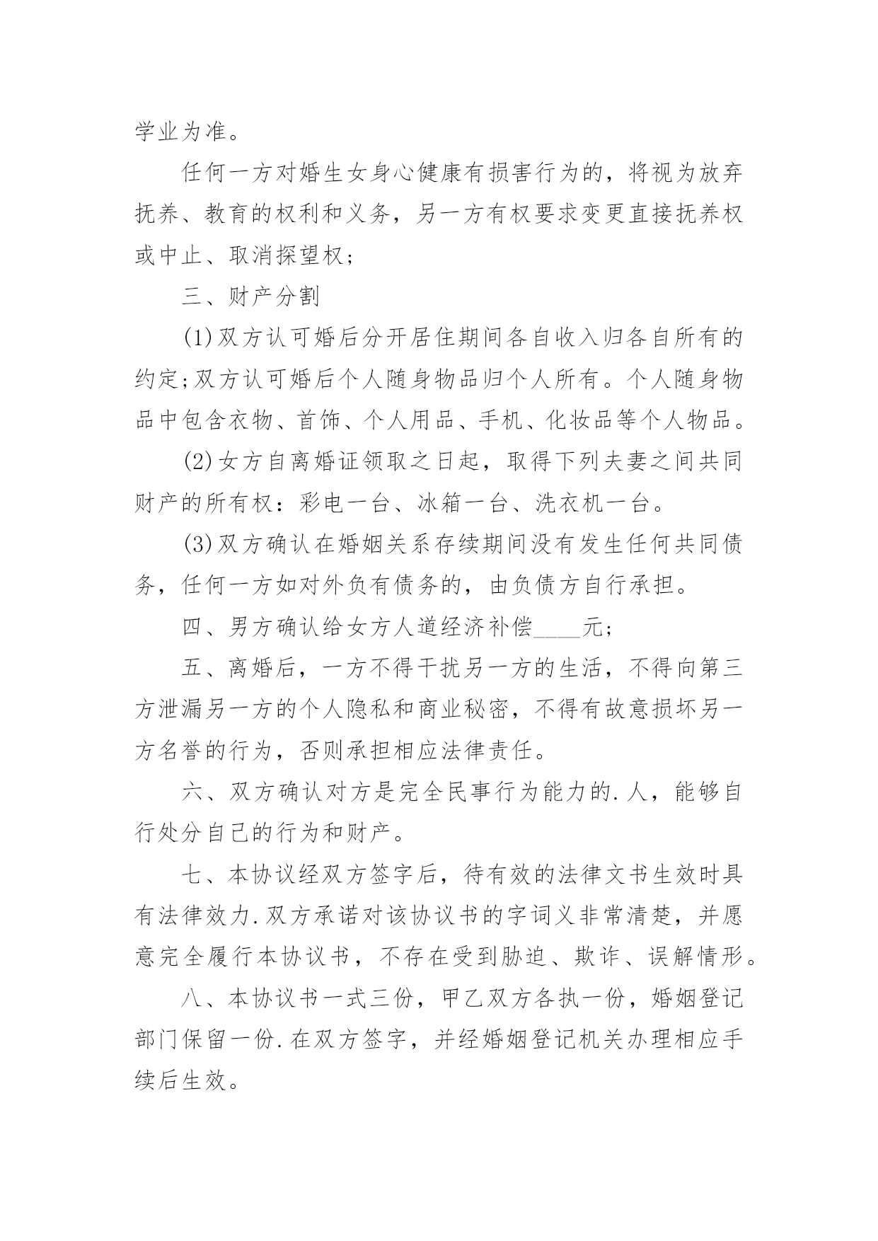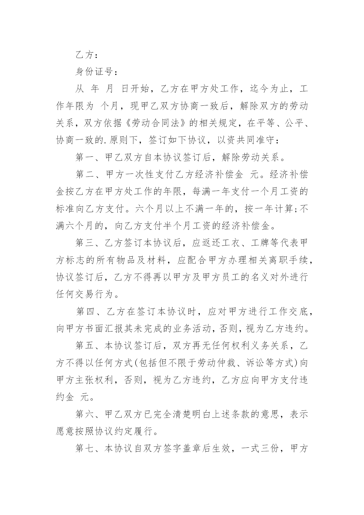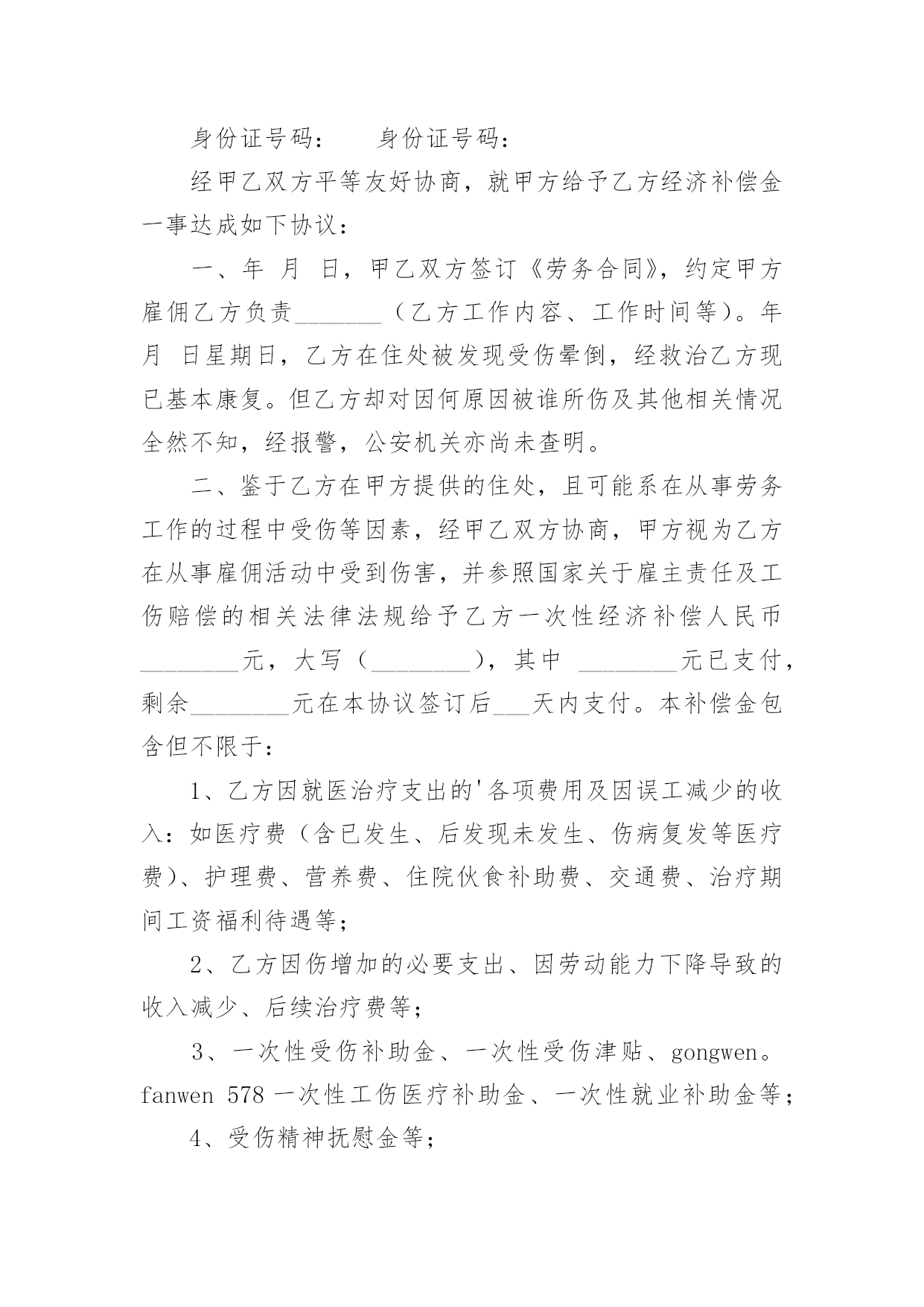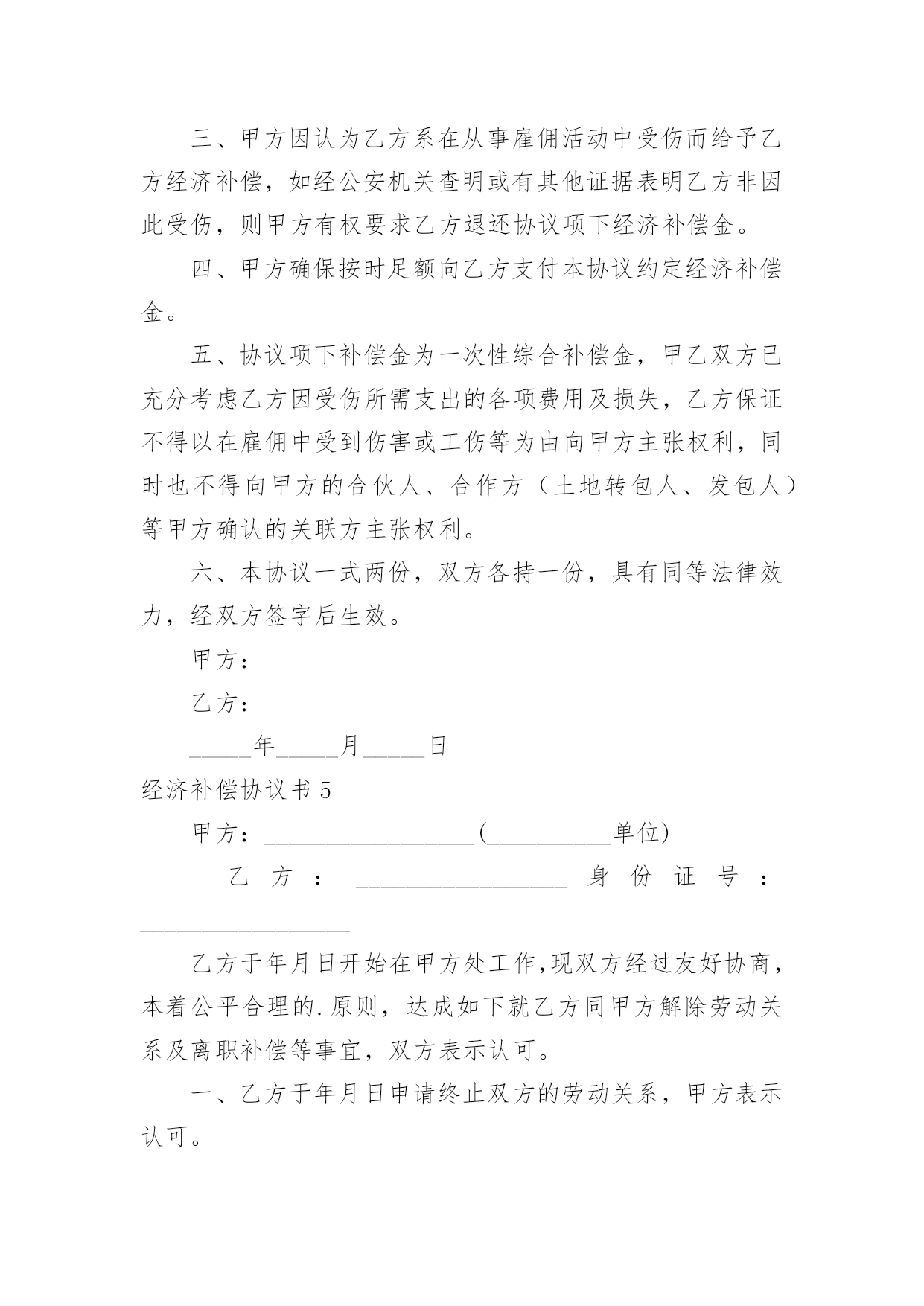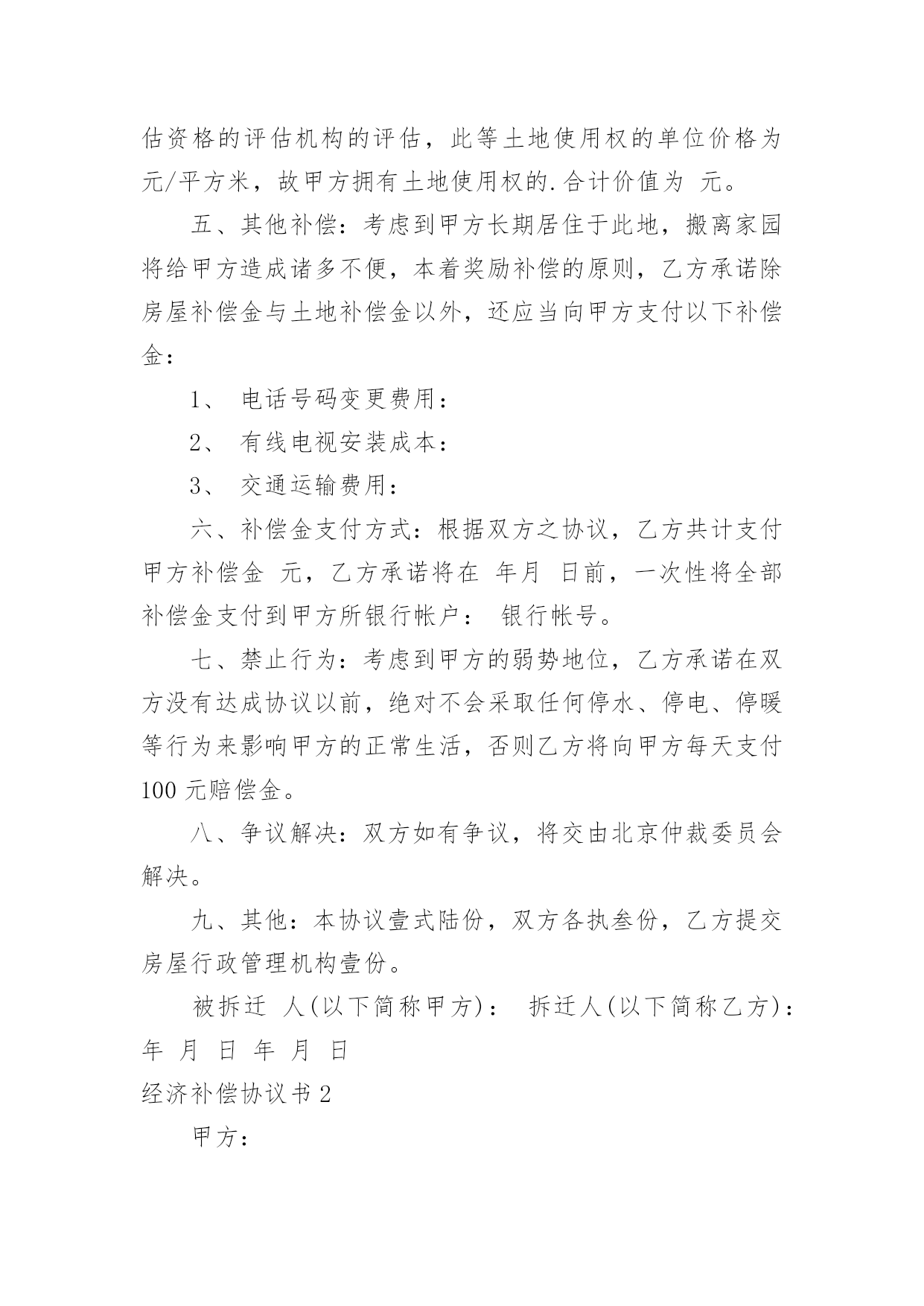 经济补偿协议书经济补偿协议书在学习、工作生活中,我们用到协议的地方越来越多,签订协议是提高经济效益的手段。我敢肯定,大部分人都对拟定协议很是头疼的,以下是小编收集整理的经济补偿协议书,仅供参考,大家一起来看看吧。经济补偿协议书1被拆迁人(以下简称甲方):拆迁人(以下简称乙方):根据《民法通则》、《合同法》和《土地管理法》的有关规定,双方本着平等自愿的原则,就拆迁补偿一事达成如下协议:一、被拆迁人情况:甲方目前家庭成员共有名,其分别为(男)、(女)二、拆迁人情况:乙方根据我国有关法律已经取得拆迁人资格证,乙方承诺将依法与甲方就拆迁补偿情况达成协议。三、房屋补偿:甲方目前所有房屋的建筑面积为平方米,其中包括套内建筑面积平方米、公摊建筑面积平方米;经过双方共同委托具备房地产评估资格的评估机构的评估,此等房屋所有权的单位价格为元/平方米,故甲方拥有房屋所有权的合计价值为元。四、土地补偿:甲方目前房屋所占土地共有平方米,其中甲方享有专有土地使用权的有平方米,甲方与其他人共有土地使用权的有平方米;经过双方共同委托具备房地产评估资格的评估机构的评估,此等土地使用权的单位价格为元/平方米,故甲方拥有土地使用权的.合计价值为元。五、其他补偿:考虑到甲方长期居住于此地,搬离家园将给甲方造成诸多不便,本着奖励补偿的原则,乙方承诺除房屋补偿金与土地补偿金以外,还应当向甲方支付以下补偿金:1、电话号码变更费用:2、有线电视安装成本:3、交通运输费用:六、补偿金支付方式:根据双方之协议,乙方共计支付甲方补偿金元,乙方承诺将在年月日前,一次性将全部补偿金支付到甲方所银行帐户:银行帐号。七、禁止行为:考虑到甲方的弱势地位,乙方承诺在双方没有达成协议以前,绝对不会采取任何停水、停电、停暖等行为来影响甲方的正常生活,否则乙方将向甲方每天支付100元赔偿金。八、争议解决:双方如有争议,将交由北京仲裁委员会解决。九、其他:本协议壹式陆份,双方各执叁份,乙方提交房屋行政管理机构壹份。被拆迁人(以下简称甲方):拆迁人(以下简称乙方):年月日年月日经济补偿协议书2甲方:乙方:身份证号:从年月日开始,乙方在甲方处工作,迄今为止,工作年限为个月,现甲乙双方协商一致后,解除双方的劳动关系,双方依据《劳动合同法》的相关规定,在平等、公平、协商一致的.原则下,签订如下协议,以资共同准守:第一、甲乙双方自本协议签订后,解除劳动关系。第二、甲方一次性支付乙方经济补偿金元。经济补偿金按乙方在甲方处工作的年限,每满一年支付一个月工资的标准向乙方支付。六个月以上不满一年的,按一年计算;不满六个月的,向乙方支付半个月工资的经济补偿金。第三、乙方签订本协议后,应返还工衣、工牌等代表甲方标志的所有物品及材料,应配合甲方办理相关离职手续,协议签订后,乙方不得再以甲方及甲方员工的名义对外进行任何交易行为。第四、乙方在签订本协议时,应对甲方进行工作交底,向甲方书面汇报其未完成的业务活动,否则,视为乙方违约。第五、本协议签订后,双方再无任何权利义务关系,乙方不得以任何方式(包括但不限于劳动仲裁、诉讼等方式)向甲方主张权利,否则,视为乙方违约,乙方应向甲方支付违约金元。第六、甲乙双方已完全清楚明白上述条款的意思,表示愿意按照协议约定履行。第七、本协议自双方签字盖章后生效,一式三份,甲方两份,乙方一份,具有同等法律效力。甲方:乙方:年月日年月日经济补偿协议书3甲方:____乙方:____因甲方至今年3月初进修返家,乙方在甲方半年进修期间已逐渐习惯自己单身生活,对夫妻双方正常生活不能适应,要求自由无约束的生活方式。甲方对缺乏关心,受冷落以及半年多时间不能进行夫妻生活的生活方式不能适应,夫妻关系因此逐渐恶化,乙方坚持要求无约束自我生活方式,双方多次交流不能达成和解,现在双方协商下决定分居,现对有关分居事宜约定如下:1.分居的最长时间为半年。2.分居期间乙方可随时提出重新合居或离婚,甲方在分居期间不能在未征的乙方同意的'前提下合居。3.分居期满如乙方仍不能尽到妻子义务,甲方将提出离婚。4.分居期间双方仍为法律仍可的合法夫妻,任何一方不得做出有违法律和伦理道德的事情,否则后果由违反一方负责。5.分居前债权债务共同承担,分居期间债权债务由个人承担,个人经济由个人支配,控制,双方对对方提出的经济要求可拒绝,但收支必须有明细帐目,要求50元以上的收入和支出必须记帐,双方不能互相隐瞒。6.分居期间乙方任何正常生活和开支甲方及其朋友、家人不得干涉,乙方的个人生活甲方不得参与,双方可不联系。7.对双方目前已拥有的共同财产任何一方不得未经对方同意下自行处置。8.分居期间甲方居住________________,乙方居住____________________。9.分居期间住房贷款由甲方承担。10.分居期满如双方离婚,_____