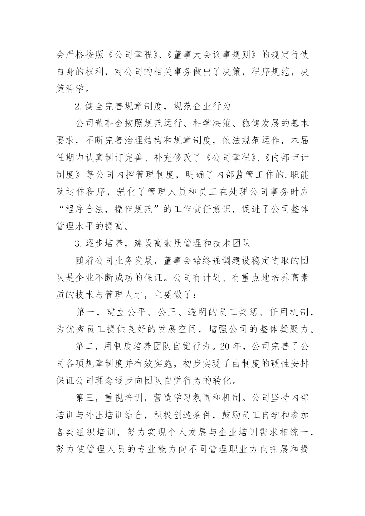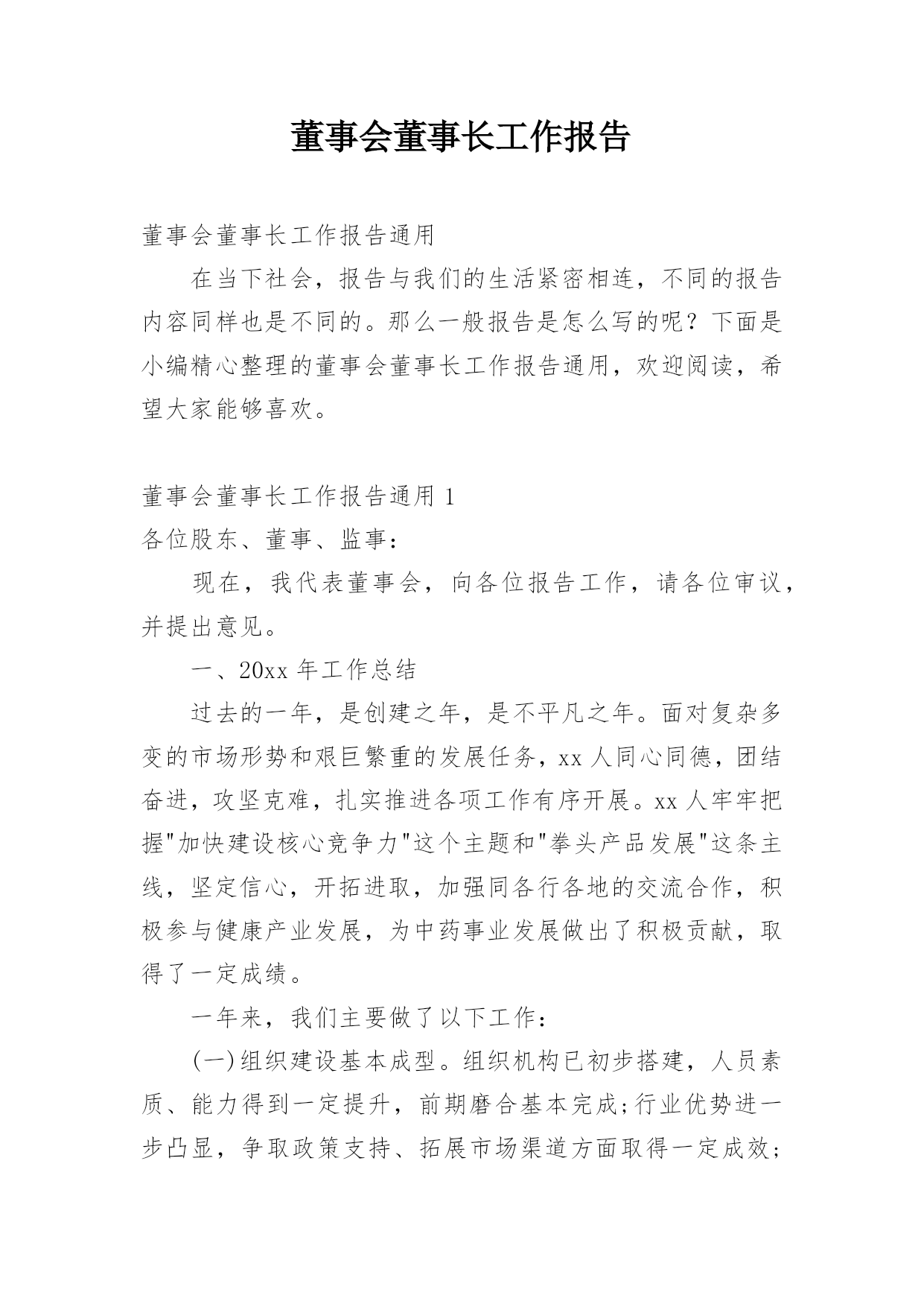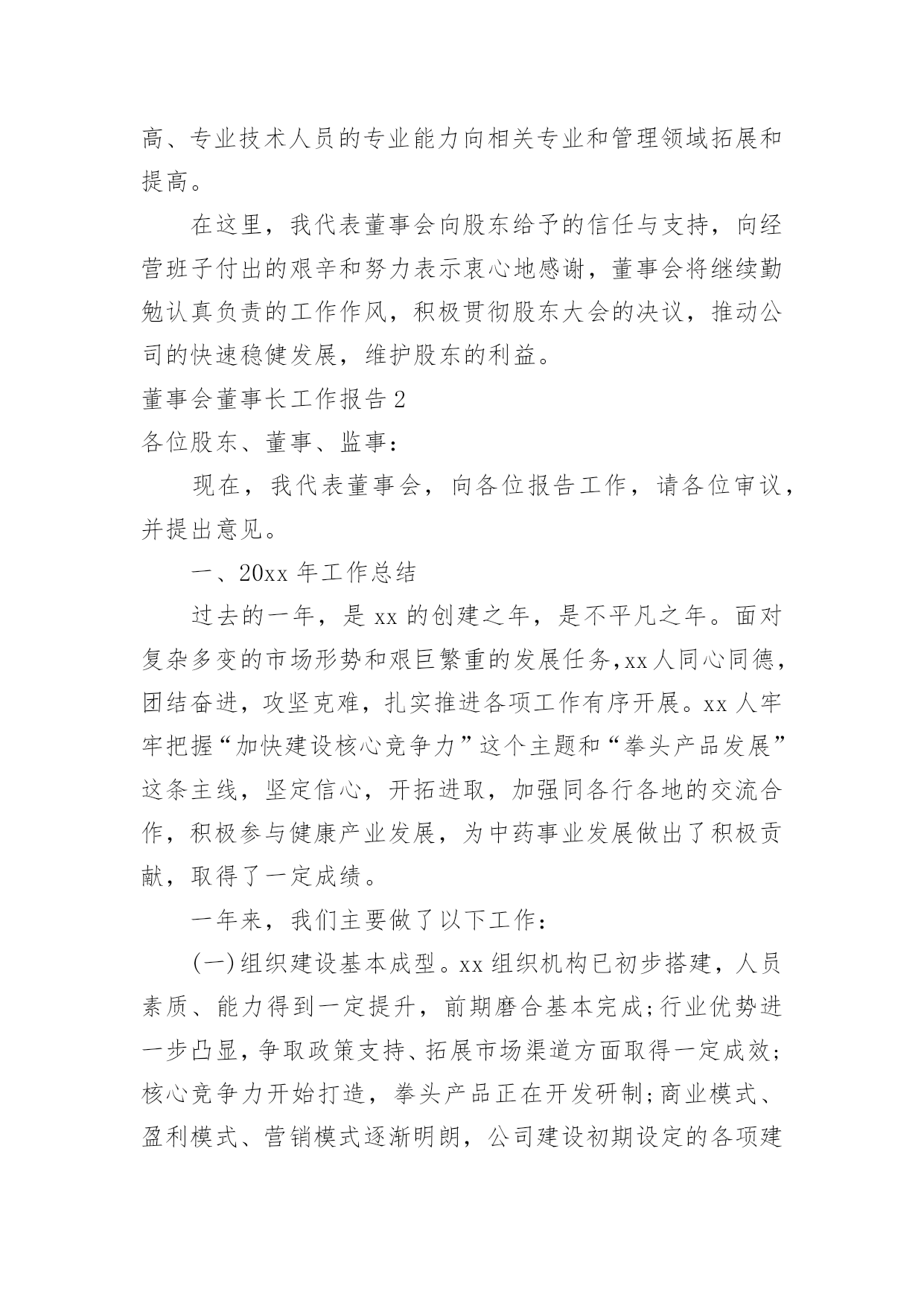 董事会董事长工作报告董事会董事长工作报告随着个人的素质不断提高,报告对我们来说并不陌生,不同种类的报告具有不同的用途。那么大家知道标准正式的报告格式吗?下面是小编帮大家整理的董事会董事长工作报告,欢迎阅读与收藏。董事会董事长工作报告1各位董事:20xx年,公司在董事会的领导下,坚持努力实现公司上市提升公司整体水平为目的,以落实生产经营指标为主要目标,以回报股东为宗旨,经过管理层和全体员工的共同努力,基本完成了公司董事会年初确定的各项经济指标和工作目标。受董事会委托,我在此做20年度董事会工作报告,请各位董事审议。1.依法认真履职,做好日常工作报告期内,董事会共召开次会议,历次大会的召集、提案、出席、议事、表决及会议记录均按照《公司法》、《公司章程》的相关要求规范运作,公司全体董事基本都亲自出席了历次董事会。会议议程主要涉及公司高管的任聘、20年度工作报告和20年度经营计划、20年度公司财务决算报告、20年度财务预算报告、20年度利润分配预案等。报告期内,公司董事大会严格按照《公司章程》、《董事大会议事规则》的规定行使自身的权利,对公司的相关事务做出了决策,程序规范,决策科学。2.健全完善规章制度,规范企业行为公司董事会按照规范运行、科学决策、稳健发展的基本要求,不断完善治理结构和规章制度,依法规范运作,本届任期内认真制订完善、补充修改了《公司章程》、《内部审计制度》等公司内控管理制度,明确了内部监管工作的.职能及运作程序,强化了管理人员和员工在处理公司事务时应“程序合法,操作规范”的工作责任意识,促进了公司整体管理水平的提高。3.逐步培养,建设高素质管理和技术团队随着公司业务发展,董事会始终强调建设稳定进取的团队是企业不断成功的保证。公司有计划、有重点地培养高素质的技术与管理人才,主要做了:第一,建立公平、公正、透明的员工奖惩、任用机制,为优秀员工提供良好的发展空间,增强公司的整体凝聚力。第二,用制度培养团队自觉行为。20年,公司完善了公司各项规章制度并有效实施,初步实现了由制度的硬性安排保证公司理念逐步向团队自觉行为的转化。第三,重视培训,营造学习氛围和机制。公司坚持内部培训与外出培训结合,积极创造条件,鼓励员工自学和参加各类组织培训,努力实现个人发展与企业培训需求相统一,努力使管理人员的专业能力向不同管理职业方向拓展和提高、专业技术人员的专业能力向相关专业和管理领域拓展和提高。在这里,我代表董事会向股东给予的信任与支持,向经营班子付出的艰辛和努力表示衷心地感谢,董事会将继续勤勉认真负责的工作作风,积极贯彻股东大会的决议,推动公司的快速稳健发展,维护股东的利益。董事会董事长工作报告2各位股东、董事、监事:现在,我代表董事会,向各位报告工作,请各位审议,并提出意见。一、20xx年工作总结过去的一年,是xx的创建之年,是不平凡之年。面对复杂多变的市场形势和艰巨繁重的发展任务,xx人同心同德,团结奋进,攻坚克难,扎实推进各项工作有序开展。xx人牢牢把握“加快建设核心竞争力”这个主题和“拳头产品发展”这条主线,坚定信心,开拓进取,加强同各行各地的交流合作,积极参与健康产业发展,为中药事业发展做出了积极贡献,取得了一定成绩。一年来,我们主要做了以下工作:(一)组织建设基本成型。xx组织机构已初步搭建,人员素质、能力得到一定提升,前期磨合基本完成;行业优势进一步凸显,争取政策支持、拓展市场渠道方面取得一定成效;核心竞争力开始打造,拳头产品正在开发研制;商业模式、盈利模式、营销模式逐渐明朗,公司建设初期设定的各项建设指标开始实现。(二)基地建设初见成效。1、凉山州中药材种植及实验基地:(1)“越西县当归种植基地”共计2730亩,目前种植基地处于当归种苗生长期。(2)“越西县中药材实验基地”位于越西县县城内,共计5亩,有2个600平米的温室大棚,正在进行中药材品种.种植实验。(3)“冕宁县中药材种植基地”位于冕宁县境内,3个片区,共计360亩(其中当归100亩、白芷50亩、桔梗210亩),处于药材生长期;2、“道地川产中药材种植种苗示范基地”位于成都双流县永安镇,共计60亩。一期20亩,“科技厅自然科学研究院”配套建设1000平米玻璃组培中心,5000平米练苗温室大棚和其它设施设备共计200万元,目前资金已到位,土地已移交,正在规划实施中。3、“贵州中药材种苗繁育基地”正在组织筹建中。(三)软实力水平初步提升。xx以“务实、认真、负责”的态度和行动在各级政府、机构、群众中树立了良好的形象,得到了信任,赢得了认可;在助推项目地经济发展、农业产业结构整合,农业产业链升级,辐射周边地区中药开发、增加当地农民就业,提高800人以上农民增收等方面做出了积极贡献,为维护社会和谐稳定发挥了重要作用。过去一年的成绩来之不易,证明了我们选择的方向是正确的