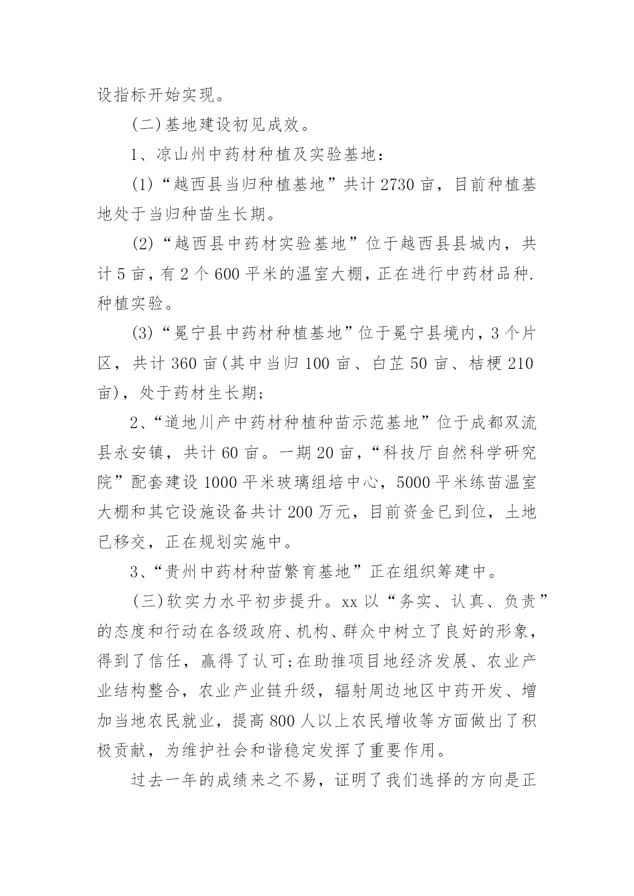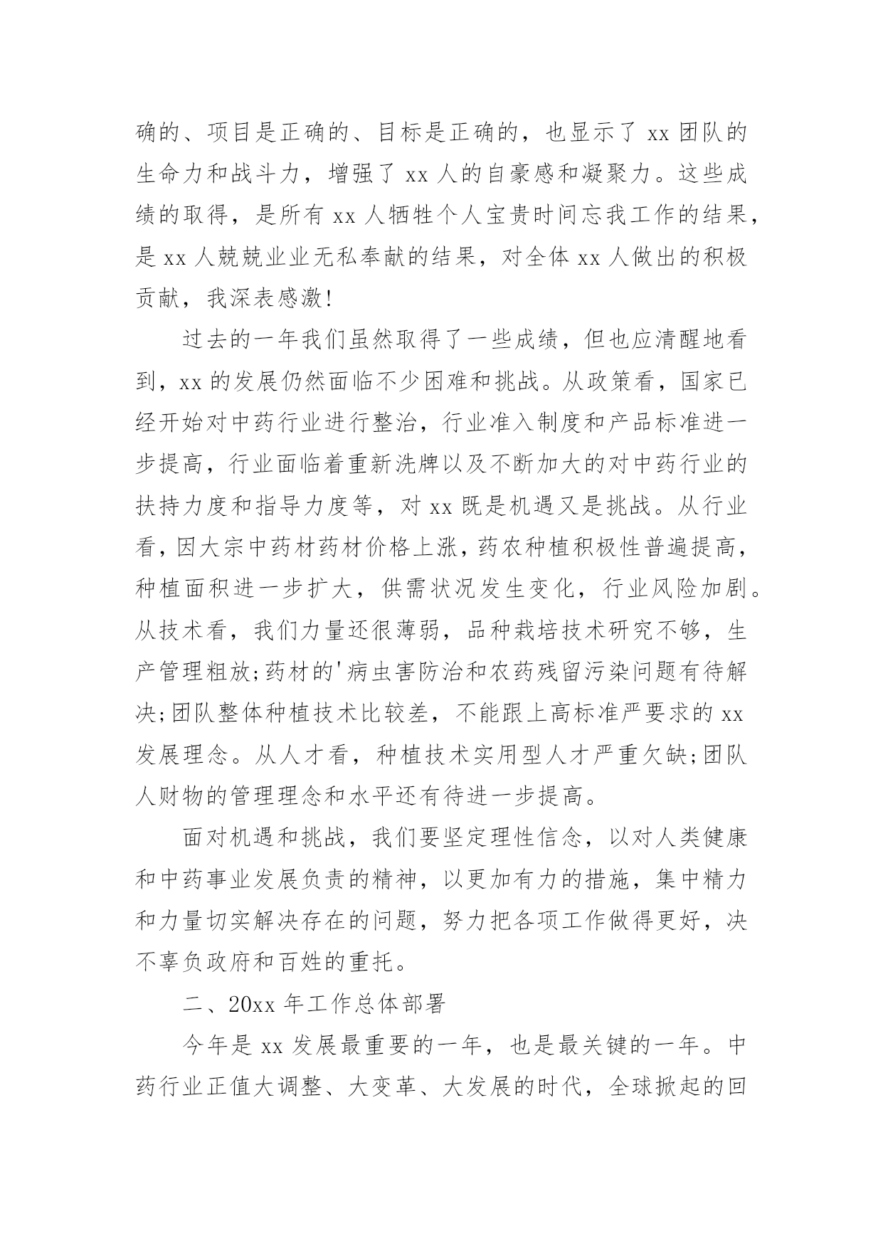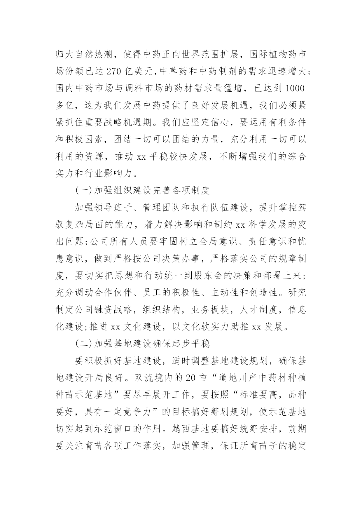 董事会董事长工作报告董事会董事长工作报告随着个人的素质不断提高,报告对我们来说并不陌生,不同种类的报告具有不同的用途。那么大家知道标准正式的报告格式吗?下面是小编帮大家整理的董事会董事长工作报告,欢迎阅读与收藏。董事会董事长工作报告1各位董事:20xx年,公司在董事会的领导下,坚持努力实现公司上市提升公司整体水平为目的,以落实生产经营指标为主要目标,以回报股东为宗旨,经过管理层和全体员工的共同努力,基本完成了公司董事会年初确定的各项经济指标和工作目标。受董事会委托,我在此做20年度董事会工作报告,请各位董事审议。1.依法认真履职,做好日常工作报告期内,董事会共召开次会议,历次大会的召集、提案、出席、议事、表决及会议记录均按照《公司法》、《公司章程》的相关要求规范运作,公司全体董事基本都亲自出席了历次董事会。会议议程主要涉及公司高管的任聘、20年度工作报告和20年度经营计划、20年度公司财务决算报告、20年度财务预算报告、20年度利润分配预案等。报告期内,公司董事大会严格按照《公司章程》、《董事大会议事规则》的规定行使自身的权利,对公司的相关事务做出了决策,程序规范,决策科学。2.健全完善规章制度,规范企业行为公司董事会按照规范运行、科学决策、稳健发展的基本要求,不断完善治理结构和规章制度,依法规范运作,本届任期内认真制订完善、补充修改了《公司章程》、《内部审计制度》等公司内控管理制度,明确了内部监管工作的.职能及运作程序,强化了管理人员和员工在处理公司事务时应“程序合法,操作规范”的工作责任意识,促进了公司整体管理水平的提高。3.逐步培养,建设高素质管理和技术团队随着公司业务发展,董事会始终强调建设稳定进取的团队是企业不断成功的保证。公司有计划、有重点地培养高素质的技术与管理人才,主要做了:第一,建立公平、公正、透明的员工奖惩、任用机制,为优秀员工提供良好的发展空间,增强公司的整体凝聚力。第二,用制度培养团队自觉行为。20年,公司完善了公司各项规章制度并有效实施,初步实现了由制度的硬性安排保证公司理念逐步向团队自觉行为的转化。第三,重视培训,营造学习氛围和机制。公司坚持内部培训与外出培训结合,积极创造条件,鼓励员工自学和参加各类组织培训,努力实现个人发展与企业培训需求相统一,努力使管理人员的专业能力向不同管理职业方向拓展和提高、专业技术人员的专业能力向相关专业和管理领域拓展和提高。在这里,我代表董事会向股东给予的信任与支持,向经营班子付出的艰辛和努力表示衷心地感谢,董事会将继续勤勉认真负责的工作作风,积极贯彻股东大会的决议,推动公司的快速稳健发展,维护股东的利益。董事会董事长工作报告2各位股东、董事、监事:现在,我代表董事会,向各位报告工作,请各位审议,并提出意见。一、20xx年工作总结过去的一年,是xx的创建之年,是不平凡之年。面对复杂多变的市场形势和艰巨繁重的发展任务,xx人同心同德,团结奋进,攻坚克难,扎实推进各项工作有序开展。xx人牢牢把握“加快建设核心竞争力”这个主题和“拳头产品发展”这条主线,坚定信心,开拓进取,加强同各行各地的交流合作,积极参与健康产业发展,为中药事业发展做出了积极贡献,取得了一定成绩。一年来,我们主要做了以下工作:(一)组织建设基本成型。xx组织机构已初步搭建,人员素质、能力得到一定提升,前期磨合基本完成;行业优势进一步凸显,争取政策支持、拓展市场渠道方面取得一定成效;核心竞争力开始打造,拳头产品正在开发研制;商业模式、盈利模式、营销模式逐渐明朗,公司建设初期设定的各项建设指标开始实现。(二)基地建设初见成效。1、凉山州中药材种植及实验基地:(1)“越西县当归种植基地”共计2730亩,目前种植基地处于当归种苗生长期。(2)“越西县中药材实验基地”位于越西县县城内,共计5亩,有2个600平米的温室大棚,正在进行中药材品种.种植实验。(3)“冕宁县中药材种植基地”位于冕宁县境内,3个片区,共计360亩(其中当归100亩、白芷50亩、桔梗210亩),处于药材生长期;2、“道地川产中药材种植种苗示范基地”位于成都双流县永安镇,共计60亩。一期20亩,“科技厅自然科学研究院”配套建设1000平米玻璃组培中心,5000平米练苗温室大棚和其它设施设备共计200万元,目前资金已到位,土地已移交,正在规划实施中。3、“贵州中药材种苗繁育基地”正在组织筹建中。(三)软实力水平初步提升。xx以“务实、认真、负责”的态度和行动在各级政府、机构、群众中树立了良好的形象,得到了信任,赢得了认可;在助推项目地经济发展、农业产业结构整合,农业产业链升级,辐射周边地区中药开发、增加当地农民就业,提高800人以上农民增收等方面做出了积极贡献,为维护社会和谐稳定发挥了重要作用。过去一年的成绩来之不易,证明了我们选择的方向是正确的