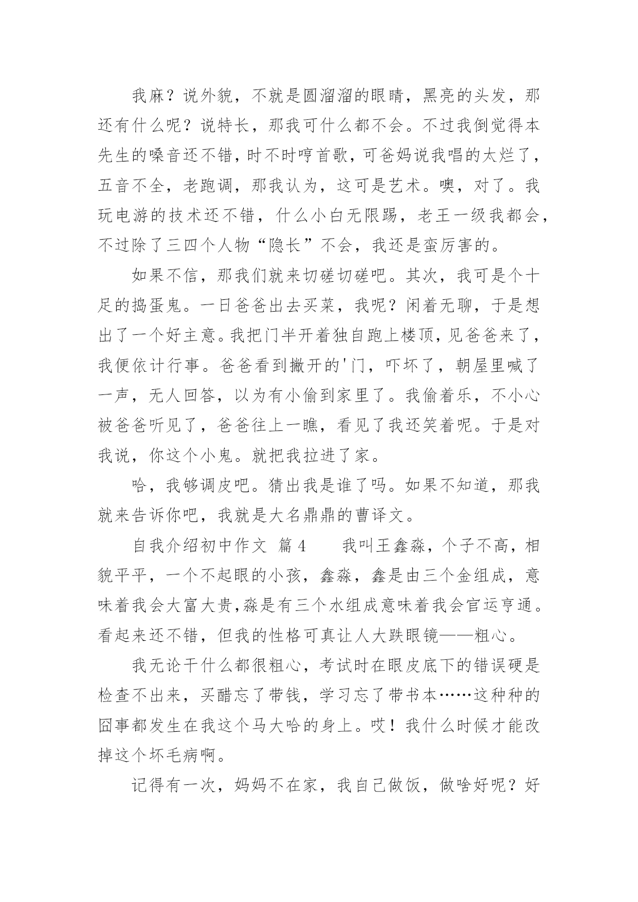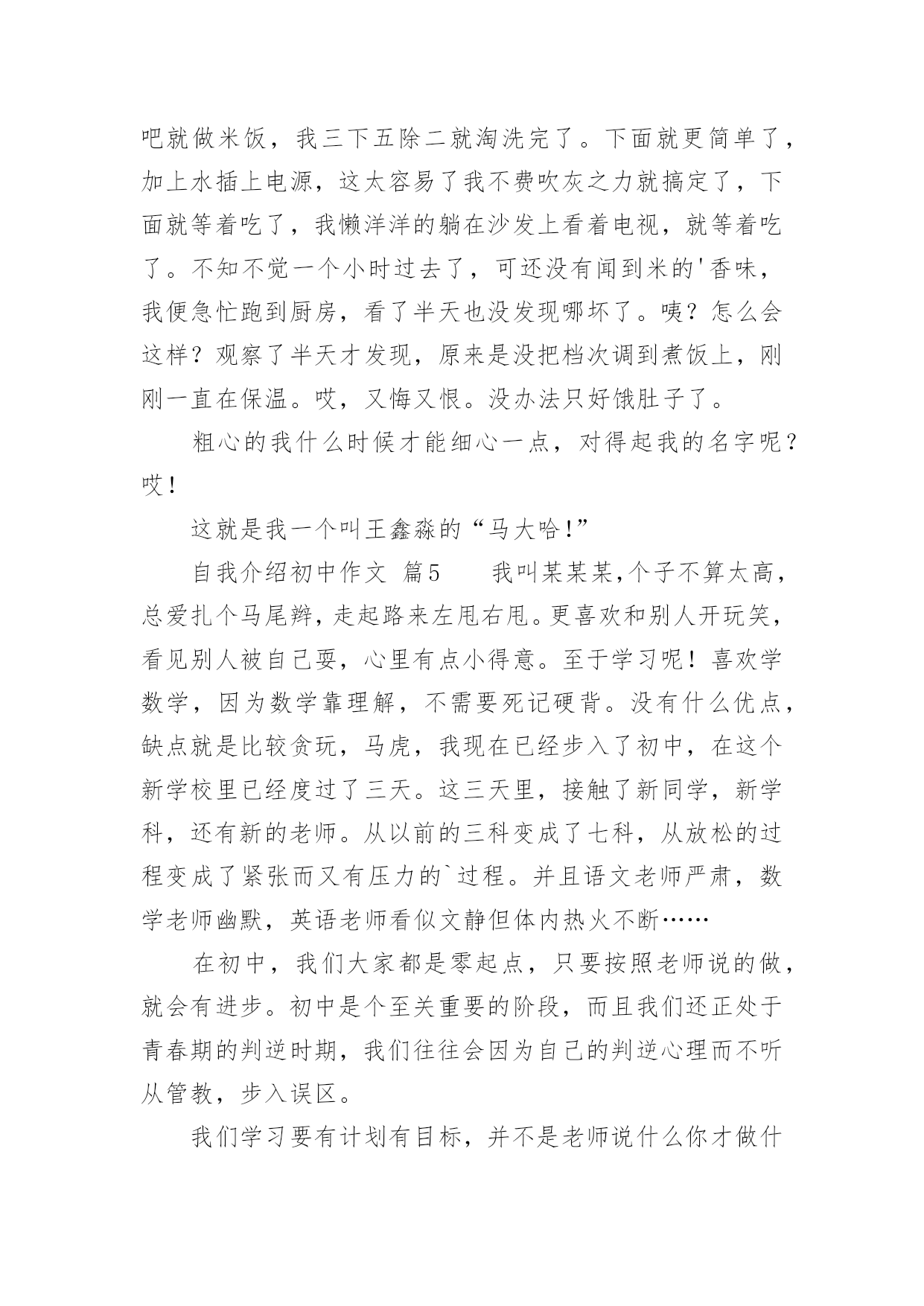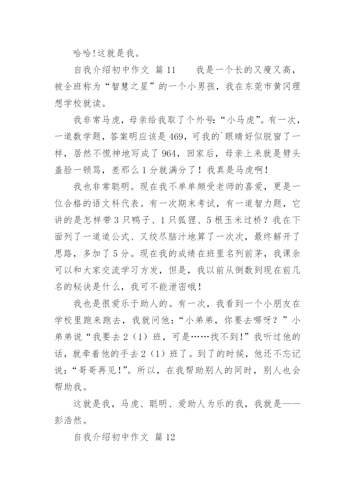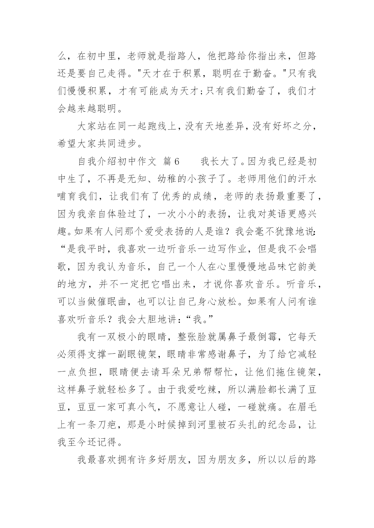 自我介绍初中作文自我介绍初中作文当来到一个陌生的地方时,可能需要我们进行自我介绍,自我介绍是一种认识自我的手段。到底应如何写自我介绍呢?以下是小编为大家收集的自我介绍初中作文,欢迎阅读,希望大家能够喜欢。自我介绍初中作文篇1我叫肖佳暖,在妈妈的眼中我是个可爱的孩子,留着一头秀发,一双大眼睛有神明亮。我爱说话,经常‘哇啦哇啦’说个不听,所以妈妈叫我小麻雀。我爱画画,特别是动物跟风景最拿手了,同学都说我画的栩栩如生,所以每逢班里出黑班报跟图画赛都有我的名字。我爱看书,是个小书谜!当我手里拿着书看着的时候,你千万不要叫我哦,因为当我看书时我就会两耳不闻窗外事,就算是吃饭的大事,我都会不在意。我的理想多,每当从书上看发明家,发明了新产品,我的理想就是成为一个科学家,妈妈老是生病,经常要去找医生看病,这时我的理想就变成一个出色的医生了。总之,我的'理想很多很多,妈妈都说我太贪心了。我缺点也不少,上课时老是走神不注意听老师讲课,总是做小动作,总被老师批评。我就会悔过自新并发誓的想:小次再也不这样了!可是之后……到现在这个坏习惯我还在努力改正呢。我就是这样一个人,你喜欢跟我做朋友吗?想的话就联系我吧。自我介绍初中作文篇2说起家,人人都有家,人人都爱家,我的家是一个和风细雨,春风拂面的,绝对没有狂风暴雨,电闪雷鸣的。记得每天,我进家门口,心情立刻好起来。“妈妈好,爸爸好!”“哎,回来了,快去洗手,吃饭了。”手洗好了,一家人做在一起,一次,我们一边吃饭,一边谈话了。“女儿,你猜今天我遇见谁了?”妈妈笑着说,我摇摇头,说:“谁呀,是谁?”我追着妈妈问,妈妈一边笑,一边次反,爸爸也小了,说:“可能是你的`老师啊!”“啊?老师?”我慌张极了,生怕老师说我什么坏话,我追着妈妈问:“真的吗?”妈妈没有回答,我又说:“是将我的坏话吗?”妈妈也没有回答,只是板着一张脸爸爸只是在偷笑,我心里怦怦直跳,我生气了:“今天怎么回事?”妈妈终于说话:“其实啊,你妈妈我谁也没有遇见,说说笑话而已。”“哦,怪不得今天眼神那么怪,原谅你们在耍我啊,哦!”我笑了,大家哈哈大笑。妈妈爸爸他们就是这样总爱逗我。这样一来,全家有说有笑,嘻嘻哈哈。在我的记忆中,很少与家人有磕磕碰碰,这样的家,我喜欢,所以,我爱我家。自我介绍初中作文篇3大家好,知道我是谁吗?我偏不告诉你,若想知道,那就去实验中学初一〈2〉班看一下吧!我麻?说外貌,不就是圆溜溜的眼睛,黑亮的头发,那还有什么呢?说特长,那我可什么都不会。不过我倒觉得本先生的嗓音还不错,时不时哼首歌,可爸妈说我唱的太烂了,五音不全,老跑调,那我认为,这可是艺术。噢,对了。我玩电游的技术还不错,什么小白无限踢,老王一级我都会,不过除了三四个人物“隐长”不会,我还是蛮厉害的。如果不信,那我们就来切磋切磋吧。其次,我可是个十足的捣蛋鬼。一日爸爸出去买菜,我呢?闲着无聊,于是想出了一个好主意。我把门半开着独自跑上楼顶,见爸爸来了,我便依计行事。爸爸看到撇开的'门,吓坏了,朝屋里喊了一声,无人回答,以为有小偷到家里了。我偷着乐,不小心被爸爸听见了,爸爸往上一瞧,看见了我还笑着呢。于是对我说,你这个小鬼。就把我拉进了家。哈,我够调皮吧。猜出我是谁了吗。如果不知道,那我就来告诉你吧,我就是大名鼎鼎的曹译文。自我介绍初中作文篇4我叫王鑫淼,个子不高,相貌平平,一个不起眼的小孩,鑫淼,鑫是由三个金组成,意味着我会大富大贵,淼是有三个水组成意味着我会官运亨通。看起来还不错,但我的性格可真让人大跌眼镜——粗心。我无论干什么都很粗心,考试时在眼皮底下的错误硬是检查不出来,买醋忘了带钱,学习忘了带书本……这种种的囧事都发生在我这个马大哈的身上。哎!我什么时候才能改掉这个坏毛病啊。记得有一次,妈妈不在家,我自己做饭,做啥好呢?好吧就做米饭,我三下五除二就淘洗完了。下面就更简单了,加上水插上电源,这太容易了我不费吹灰之力就搞定了,下面就等着吃了,我懒洋洋的躺在沙发上看着电视,就等着吃了。不知不觉一个小时过去了,可还没有闻到米的'香味,我便急忙跑到厨房,看了半天也没发现哪坏了。咦?怎么会这样?观察了半天才发现,原来是没把档次调到煮饭上,刚刚一直在保温。哎,又悔又恨。没办法只好饿肚子了。粗心的我什么时候才能细心一点,对得起我的名字呢?哎!这就是我一个叫王鑫淼的“马大哈!”自我介绍初中作文篇5我叫某某某,个子不算太高,总爱扎个马尾辫,走起路来左甩右甩。更喜欢和别人开玩笑,看见别人被自己耍,心里有点小得意。至于学习呢!喜欢学数学,因为数学靠理解,不需要死记硬背。没有什么优点,缺点就是比较贪玩,马虎,我现在已经步入了初中,在这个新学校里已经度过了三天。这三天里,接触了新同学,新学科,还有新的老师。从以前的三科变成了七科,从放松的过程变成了紧张而又有压力的`过程。并且语文老师