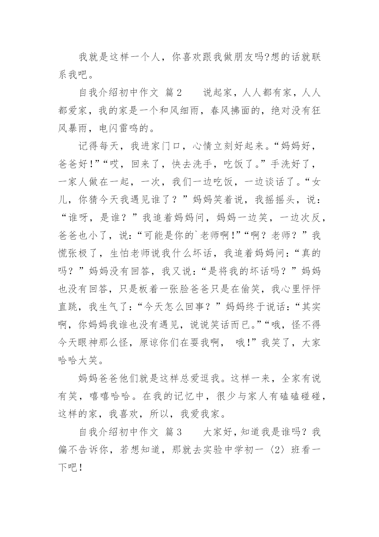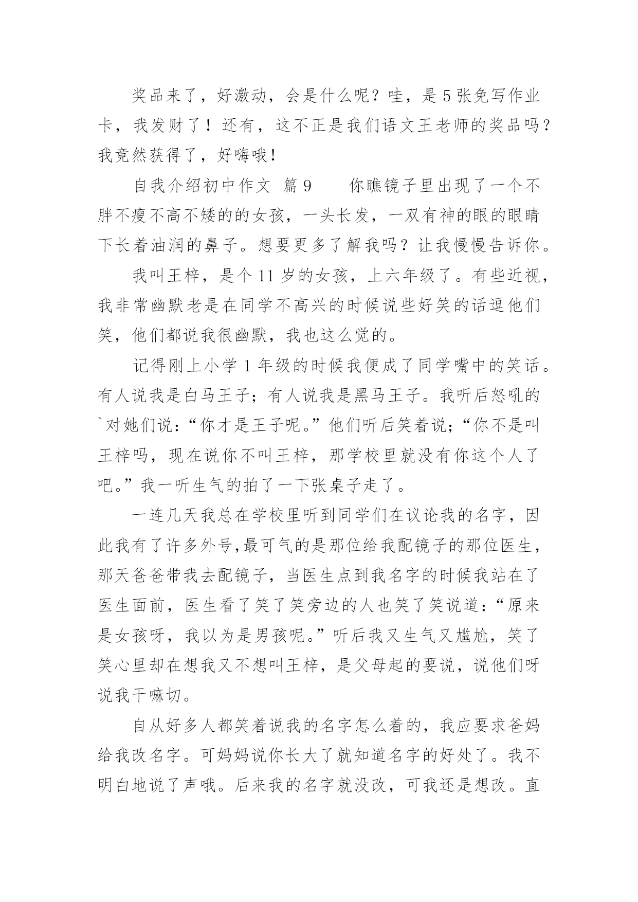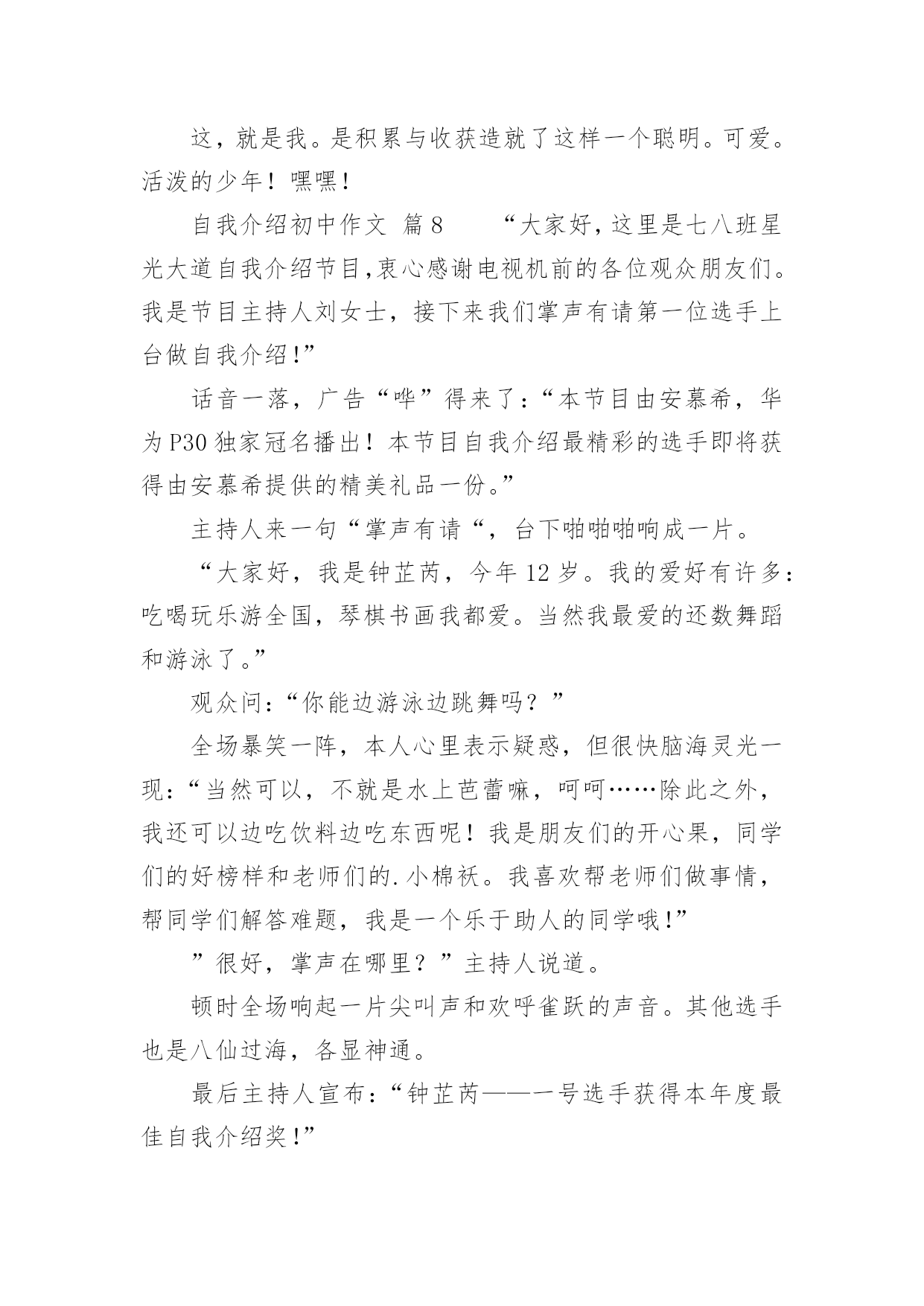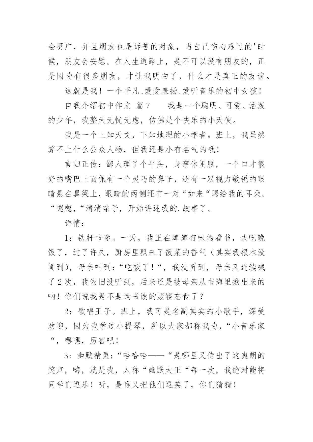 自我介绍初中作文自我介绍初中作文当来到一个陌生的地方时,可能需要我们进行自我介绍,自我介绍是一种认识自我的手段。到底应如何写自我介绍呢?以下是小编为大家收集的自我介绍初中作文,欢迎阅读,希望大家能够喜欢。自我介绍初中作文篇1我叫肖佳暖,在妈妈的眼中我是个可爱的孩子,留着一头秀发,一双大眼睛有神明亮。我爱说话,经常‘哇啦哇啦’说个不听,所以妈妈叫我小麻雀。我爱画画,特别是动物跟风景最拿手了,同学都说我画的栩栩如生,所以每逢班里出黑班报跟图画赛都有我的名字。我爱看书,是个小书谜!当我手里拿着书看着的时候,你千万不要叫我哦,因为当我看书时我就会两耳不闻窗外事,就算是吃饭的大事,我都会不在意。我的理想多,每当从书上看发明家,发明了新产品,我的理想就是成为一个科学家,妈妈老是生病,经常要去找医生看病,这时我的理想就变成一个出色的医生了。总之,我的'理想很多很多,妈妈都说我太贪心了。我缺点也不少,上课时老是走神不注意听老师讲课,总是做小动作,总被老师批评。我就会悔过自新并发誓的想:小次再也不这样了!可是之后……到现在这个坏习惯我还在努力改正呢。我就是这样一个人,你喜欢跟我做朋友吗?想的话就联系我吧。自我介绍初中作文篇2说起家,人人都有家,人人都爱家,我的家是一个和风细雨,春风拂面的,绝对没有狂风暴雨,电闪雷鸣的。记得每天,我进家门口,心情立刻好起来。“妈妈好,爸爸好!”“哎,回来了,快去洗手,吃饭了。”手洗好了,一家人做在一起,一次,我们一边吃饭,一边谈话了。“女儿,你猜今天我遇见谁了?”妈妈笑着说,我摇摇头,说:“谁呀,是谁?”我追着妈妈问,妈妈一边笑,一边次反,爸爸也小了,说:“可能是你的`老师啊!”“啊?老师?”我慌张极了,生怕老师说我什么坏话,我追着妈妈问:“真的吗?”妈妈没有回答,我又说:“是将我的坏话吗?”妈妈也没有回答,只是板着一张脸爸爸只是在偷笑,我心里怦怦直跳,我生气了:“今天怎么回事?”妈妈终于说话:“其实啊,你妈妈我谁也没有遇见,说说笑话而已。”“哦,怪不得今天眼神那么怪,原谅你们在耍我啊,哦!”我笑了,大家哈哈大笑。妈妈爸爸他们就是这样总爱逗我。这样一来,全家有说有笑,嘻嘻哈哈。在我的记忆中,很少与家人有磕磕碰碰,这样的家,我喜欢,所以,我爱我家。自我介绍初中作文篇3大家好,知道我是谁吗?我偏不告诉你,若想知道,那就去实验中学初一〈2〉班看一下吧!我麻?说外貌,不就是圆溜溜的眼睛,黑亮的头发,那还有什么呢?说特长,那我可什么都不会。不过我倒觉得本先生的嗓音还不错,时不时哼首歌,可爸妈说我唱的太烂了,五音不全,老跑调,那我认为,这可是艺术。噢,对了。我玩电游的技术还不错,什么小白无限踢,老王一级我都会,不过除了三四个人物“隐长”不会,我还是蛮厉害的。如果不信,那我们就来切磋切磋吧。其次,我可是个十足的捣蛋鬼。一日爸爸出去买菜,我呢?闲着无聊,于是想出了一个好主意。我把门半开着独自跑上楼顶,见爸爸来了,我便依计行事。爸爸看到撇开的'门,吓坏了,朝屋里喊了一声,无人回答,以为有小偷到家里了。我偷着乐,不小心被爸爸听见了,爸爸往上一瞧,看见了我还笑着呢。于是对我说,你这个小鬼。就把我拉进了家。哈,我够调皮吧。猜出我是谁了吗。如果不知道,那我就来告诉你吧,我就是大名鼎鼎的曹译文。自我介绍初中作文篇4我叫王鑫淼,个子不高,相貌平平,一个不起眼的小孩,鑫淼,鑫是由三个金组成,意味着我会大富大贵,淼是有三个水组成意味着我会官运亨通。看起来还不错,但我的性格可真让人大跌眼镜——粗心。我无论干什么都很粗心,考试时在眼皮底下的错误硬是检查不出来,买醋忘了带钱,学习忘了带书本……这种种的囧事都发生在我这个马大哈的身上。哎!我什么时候才能改掉这个坏毛病啊。记得有一次,妈妈不在家,我自己做饭,做啥好呢?好吧就做米饭,我三下五除二就淘洗完了。下面就更简单了,加上水插上电源,这太容易了我不费吹灰之力就搞定了,下面就等着吃了,我懒洋洋的躺在沙发上看着电视,就等着吃了。不知不觉一个小时过去了,可还没有闻到米的'香味,我便急忙跑到厨房,看了半天也没发现哪坏了。咦?怎么会这样?观察了半天才发现,原来是没把档次调到煮饭上,刚刚一直在保温。哎,又悔又恨。没办法只好饿肚子了。粗心的我什么时候才能细心一点,对得起我的名字呢?哎!这就是我一个叫王鑫淼的“马大哈!”自我介绍初中作文篇5我叫某某某,个子不算太高,总爱扎个马尾辫,走起路来左甩右甩。更喜欢和别人开玩笑,看见别人被自己耍,心里有点小得意。至于学习呢!喜欢学数学,因为数学靠理解,不需要死记硬背。没有什么优点,缺点就是比较贪玩,马虎,我现在已经步入了初中,在这个新学校里已经度过了三天。这三天里,接触了新同学,新学科,还有新的老师。从以前的三科变成了七科,从放松的过程变成了紧张而又有压力的`过程。并且语文老师