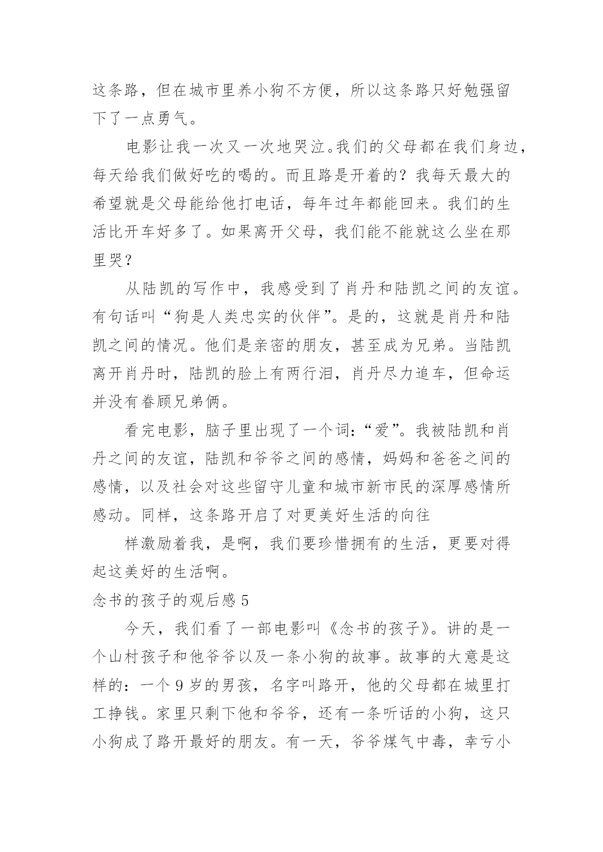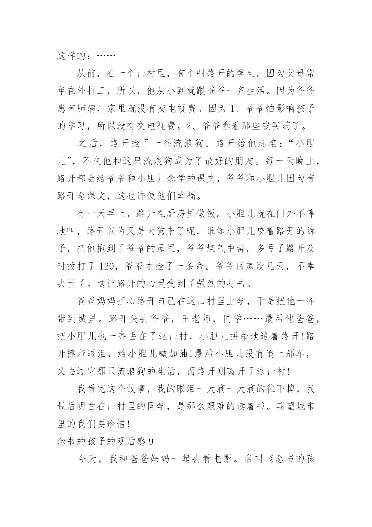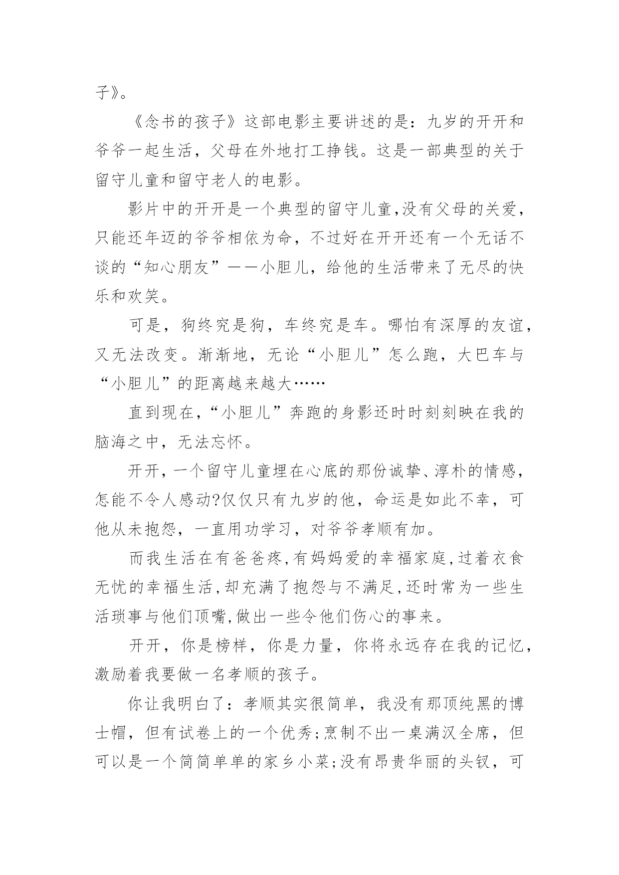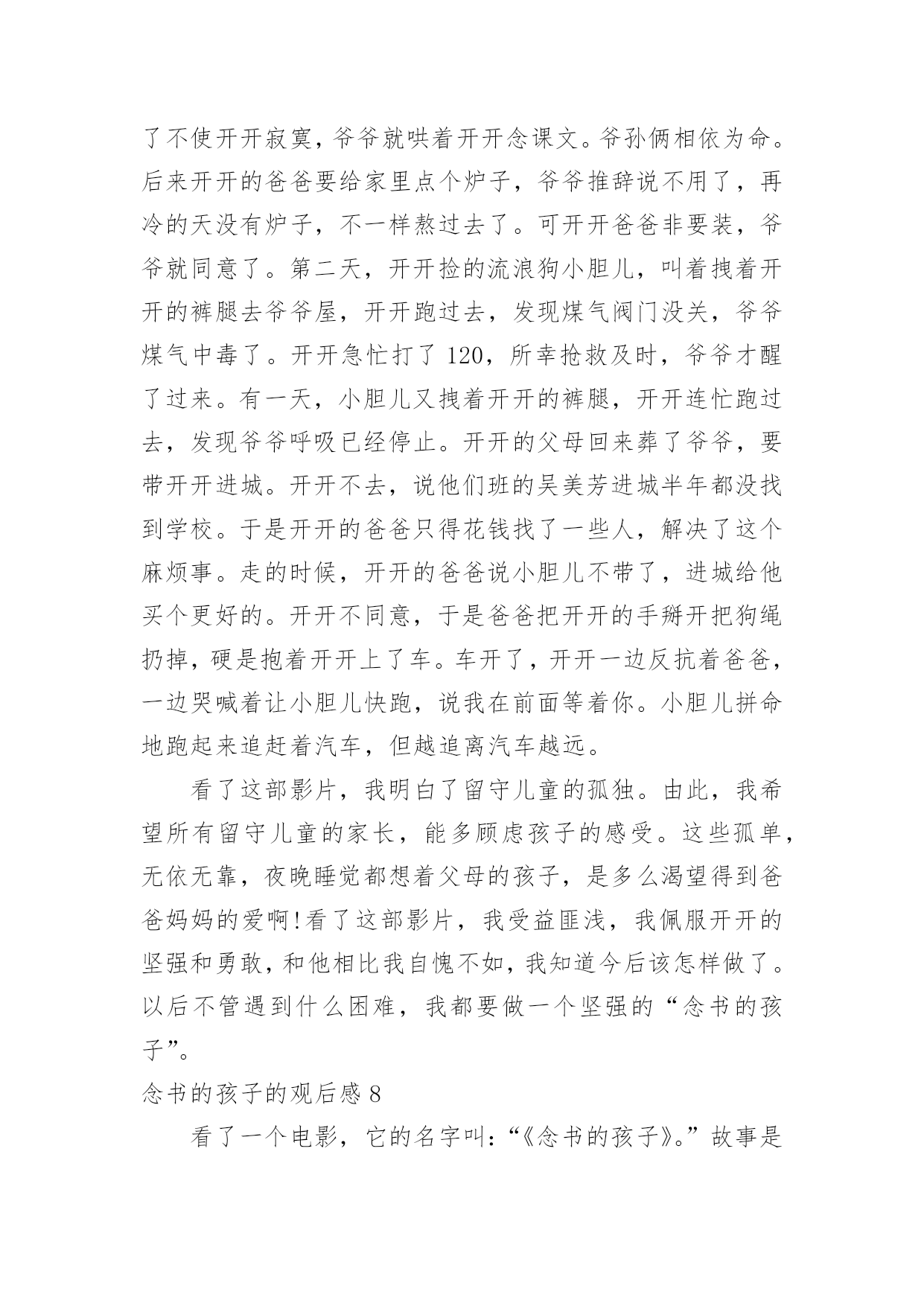 念书的孩子的观后感念书的孩子的观后感15篇当品味完一部影视作品后,一定对生活有了新的感悟和看法吧,记录下来很重要哦,一起来写一篇观后感吧。可是观后感怎么写才合适呢?下面是小编帮大家整理的念书的孩子的观后感,欢迎大家借鉴与参考,希望对大家有所帮助。念书的孩子的观后感1在电影《念书的孩子》中,九岁的开开从小和爷爷生活在乡下,脱离父母关爱的他是个典型的留守儿童。他还有一个无话不谈的“知心朋友”——小胆儿。路开是一个活泼开朗、孝顺懂事又勤奋好学的孩子,每天都给爷爷读书,虽然错误百出,但语气到位,讲的娓娓动听。他和爷爷相依为命,每天晚上都在等身在远方的爸爸妈妈打来电话,也许这就是开开的精神支柱吧!开开是不幸的,但他是坚强懂事的,他那种超出同龄孩子的坚强实在是让人感到心酸。非常值得我们城市里的孩子学习。我对主人公开开真是佩服有加,作为留守儿童的他把对父母的思念之情深深地埋藏在心里。当我看到他与小胆儿诉说对父母的思念之苦时,我那感动的泪水禁不住在我的眼眶里打转,我仿佛看到了他与父母相聚的幸福情景,然而,这一切永远都只是开开的梦和奢望!看到开开的童年是那么悲惨,我一下就联想到自己。家里的条件那么好,而开开呢?我读书的环境那么好,而开开呢?尽管如此,我还一味的抱怨,不想学习,讨厌家长唠叨我。与孤单的开开相比,每天有许多人陪伴在我身边,无论是同学、朋友、家人都可谓是幸福至极念书的孩子。就这样,我还不知足,每天因为一些琐事就跟家人吵架斗嘴,做出一些令他们心寒的事情来。想想我自己都后悔,家长为我付出了这么多,我还……开开那不屈不挠、热爱学习的精神深深的影响着我,今后我要像他那样奋发向上,努力学习。看了这部电影,我深有感触,和开开比我自愧不如。以后不管遇到什么困难,我也要学着自己面对,不再依赖他人。我一定也要做一个坚强的孩子!念书的孩子的观后感2这个星期在学校,经过学校的组织我们观看了《念书的孩子》这部电影。一个九岁的男孩,他的父母要到城里打工挣钱,家里只剩下了他和爷爷。这个男孩名叫“路开”。随后,路开拾了一只流浪狗叫“小胆儿”,他俩成了一对形影不离的好朋友。有一天,开开爷爷煤气中毒,幸好“小胆儿”闻见了气味,才解救了爷爷脱离生命危险。可是,过了不久,路开的爷爷不幸去世了,这让人痛苦万分。从此,只剩下路开一人。最后,爸爸带他到城里去,他离开了同学,离开了老师,最后,连自己的唯一一个朋友“小胆儿”都失去了。我们现在的生活环境跟开开比起来我们已经很幸福了,难道我们还不知足吗?每当我看见一个个孩子盛气凌人,每天被家长宠着惯着,都不理解我们的生活已经很好了。仍然,一会儿要这一会儿要那,家长为了哄你,让你开心,才迫不得已买一些没用的东西,可开开呢?他什么都不要,只求获得父母的爱和上大学的机会,成为一个有出息的人。当灯光亮起来时,我的眼睛被猛刺了一下,随着我的心也跟着痛起来,我一回忆起电影的画面,那感人肺腑的故事,那个孤独的开开和他的“小胆儿”,我的眼泪就会悄然无声的落下来。我们真的要学会关怀,学会理解。想想开开的学习环境,再看看自己的学习环境,热了冷了有空调吹;饿了有丰盛可口的饭菜;写作业时还有爸妈的陪伴,时时递上水果和牛奶.在这样优越的条件下,我怎能不好好学习呢?念书的孩子的观后感3在电影《念书的孩子》中,九岁的开开从小和爷爷生活在乡下,脱离父母关爱的他是个典型的留守儿童。影片用生活化的情结勾勒了开开喜怒哀乐的点点滴滴,我能感受到开开内心的那种孤独和执着。“父母在远方,身边无爹娘,读书无人管,心里闷得慌,安全无保障,生活没期望。”这则顺口溜,点出了小梦遭受伤害的直接原因,反映出许多留守儿童的生存现状。亲情、教育、安全,缺失了这些至关重要的环节,留守儿童的健康成长引人忧思。家庭是社会的细胞,亲情是所有社会关系的基础。在经历了惨剧后,小梦的父亲痛定思痛:孩子好了后,必须要带在身边。然而,正如有人所担忧的:进城后的小梦能在父母奔波忙碌中得到足够的关爱吗应对高高的户籍壁垒,又如何从稀缺的社会公共服务中分享到自己应得的一份留守儿童的问题,不只是一个家庭问题,更是一个社会问题。5800万留守儿童的背后,是超过两亿背井离乡的“流动大军”。一边是“流动”,一边是“留守”,许多时候,正是流动人群权利的缺失,造成了留守儿童的种种困境。在这个好处上,留守儿童的安全问题,不仅仅是能否与父母共同生活的问题;留守儿童的教育问题,也不仅仅是一本课本和一张书桌的.问题。对留守儿童的关注,既要着眼于对单独个体的关切,更应扩展至对庞大流动人群的关怀。念书的孩子的观后感4前几天学校组织我们看了一部叫《念书的孩子》的片子,很感人,我们班的同学都深受感染。电影主人公是陆凯,父母都在城市工作。他从小和爷爷相依为命,由一只名叫“小勇气”的狗陪伴着陆凯。陆凯每天晚上最希望父母能给他打电话。有一天,陆凯的