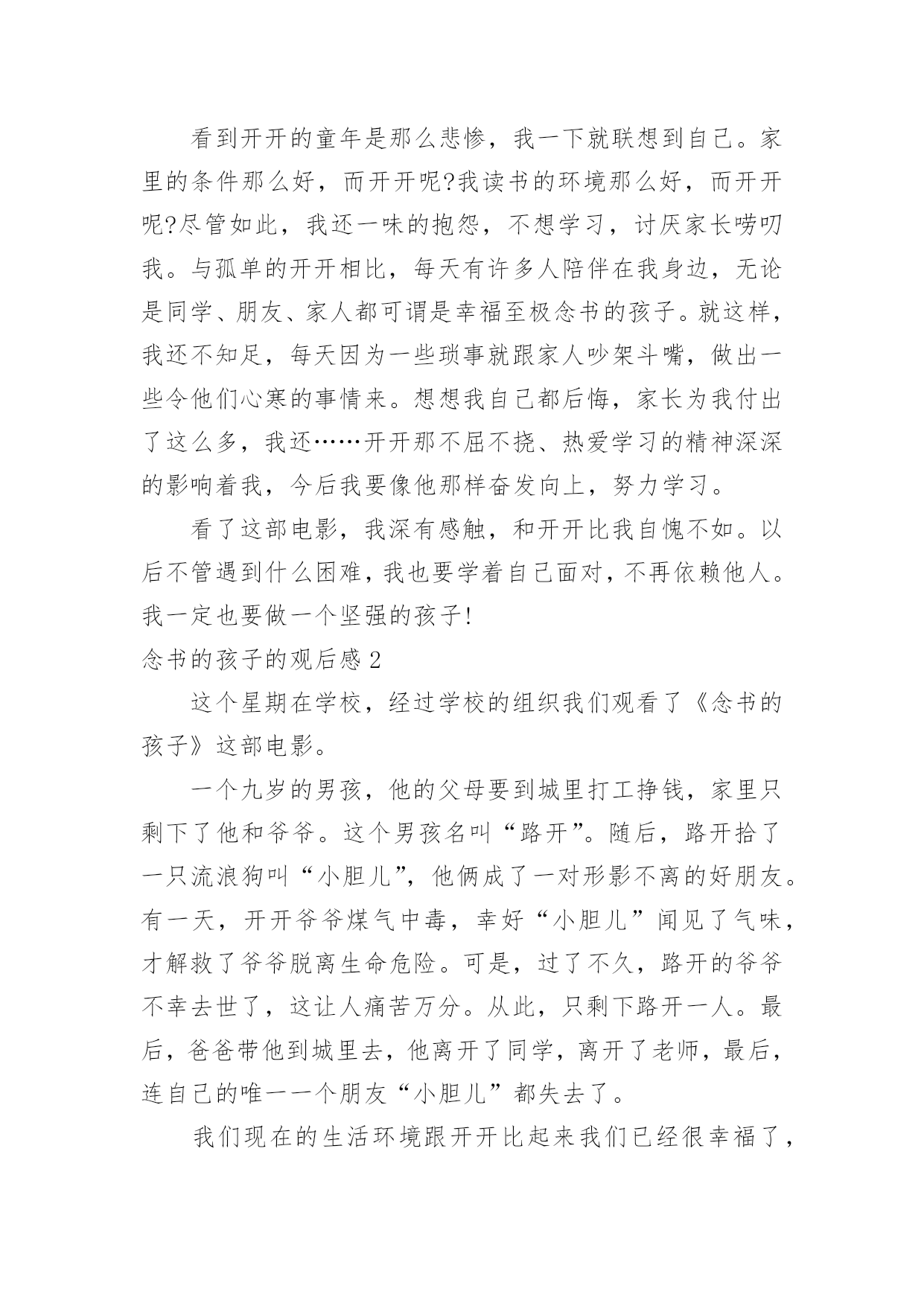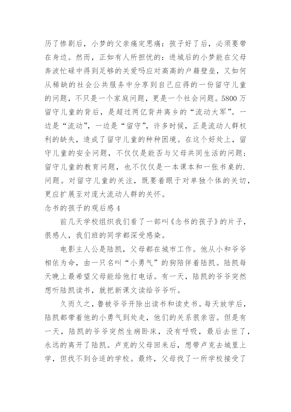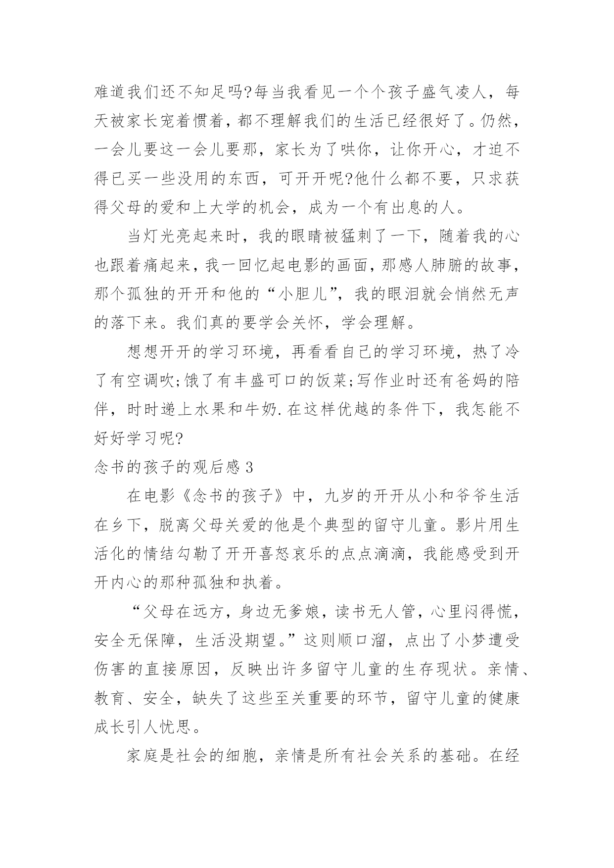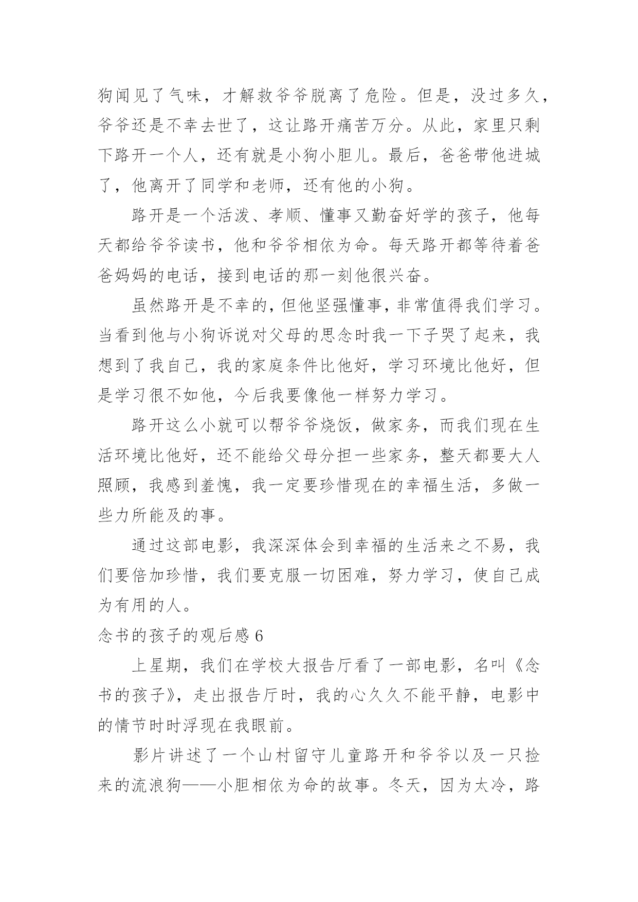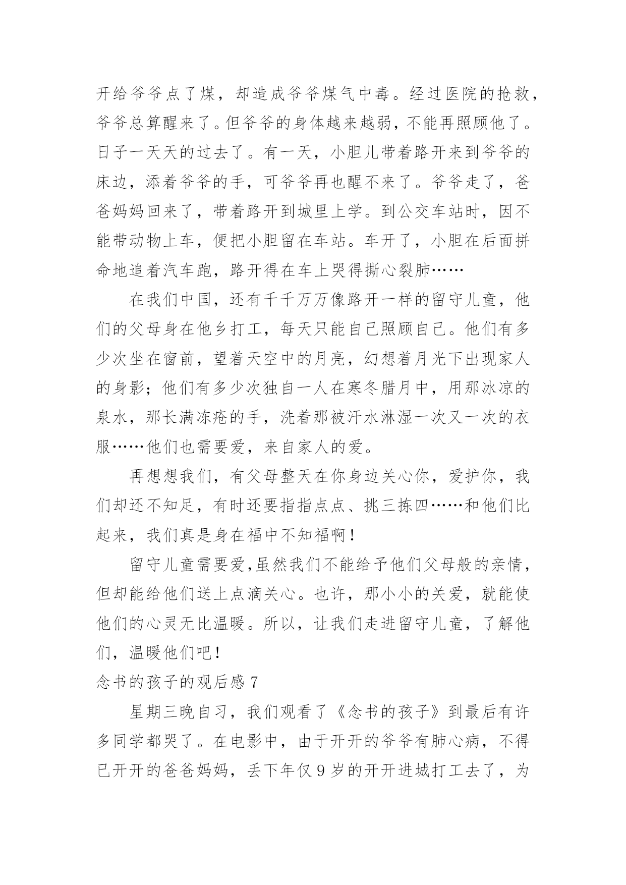 念书的孩子的观后感念书的孩子的观后感15篇当品味完一部影视作品后,一定对生活有了新的感悟和看法吧,记录下来很重要哦,一起来写一篇观后感吧。可是观后感怎么写才合适呢?下面是小编帮大家整理的念书的孩子的观后感,欢迎大家借鉴与参考,希望对大家有所帮助。念书的孩子的观后感1在电影《念书的孩子》中,九岁的开开从小和爷爷生活在乡下,脱离父母关爱的他是个典型的留守儿童。他还有一个无话不谈的“知心朋友”——小胆儿。路开是一个活泼开朗、孝顺懂事又勤奋好学的孩子,每天都给爷爷读书,虽然错误百出,但语气到位,讲的娓娓动听。他和爷爷相依为命,每天晚上都在等身在远方的爸爸妈妈打来电话,也许这就是开开的精神支柱吧!开开是不幸的,但他是坚强懂事的,他那种超出同龄孩子的坚强实在是让人感到心酸。非常值得我们城市里的孩子学习。我对主人公开开真是佩服有加,作为留守儿童的他把对父母的思念之情深深地埋藏在心里。当我看到他与小胆儿诉说对父母的思念之苦时,我那感动的泪水禁不住在我的眼眶里打转,我仿佛看到了他与父母相聚的幸福情景,然而,这一切永远都只是开开的梦和奢望!看到开开的童年是那么悲惨,我一下就联想到自己。家里的条件那么好,而开开呢?我读书的环境那么好,而开开呢?尽管如此,我还一味的抱怨,不想学习,讨厌家长唠叨我。与孤单的开开相比,每天有许多人陪伴在我身边,无论是同学、朋友、家人都可谓是幸福至极念书的孩子。就这样,我还不知足,每天因为一些琐事就跟家人吵架斗嘴,做出一些令他们心寒的事情来。想想我自己都后悔,家长为我付出了这么多,我还……开开那不屈不挠、热爱学习的精神深深的影响着我,今后我要像他那样奋发向上,努力学习。看了这部电影,我深有感触,和开开比我自愧不如。以后不管遇到什么困难,我也要学着自己面对,不再依赖他人。我一定也要做一个坚强的孩子!念书的孩子的观后感2这个星期在学校,经过学校的组织我们观看了《念书的孩子》这部电影。一个九岁的男孩,他的父母要到城里打工挣钱,家里只剩下了他和爷爷。这个男孩名叫“路开”。随后,路开拾了一只流浪狗叫“小胆儿”,他俩成了一对形影不离的好朋友。有一天,开开爷爷煤气中毒,幸好“小胆儿”闻见了气味,才解救了爷爷脱离生命危险。可是,过了不久,路开的爷爷不幸去世了,这让人痛苦万分。从此,只剩下路开一人。最后,爸爸带他到城里去,他离开了同学,离开了老师,最后,连自己的唯一一个朋友“小胆儿”都失去了。我们现在的生活环境跟开开比起来我们已经很幸福了,难道我们还不知足吗?每当我看见一个个孩子盛气凌人,每天被家长宠着惯着,都不理解我们的生活已经很好了。仍然,一会儿要这一会儿要那,家长为了哄你,让你开心,才迫不得已买一些没用的东西,可开开呢?他什么都不要,只求获得父母的爱和上大学的机会,成为一个有出息的人。当灯光亮起来时,我的眼睛被猛刺了一下,随着我的心也跟着痛起来,我一回忆起电影的画面,那感人肺腑的故事,那个孤独的开开和他的“小胆儿”,我的眼泪就会悄然无声的落下来。我们真的要学会关怀,学会理解。想想开开的学习环境,再看看自己的学习环境,热了冷了有空调吹;饿了有丰盛可口的饭菜;写作业时还有爸妈的陪伴,时时递上水果和牛奶.在这样优越的条件下,我怎能不好好学习呢?念书的孩子的观后感3在电影《念书的孩子》中,九岁的开开从小和爷爷生活在乡下,脱离父母关爱的他是个典型的留守儿童。影片用生活化的情结勾勒了开开喜怒哀乐的点点滴滴,我能感受到开开内心的那种孤独和执着。“父母在远方,身边无爹娘,读书无人管,心里闷得慌,安全无保障,生活没期望。”这则顺口溜,点出了小梦遭受伤害的直接原因,反映出许多留守儿童的生存现状。亲情、教育、安全,缺失了这些至关重要的环节,留守儿童的健康成长引人忧思。家庭是社会的细胞,亲情是所有社会关系的基础。在经历了惨剧后,小梦的父亲痛定思痛:孩子好了后,必须要带在身边。然而,正如有人所担忧的:进城后的小梦能在父母奔波忙碌中得到足够的关爱吗应对高高的户籍壁垒,又如何从稀缺的社会公共服务中分享到自己应得的一份留守儿童的问题,不只是一个家庭问题,更是一个社会问题。5800万留守儿童的背后,是超过两亿背井离乡的“流动大军”。一边是“流动”,一边是“留守”,许多时候,正是流动人群权利的缺失,造成了留守儿童的种种困境。在这个好处上,留守儿童的安全问题,不仅仅是能否与父母共同生活的问题;留守儿童的教育问题,也不仅仅是一本课本和一张书桌的.问题。对留守儿童的关注,既要着眼于对单独个体的关切,更应扩展至对庞大流动人群的关怀。念书的孩子的观后感4前几天学校组织我们看了一部叫《念书的孩子》的片子,很感人,我们班的同学都深受感染。电影主人公是陆凯,父母都在城市工作。他从小和爷爷相依为命,由一只名叫“小勇气”的狗陪伴着陆凯。陆凯每天晚上最希望父母能给他打电话。有一天,陆凯的