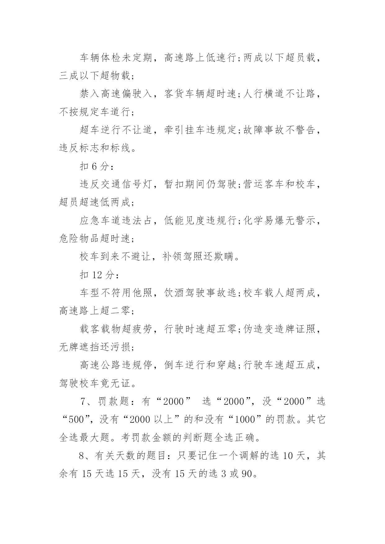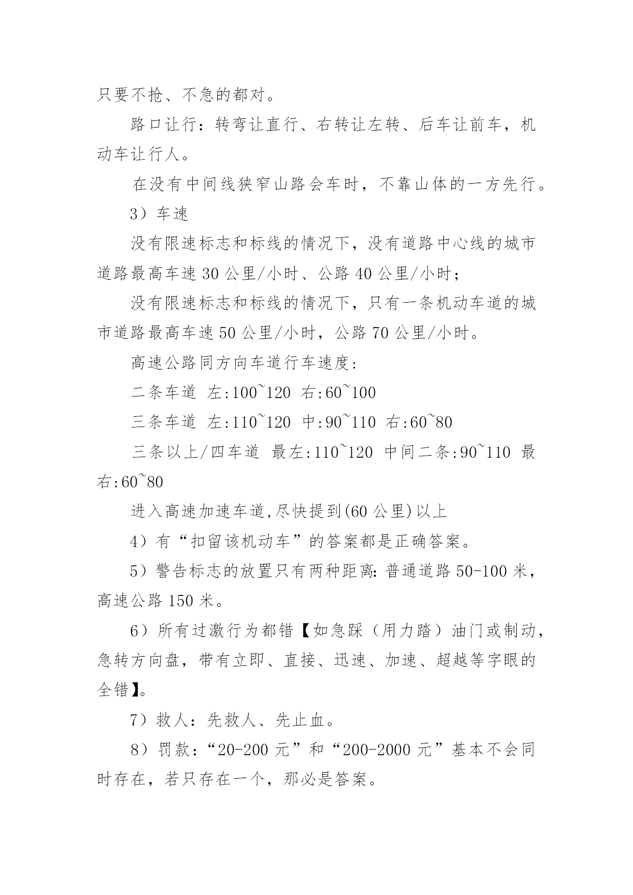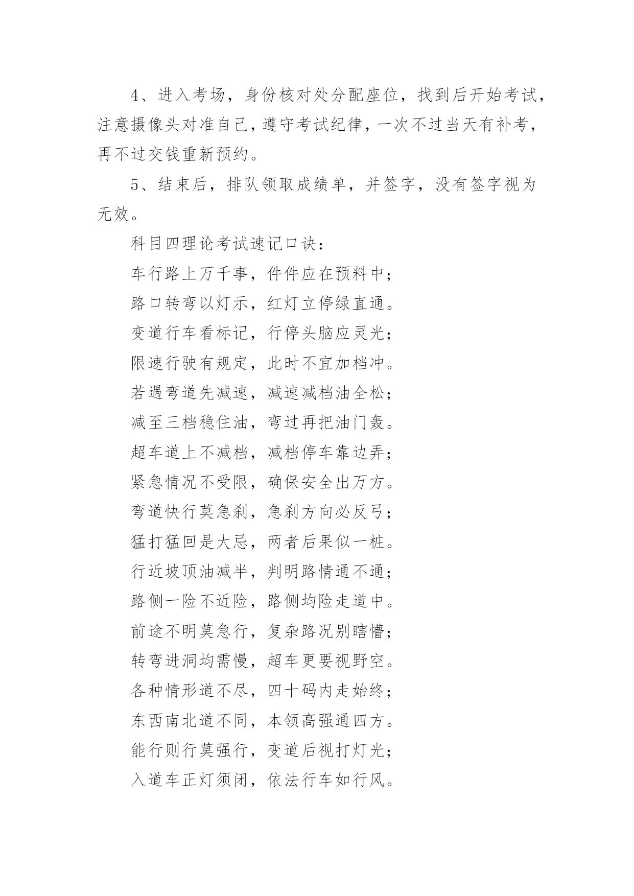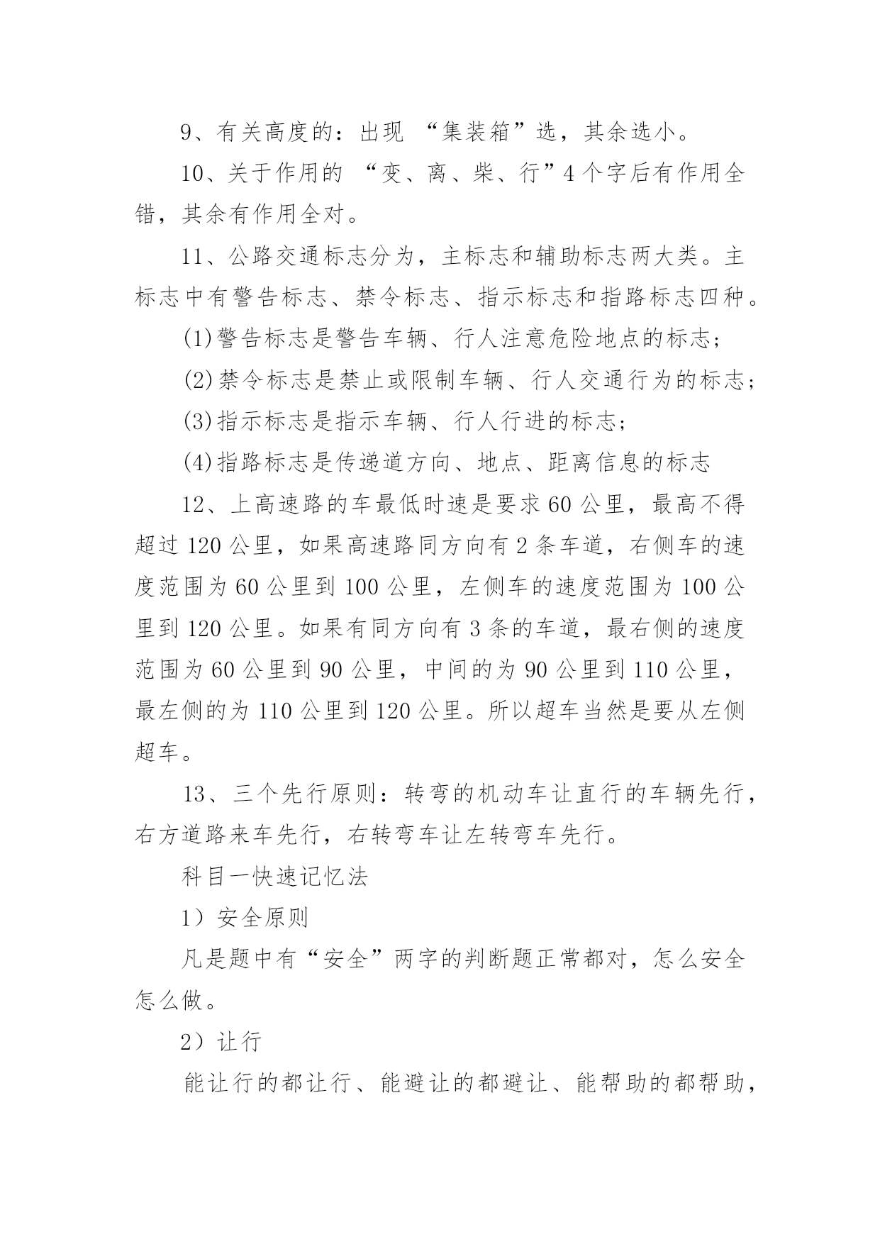 科目一考试的速记口诀科目一考试的速记口诀科目一是驾照考试的第一颗考试,属于理论考试,主要考察学院对交规理论知识的理解,下面是小编给大家整理的科目一考试的速记口诀内容,希望能给你带来帮助!【口诀】:科一过关并不难,多看多练是王道;顺序练习加印象,错题练习是巩固;考前专门看错题,模拟五次九十分;考试细看每一题,反复确认再勾选。【答题技巧】:1、题目里有“口”的选50米,有“站”的选30米,叫“口五站三”剩下的全选150米,没有150的选最大。判断题全对。2、有关公里的题目:城市街道选50公里,其余有30的全选30。高速最高70,高速最低60。判断题全对。3、吊销机动车证的为二年,撤消机动车证的为三年,以醉酒吊销五年,因逃跑而吊销是终身,叫“吊二撤三醉五逃终身”。4、伤员急救知识:选择题:A、B、C、“选字最多的”。判断题:只有“远心端”和“软质担架”是错的,其余都是对的。5、危险知识:题目里找“不需要”“不受”“可以”“三层”“坚固无损”是错的,其余都是对的。6、扣分题(1)基本技巧扣1分:“未带证件”判断题:有“灯光”和“倒车”是对的,其余全错。扣2分:匝道超车(高速),未达20%,打手机,违反标志,超4小时,没有划中心线,实习期,交叉路口。判断题:“未与前保持安全距离”是对的。其余全错。扣3分:灯光、信号灯、号牌、高速、挂车,判断题全错。扣6分:饮酒、超过50%、超过30%,学习驾车(高速),不按规定停车(高速)。判断题全对。扣12分:醉酒、扣证驾车、逃逸、借证驾车,超过三个月未缴罚款,驾不符合车型的,强行通过。判断题全对。(2)详细技巧扣1分:不带证照乱用灯,保险标志未放置;会车不按规定行,载物超高和超宽。扣2分:交叉路口乱行车,缓行路段超借道;校车上路违规定,上下学生乱停靠;行车未系安全带,摩托不戴安全帽;接打电话危害多,扣掉2分给警告。扣3分:车辆体检未定期,高速路上低速行;两成以下超员载,三成以下超物载;禁入高速偏驶入,客货车辆超时速;人行横道不让路,不按规定车道行;超车逆行不让道,牵引挂车违规定;故障事故不警告,违反标志和标线。扣6分:违反交通信号灯,暂扣期间仍驾驶;营运客车和校车,超员超速低两成;应急车道违法占,低能见度违规行;化学易爆无警示,危险物品超时速;校车到来不避让,补领驾照还欺瞒。扣12分:车型不符用他照,饮酒驾驶事故逃;校车载人超两成,高速路上超二零;载客载物超疲劳,行驶时速超五零;伪造变造牌证照,无牌遮挡还污损;高速公路违规停,倒车逆行和穿越;行驶车速超五成,驾驶校车竟无证。7、罚款题:有“2000”选“2000”,没“2000”选“500”,没有“2000以上”的和没有“1000”的罚款。其它全选最大题。考罚款金额的判断题全选正确。8、有关天数的题目:只要记住一个调解的选10天,其余有15天选15天,没有15天的选3或90。9、有关高度的:出现“集装箱”选,其余选小。10、关于作用的“变、离、柴、行”4个字后有作用全错,其余有作用全对。11、公路交通标志分为,主标志和辅助标志两大类。主标志中有警告标志、禁令标志、指示标志和指路标志四种。(1)警告标志是警告车辆、行人注意危险地点的标志;(2)禁令标志是禁止或限制车辆、行人交通行为的标志;(3)指示标志是指示车辆、行人行进的标志;(4)指路标志是传递道方向、地点、距离信息的标志12、上高速路的车最低时速是要求60公里,最高不得超过120公里,如果高速路同方向有2条车道,右侧车的速度范围为60公里到100公里,左侧车的速度范围为100公里到120公里。如果有同方向有3条的车道,最右侧的速度范围为60公里到90公里,中间的为90公里到110公里,最左侧的为110公里到120公里。所以超车当然是要从左侧超车。13、三个先行原则:转弯的机动车让直行的车辆先行,右方道路来车先行,右转弯车让左转弯车先行。科目一快速记忆法1)安全原则凡是题中有“安全”两字的判断题正常都对,怎么安全怎么做。2)让行能让行的都让行、能避让的都避让、能帮助的都帮助,只要不抢、不急的都对。路口让行:转弯让直行、右转让左转、后车让前车,机动车让行人。在没有中间线狭窄山路会车时,不靠山体的一方先行。3)车速没有限速标志和标线的情况下,没有道路中心线的城市道路最高车速30公里/小时、公路40公里/小时;没有限速标志和标线的情况下,只有一条机动车道的城市道路最高车速50公里/小时,公路70公里/小时。高速公路同方向车道行车速度:二条车道左:100~120右:60~100三条车道左:110~120中:90~110右:60~80三条以上/四车道最左:110~120中间二条:90~110最右:60~80进入高速加速车道,尽快提到(60公里)以上4)有“扣留该机动车”的答案都是正确答案。5)警告标志的