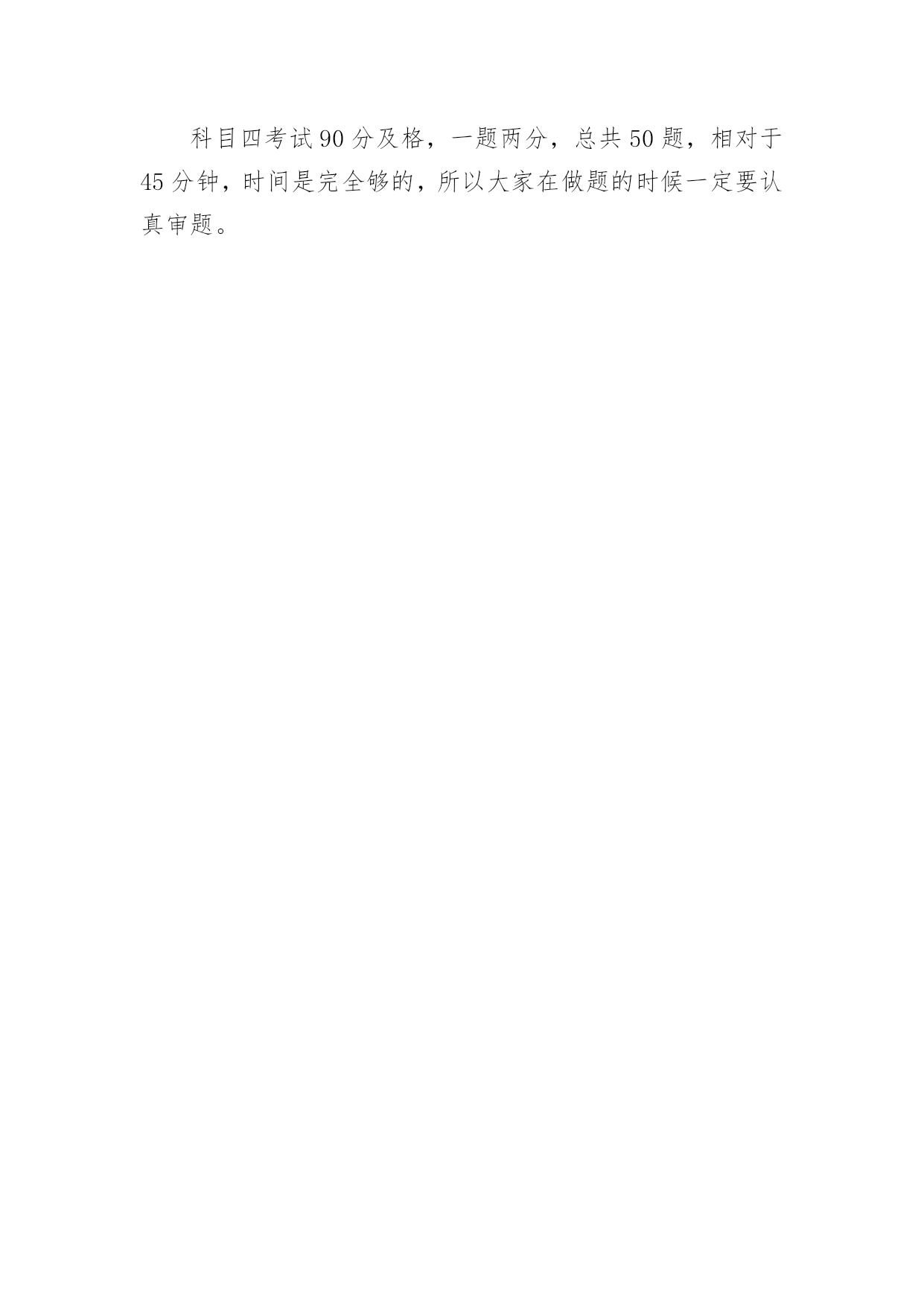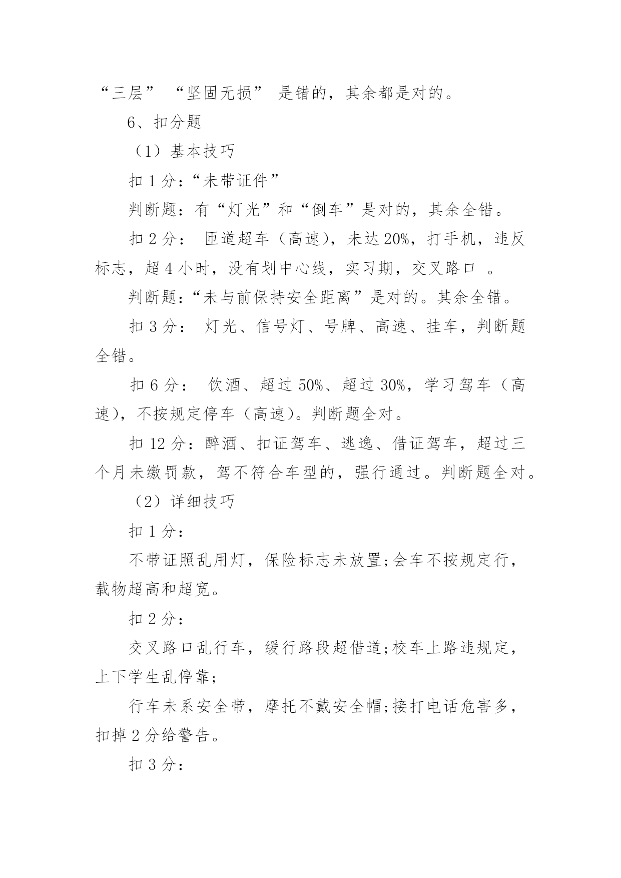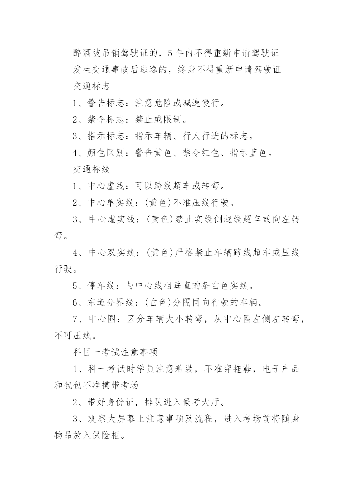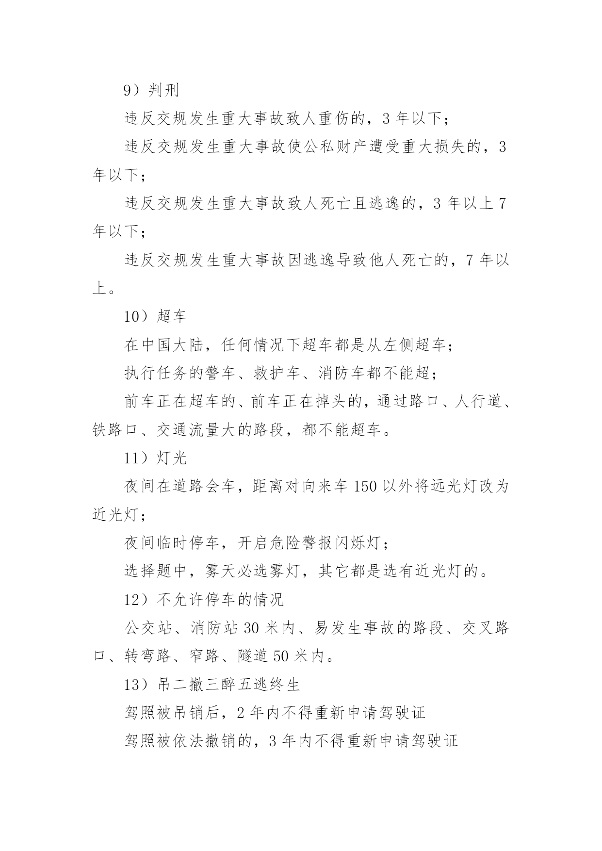 科目一考试的速记口诀科目一考试的速记口诀科目一是驾照考试的第一颗考试,属于理论考试,主要考察学院对交规理论知识的理解,下面是小编给大家整理的科目一考试的速记口诀内容,希望能给你带来帮助!【口诀】:科一过关并不难,多看多练是王道;顺序练习加印象,错题练习是巩固;考前专门看错题,模拟五次九十分;考试细看每一题,反复确认再勾选。【答题技巧】:1、题目里有“口”的选50米,有“站”的选30米,叫“口五站三”剩下的全选150米,没有150的选最大。判断题全对。2、有关公里的题目:城市街道选50公里,其余有30的全选30。高速最高70,高速最低60。判断题全对。3、吊销机动车证的为二年,撤消机动车证的为三年,以醉酒吊销五年,因逃跑而吊销是终身,叫“吊二撤三醉五逃终身”。4、伤员急救知识:选择题:A、B、C、“选字最多的”。判断题:只有“远心端”和“软质担架”是错的,其余都是对的。5、危险知识:题目里找“不需要”“不受”“可以”“三层”“坚固无损”是错的,其余都是对的。6、扣分题(1)基本技巧扣1分:“未带证件”判断题:有“灯光”和“倒车”是对的,其余全错。扣2分:匝道超车(高速),未达20%,打手机,违反标志,超4小时,没有划中心线,实习期,交叉路口。判断题:“未与前保持安全距离”是对的。其余全错。扣3分:灯光、信号灯、号牌、高速、挂车,判断题全错。扣6分:饮酒、超过50%、超过30%,学习驾车(高速),不按规定停车(高速)。判断题全对。扣12分:醉酒、扣证驾车、逃逸、借证驾车,超过三个月未缴罚款,驾不符合车型的,强行通过。判断题全对。(2)详细技巧扣1分:不带证照乱用灯,保险标志未放置;会车不按规定行,载物超高和超宽。扣2分:交叉路口乱行车,缓行路段超借道;校车上路违规定,上下学生乱停靠;行车未系安全带,摩托不戴安全帽;接打电话危害多,扣掉2分给警告。扣3分:车辆体检未定期,高速路上低速行;两成以下超员载,三成以下超物载;禁入高速偏驶入,客货车辆超时速;人行横道不让路,不按规定车道行;超车逆行不让道,牵引挂车违规定;故障事故不警告,违反标志和标线。扣6分:违反交通信号灯,暂扣期间仍驾驶;营运客车和校车,超员超速低两成;应急车道违法占,低能见度违规行;化学易爆无警示,危险物品超时速;校车到来不避让,补领驾照还欺瞒。扣12分:车型不符用他照,饮酒驾驶事故逃;校车载人超两成,高速路上超二零;载客载物超疲劳,行驶时速超五零;伪造变造牌证照,无牌遮挡还污损;高速公路违规停,倒车逆行和穿越;行驶车速超五成,驾驶校车竟无证。7、罚款题:有“2000”选“2000”,没“2000”选“500”,没有“2000以上”的和没有“1000”的罚款。其它全选最大题。考罚款金额的判断题全选正确。8、有关天数的题目:只要记住一个调解的选10天,其余有15天选15天,没有15天的选3或90。9、有关高度的:出现“集装箱”选,其余选小。10、关于作用的“变、离、柴、行”4个字后有作用全错,其余有作用全对。11、公路交通标志分为,主标志和辅助标志两大类。主标志中有警告标志、禁令标志、指示标志和指路标志四种。(1)警告标志是警告车辆、行人注意危险地点的标志;(2)禁令标志是禁止或限制车辆、行人交通行为的标志;(3)指示标志是指示车辆、行人行进的标志;(4)指路标志是传递道方向、地点、距离信息的标志12、上高速路的车最低时速是要求60公里,最高不得超过120公里,如果高速路同方向有2条车道,右侧车的速度范围为60公里到100公里,左侧车的速度范围为100公里到120公里。如果有同方向有3条的车道,最右侧的速度范围为60公里到90公里,中间的为90公里到110公里,最左侧的为110公里到120公里。所以超车当然是要从左侧超车。13、三个先行原则:转弯的机动车让直行的车辆先行,右方道路来车先行,右转弯车让左转弯车先行。科目一快速记忆法1)安全原则凡是题中有“安全”两字的判断题正常都对,怎么安全怎么做。2)让行能让行的都让行、能避让的都避让、能帮助的都帮助,只要不抢、不急的都对。路口让行:转弯让直行、右转让左转、后车让前车,机动车让行人。在没有中间线狭窄山路会车时,不靠山体的一方先行。3)车速没有限速标志和标线的情况下,没有道路中心线的城市道路最高车速30公里/小时、公路40公里/小时;没有限速标志和标线的情况下,只有一条机动车道的城市道路最高车速50公里/小时,公路70公里/小时。高速公路同方向车道行车速度:二条车道左:100~120右:60~100三条车道左:110~120中:90~110右:60~80三条以上/四车道最左:110~120中间二条:90~110最右:60~80进入高速加速车道,尽快提到(60公里)以上4)有“扣留该机动车”的答案都是正确答案。5)警告标志的